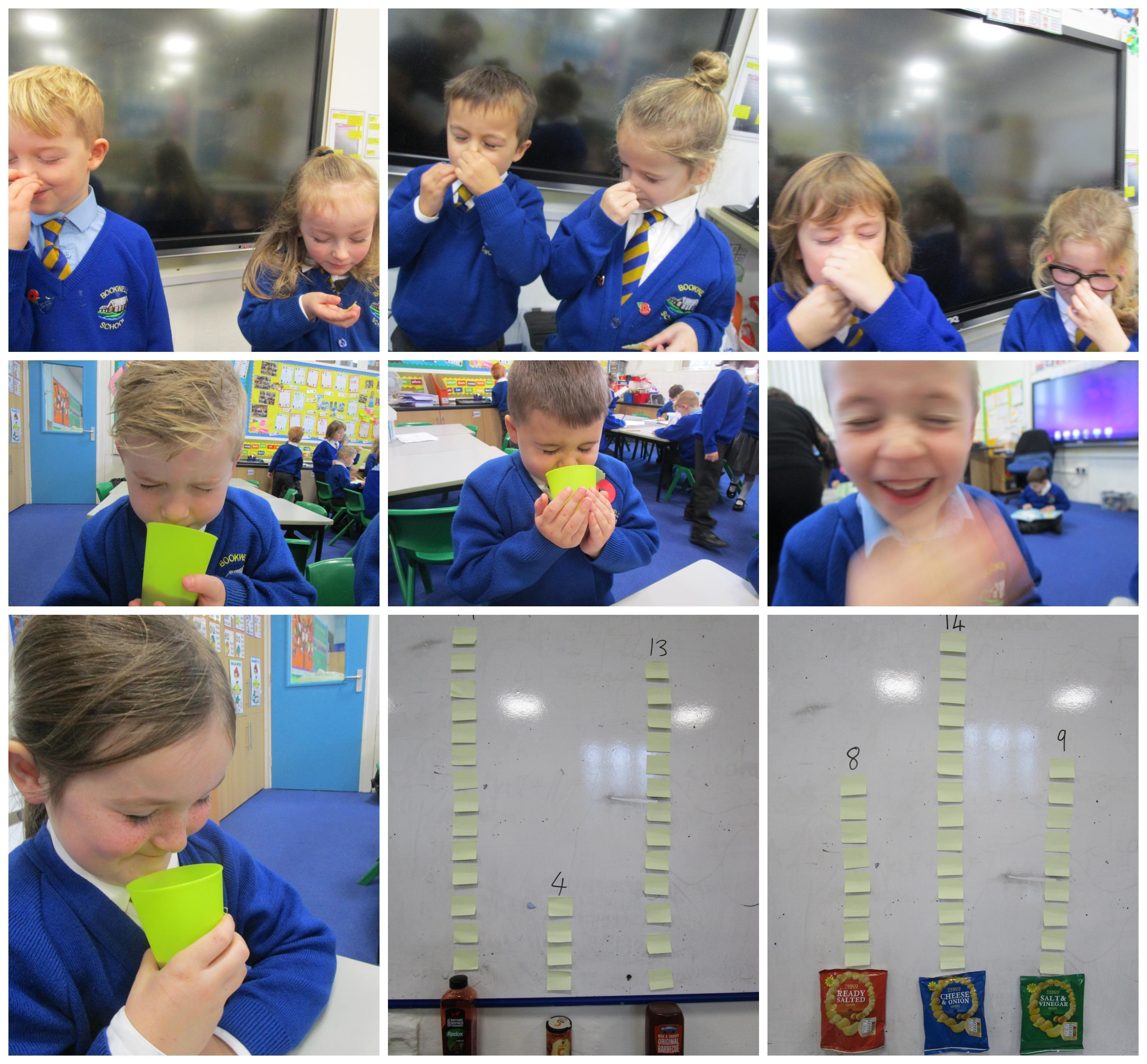 Today in class the children were first testing their sense of smell and taste by seeing if they could identify which flavour the crisp was. Then in order to see how one sense can affect the other they had to pinch their nose when tasting the crisps to check whether their sense of taste is affected by smell. After this the children were smelling different smell pots and had to guess what the smell was and had to think of words to describe it, such as sweet or spicy. Finally we gathered data and recorded it on a graph to see if the children could work out what the most/least popular crisp flavour and smells were.