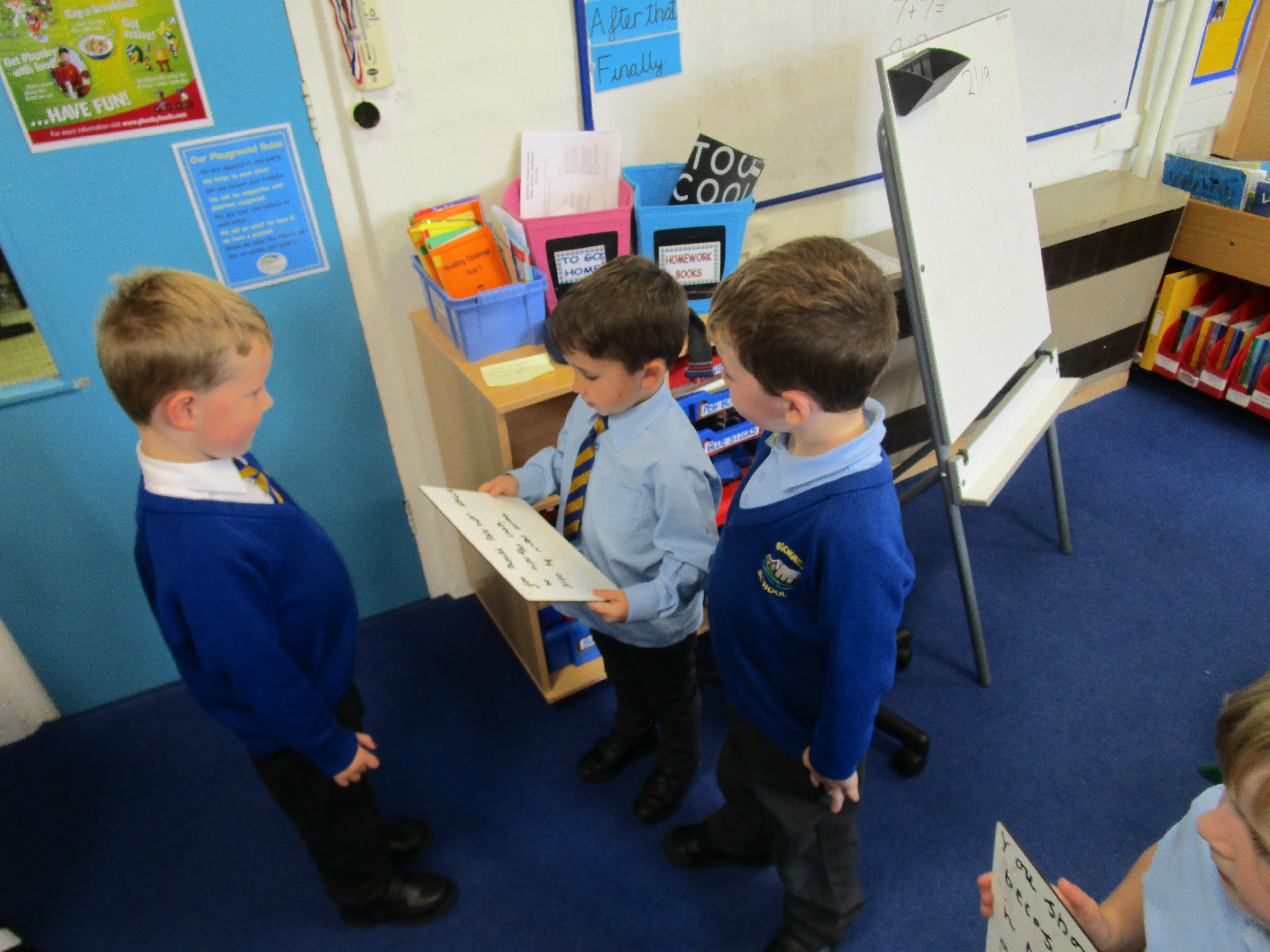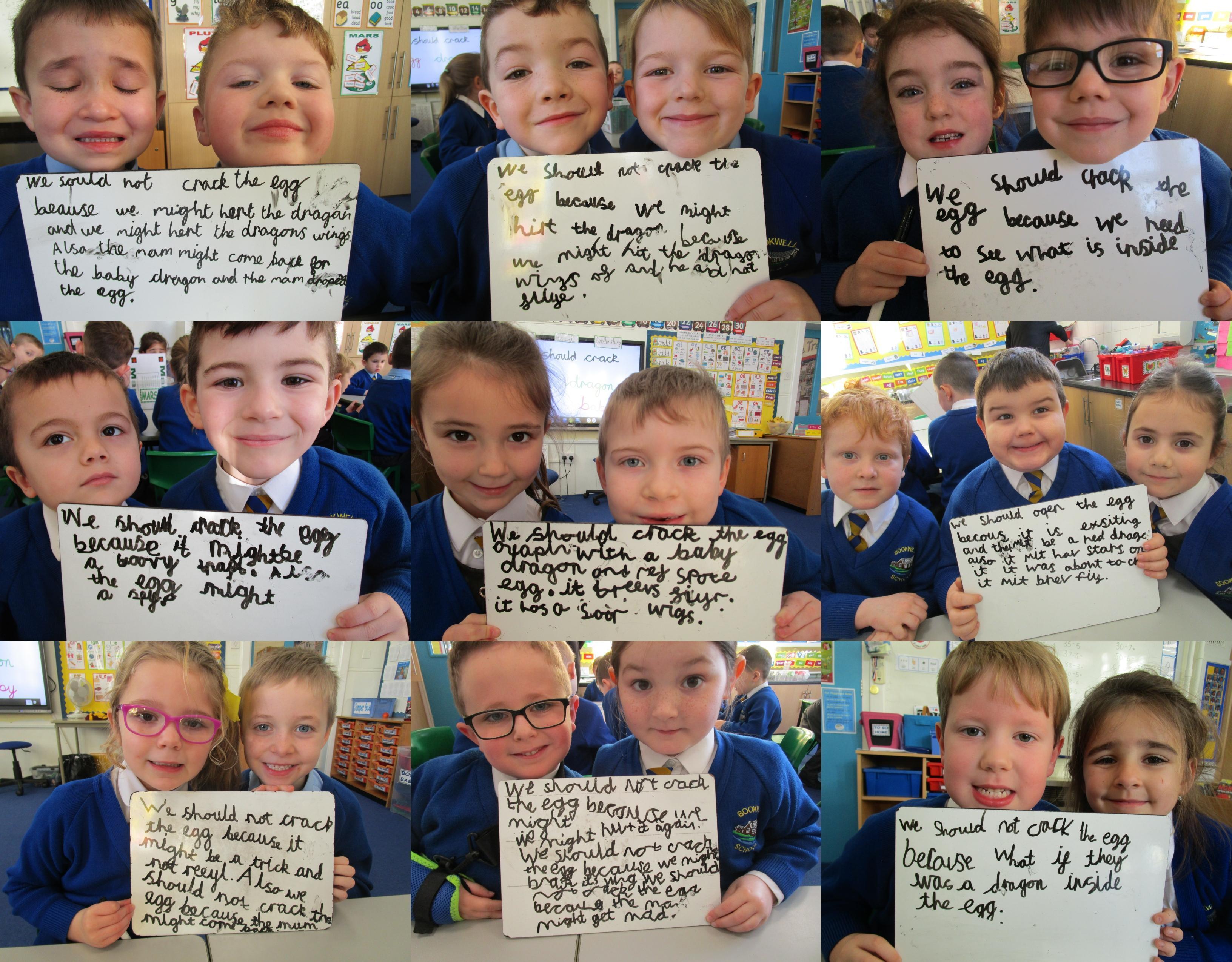 We went back to class and we had to decide whether we should open the egg or leave it to hatch by itself. They had to work in pairs and use the word 'because' to explain their reasons. In the end it was decided that we should leave the egg to hatch by itself because it was not ready to hatch and it needed more time.