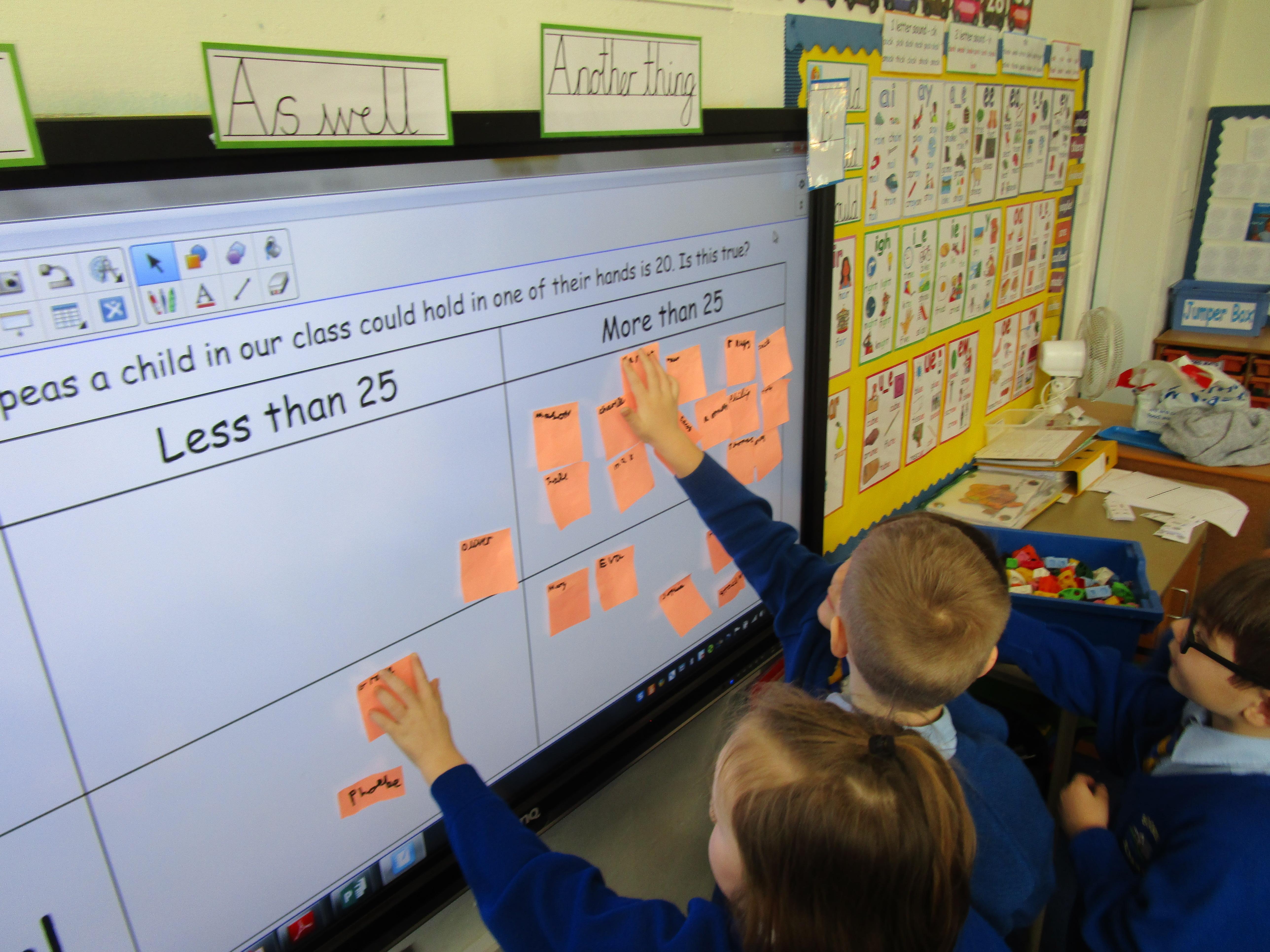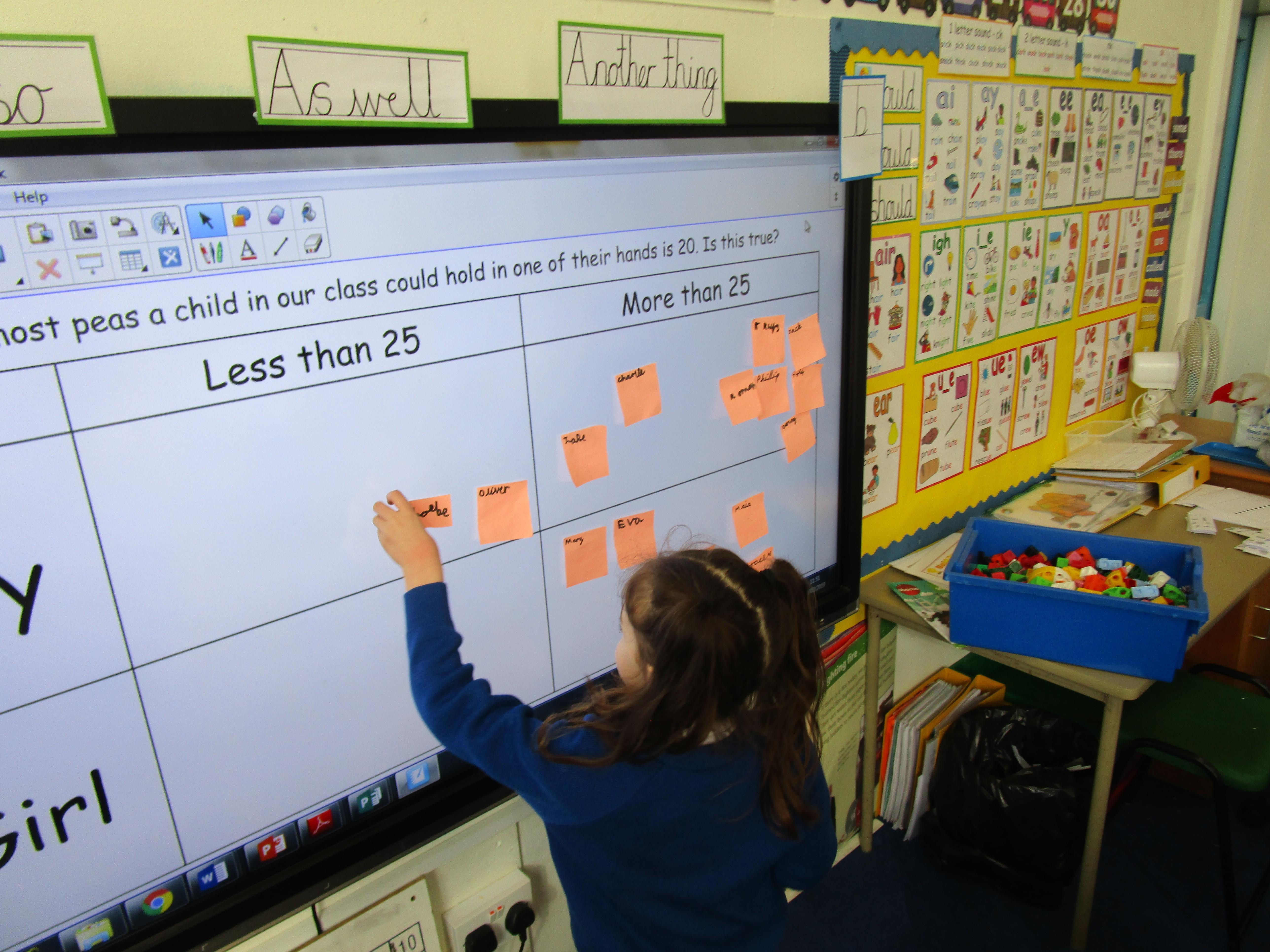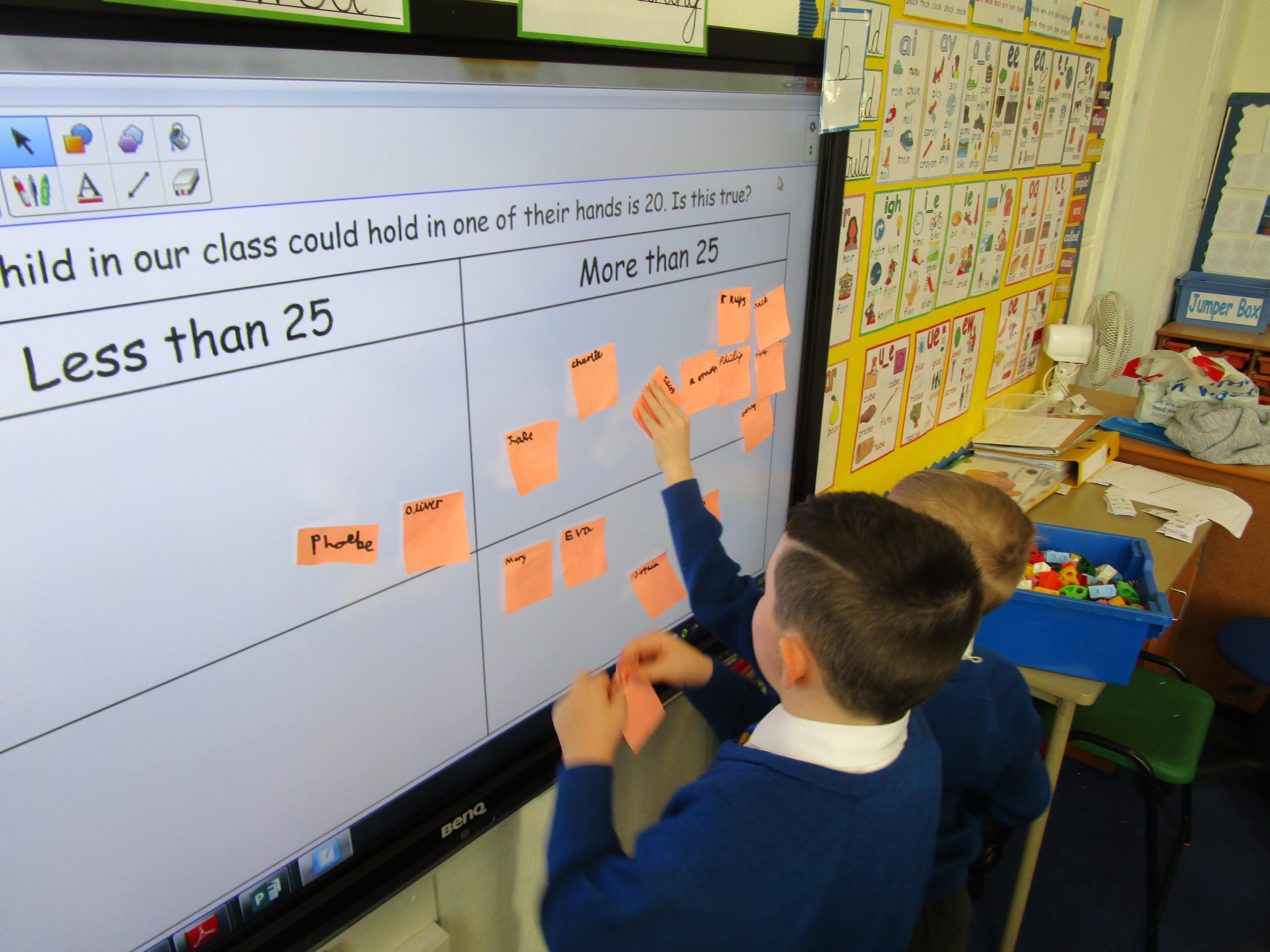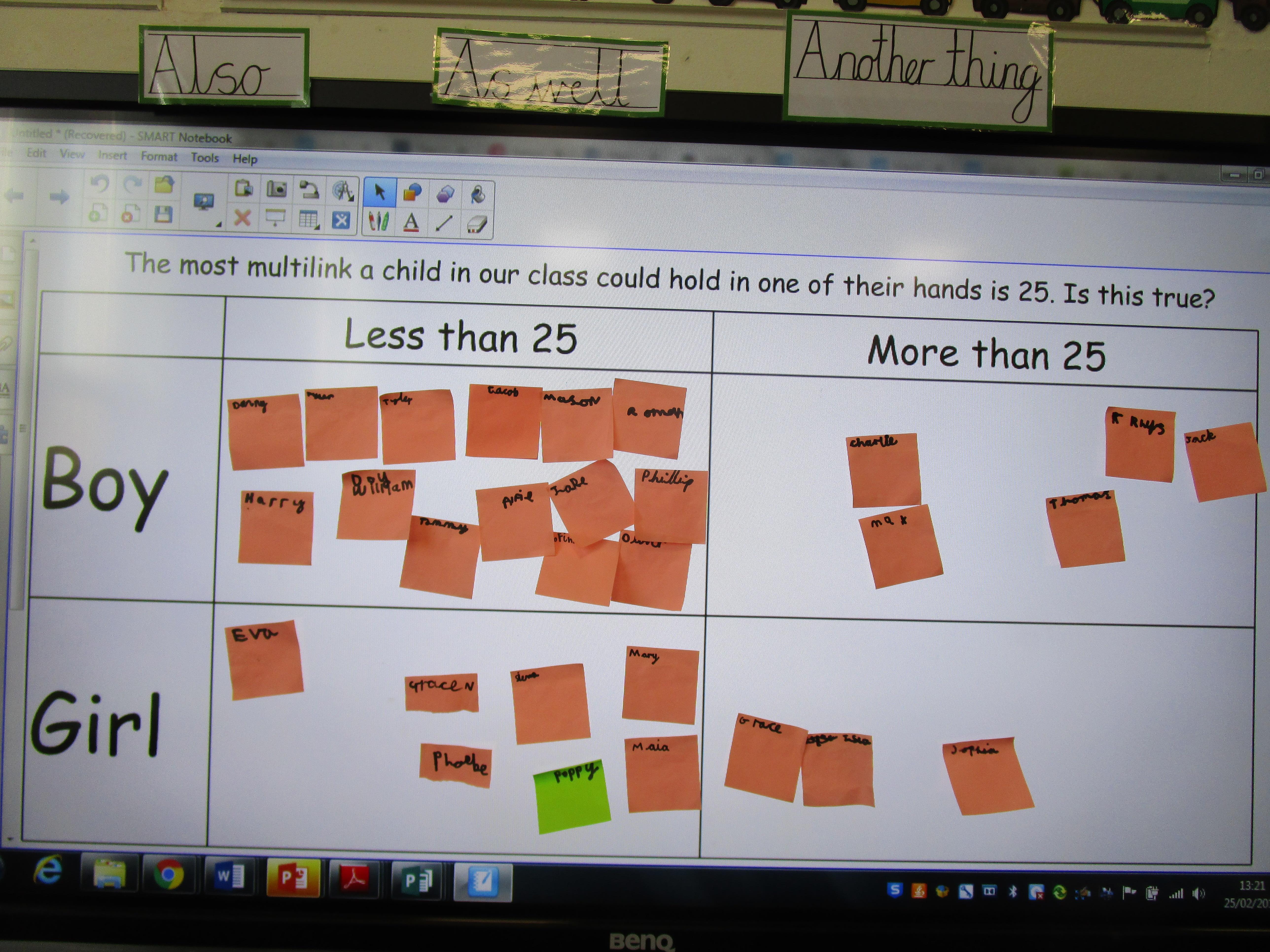 Today the children were investigating the statement: The most multilink a child in our class could hold in their hands is 25. Is this true? First they had to make a prediction whether they thought that they could hold 25 multilink and then they used a carroll diagram to present their predictions and final results. This was their prediction: