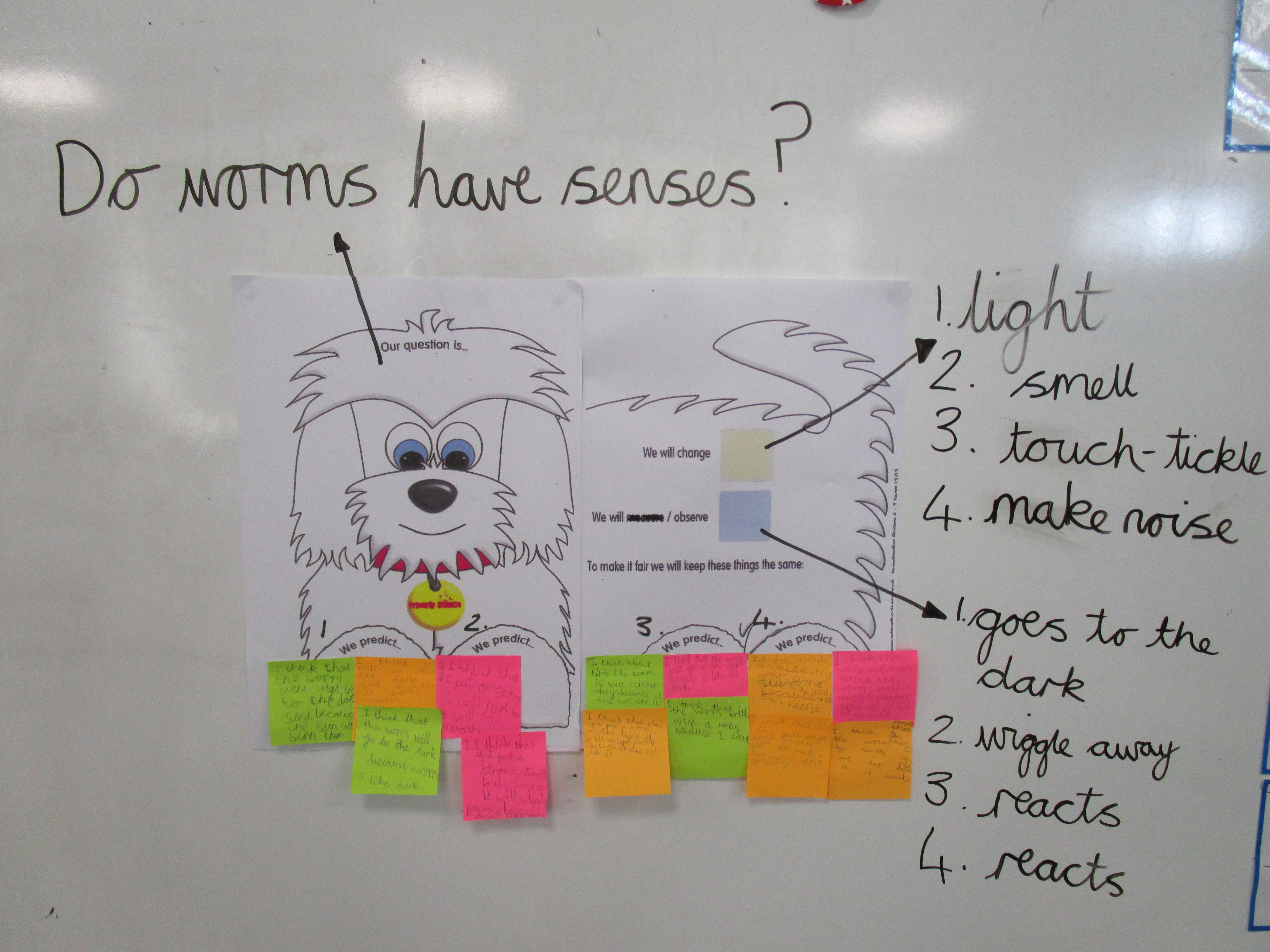 Today we were trying to answer the question, “Do worms have senses. First we discussed what we had to do/changes we had to make to test the worm’s senses and we worked out what we would observe to check. Then we made our predictions.