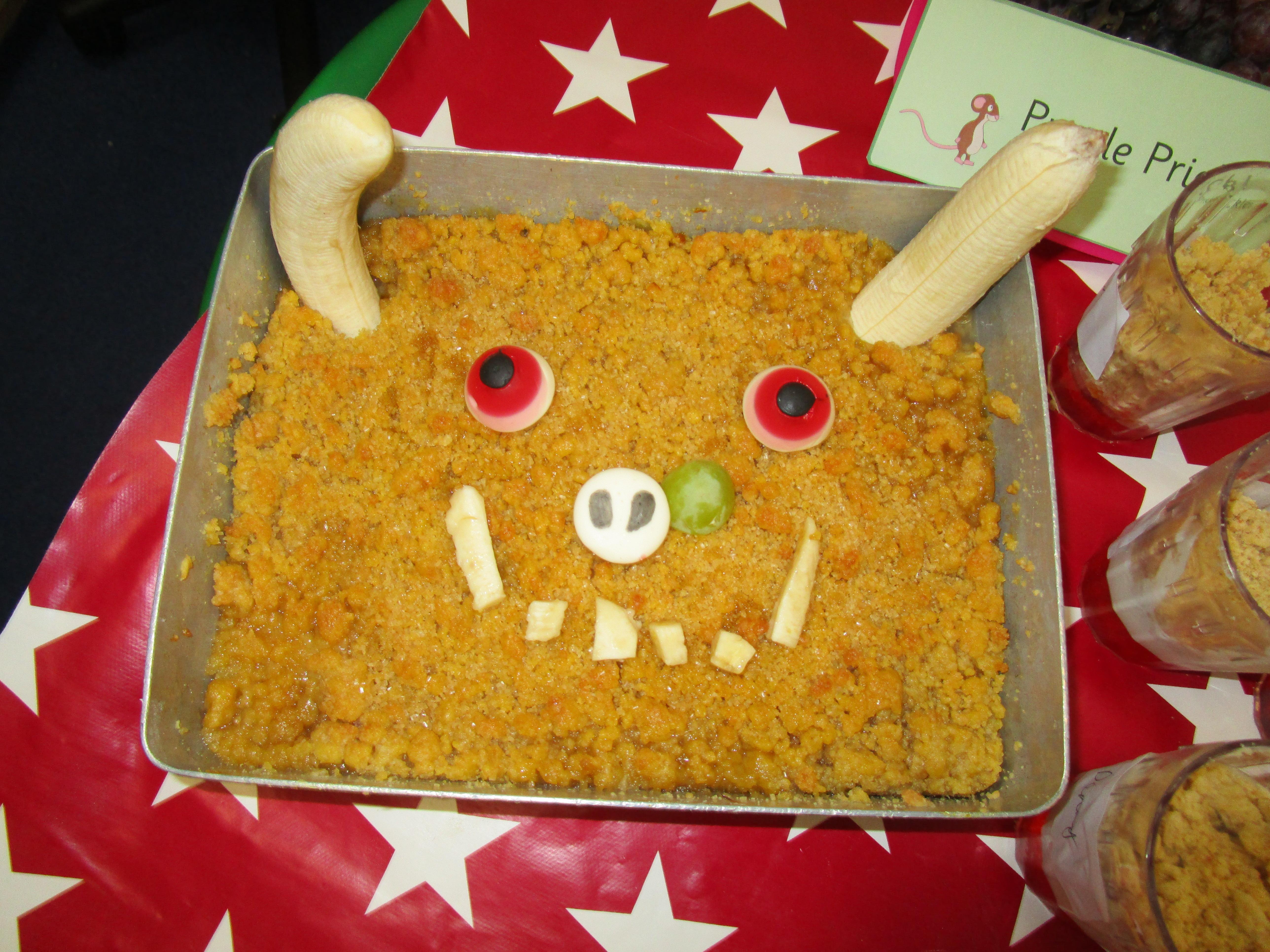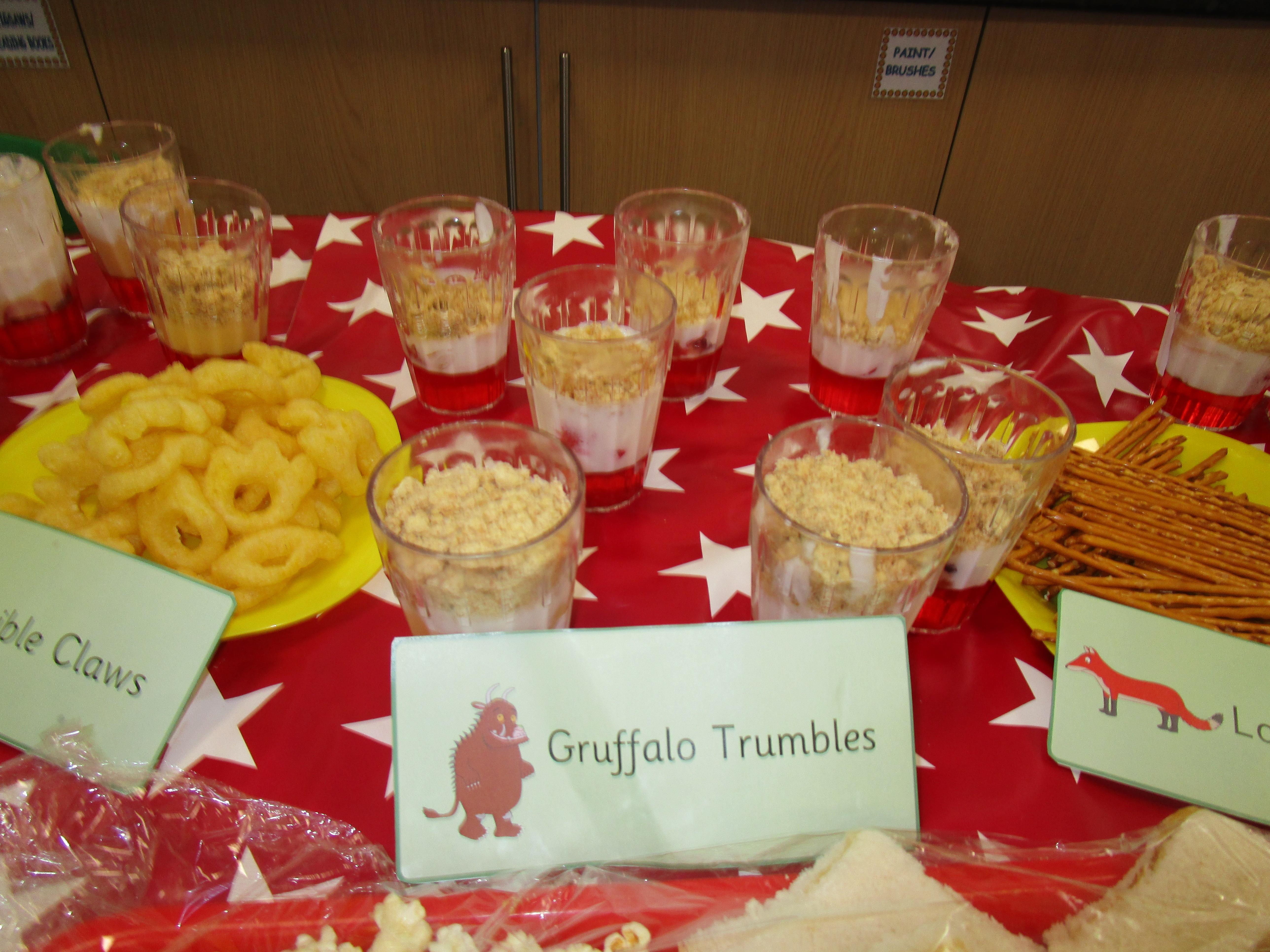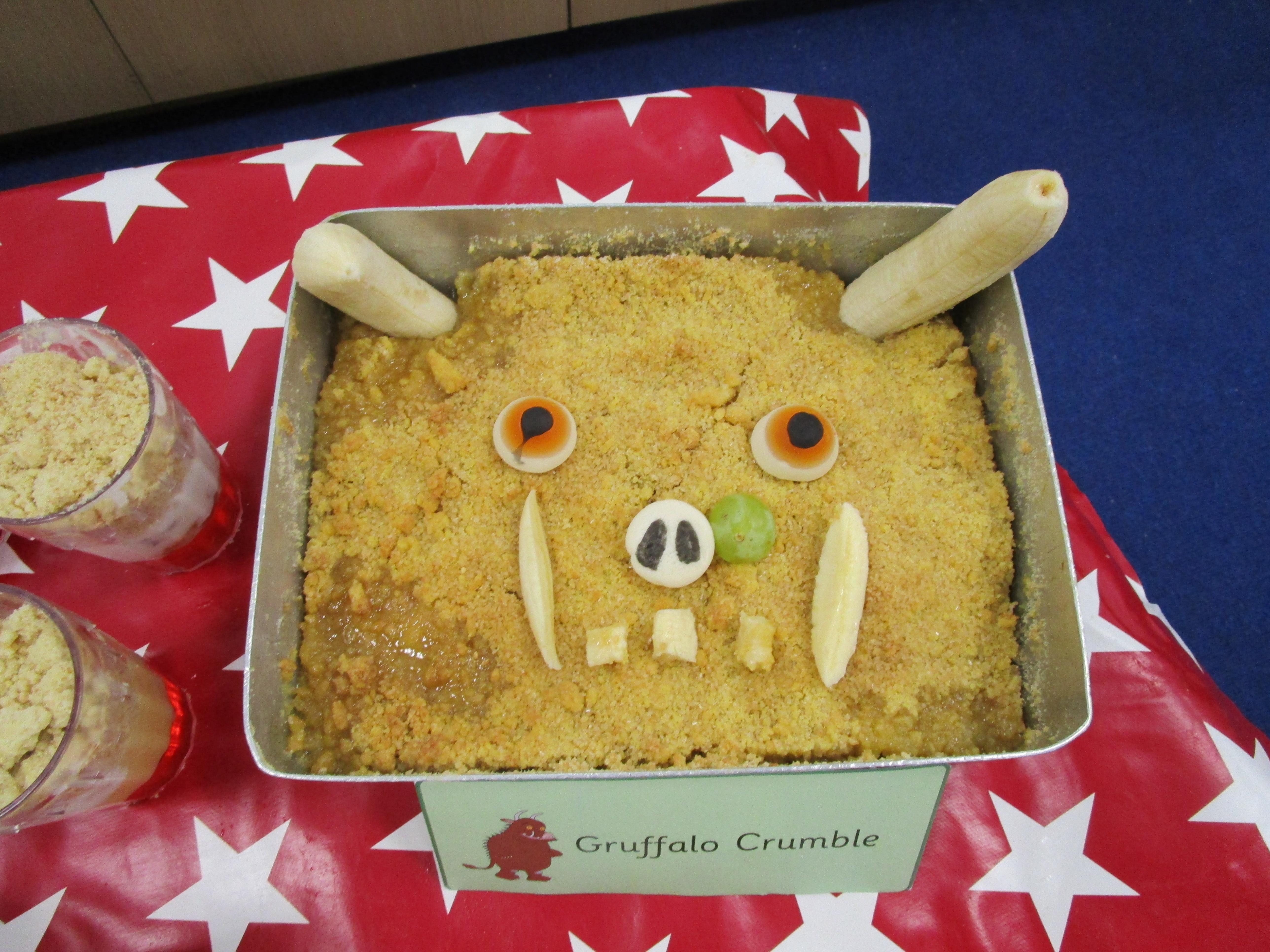 For our school cooking competition this year we have made a Gruffalo picnic. In the morning we made Gruffalo crumble and some sandwiches for our picnic. Then each child made a 'Gruffalo Trumble' which was a mix between a traditional trifle and a crumble. It tasted delicious!