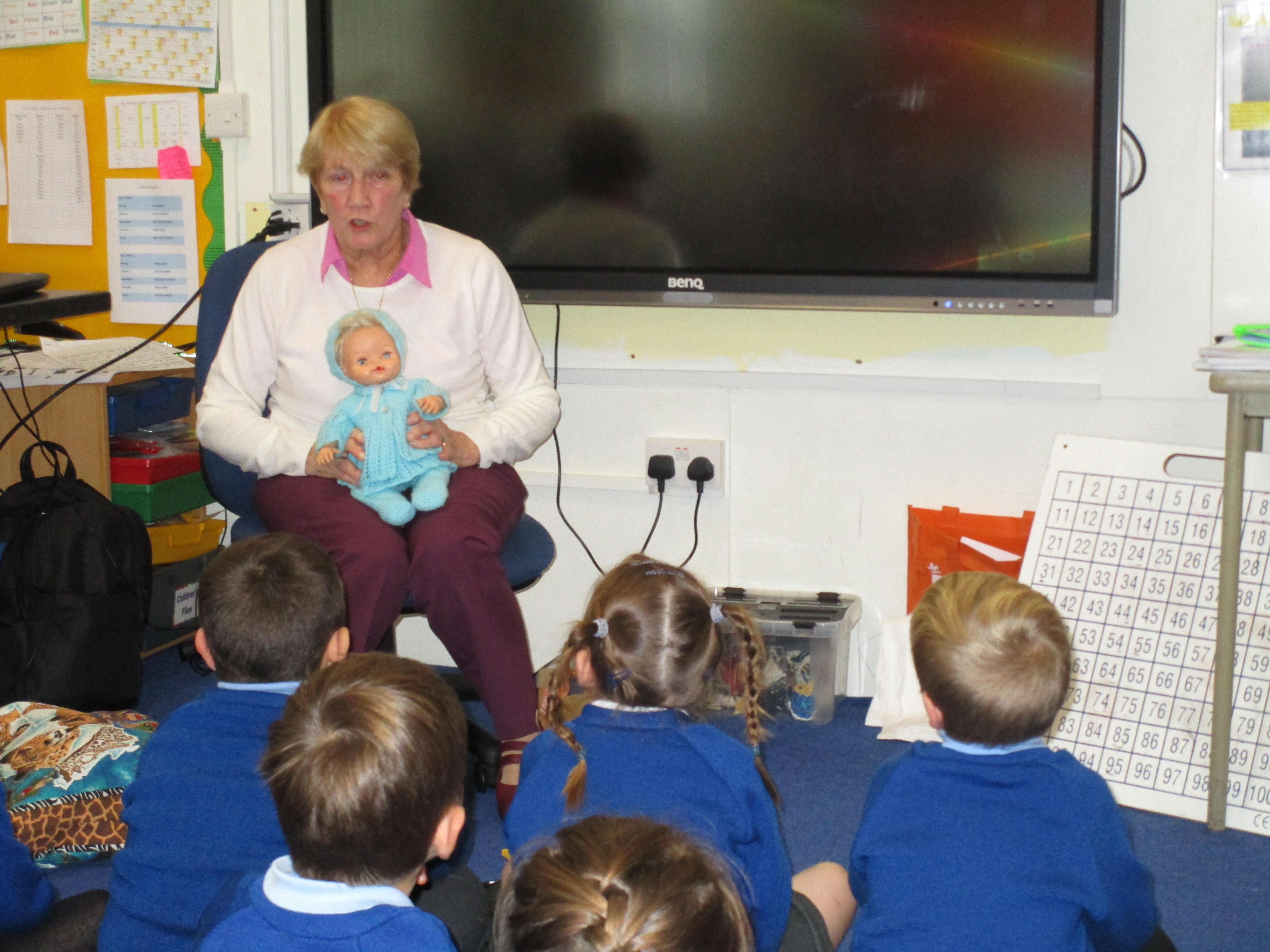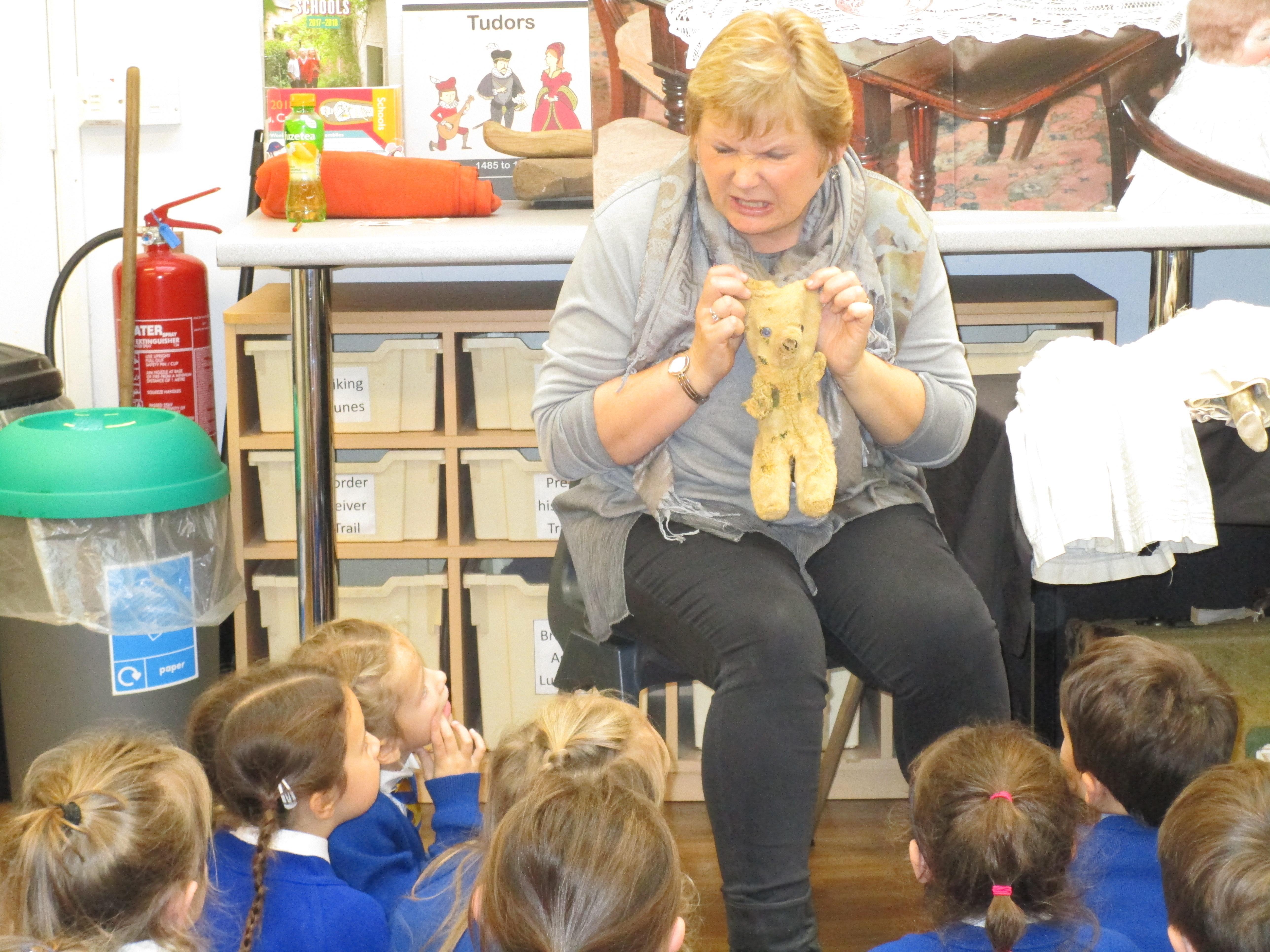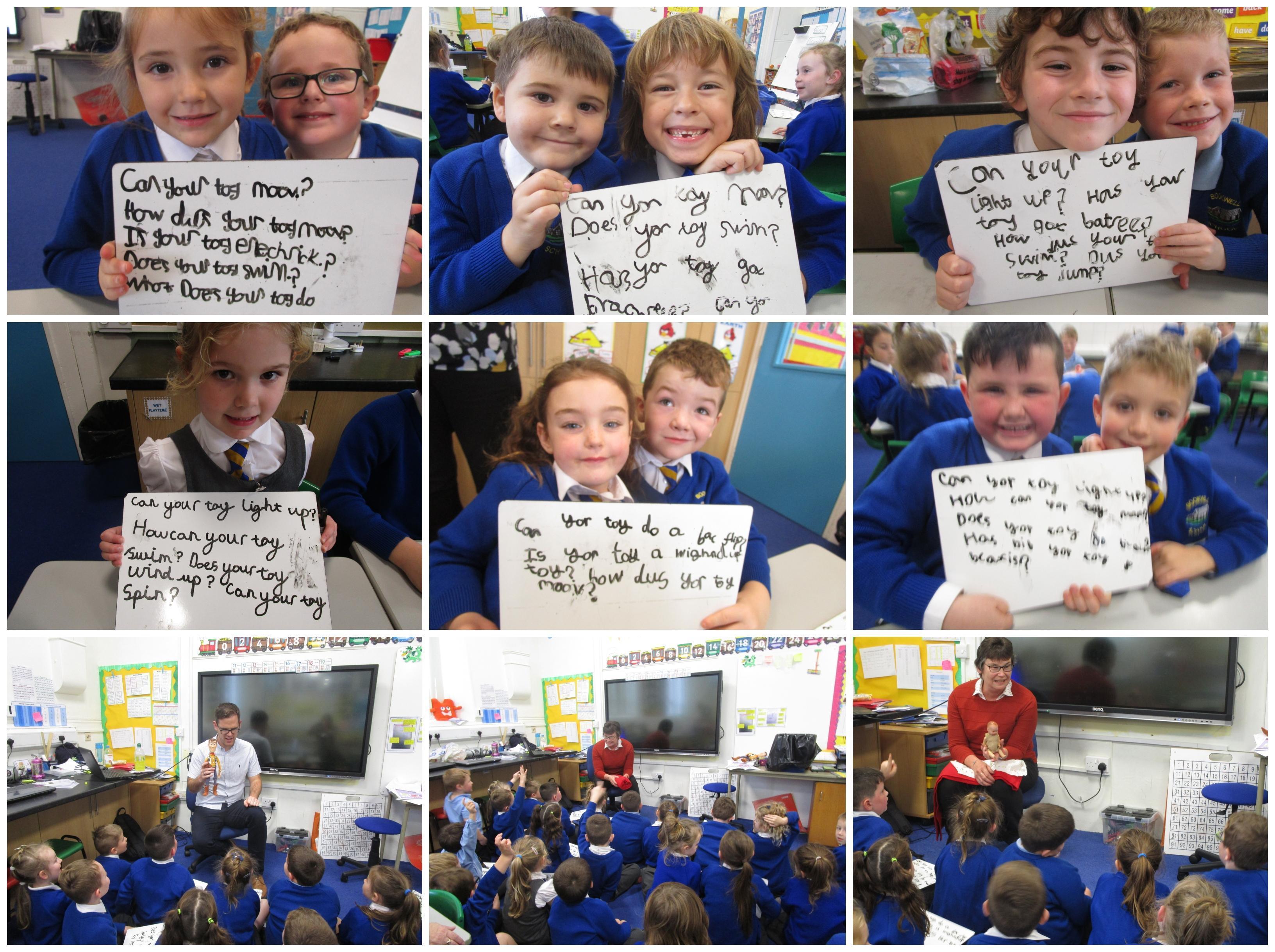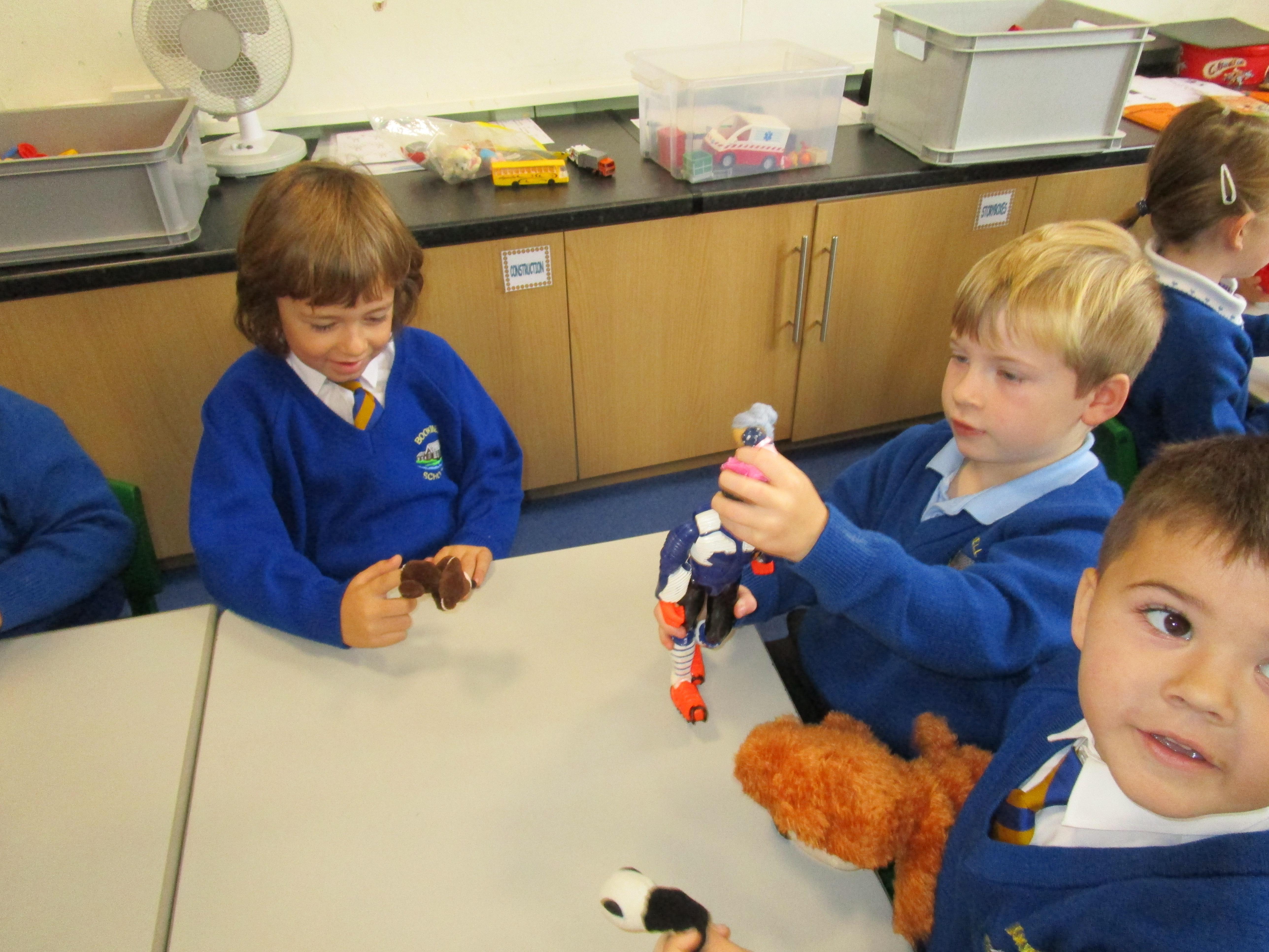 To consolidate the children's learning about old and new toys today in class both myself and our visitor Mrs Forrester brought in a toy. One of the toys was an old toy and one of the toys was a new one and the children had to think of questions to ask so that they could try and predict whether the toys were old or new. They asked some fantastic questions and made excellent predictions! They really enjoyed hearing Woody talk and were amazed that Mrs Forrester's doll was over 100 years old!