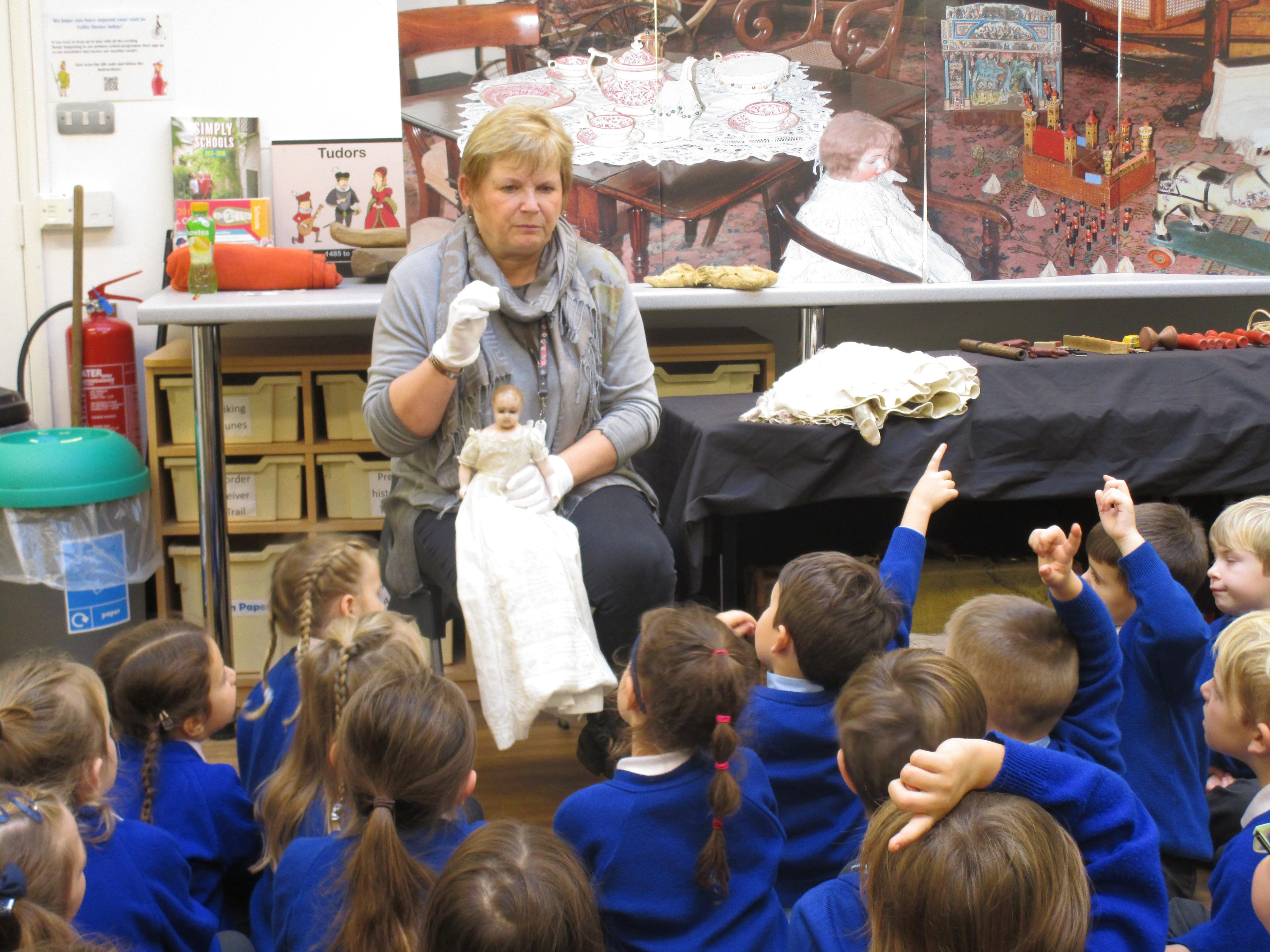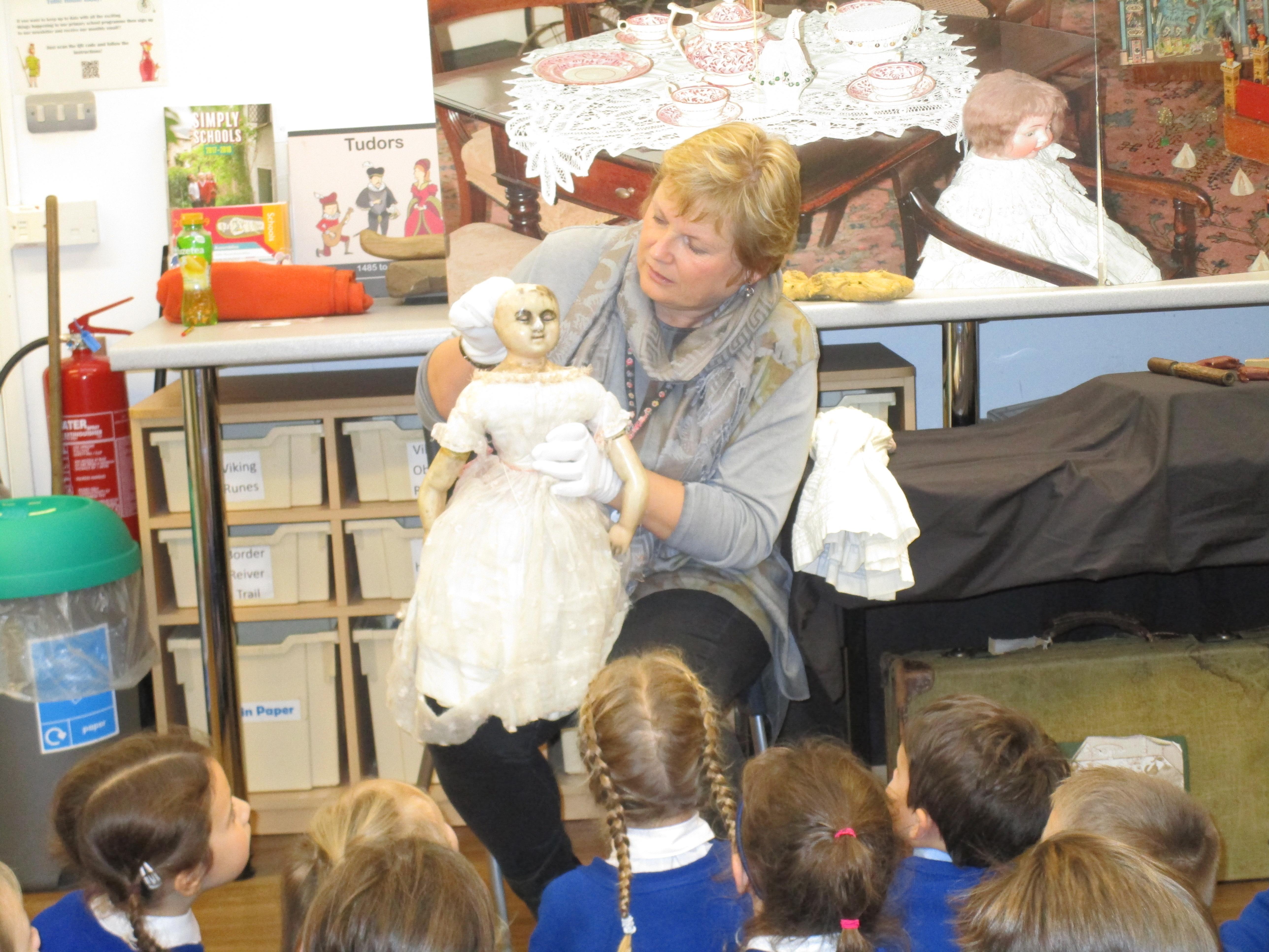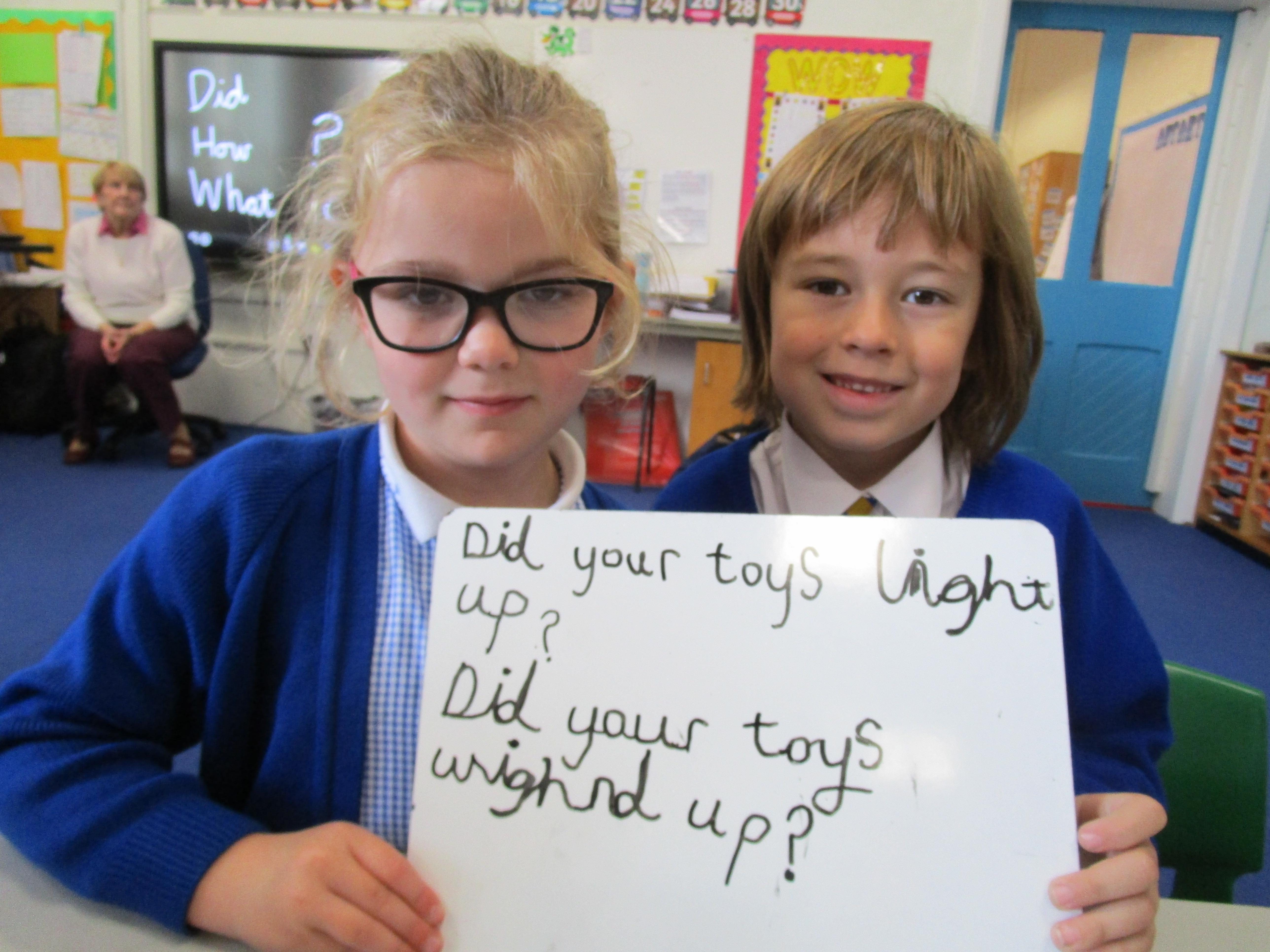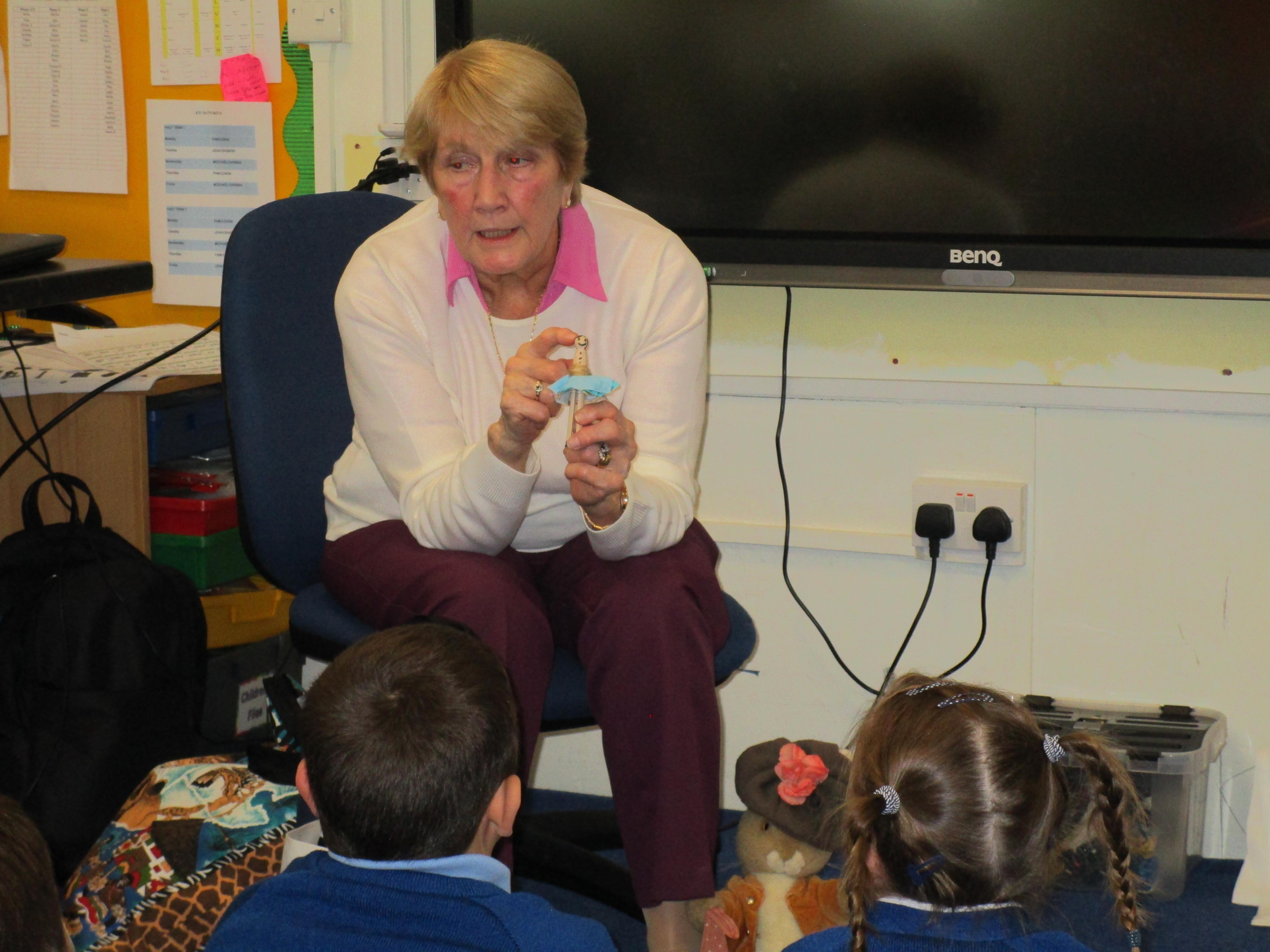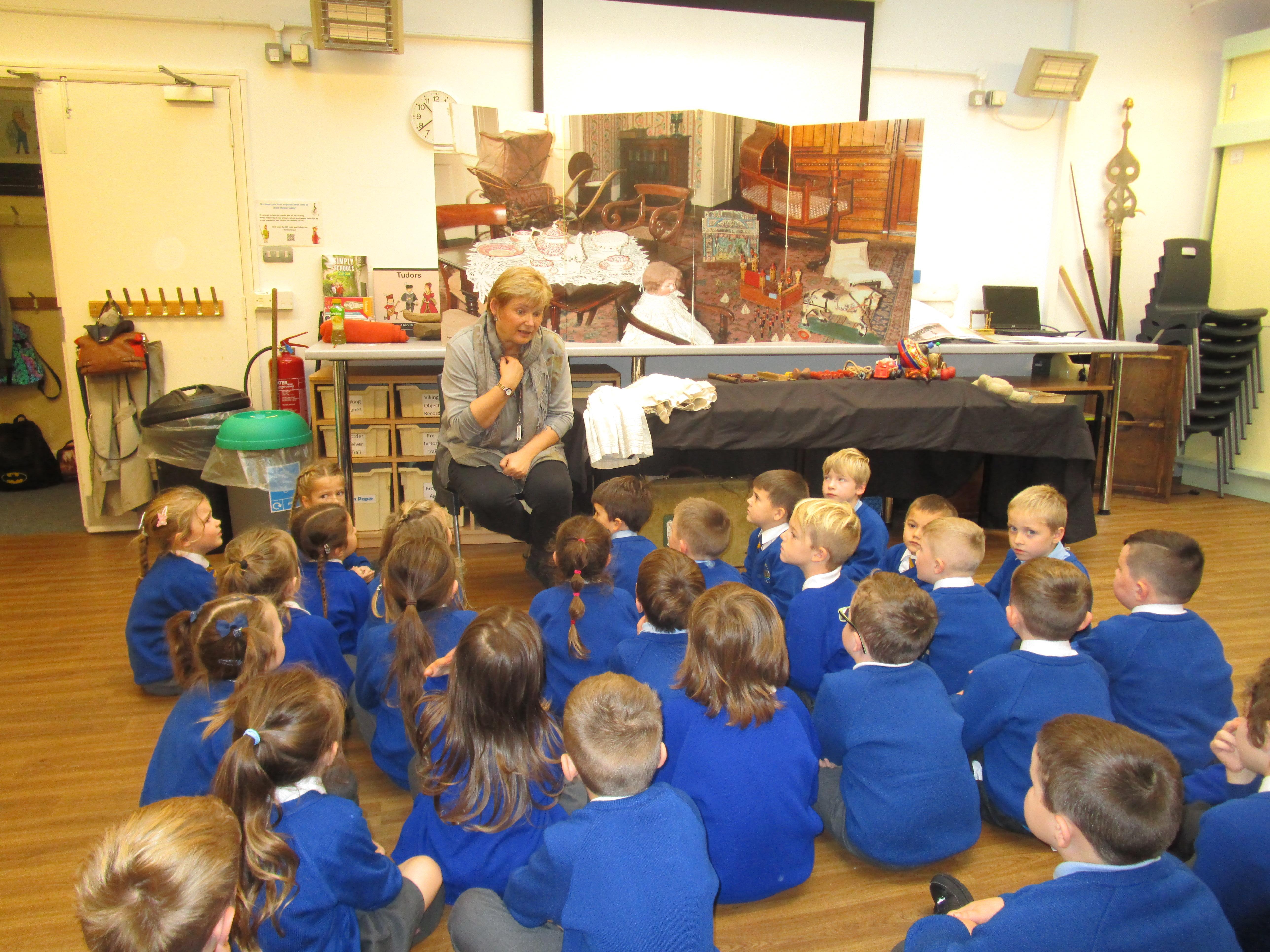 To consolidate the children's learning about old and new toys today in class both myself and our visitor Mrs Forrester brought in a toy. One of the toys was an old toy and one of the toys was a new one and the children had to think of questions to ask so that they could try and predict whether the toys were old or new. They asked some fantastic questions and made excellent predictions! They really enjoyed hearing Woody talk and were amazed that Mrs Forrester's doll was over 100 years old!