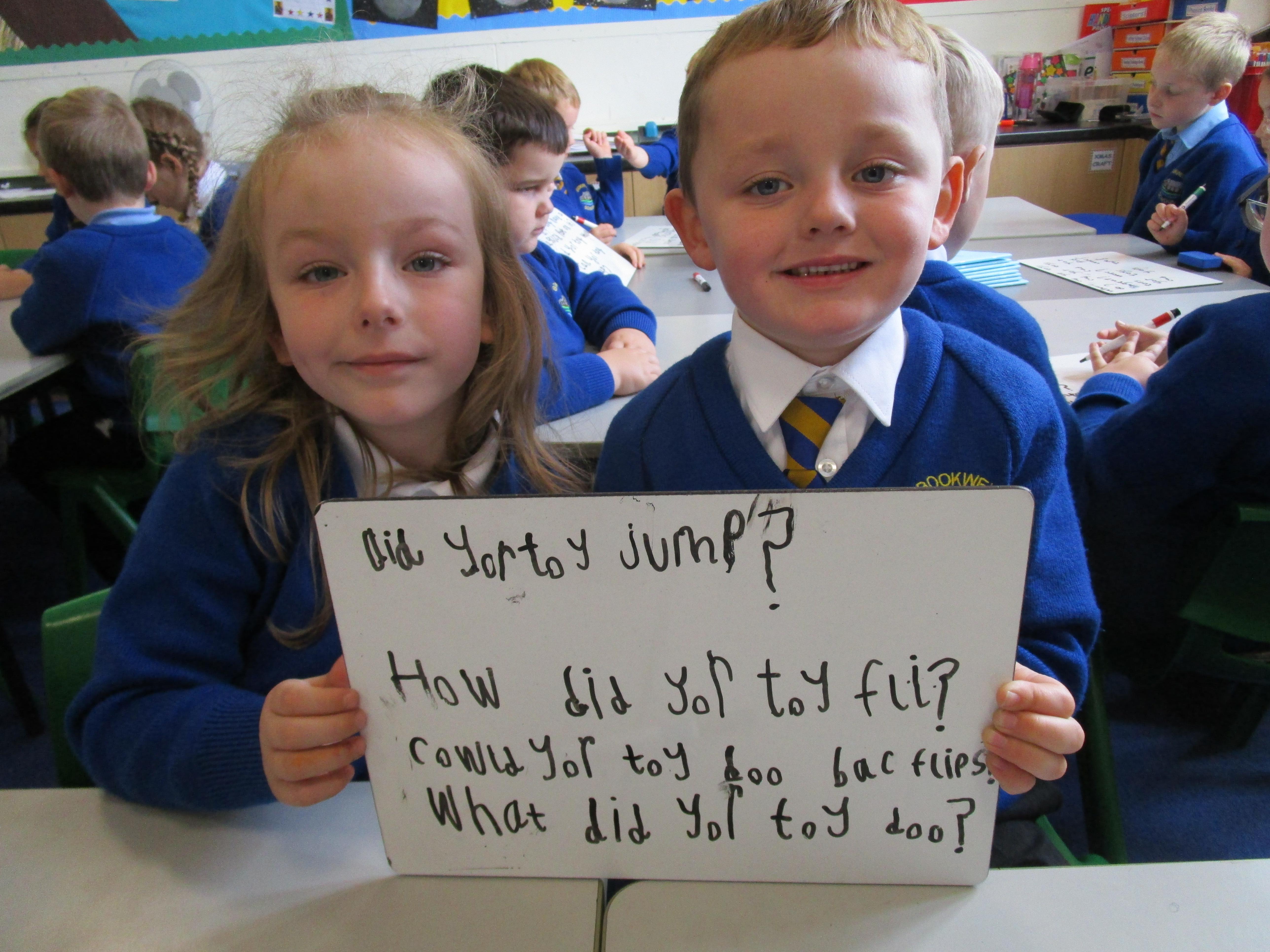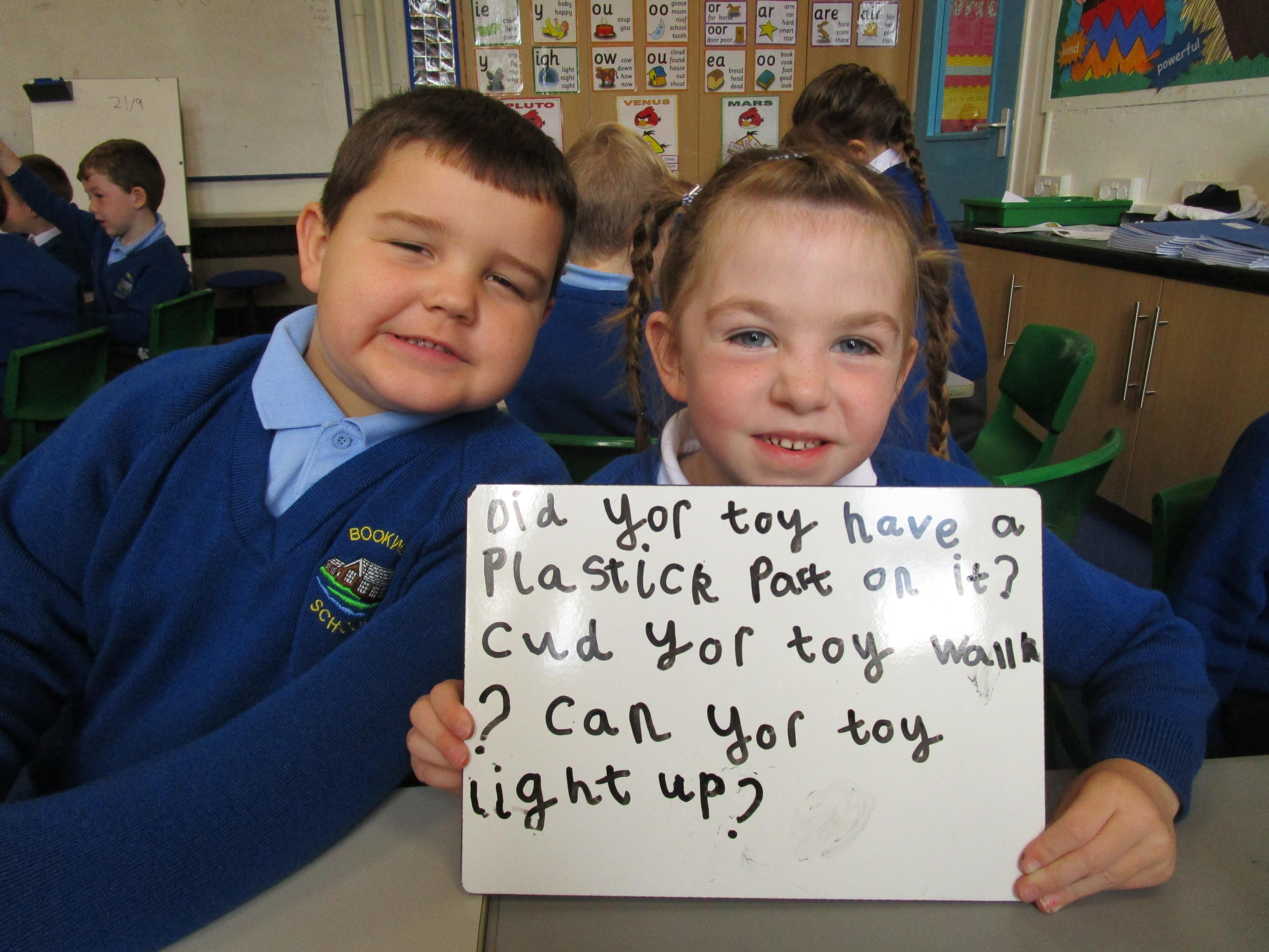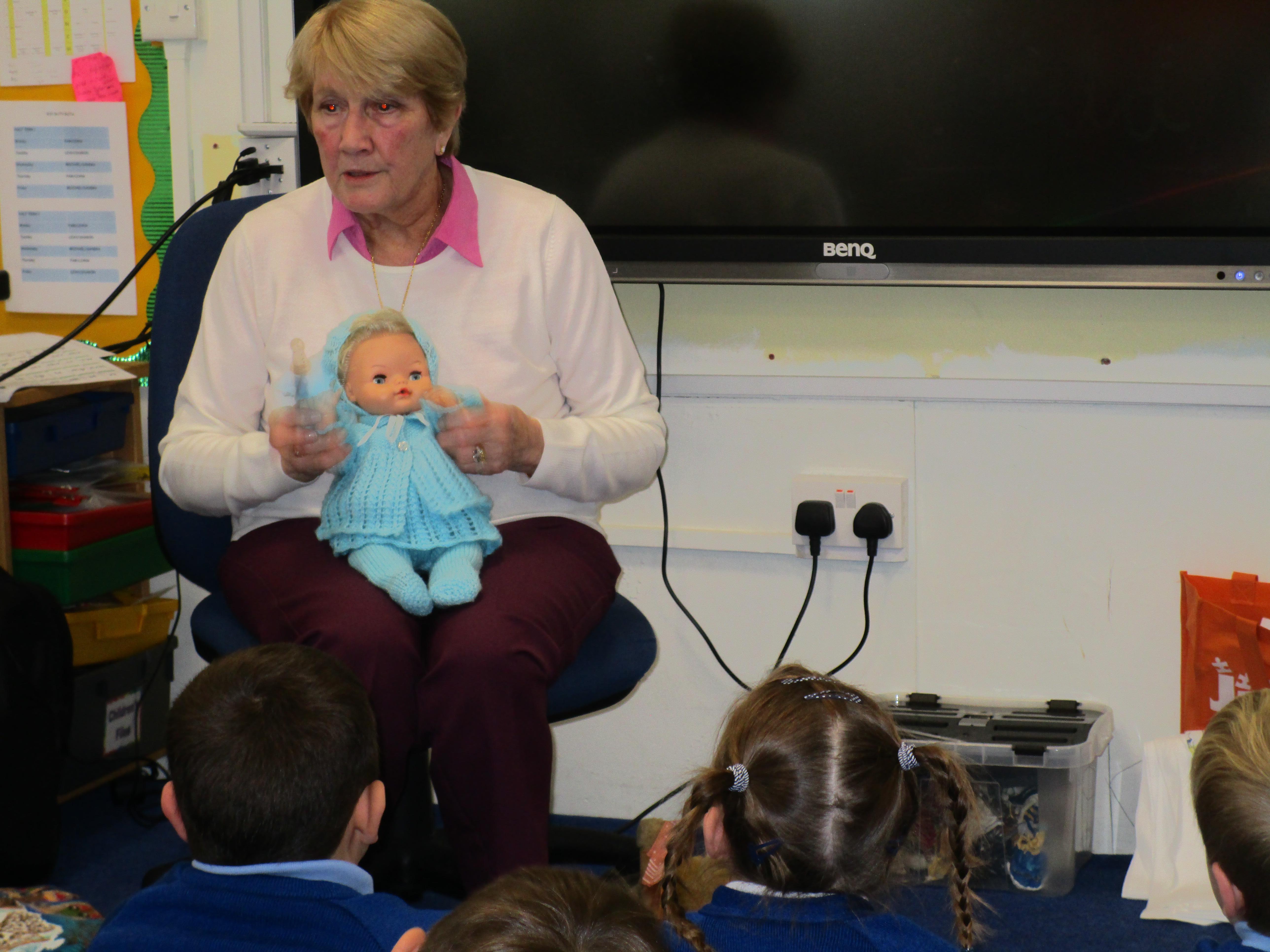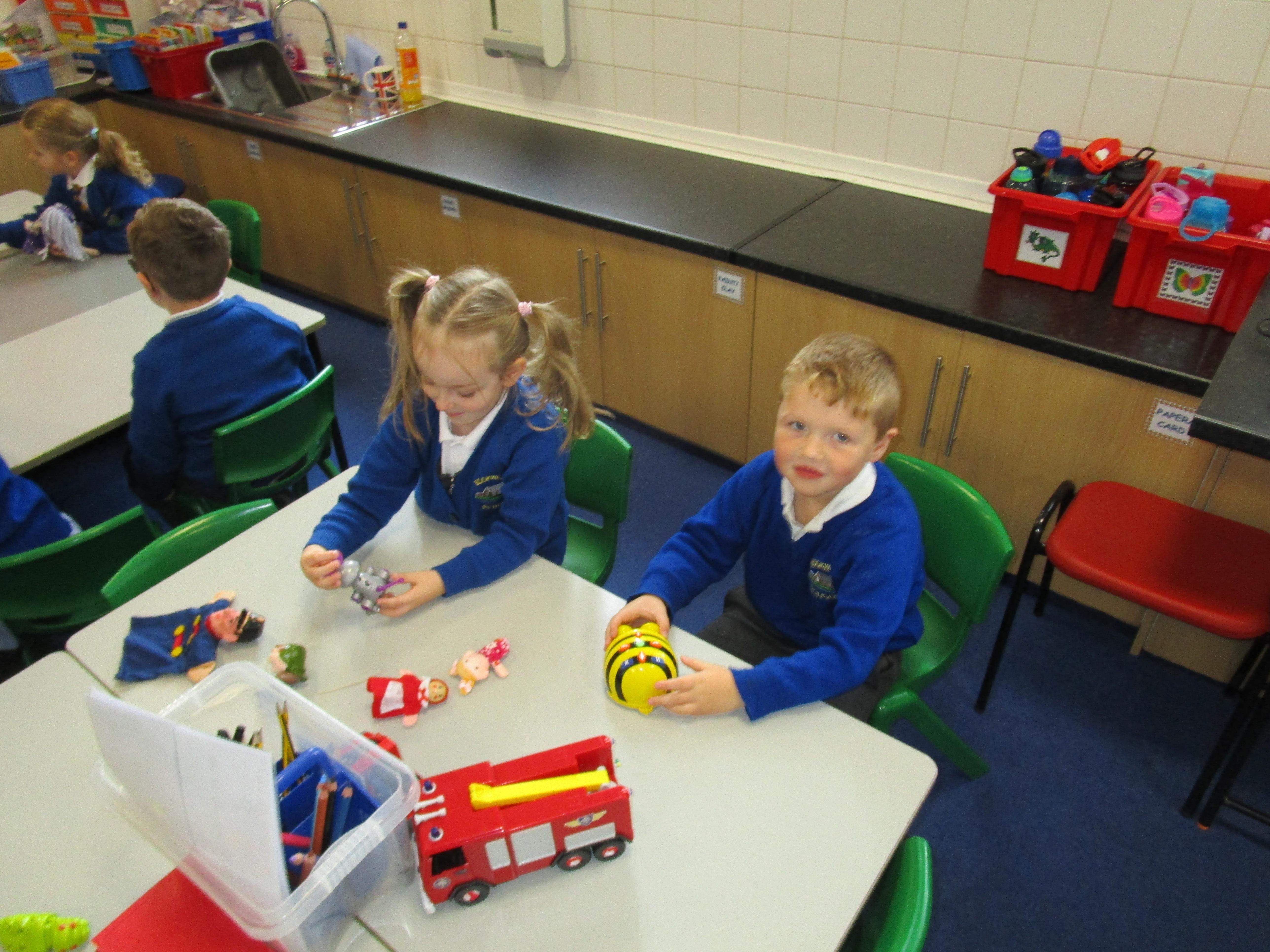 To consolidate the children's learning about old and new toys today in class both myself and our visitor Mrs Forrester brought in a toy. One of the toys was an old toy and one of the toys was a new one and the children had to think of questions to ask so that they could try and predict whether the toys were old or new. They asked some fantastic questions and made excellent predictions! They really enjoyed hearing Woody talk and were amazed that Mrs Forrester's doll was over 100 years old!