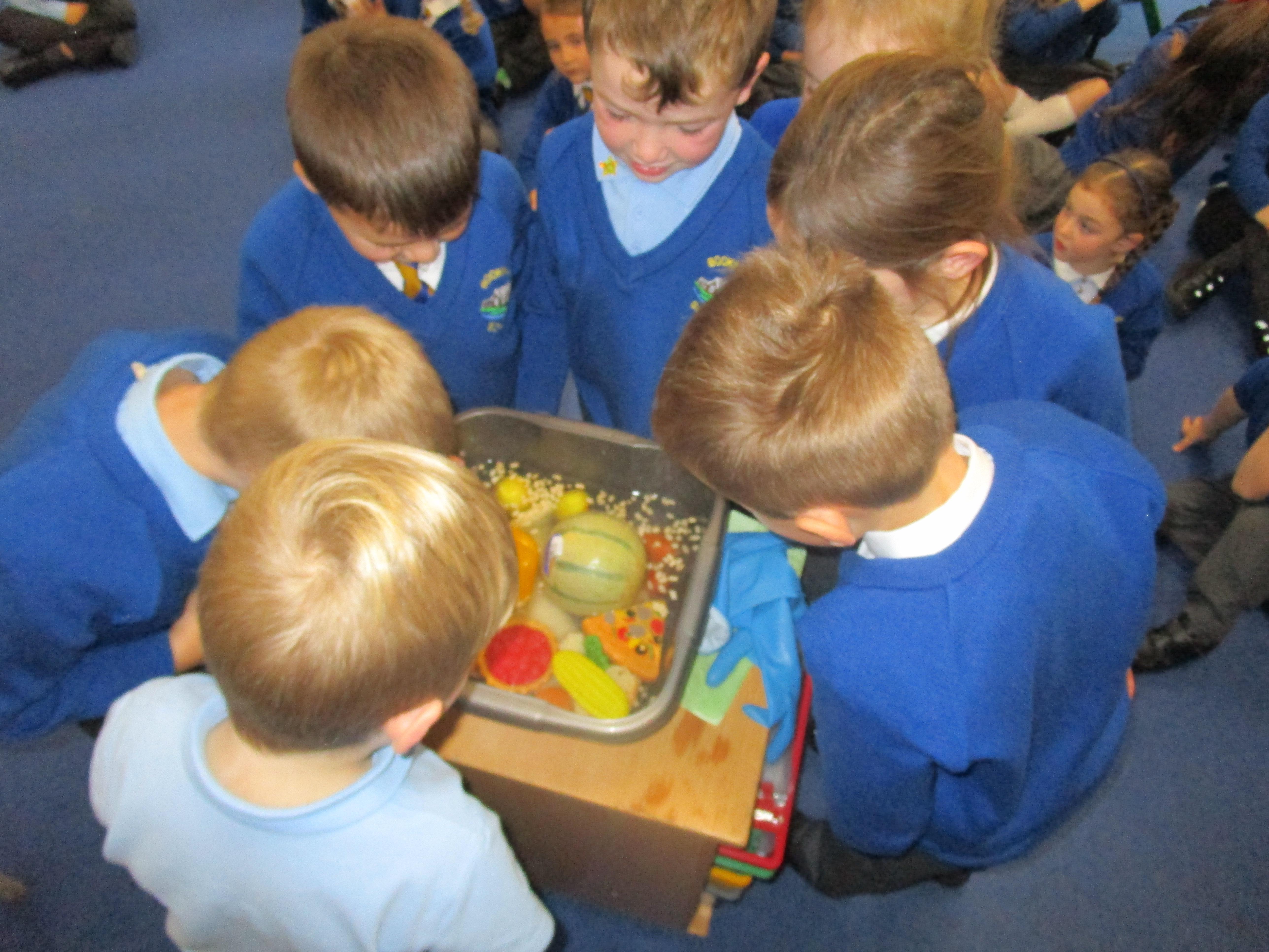 The children have been exploring the sink that Traction Man had to go in to rescue Scrubbing Brush. They were excited to discover all of the different objects in the sink. We spent time describing each item and thinking of adjectives the children could use when describing each item. Later in the week the children will be writing about the items that they could see in the sink
