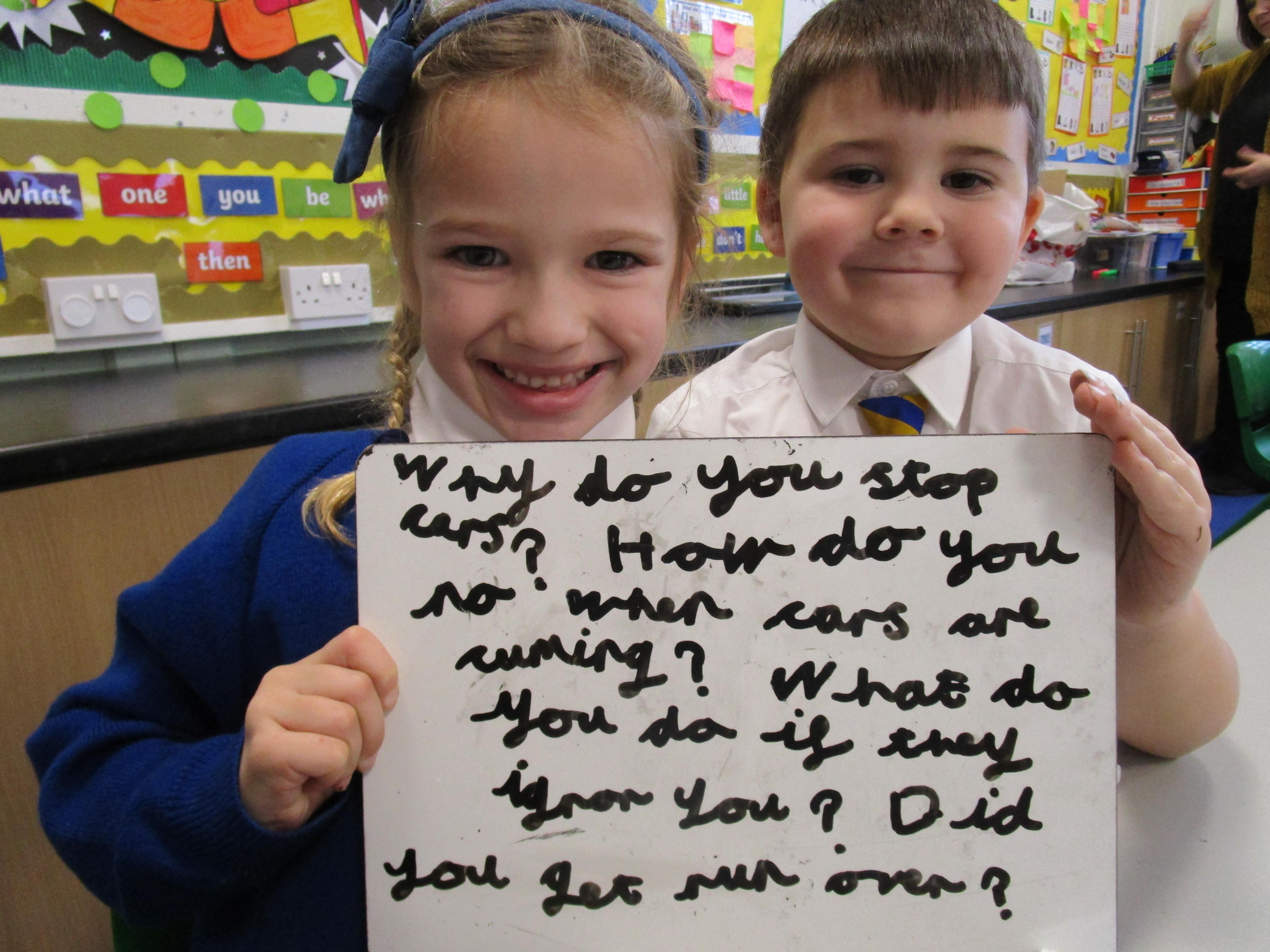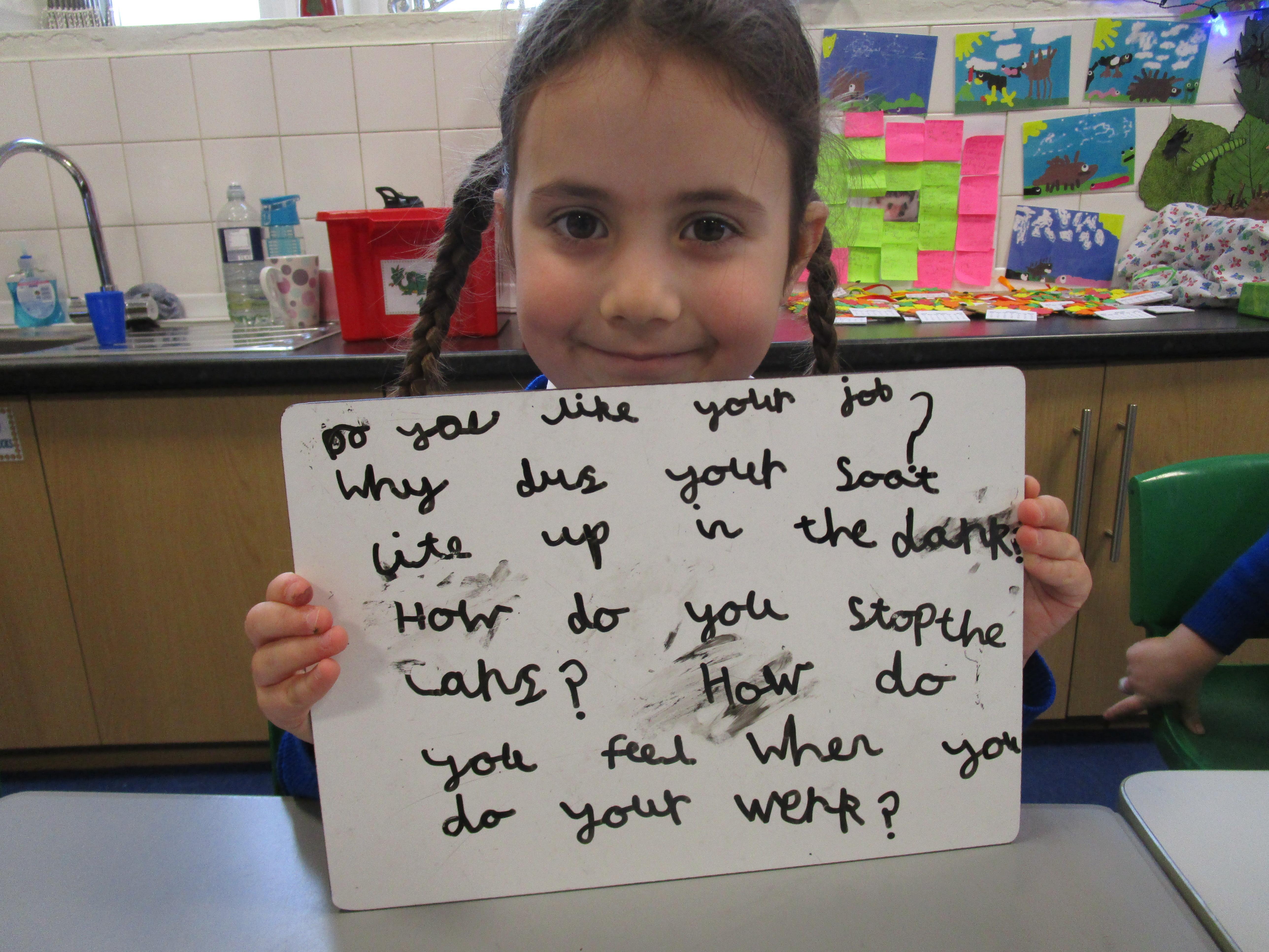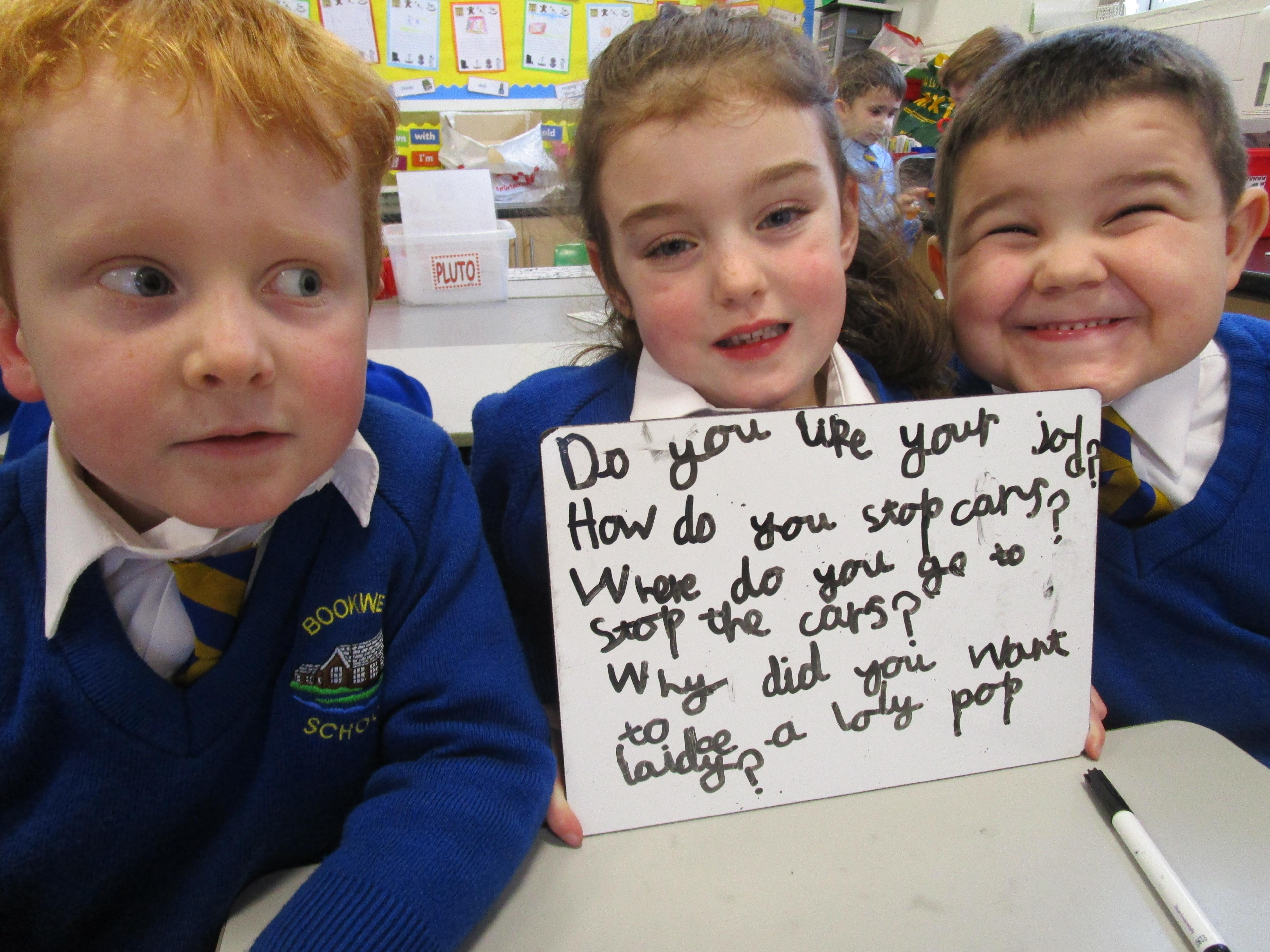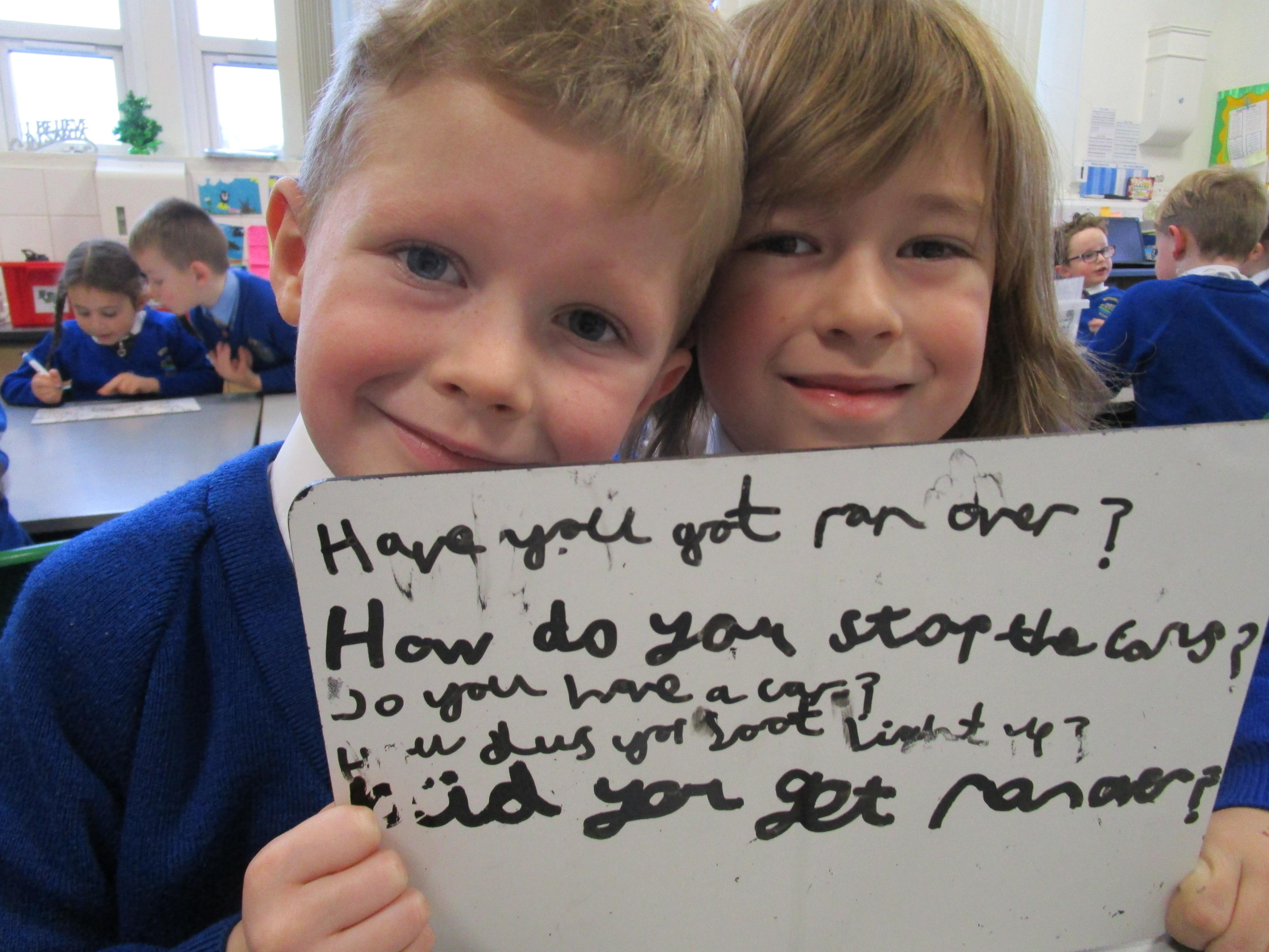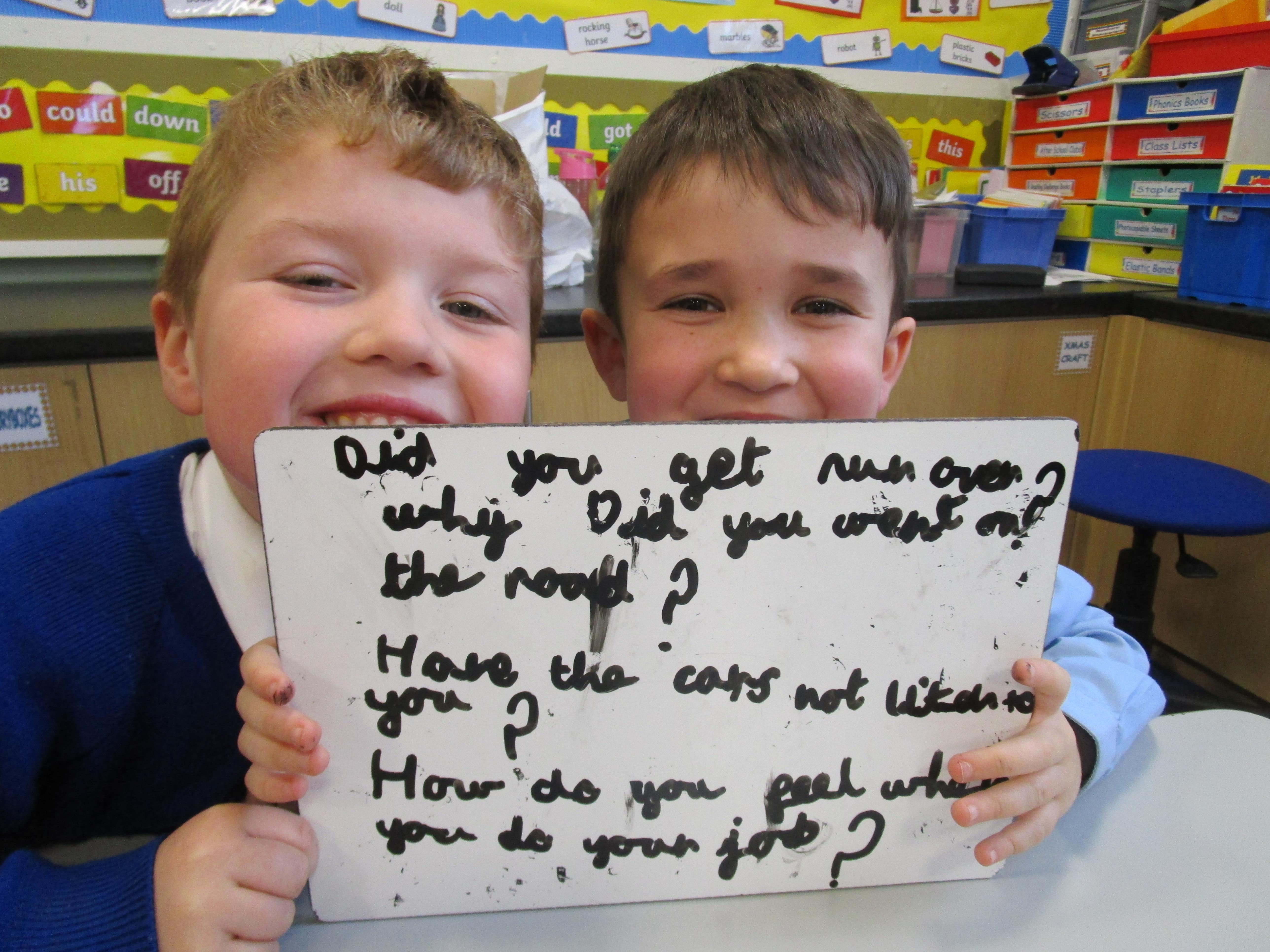 Today the children have been asking questions to our school lollipop lady. They had to work in pairs to write down the questions that they wanted to ask her, making sure they started their sentence with a capital letter and ended it with a question mark.