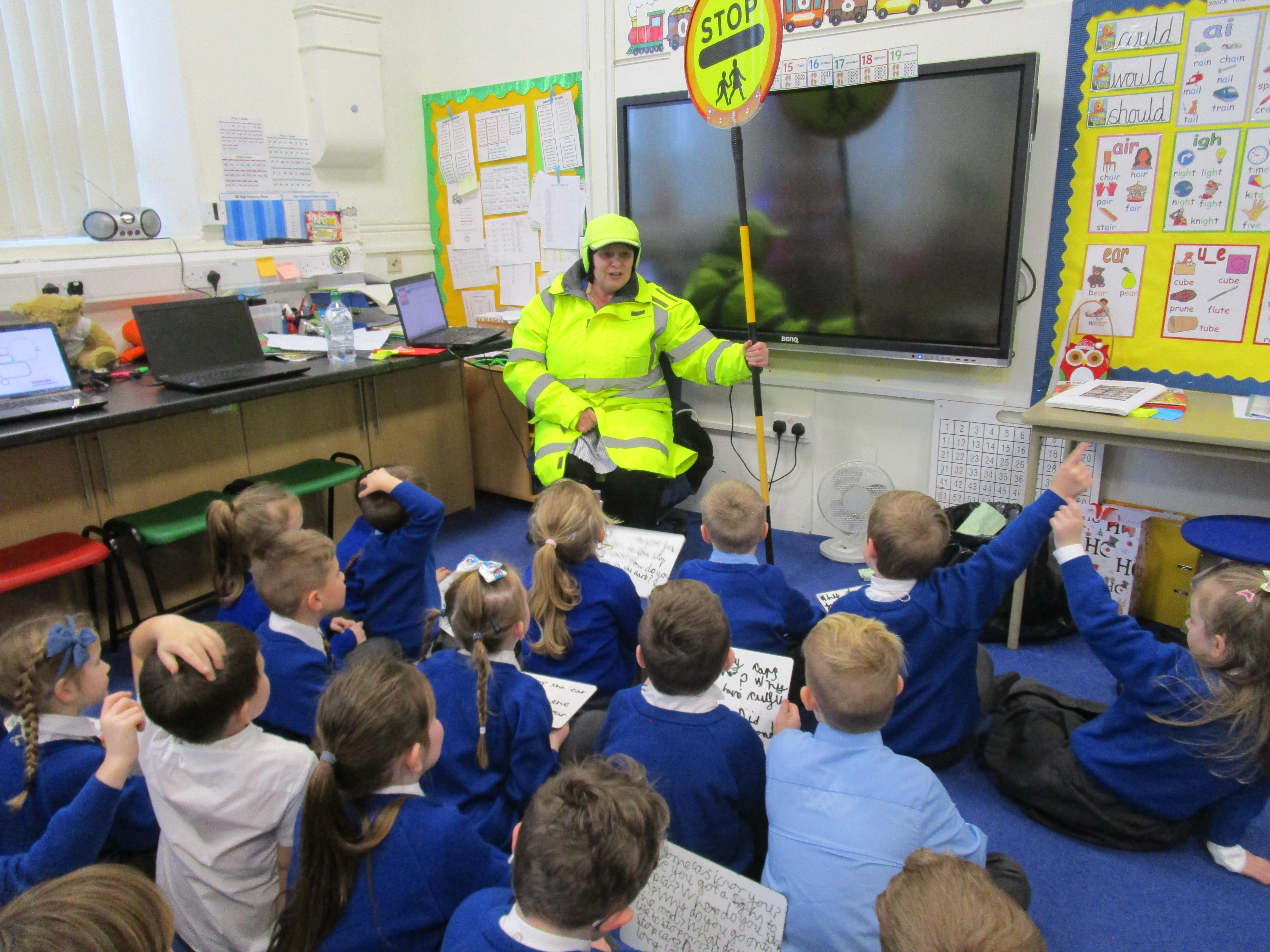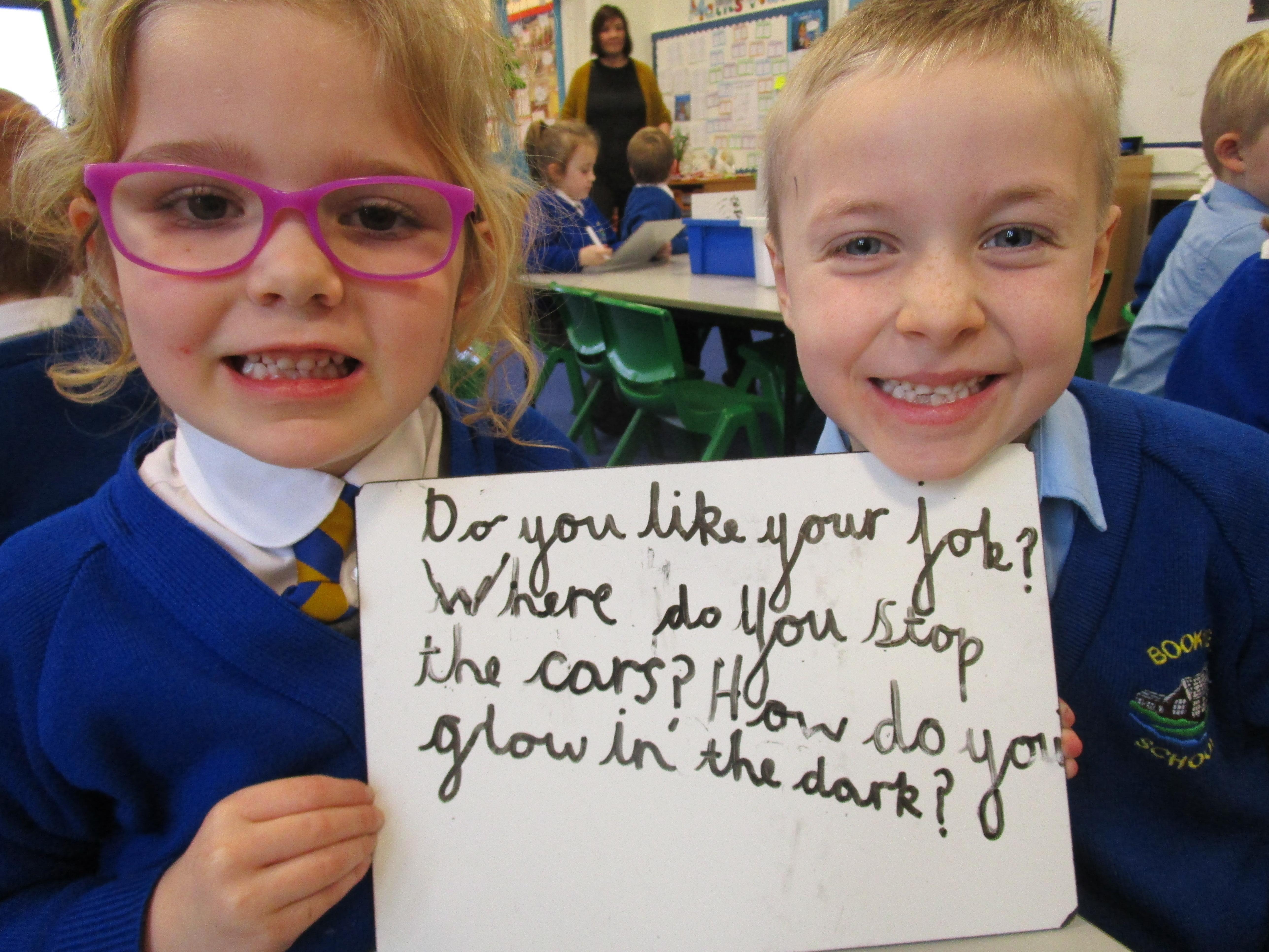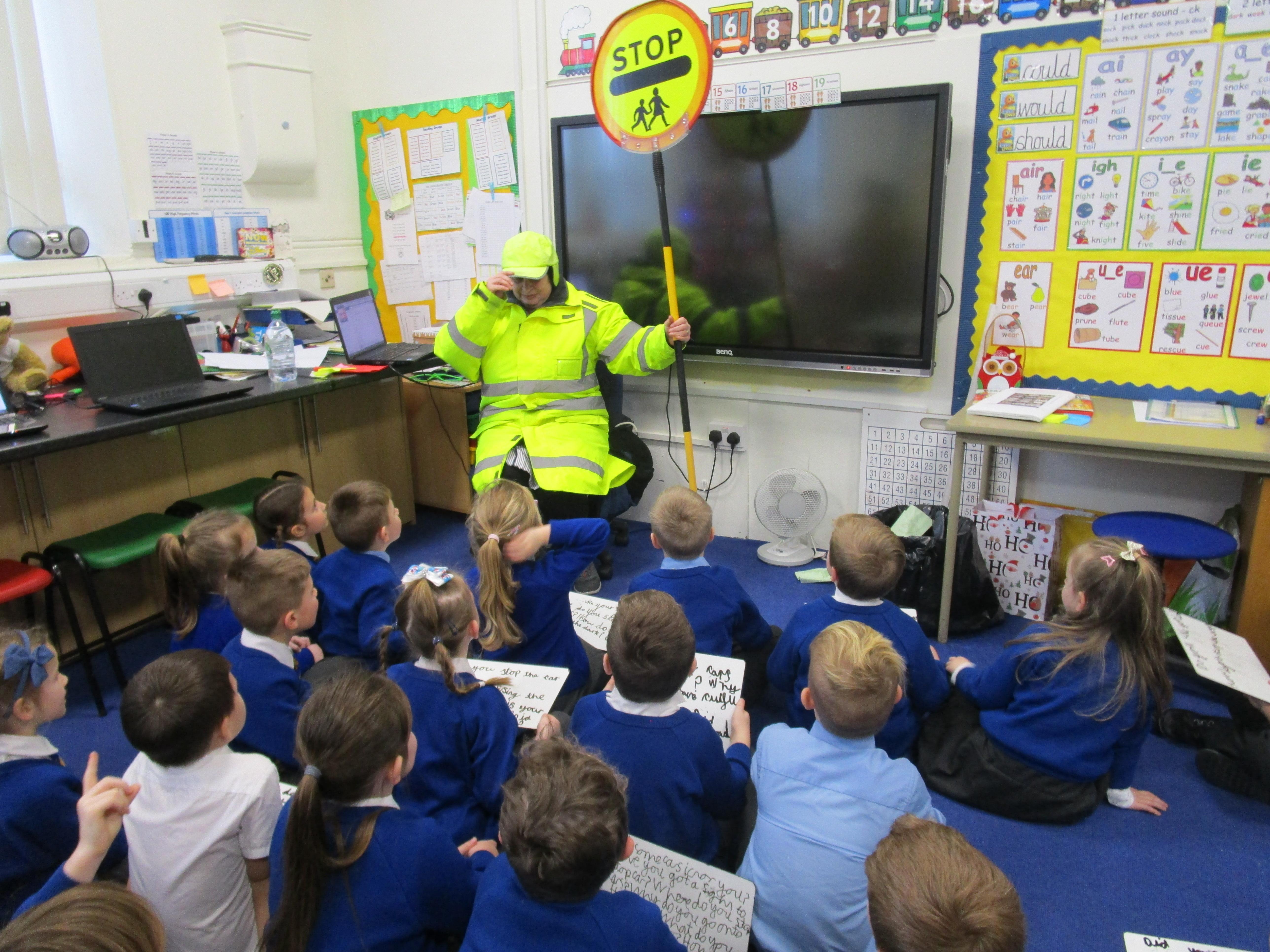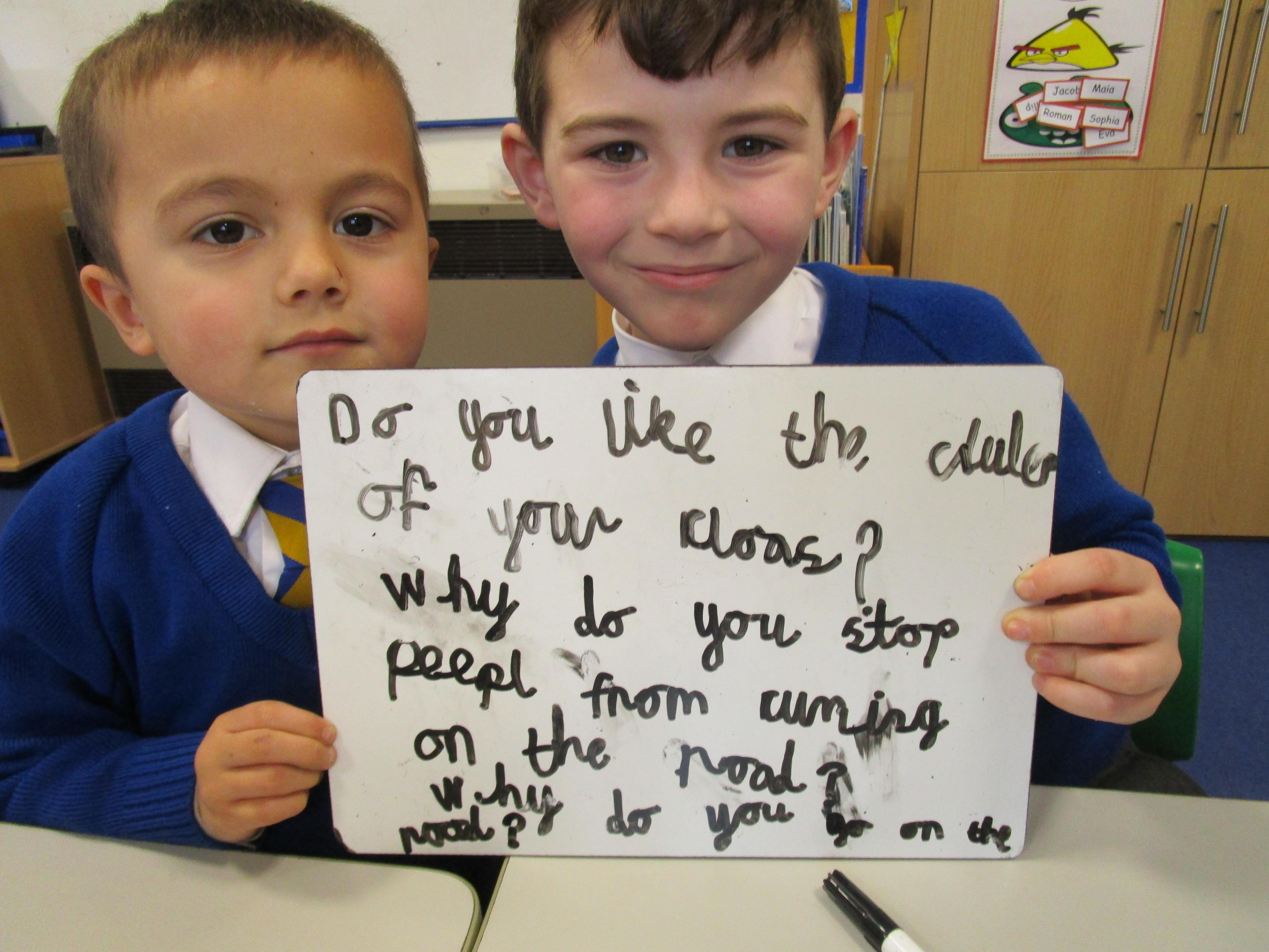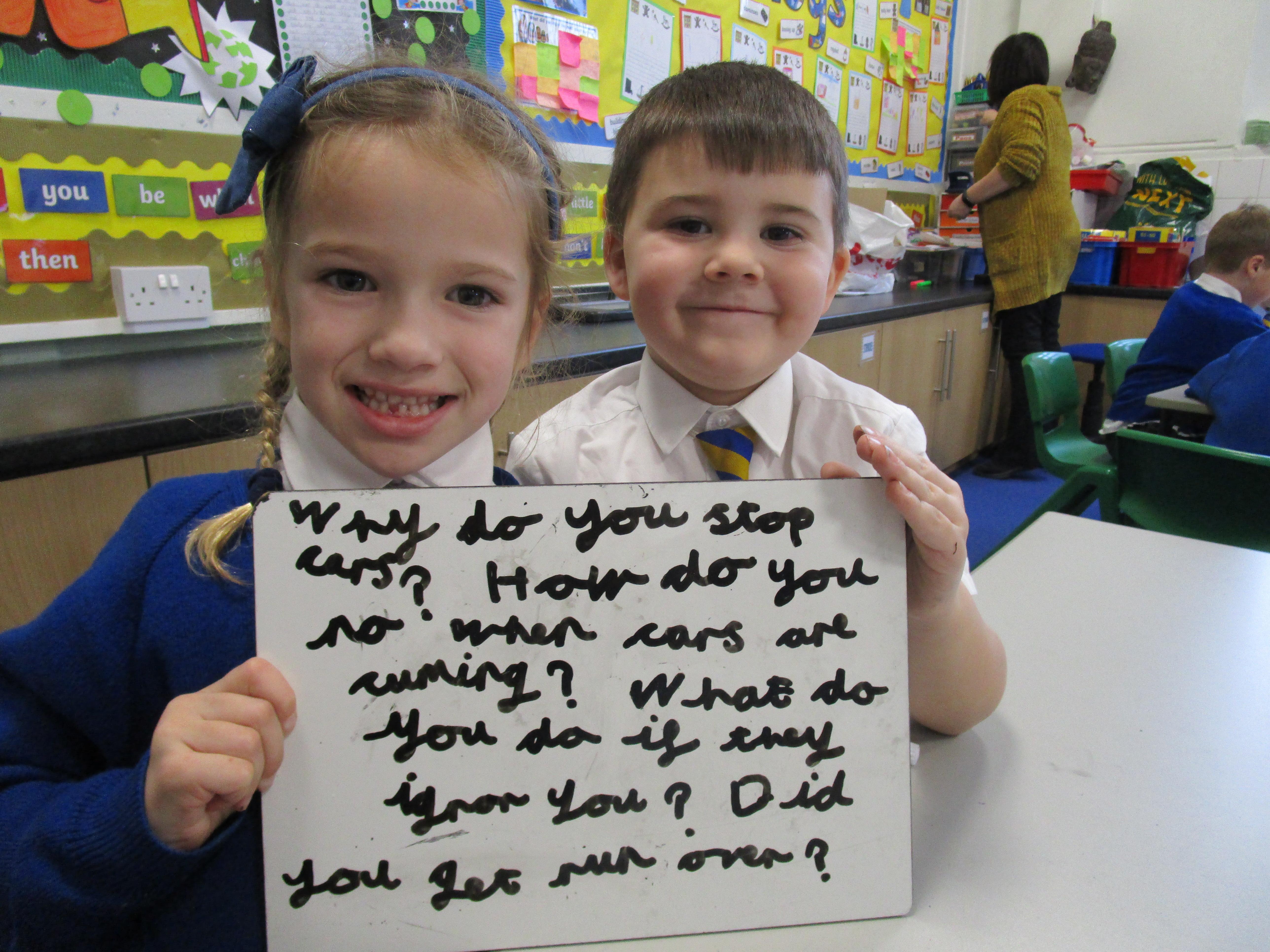 Today the children have been asking questions to our school lollipop lady. They had to work in pairs to write down the questions that they wanted to ask her, making sure they started their sentence with a capital letter and ended it with a question mark.