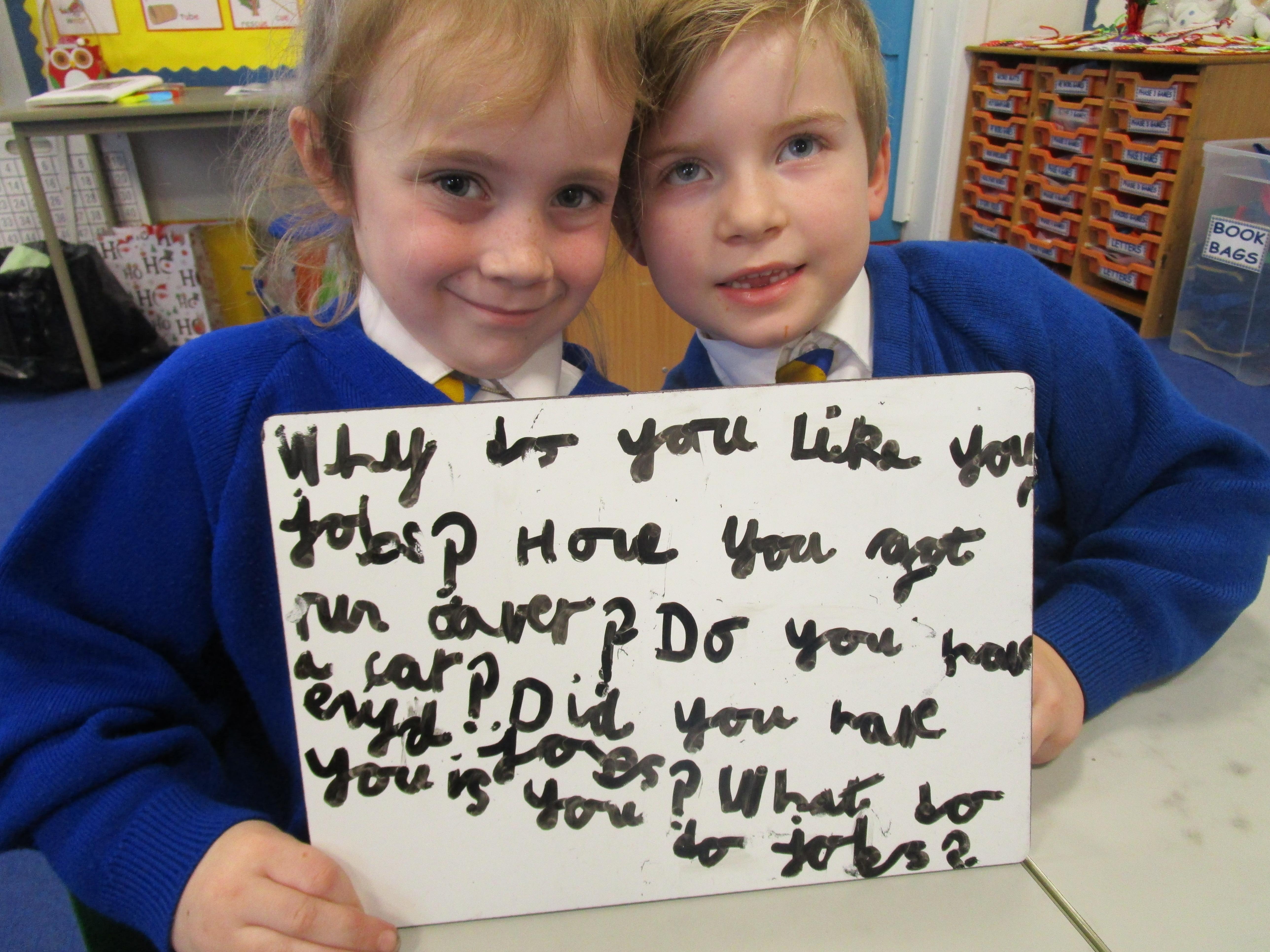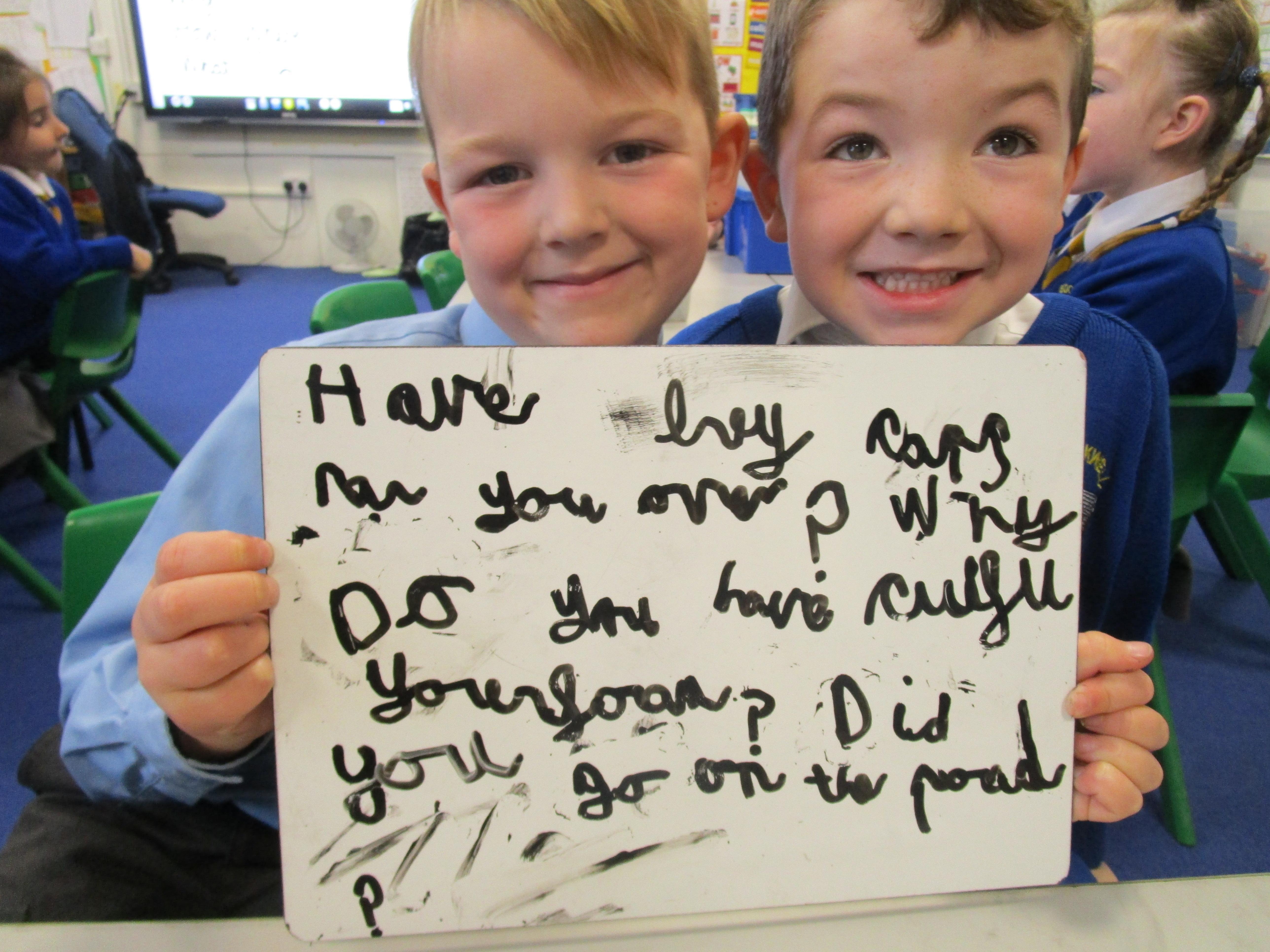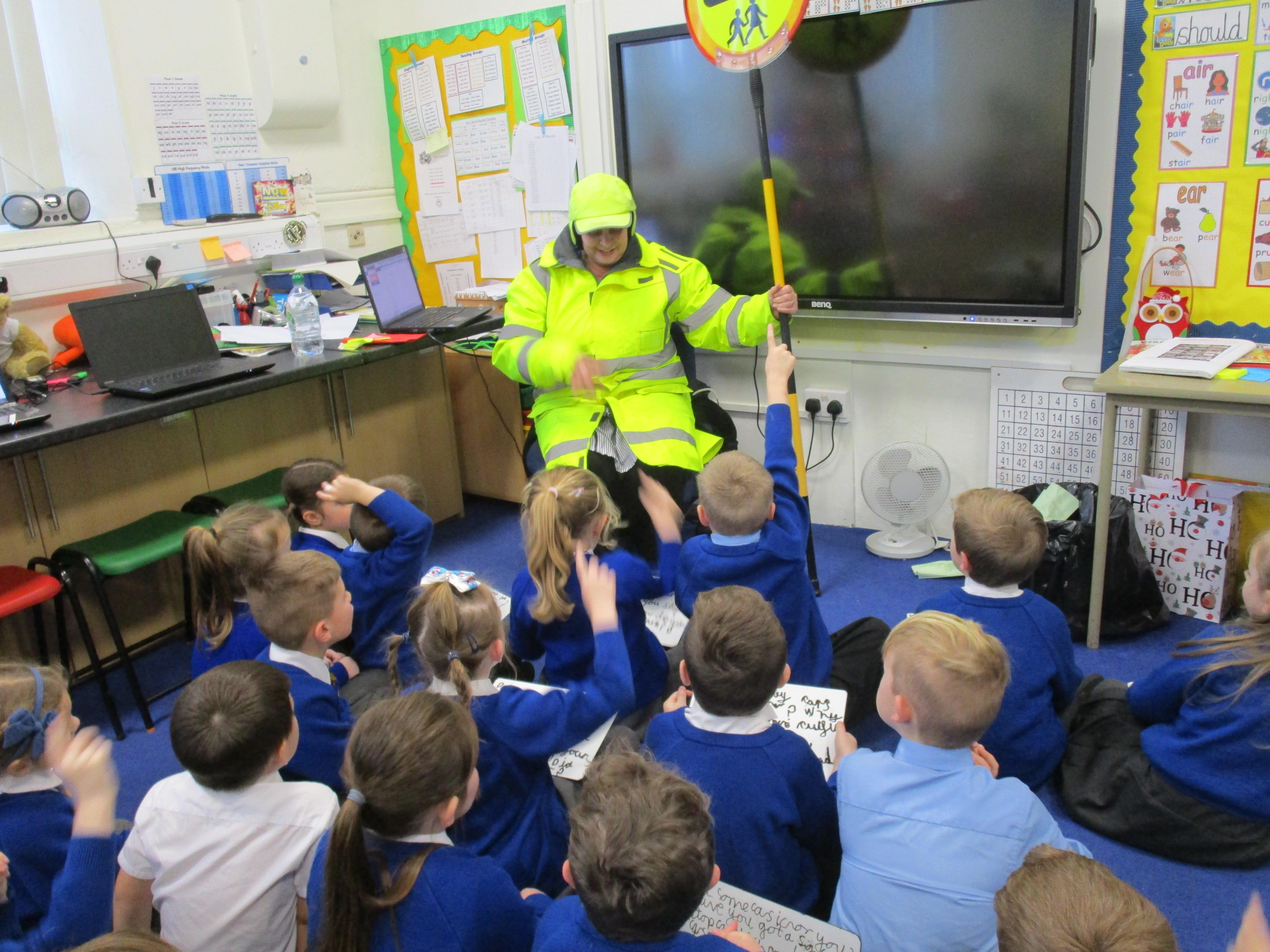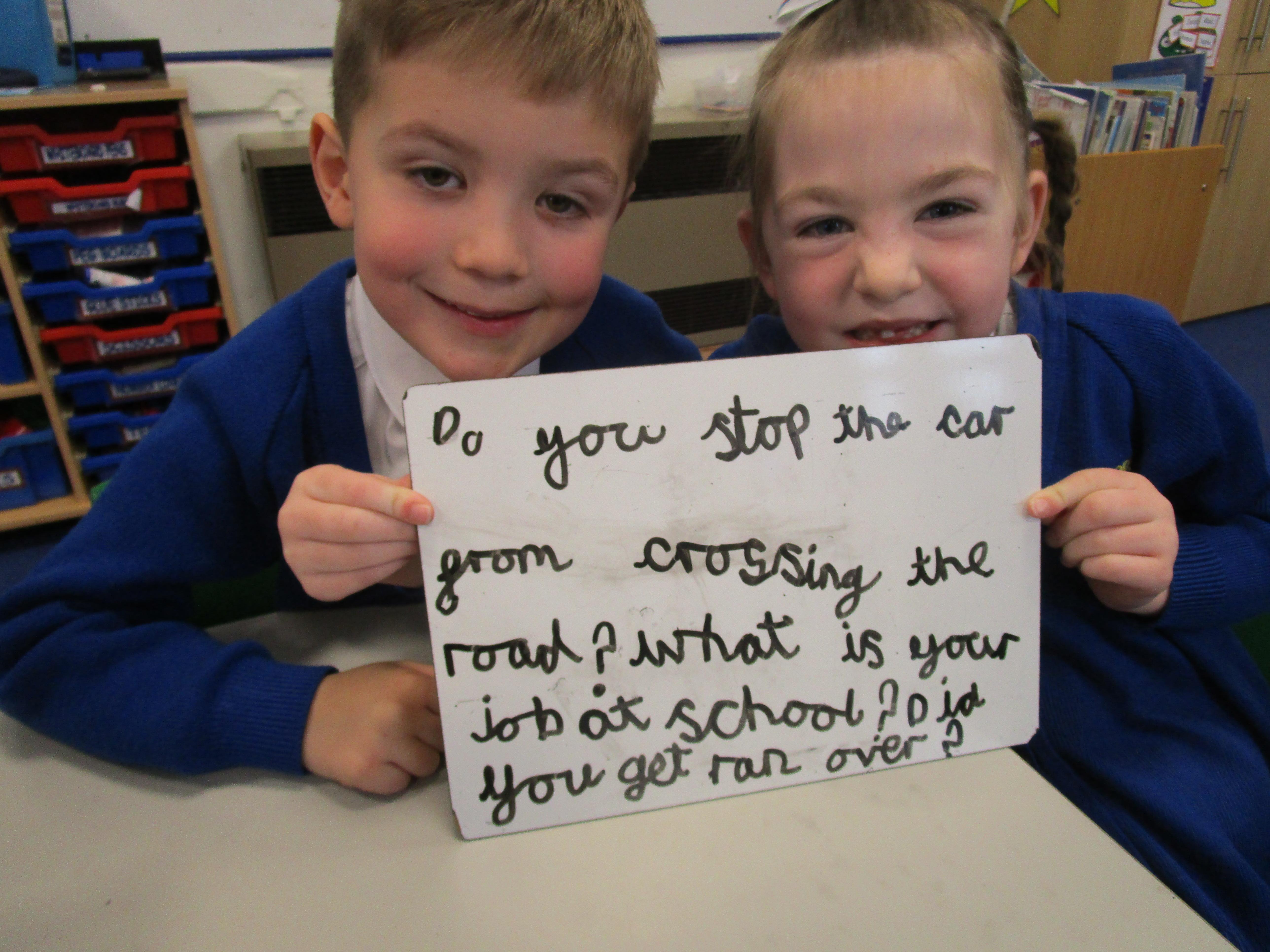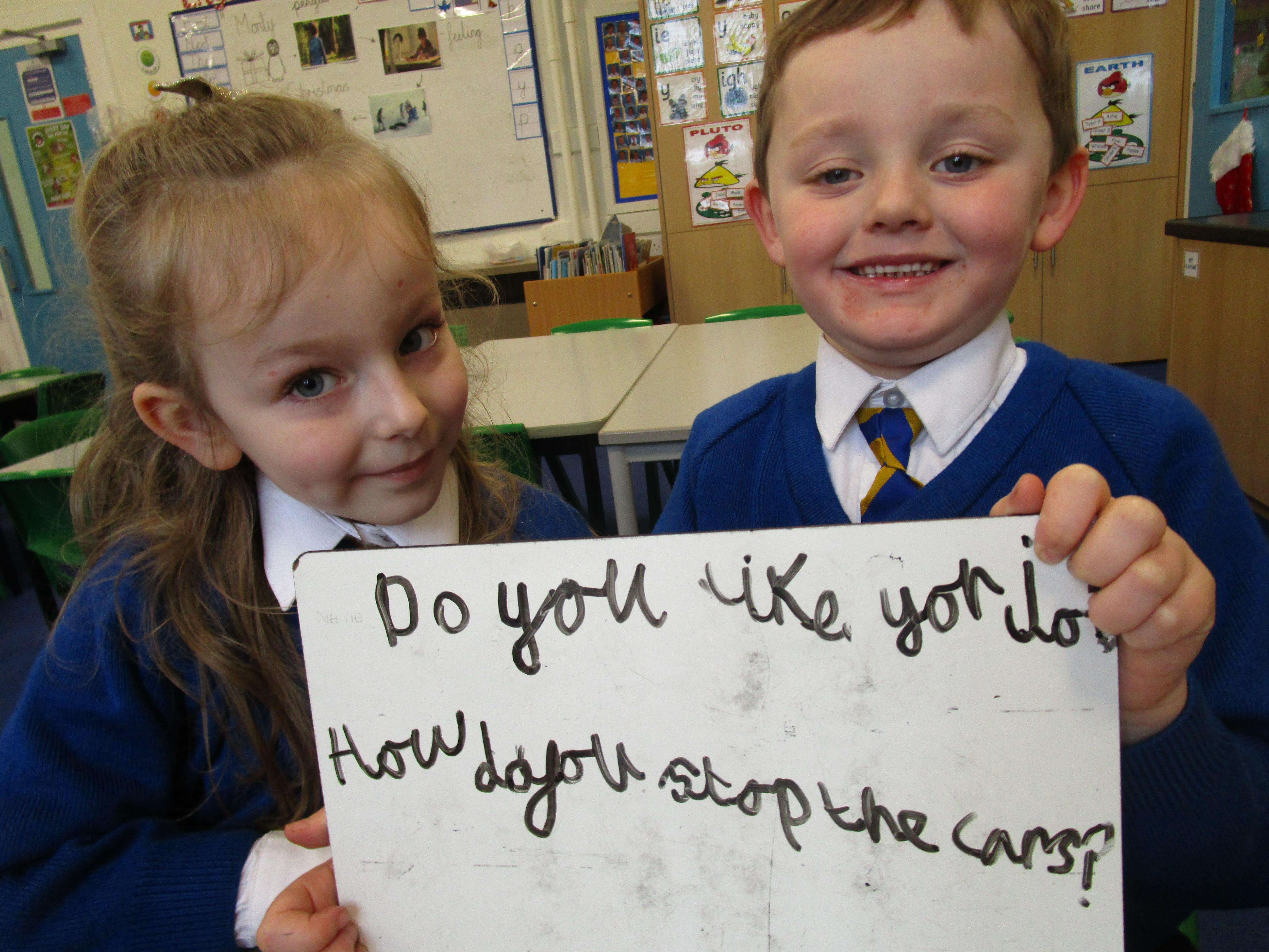 Today the children have been asking questions to our school lollipop lady. They had to work in pairs to write down the questions that they wanted to ask her, making sure they started their sentence with a capital letter and ended it with a question mark.