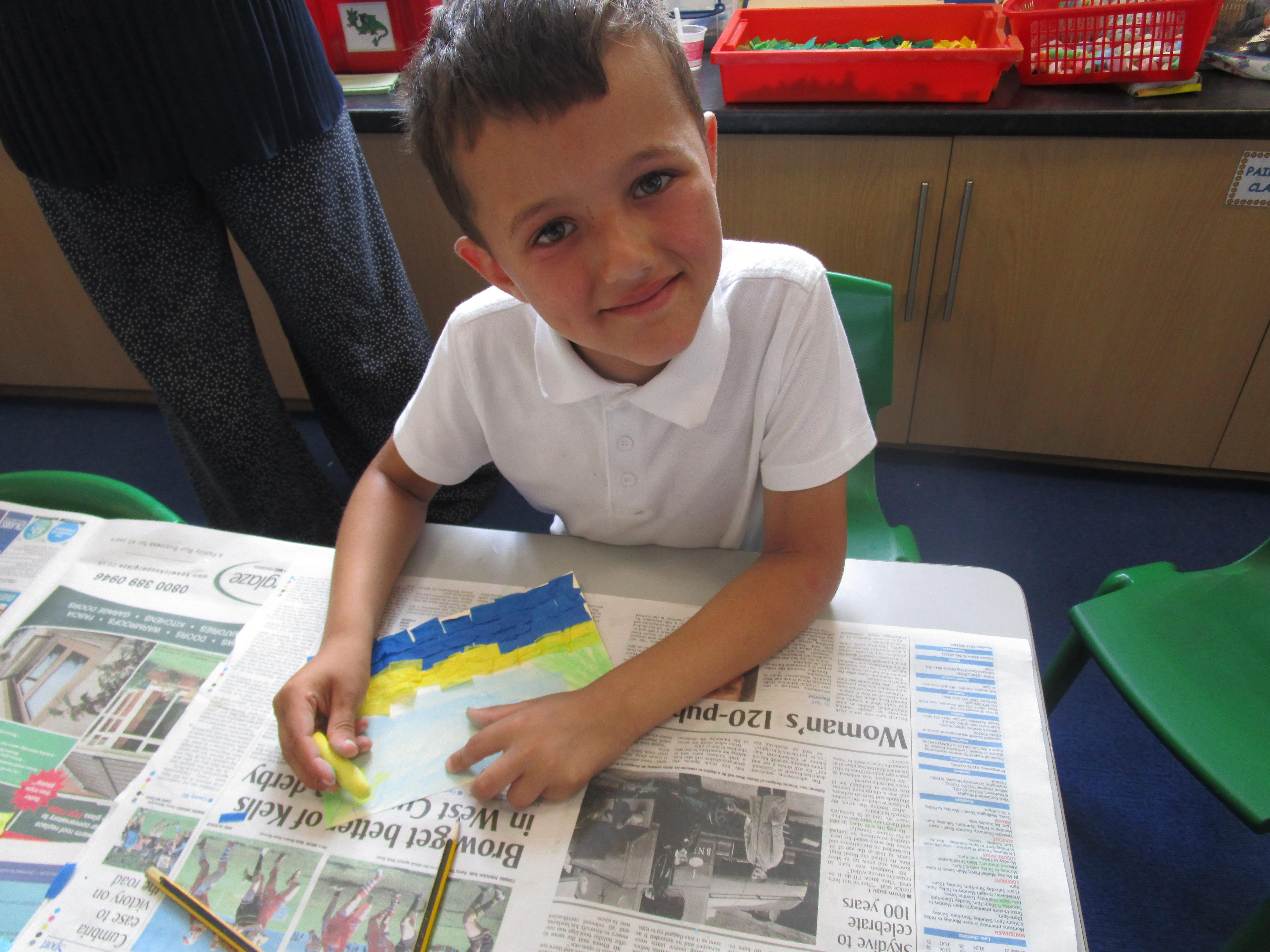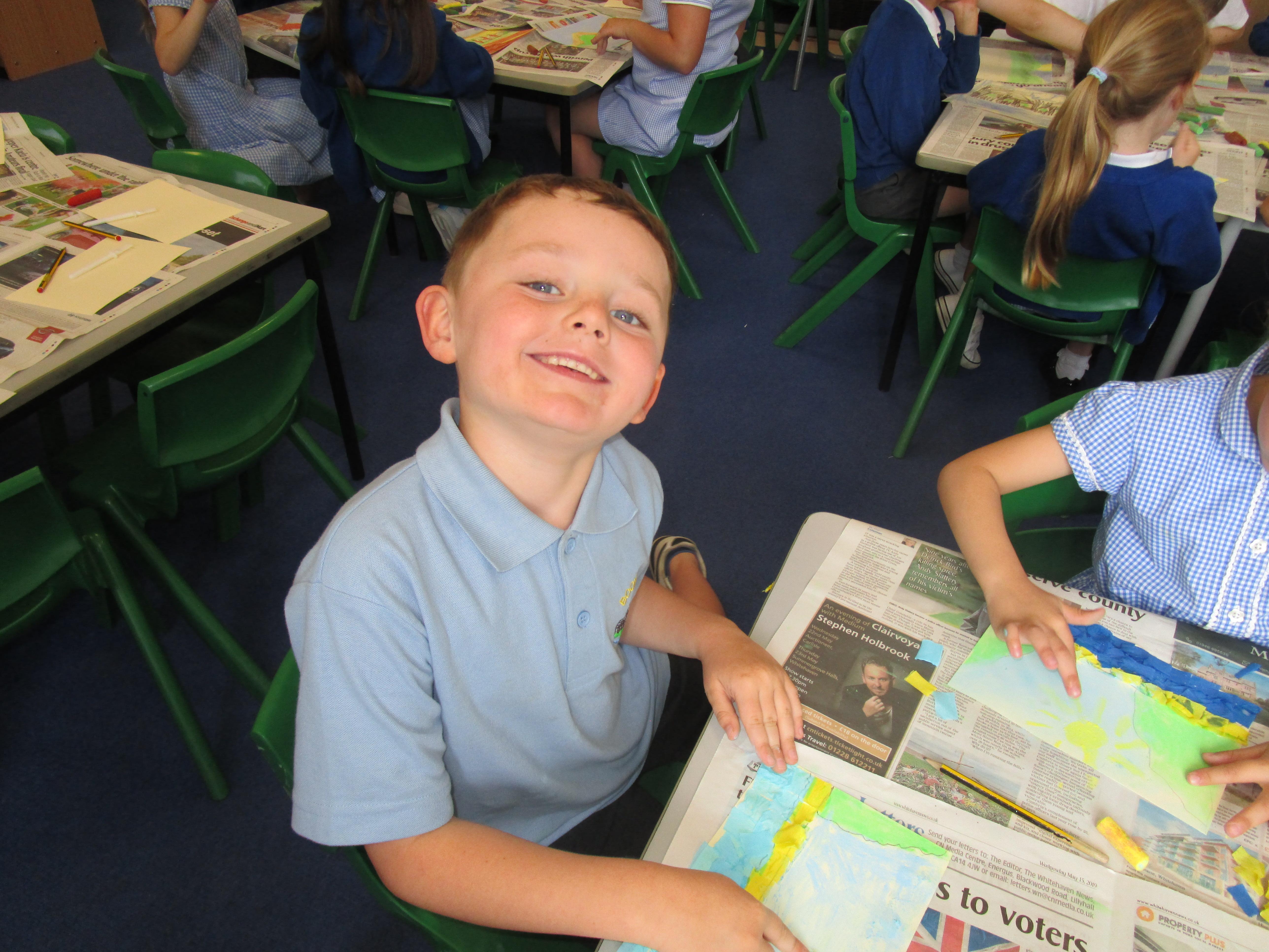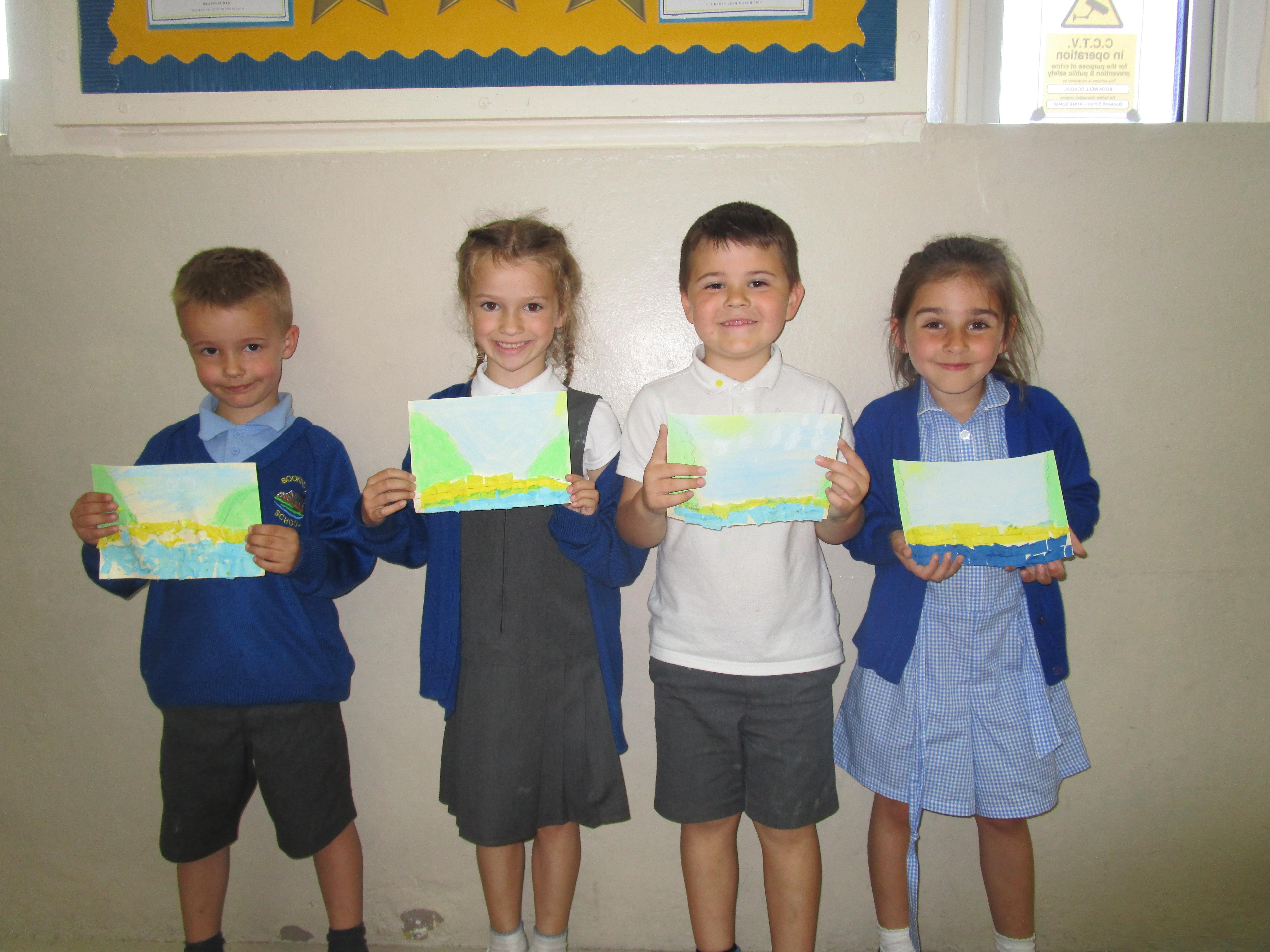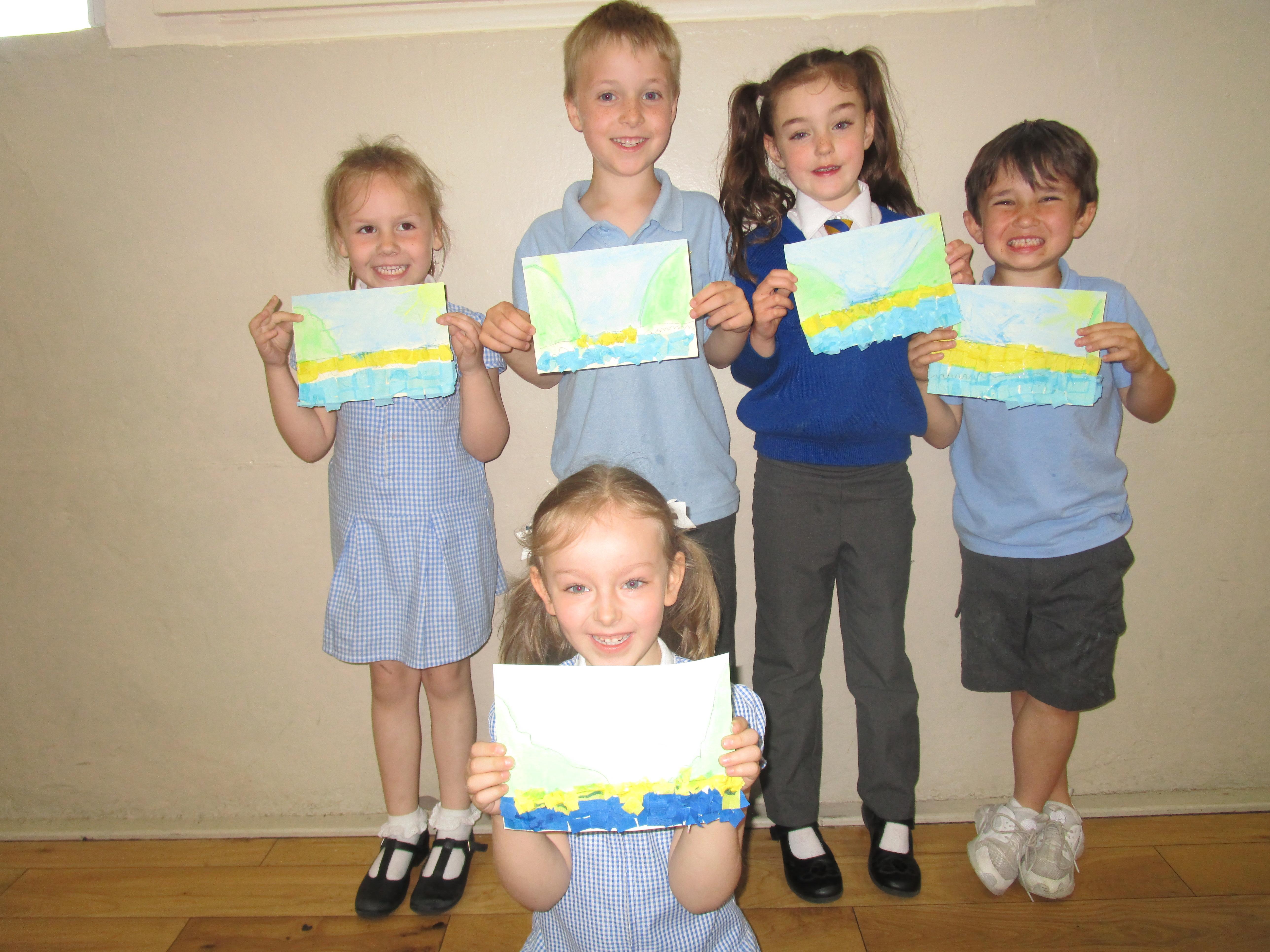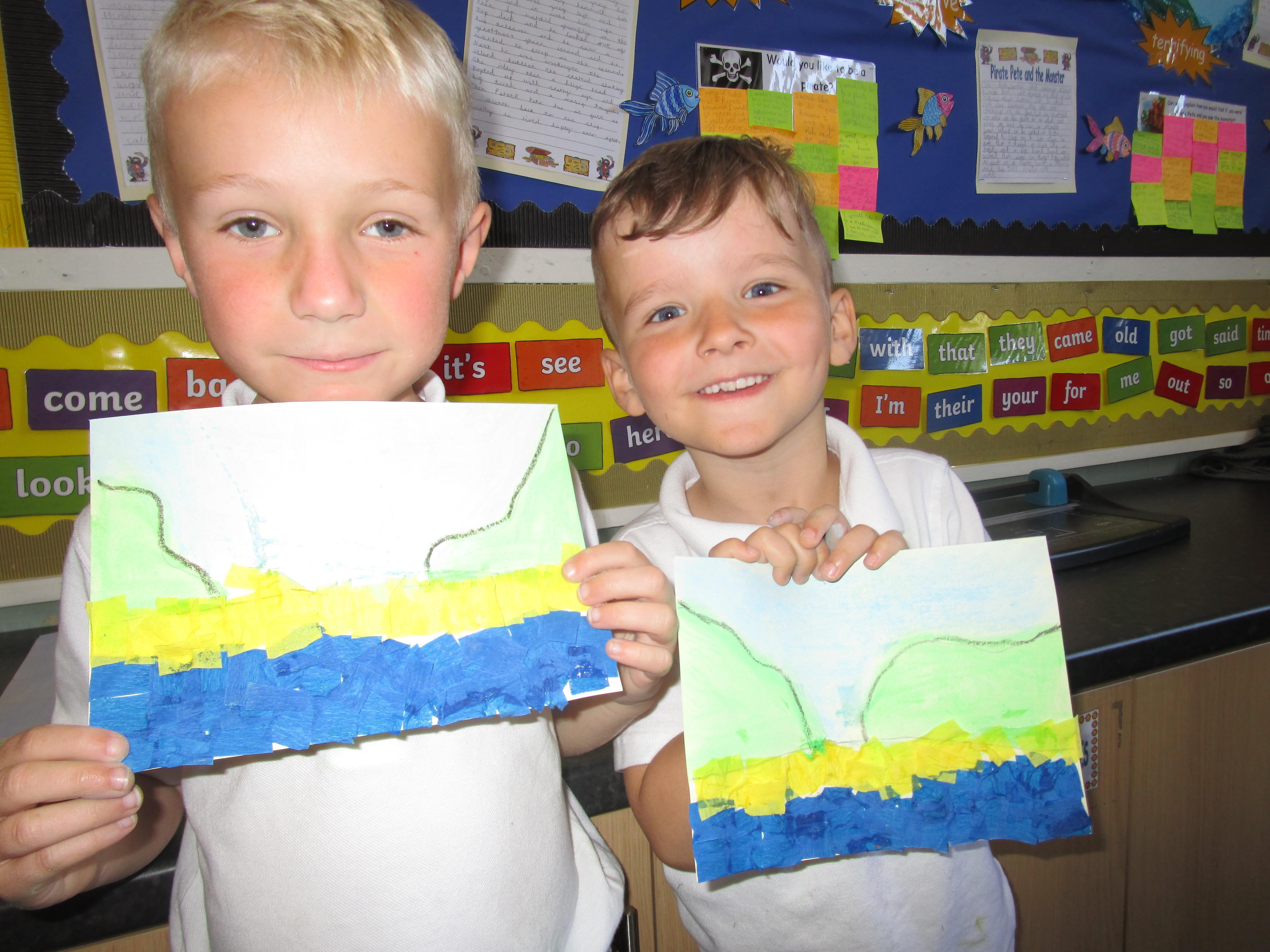 This week the Reception and Year 1 have produced a collage of a beach and the Year 2 and KS2 children have produced a chalk picture in the style of Percy Kelly.
