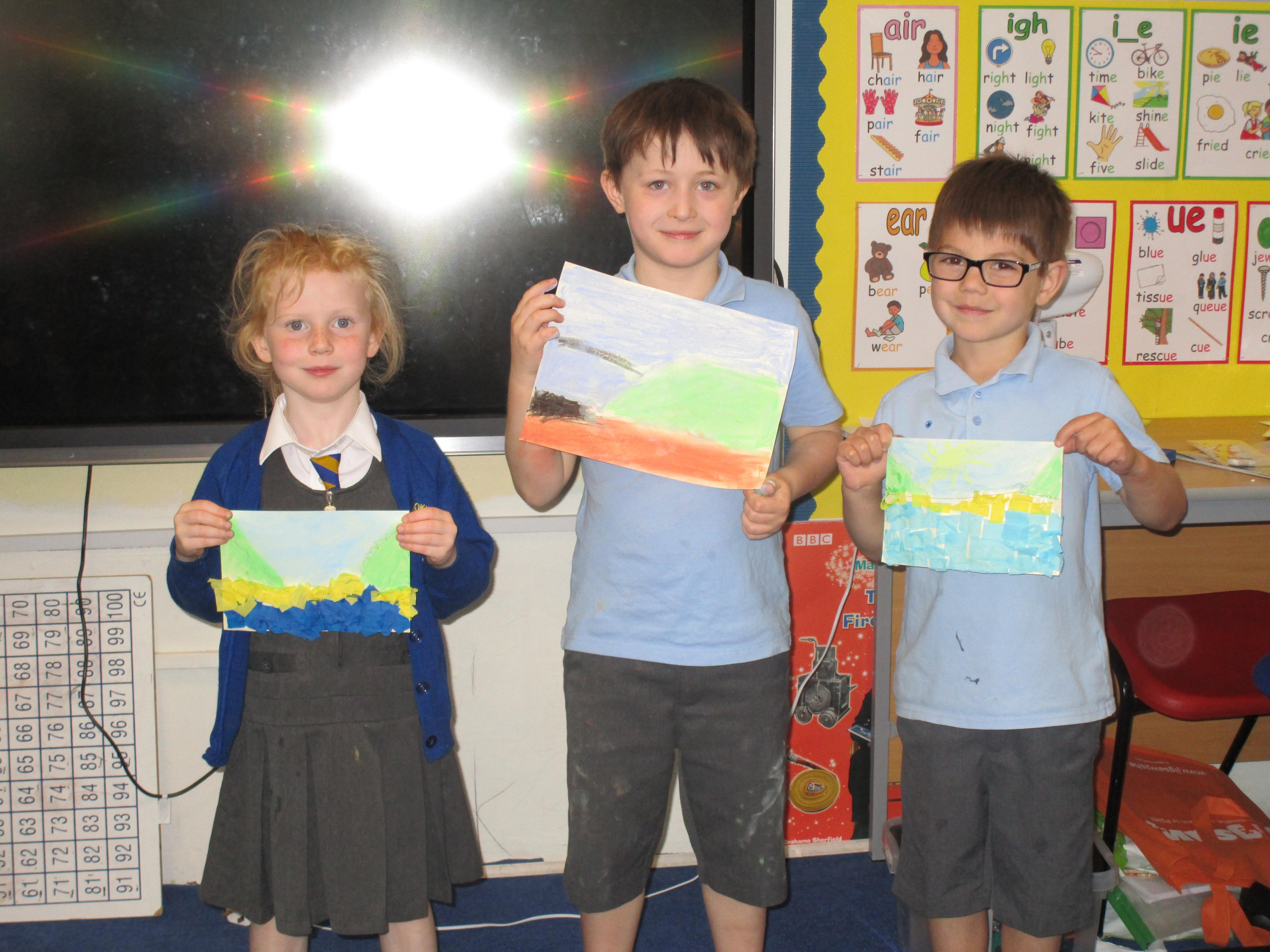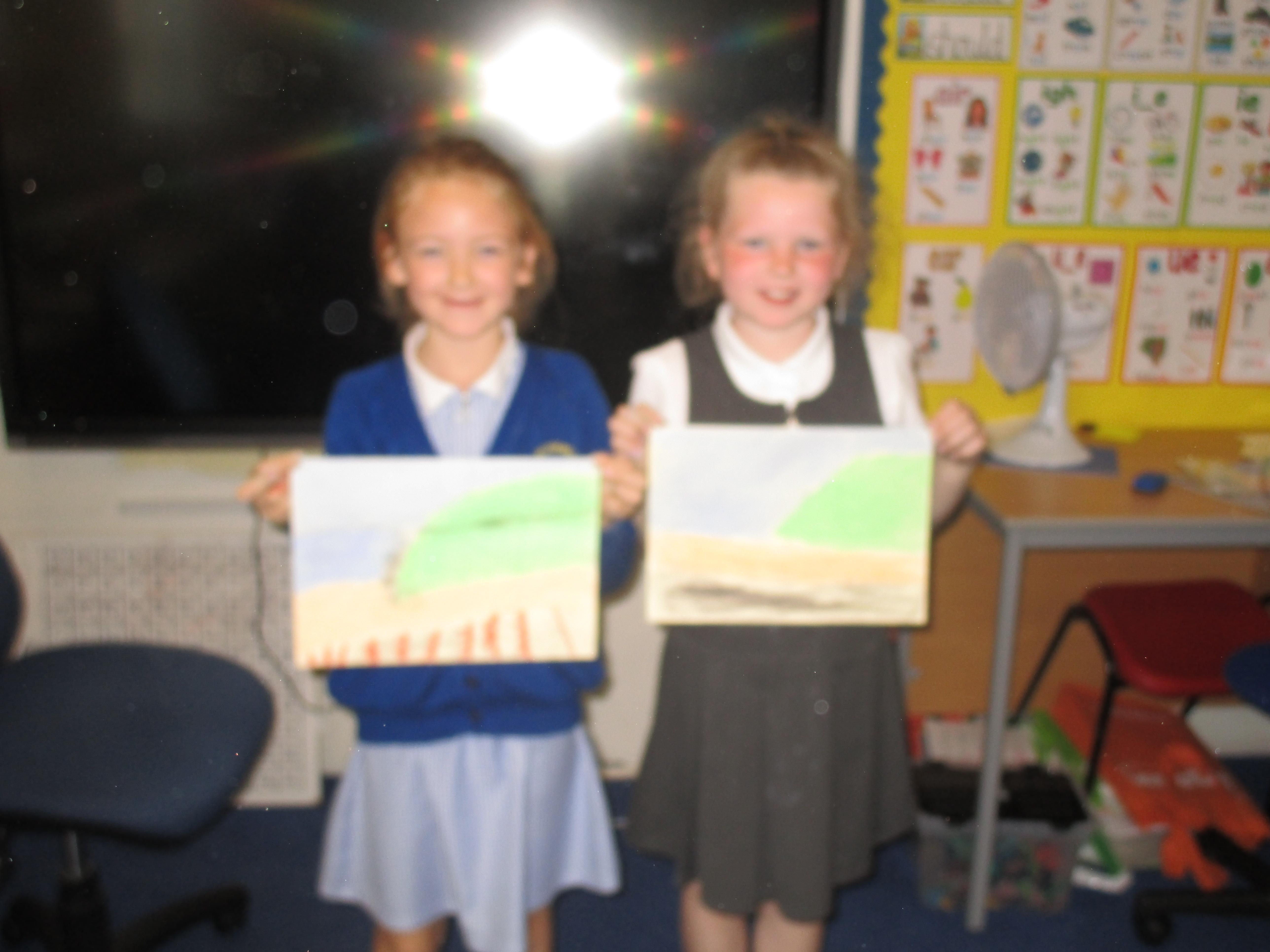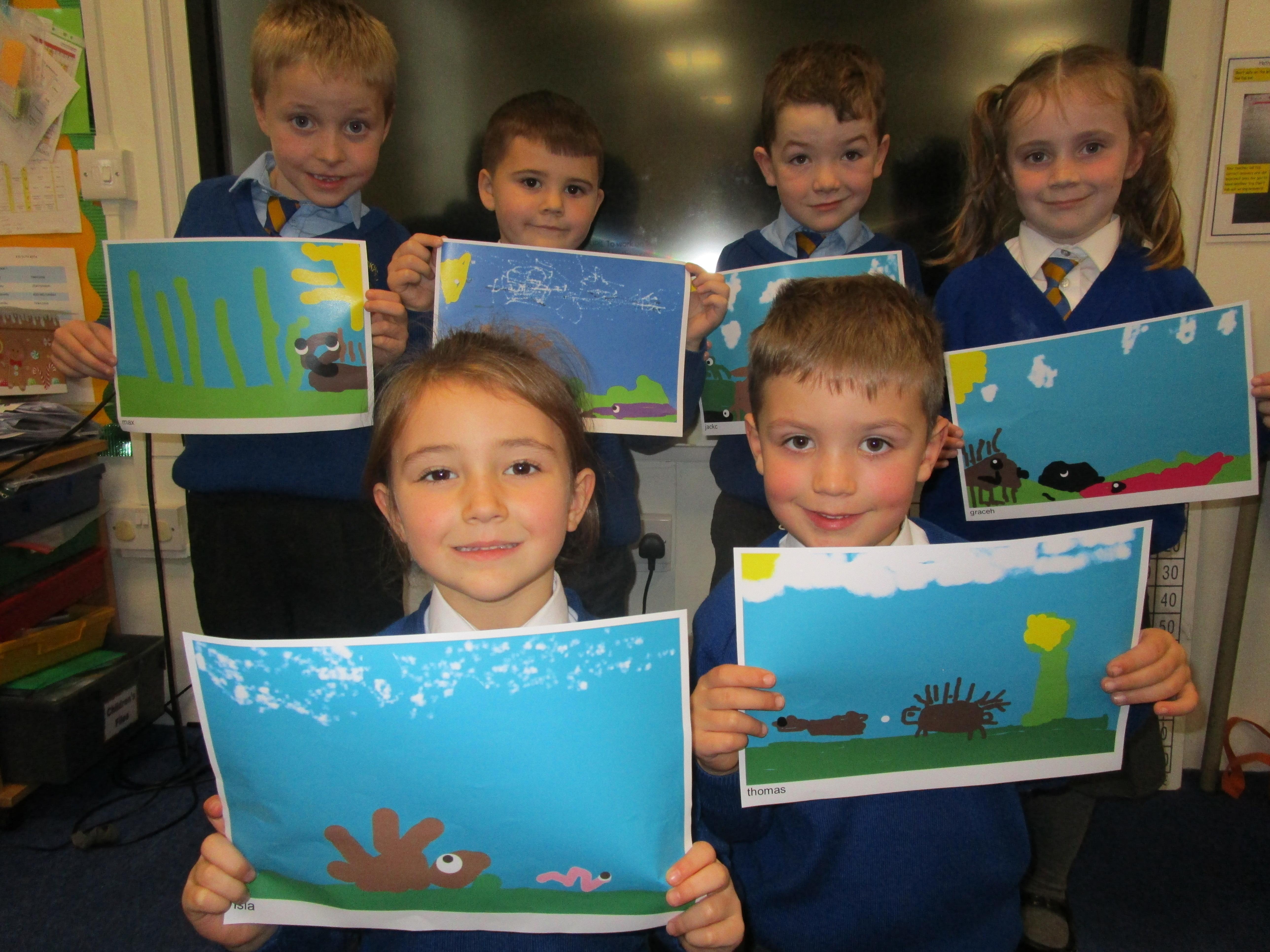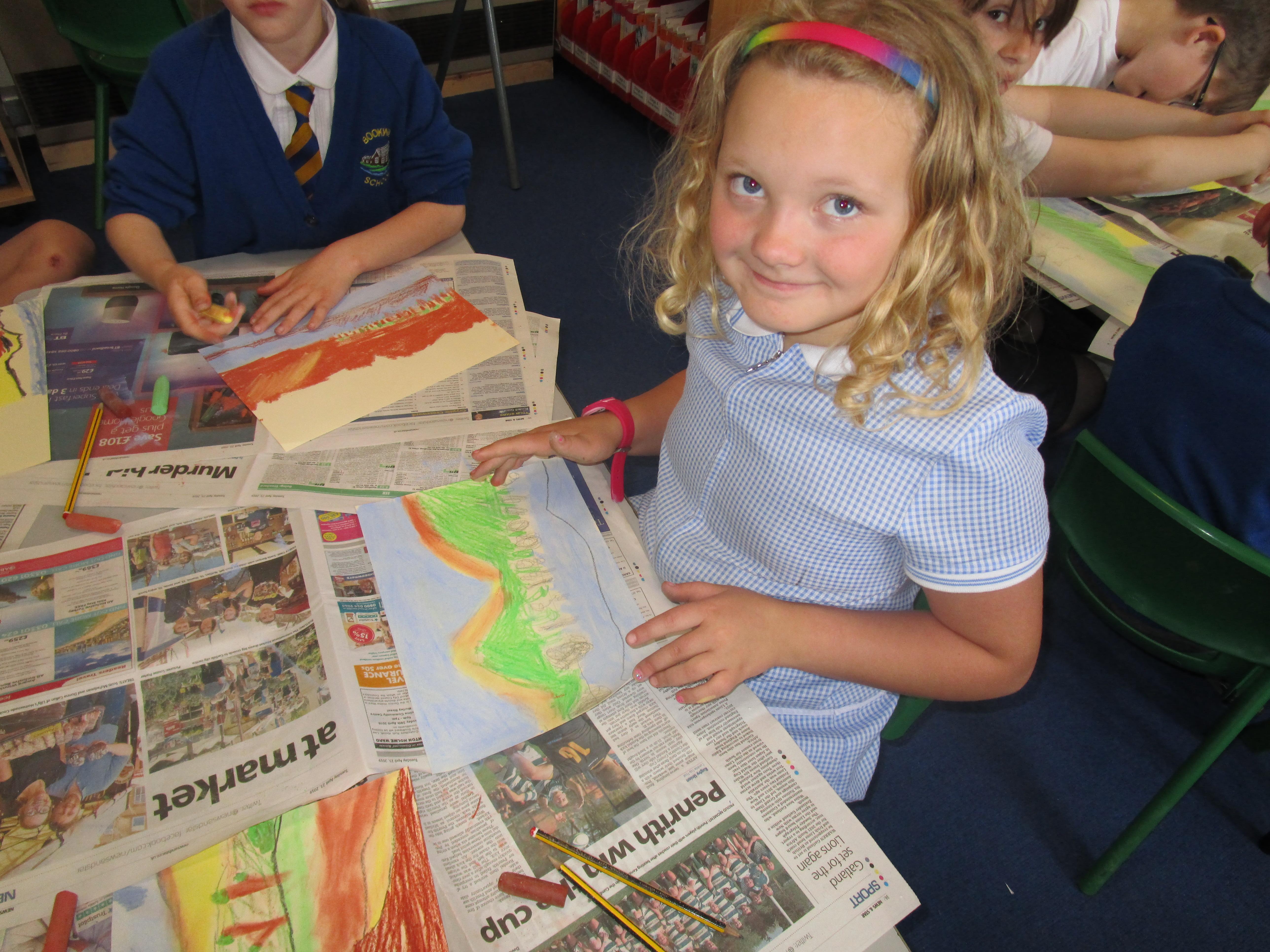 This week the Reception and Year 1 have produced a collage of a beach and the Year 2 and KS2 children have produced a chalk picture in the style of Percy Kelly.