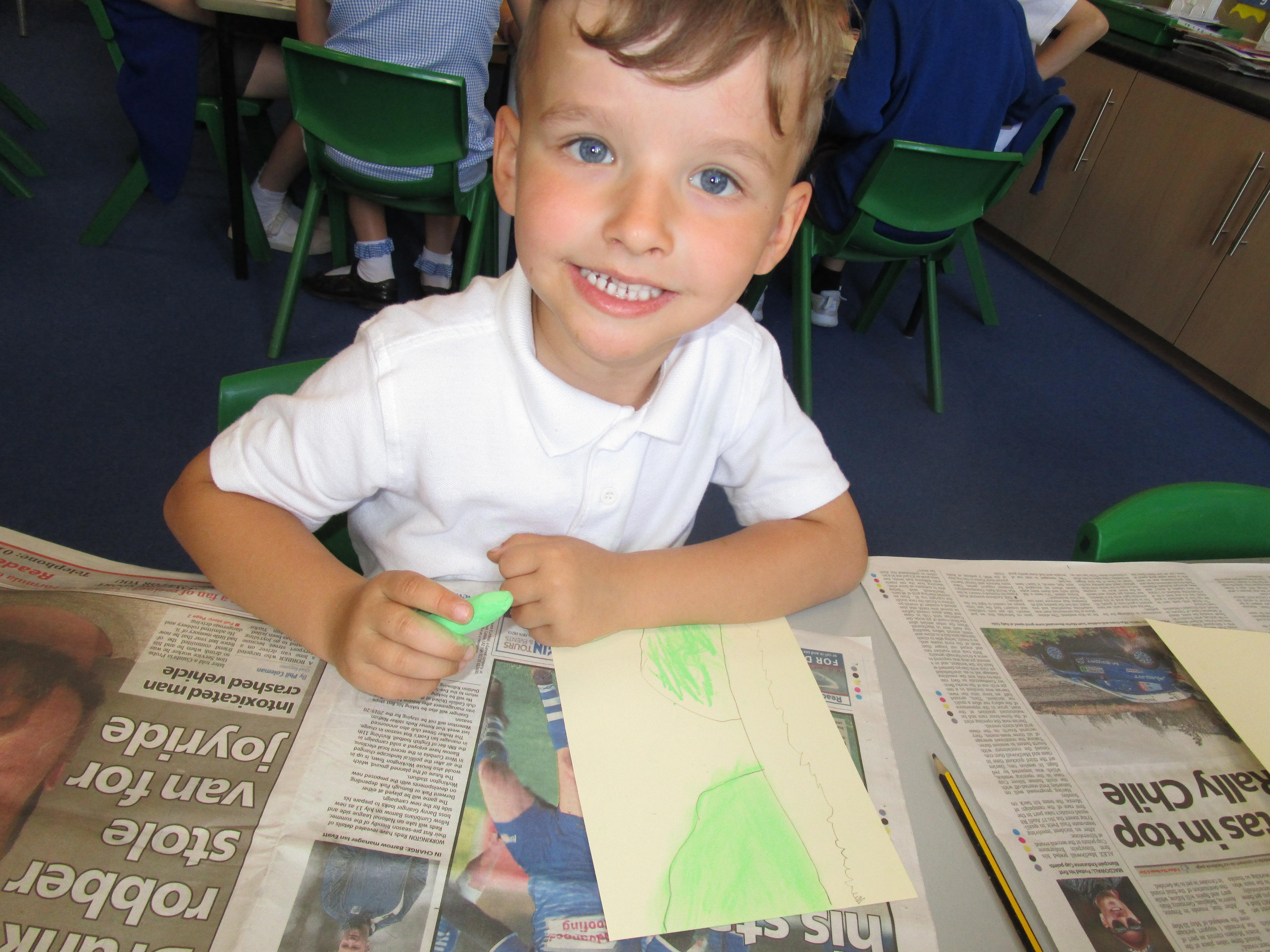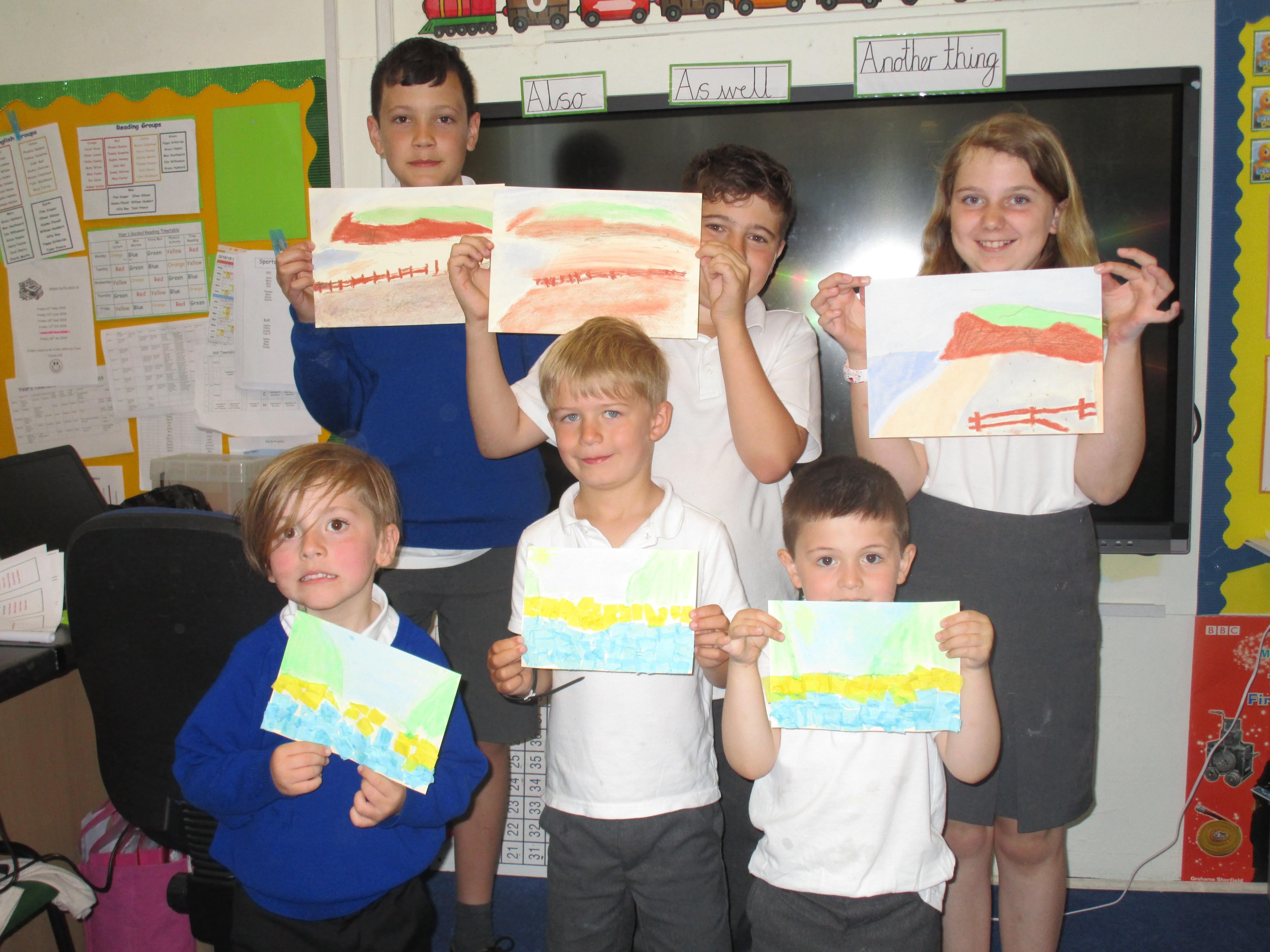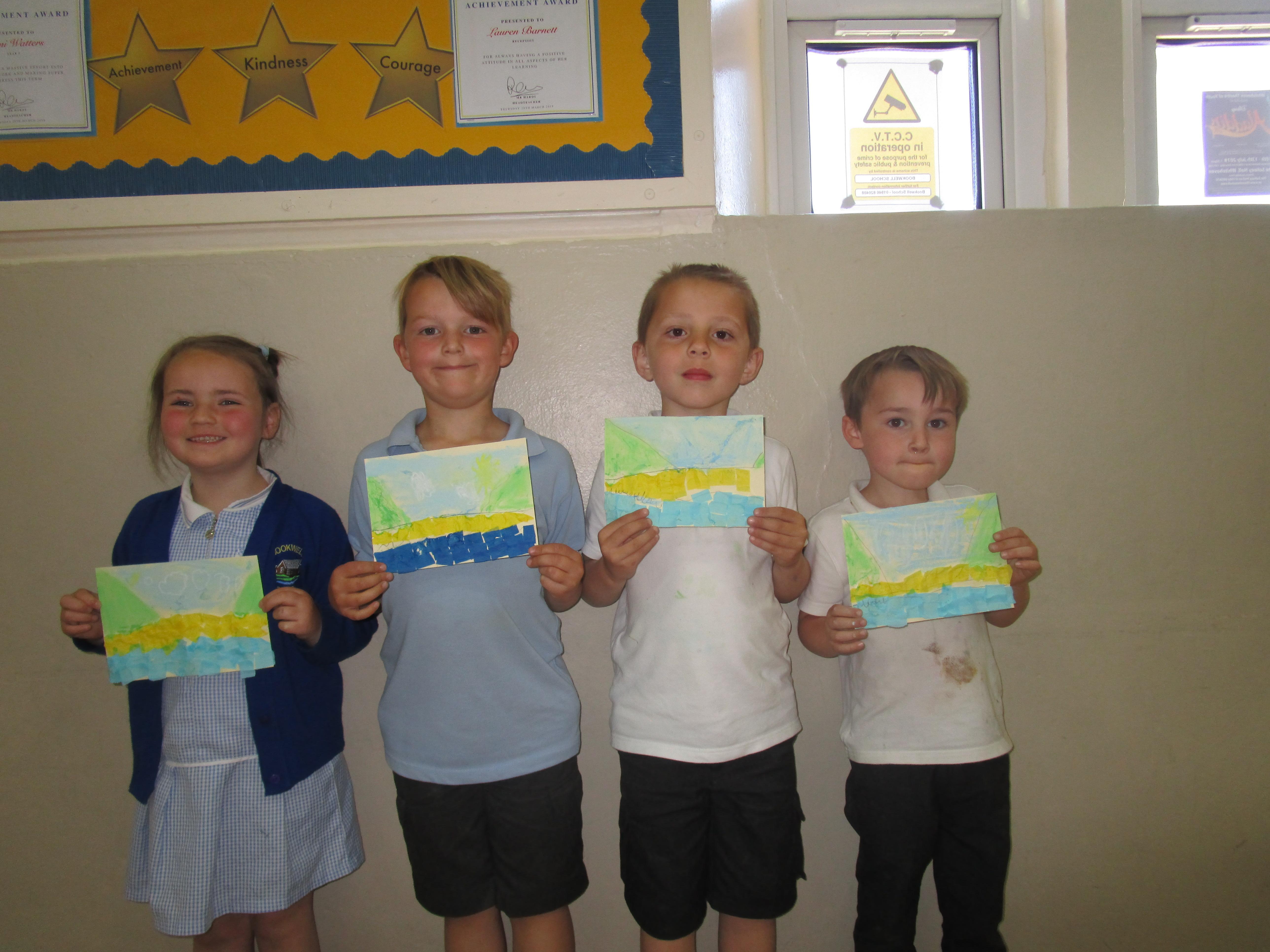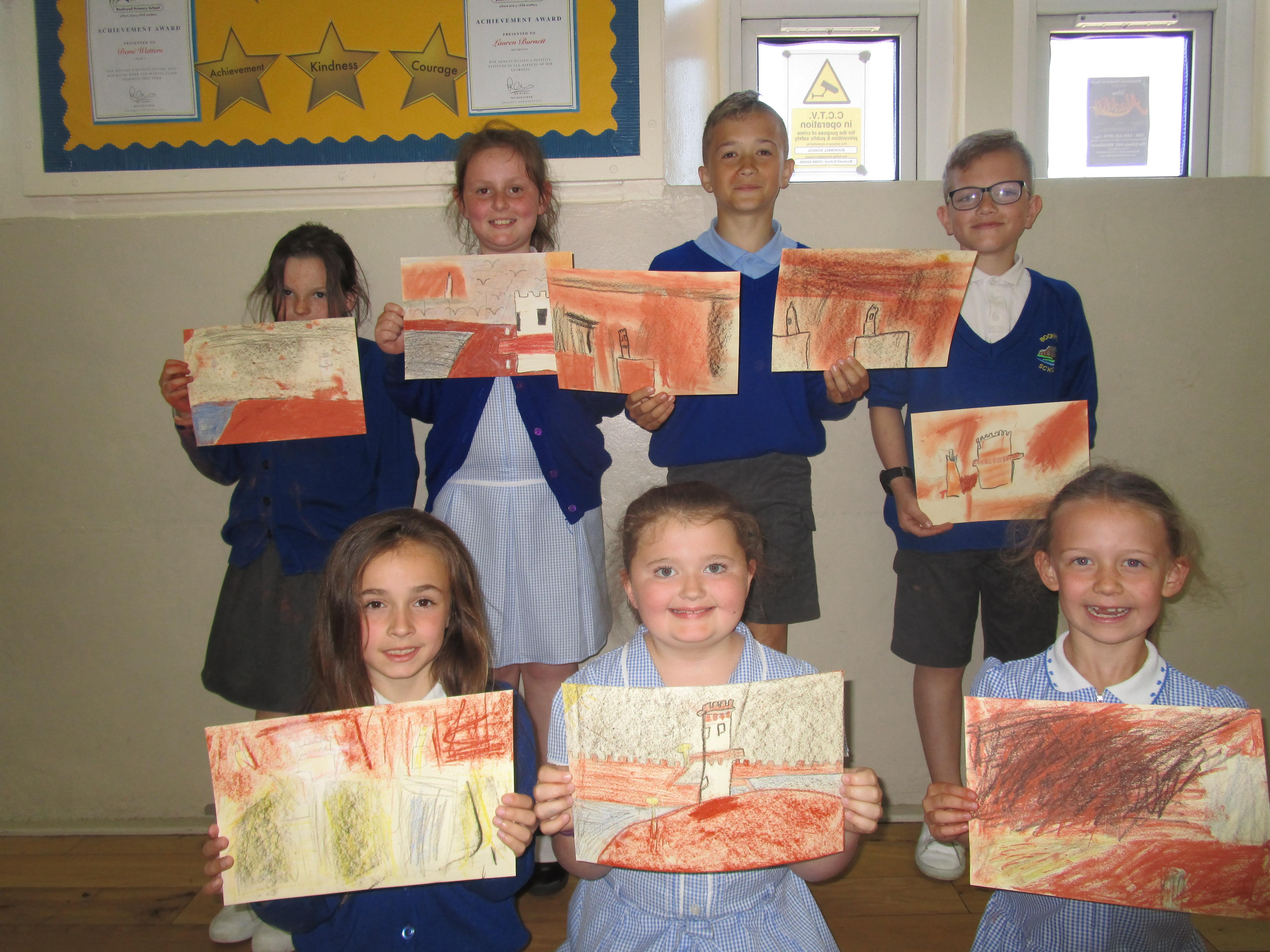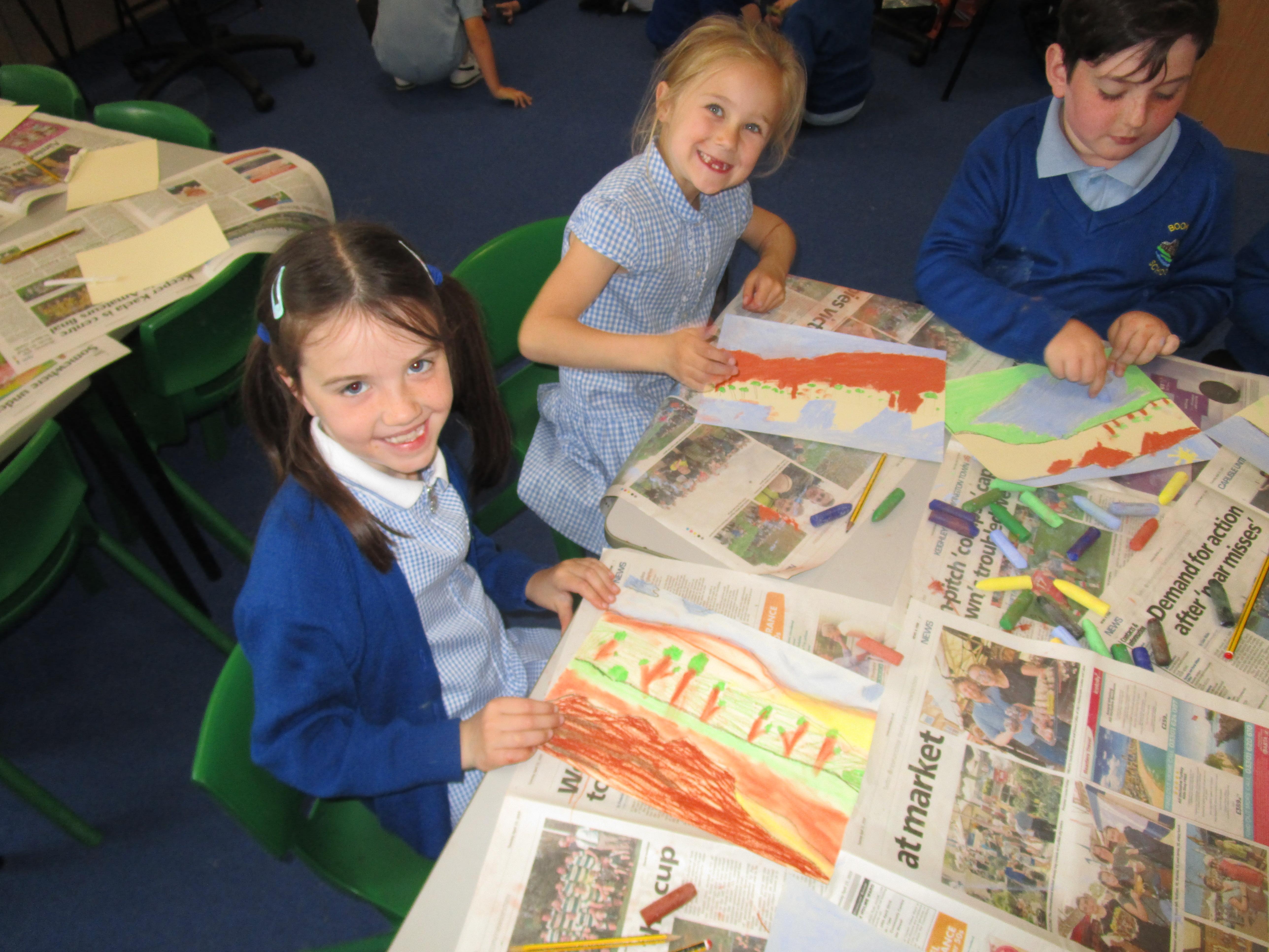 This week the Reception and Year 1 have produced a collage of a beach and the Year 2 and KS2 children have produced a chalk picture in the style of Percy Kelly.