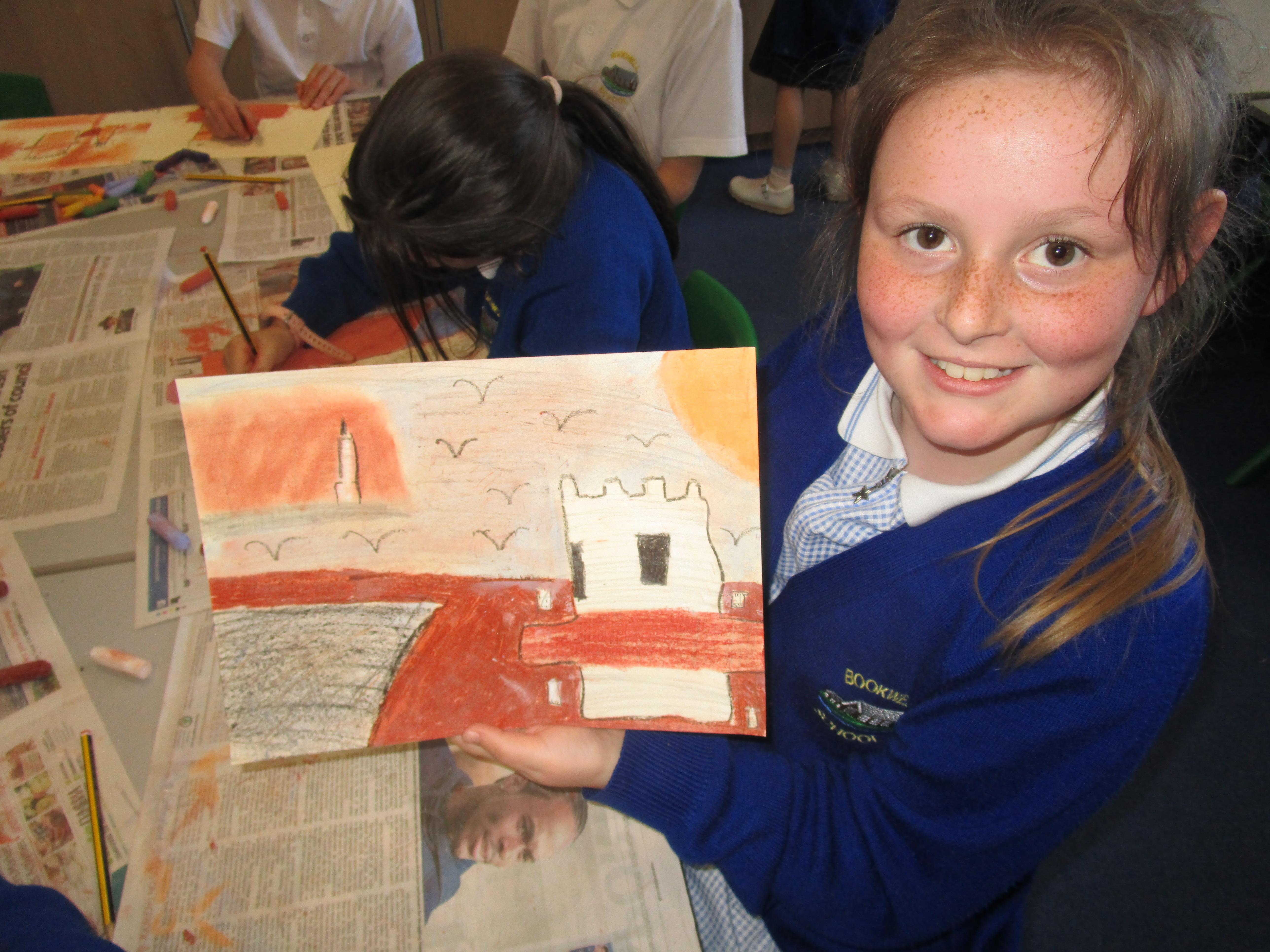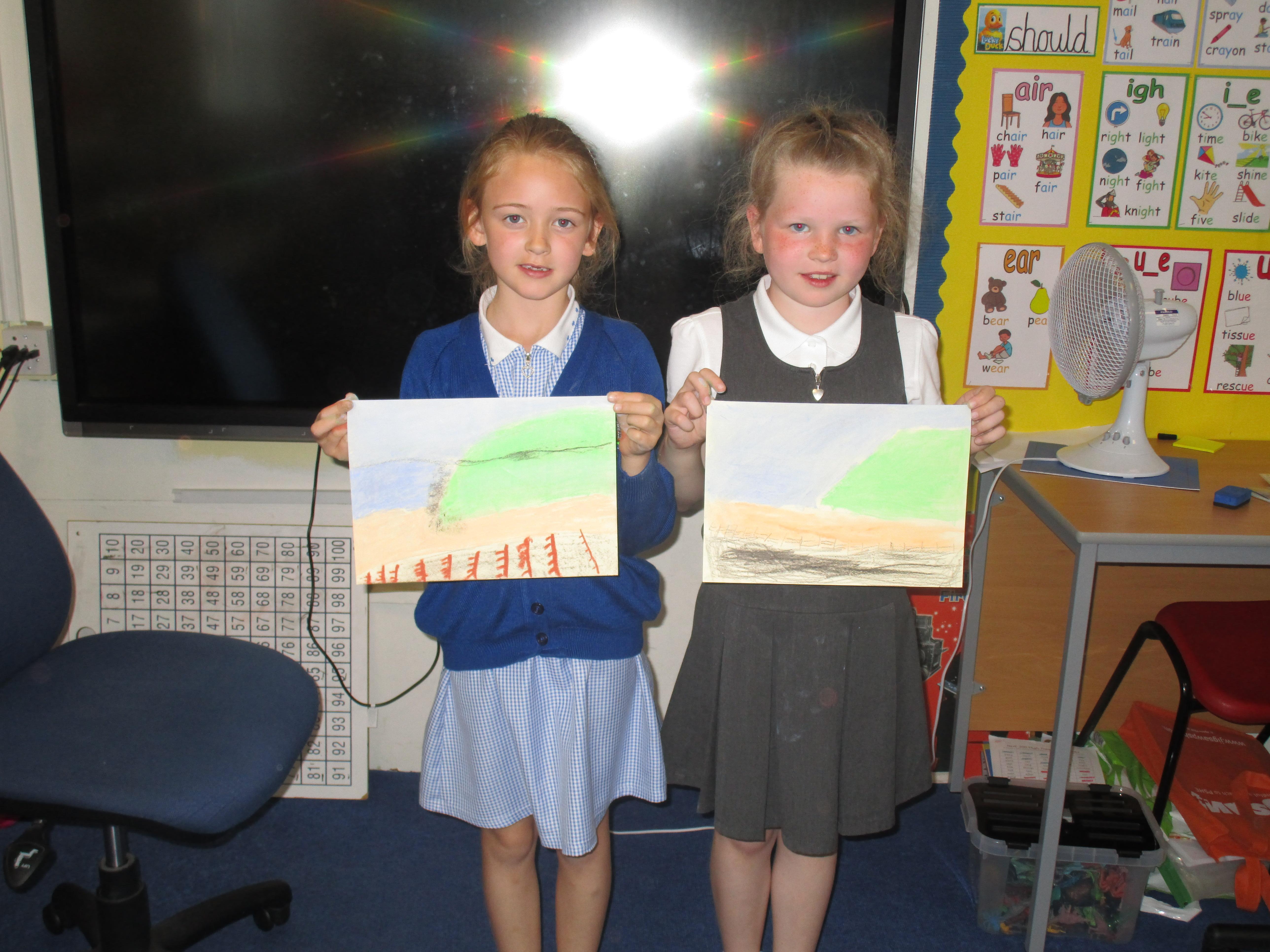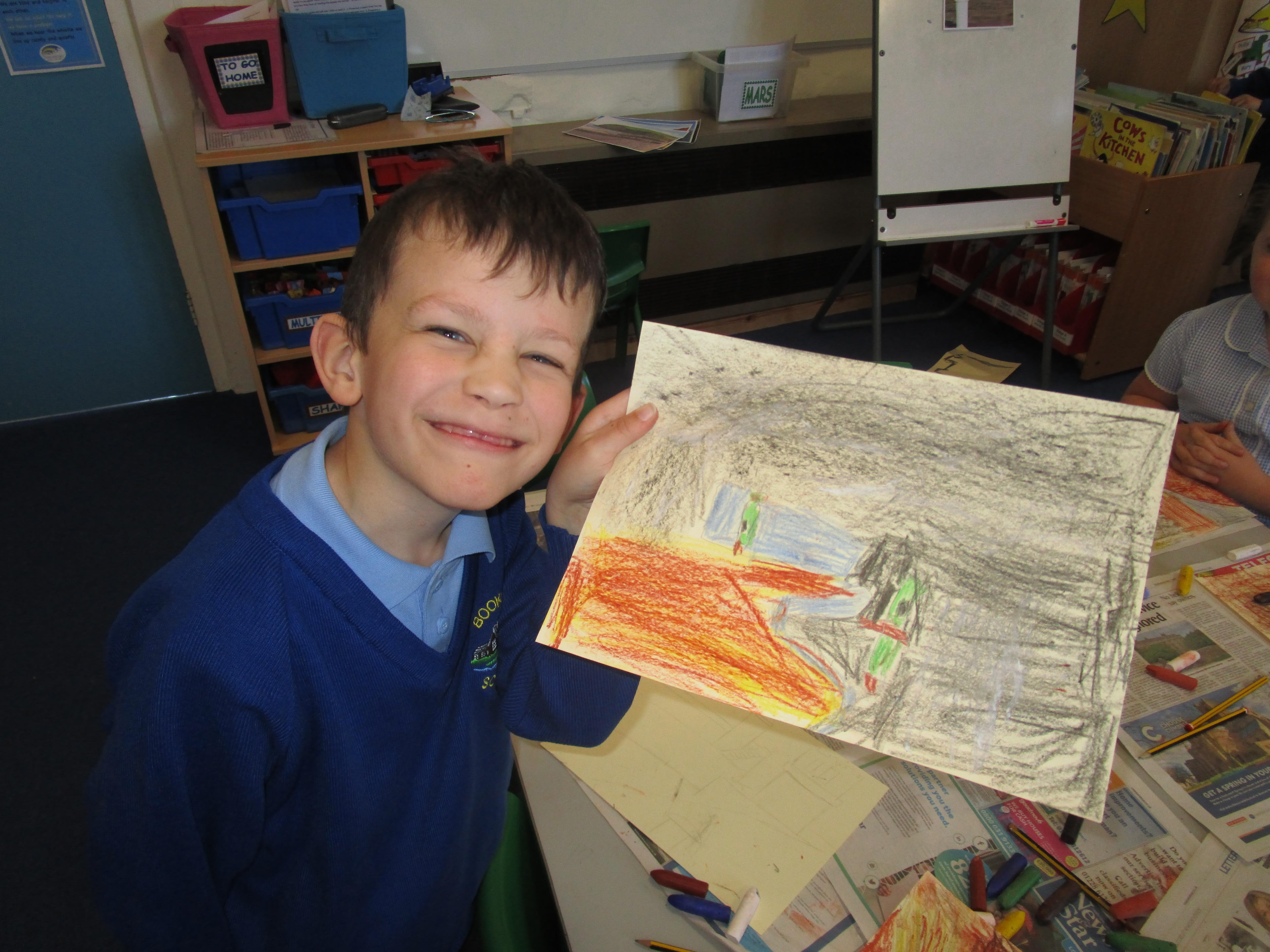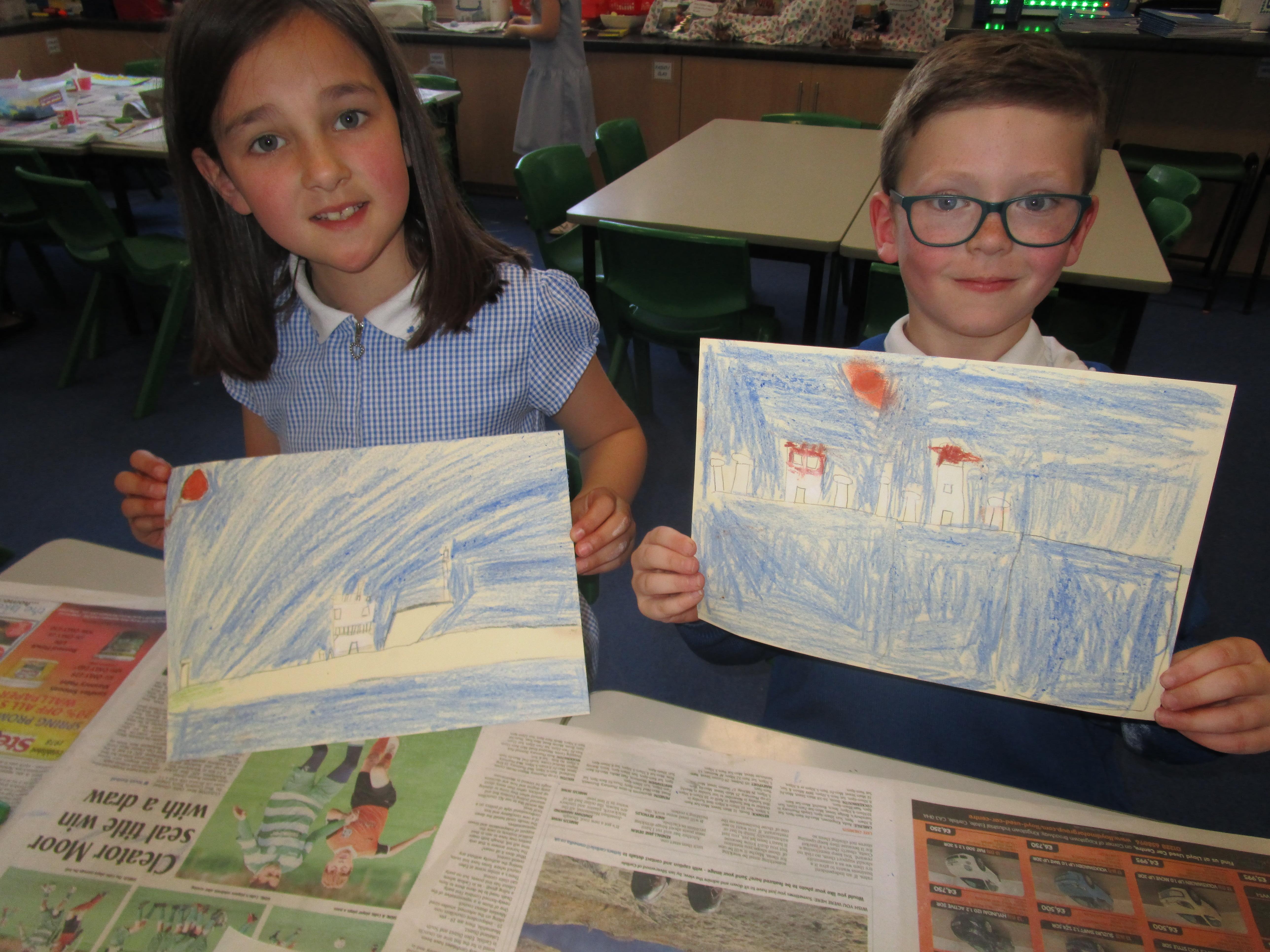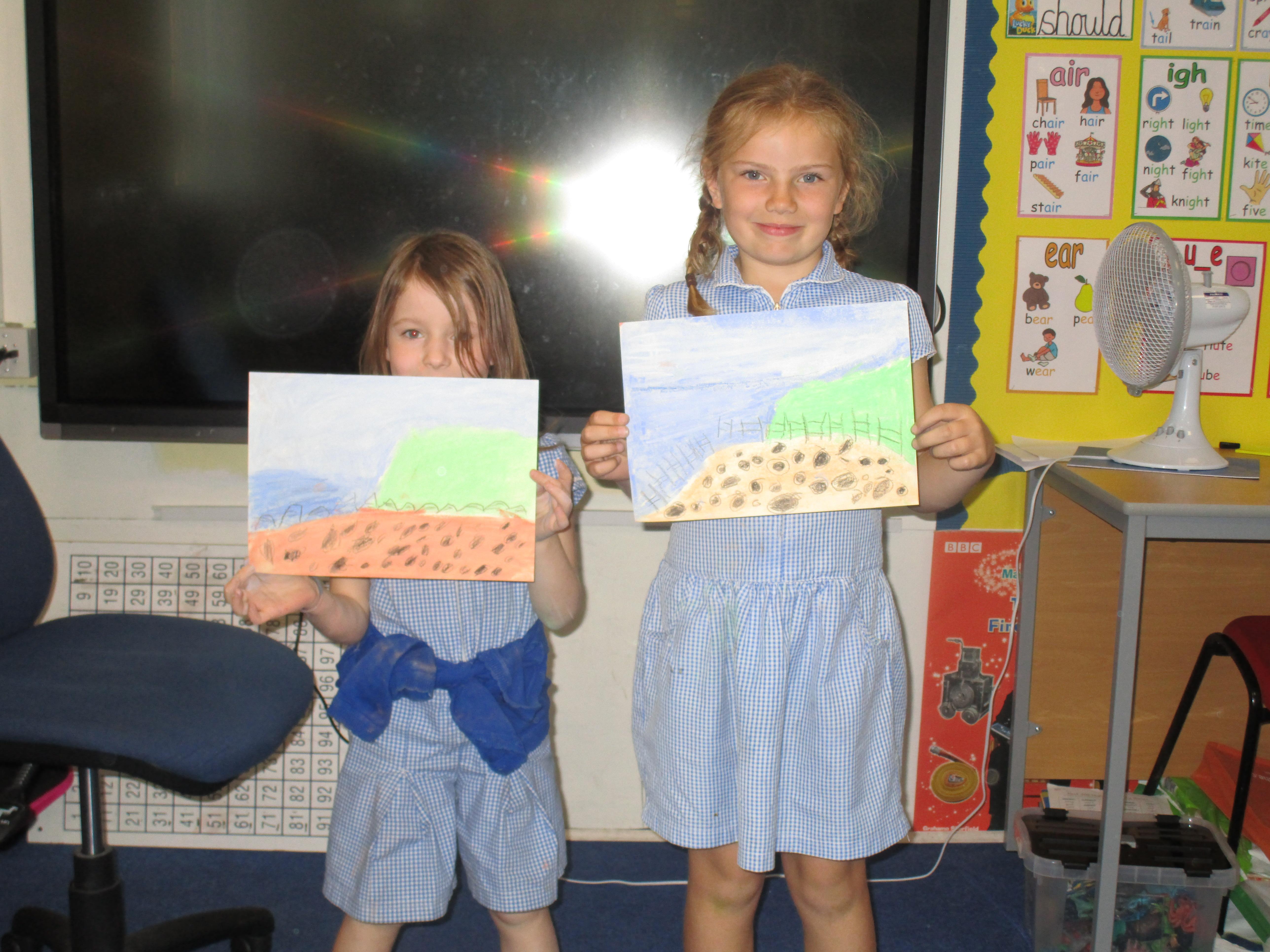 This week the Reception and Year 1 have produced a collage of a beach and the Year 2 and KS2 children have produced a chalk picture in the style of Percy Kelly.