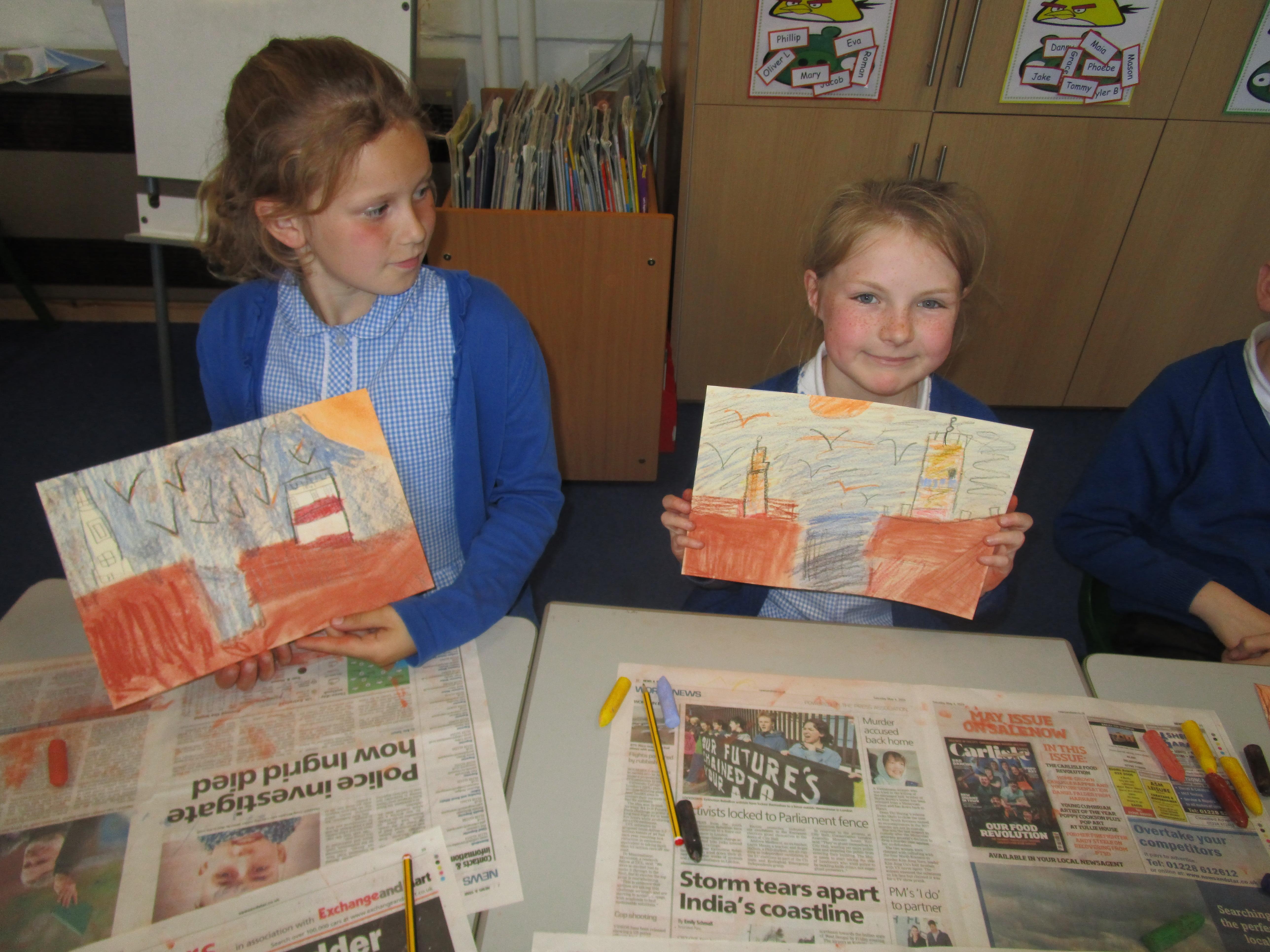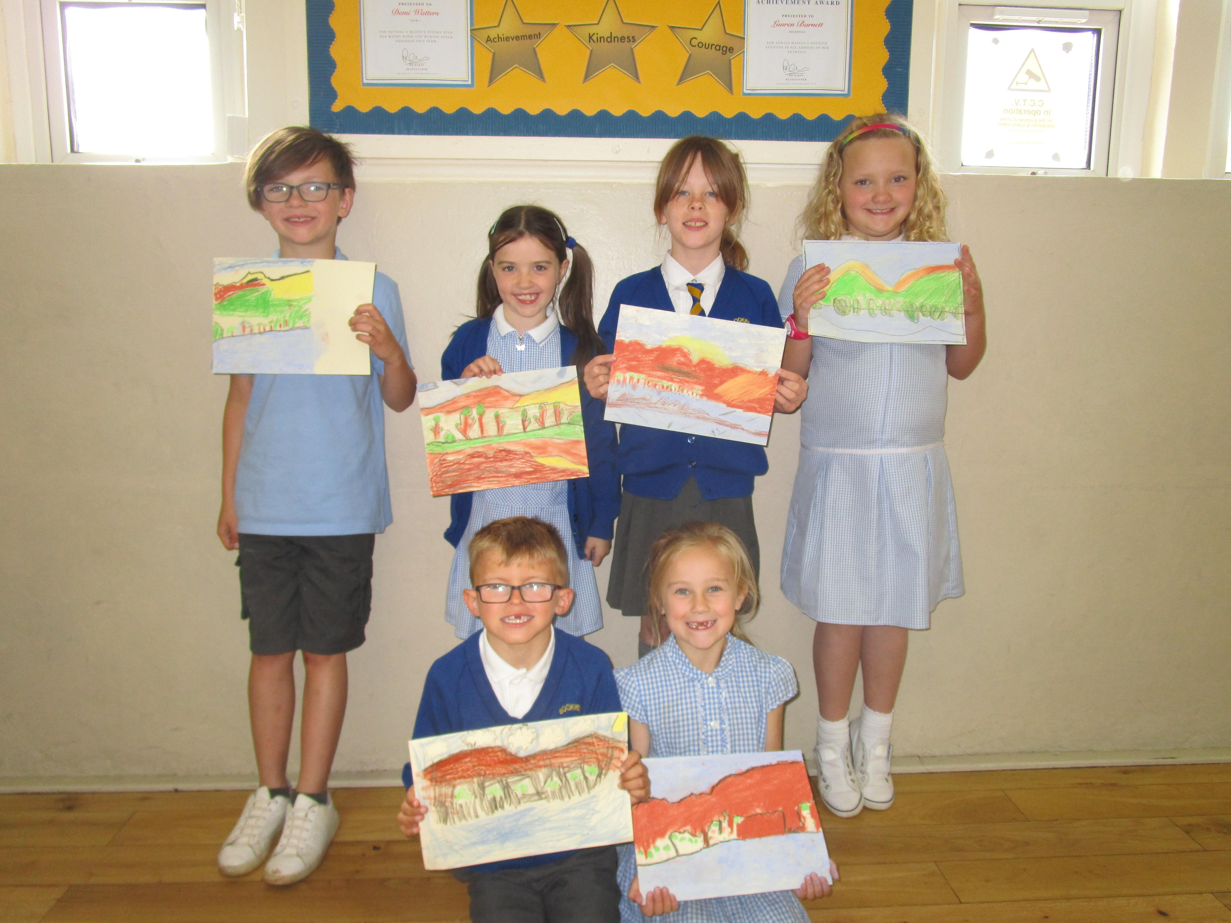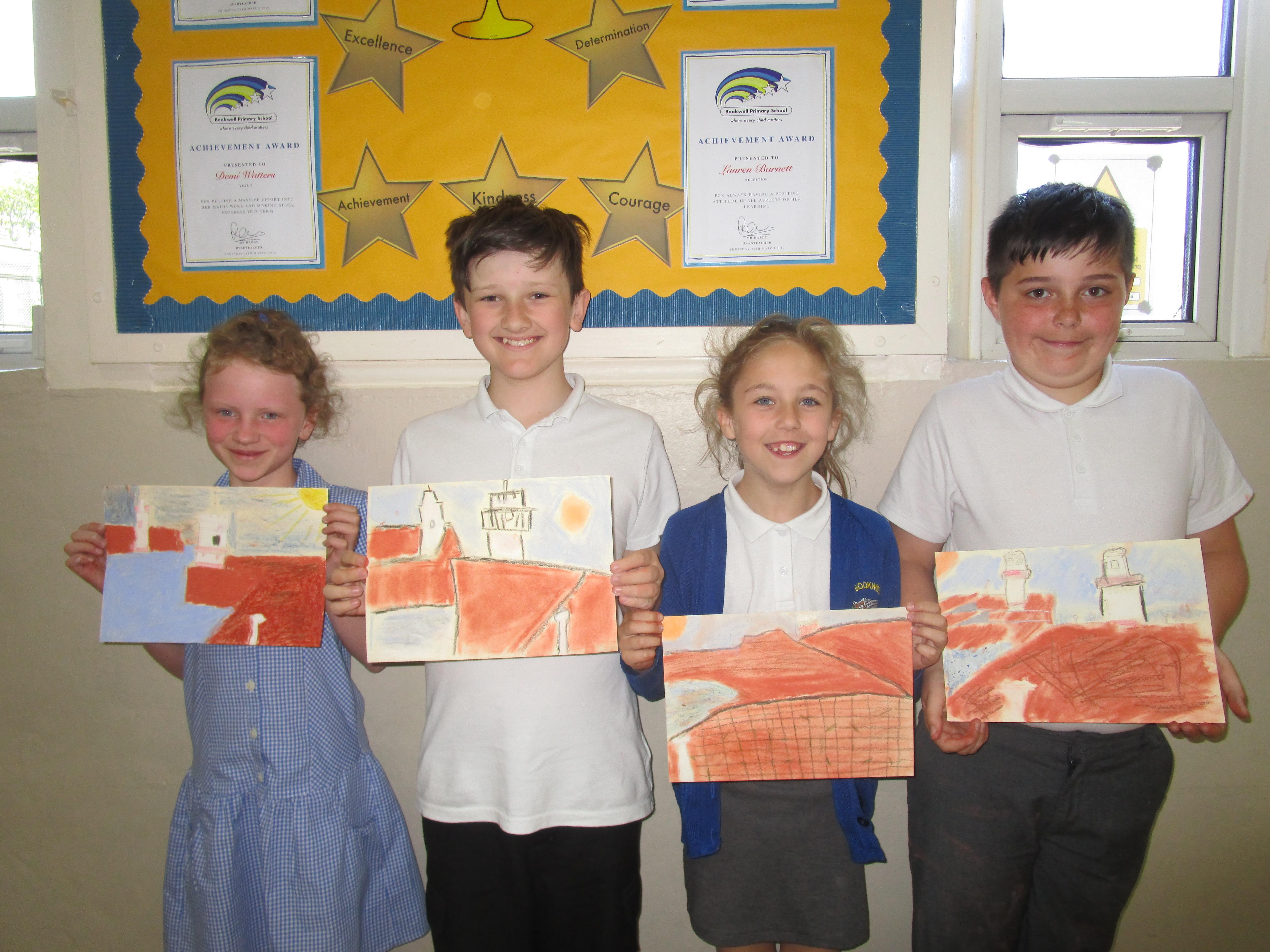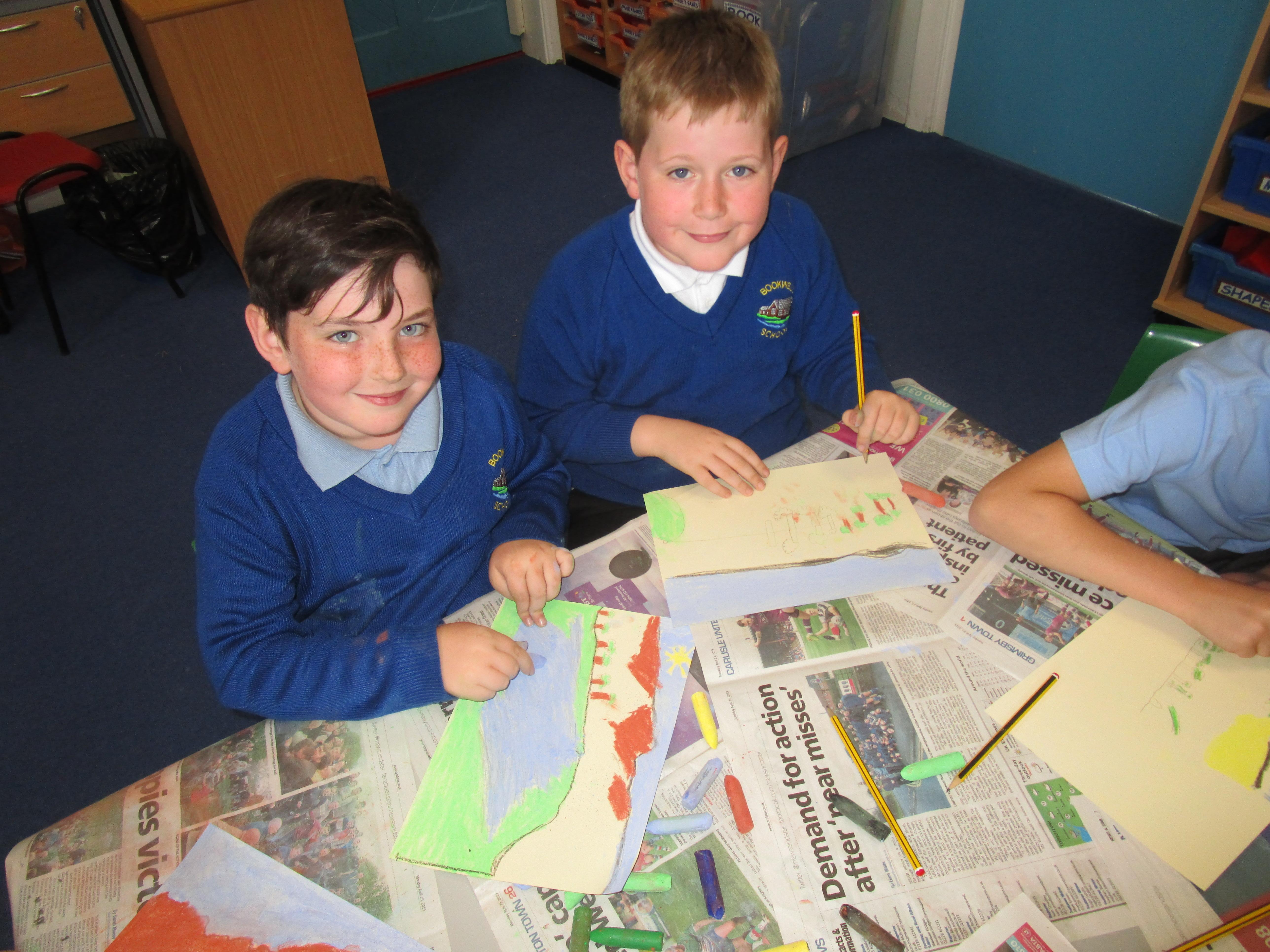 This week the Reception and Year 1 have produced a collage of a beach and the Year 2 and KS2 children have produced a chalk picture in the style of Percy Kelly.