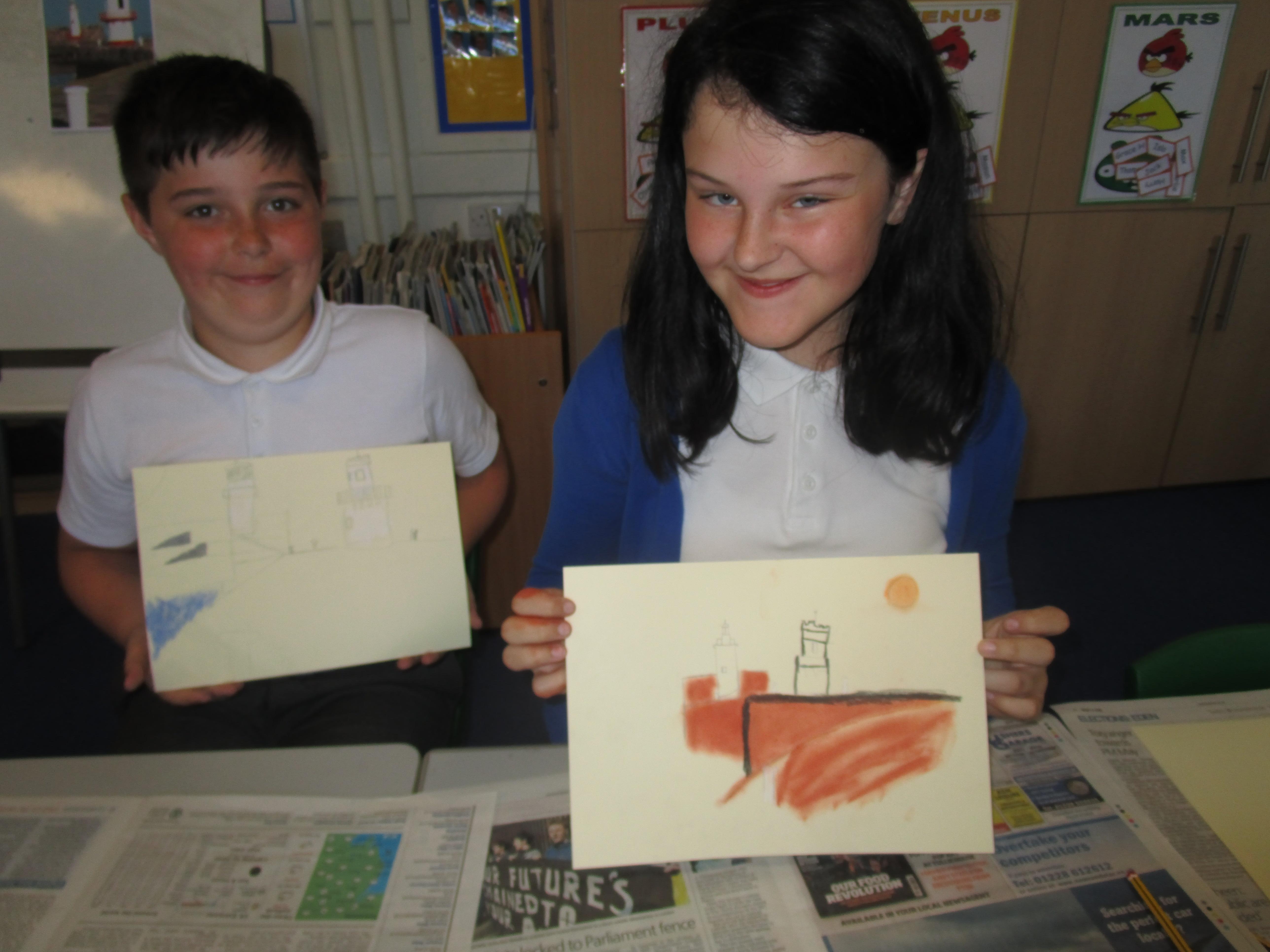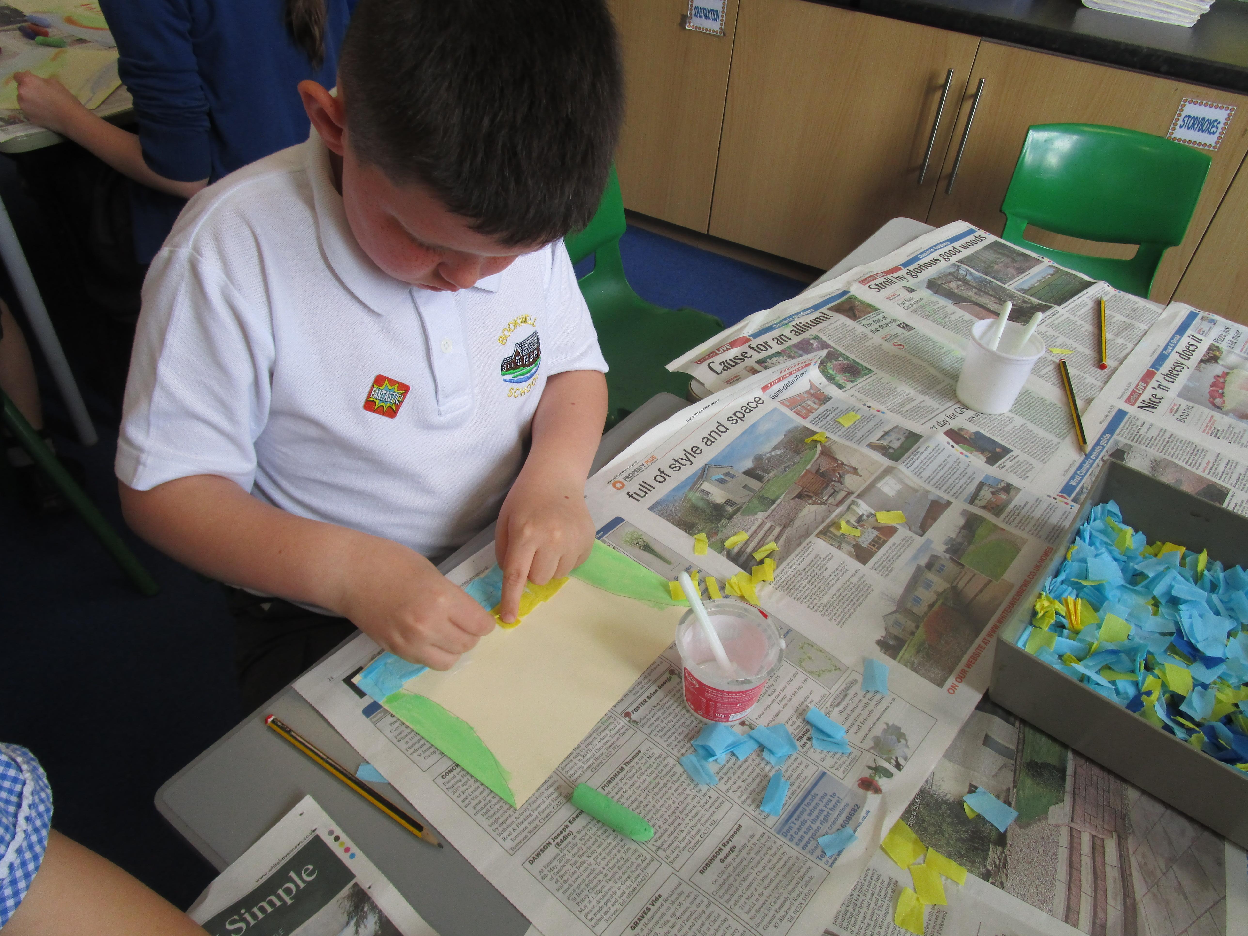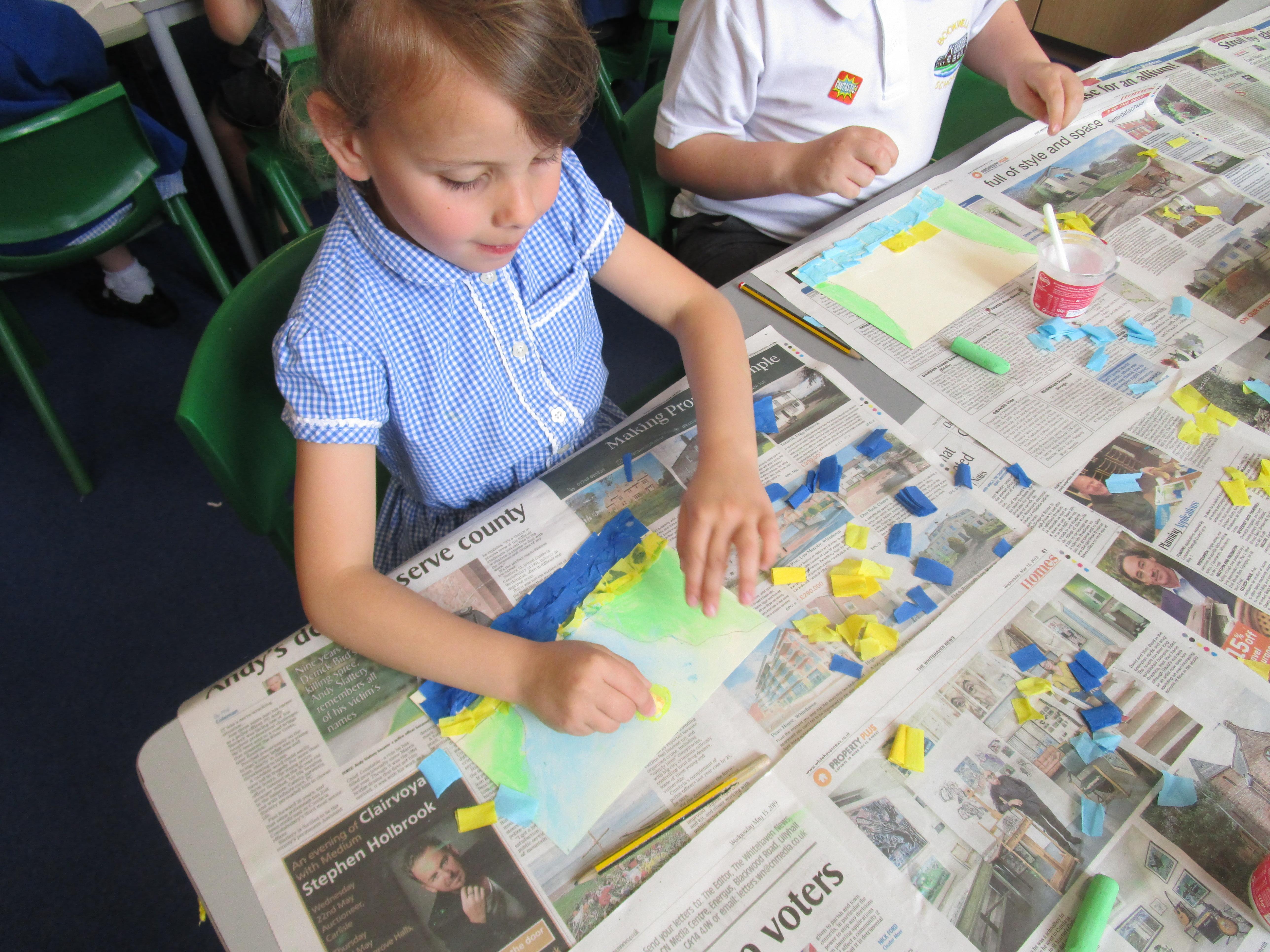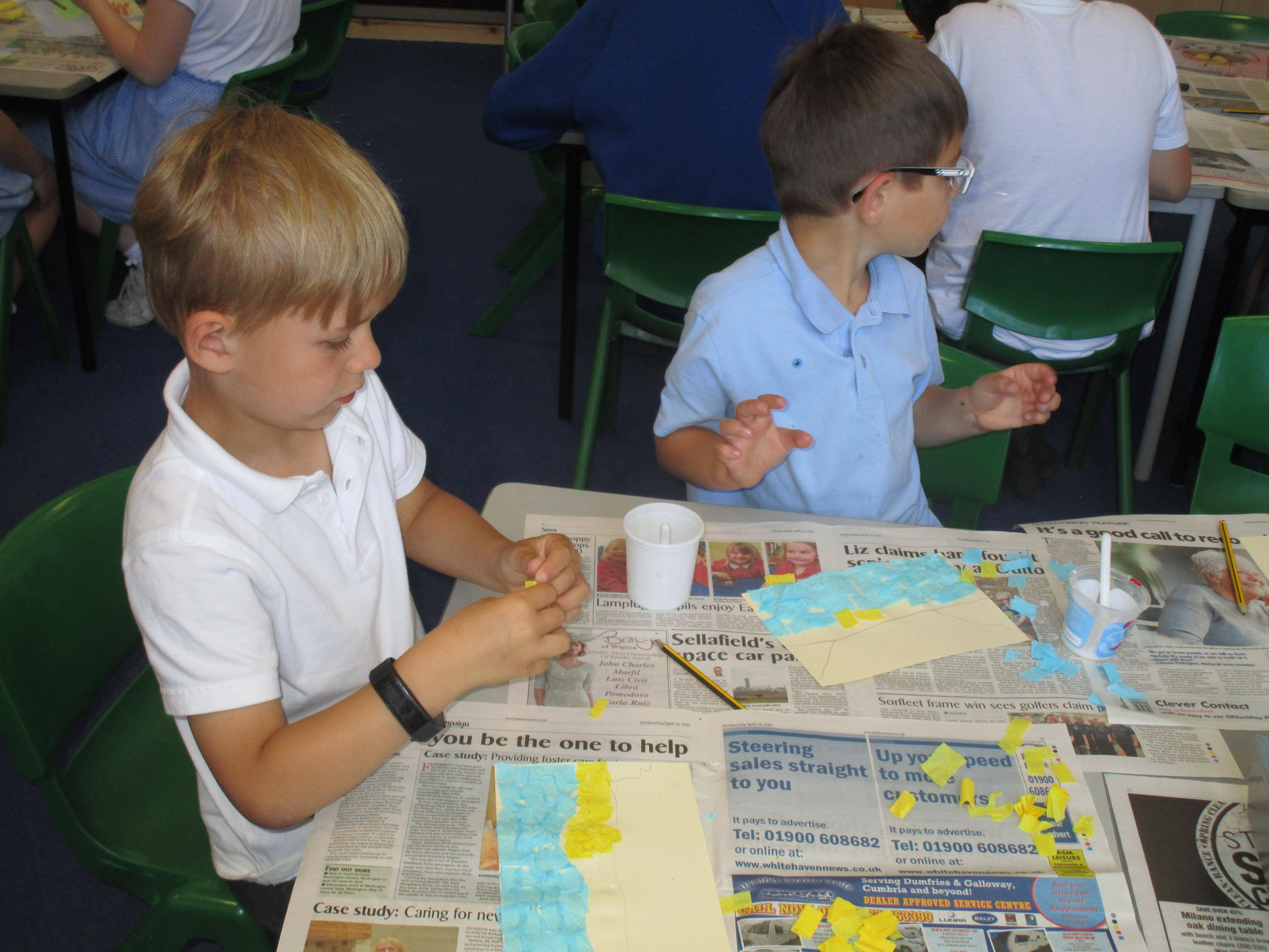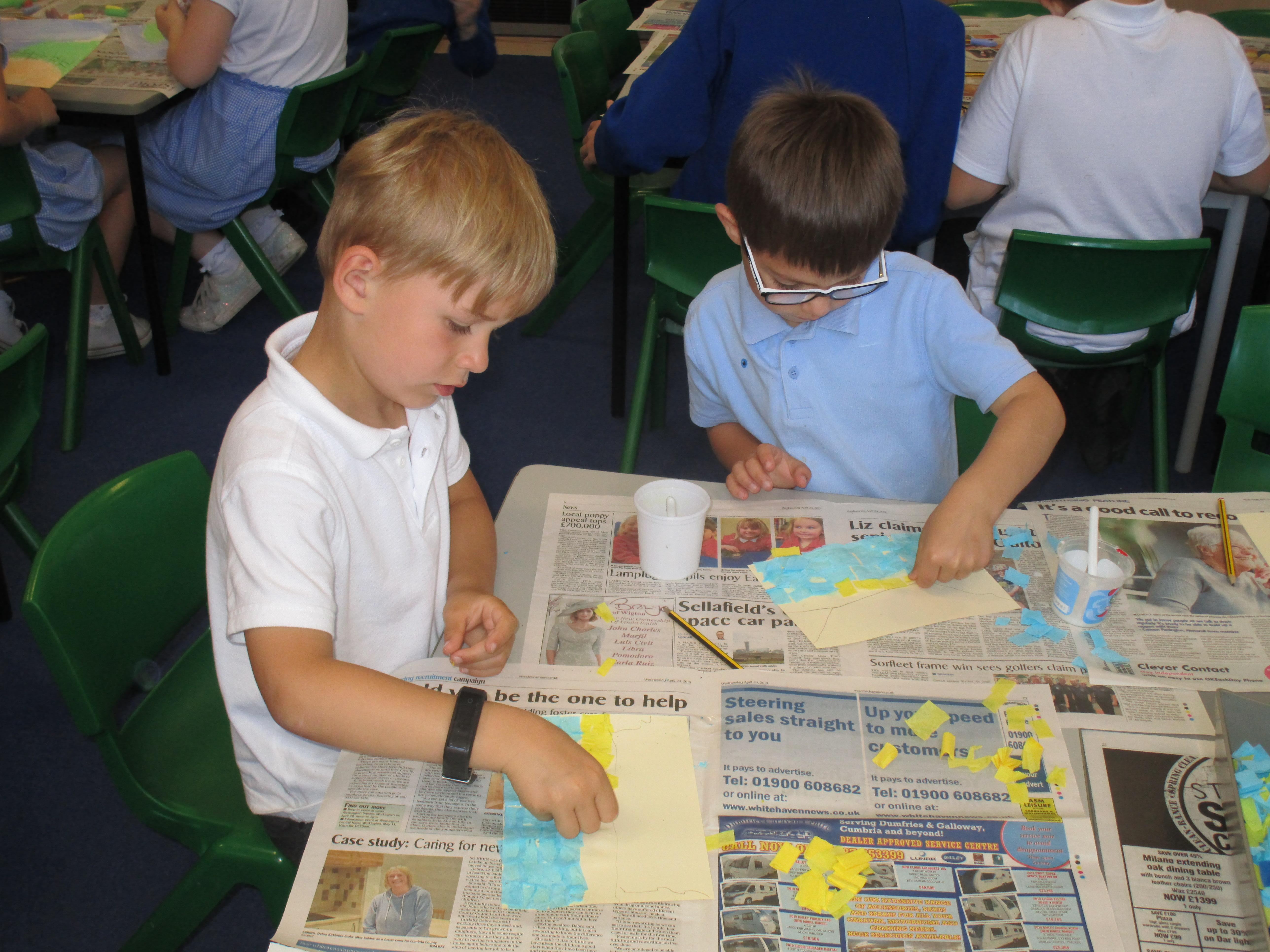 This week the Reception and Year 1 have produced a collage of a beach and the Year 2 and KS2 children have produced a chalk picture in the style of Percy Kelly.