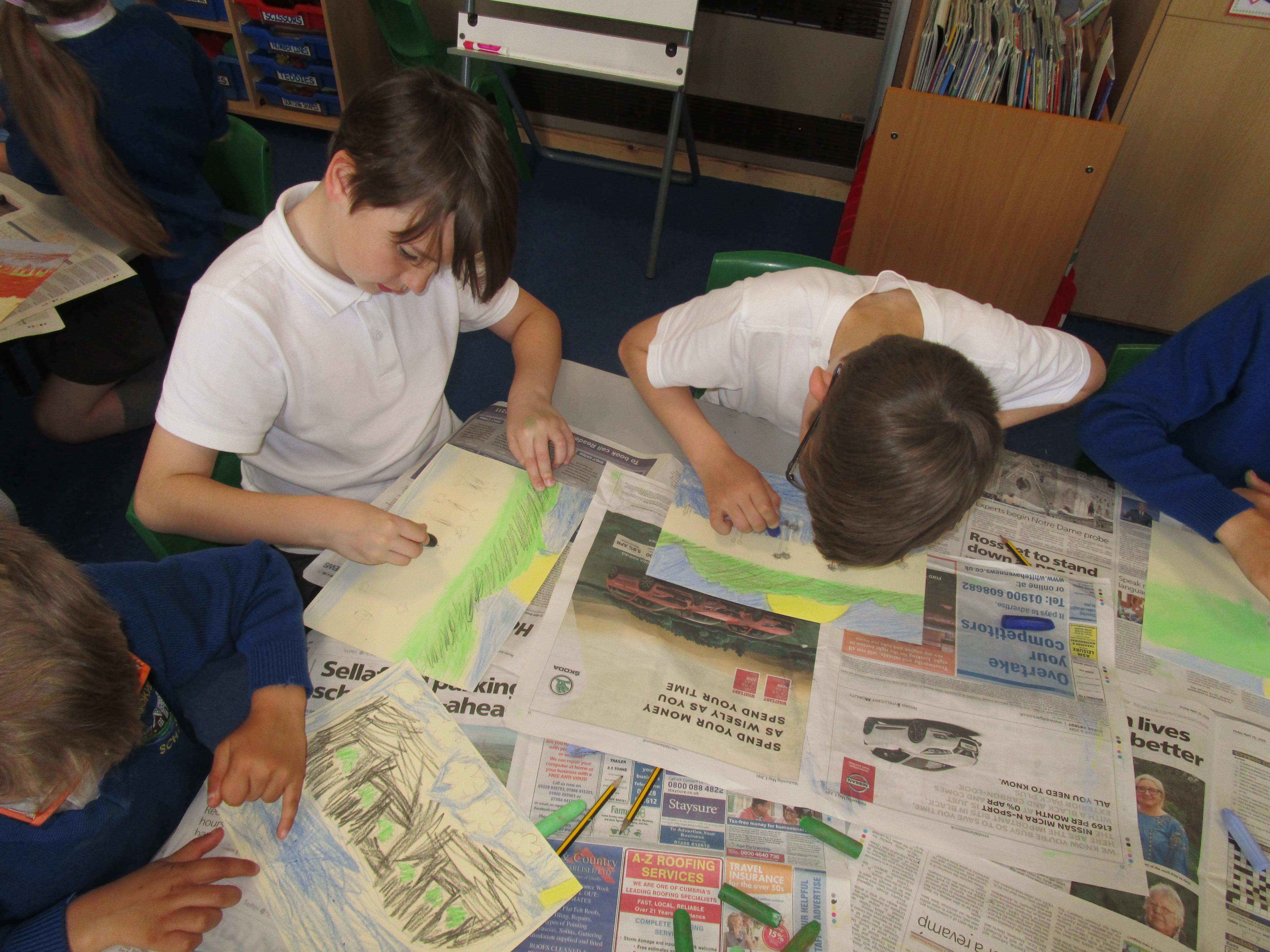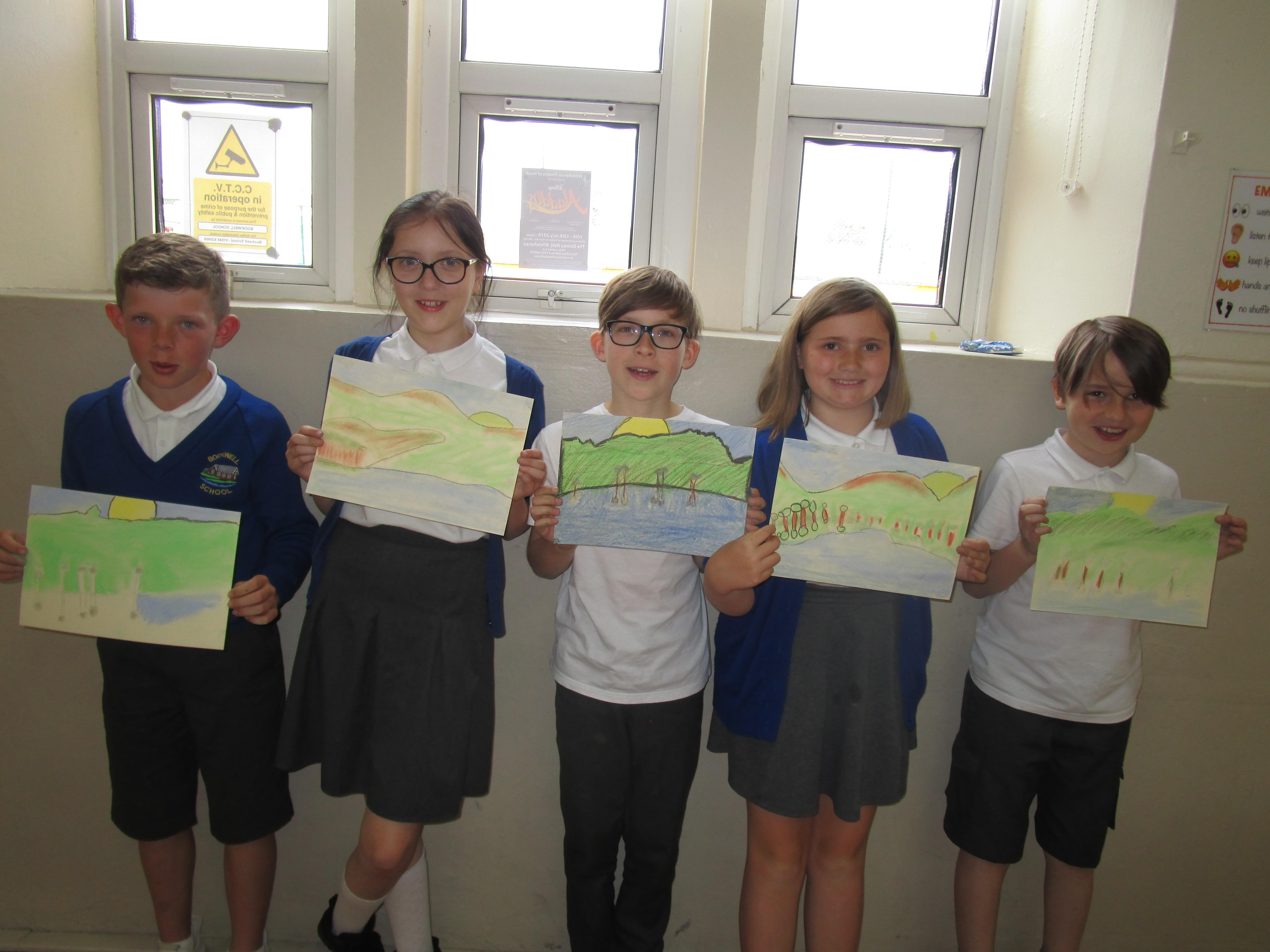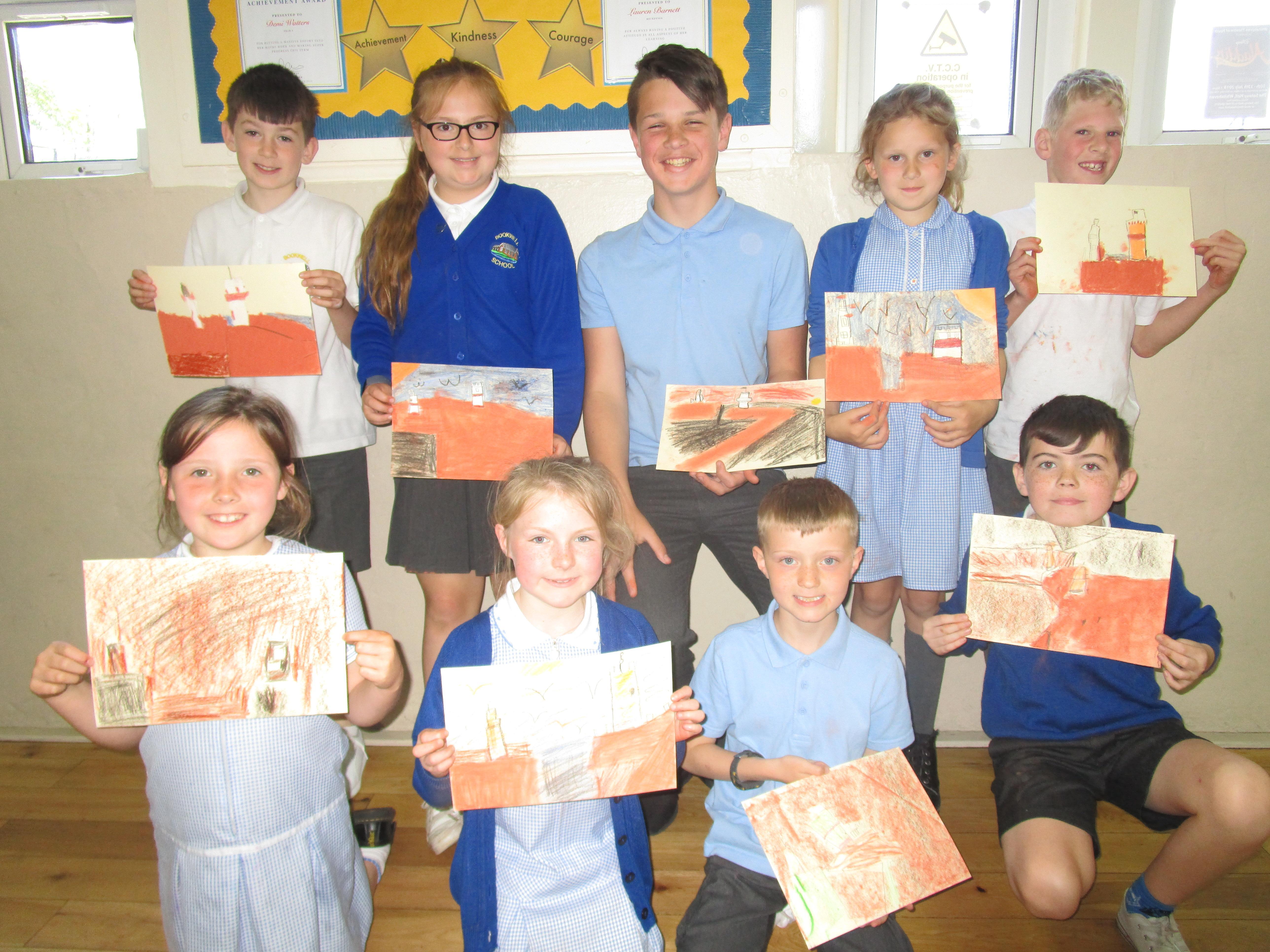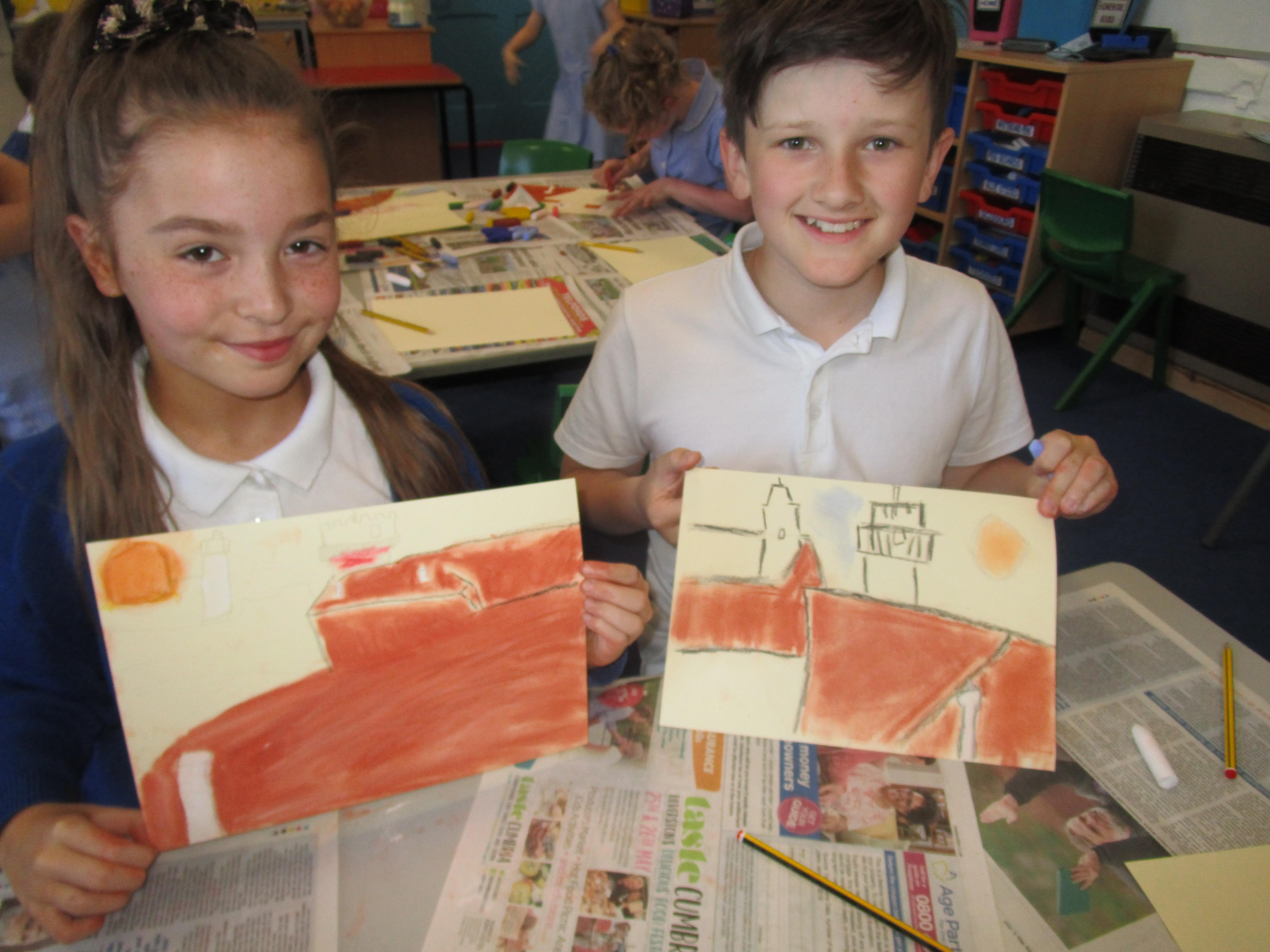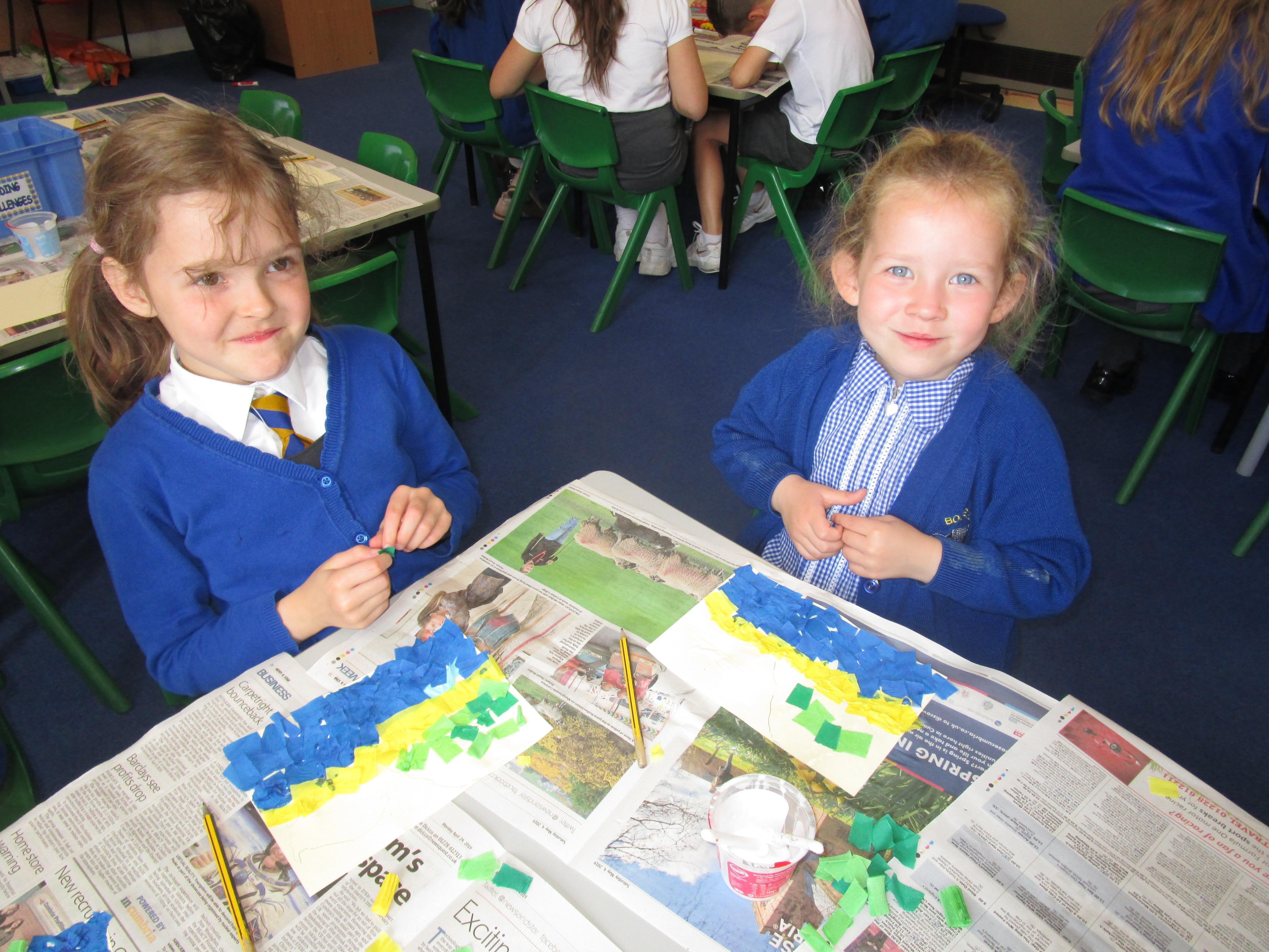 This week the Reception and Year 1 have produced a collage of a beach and the Year 2 and KS2 children have produced a chalk picture in the style of Percy Kelly.