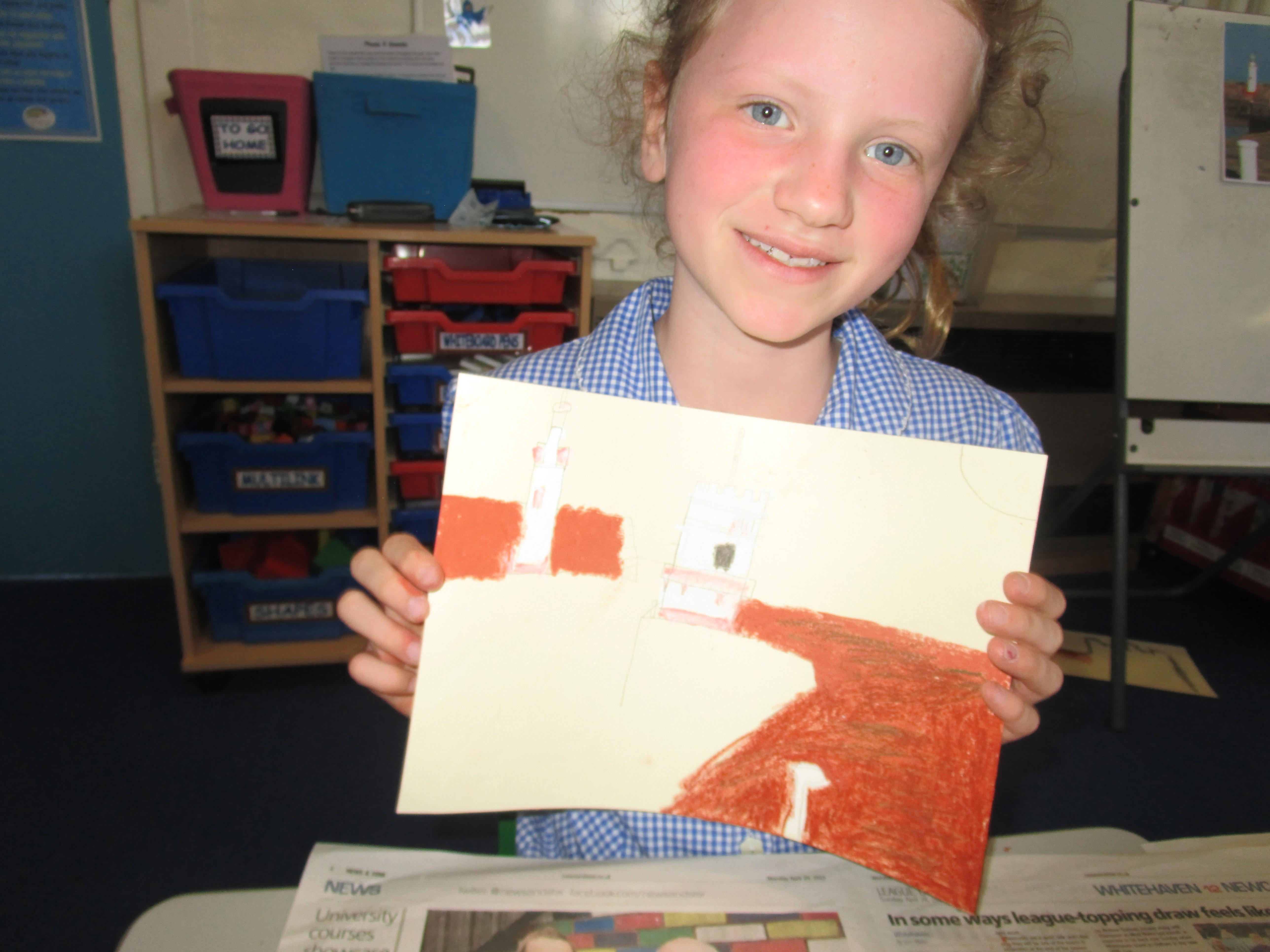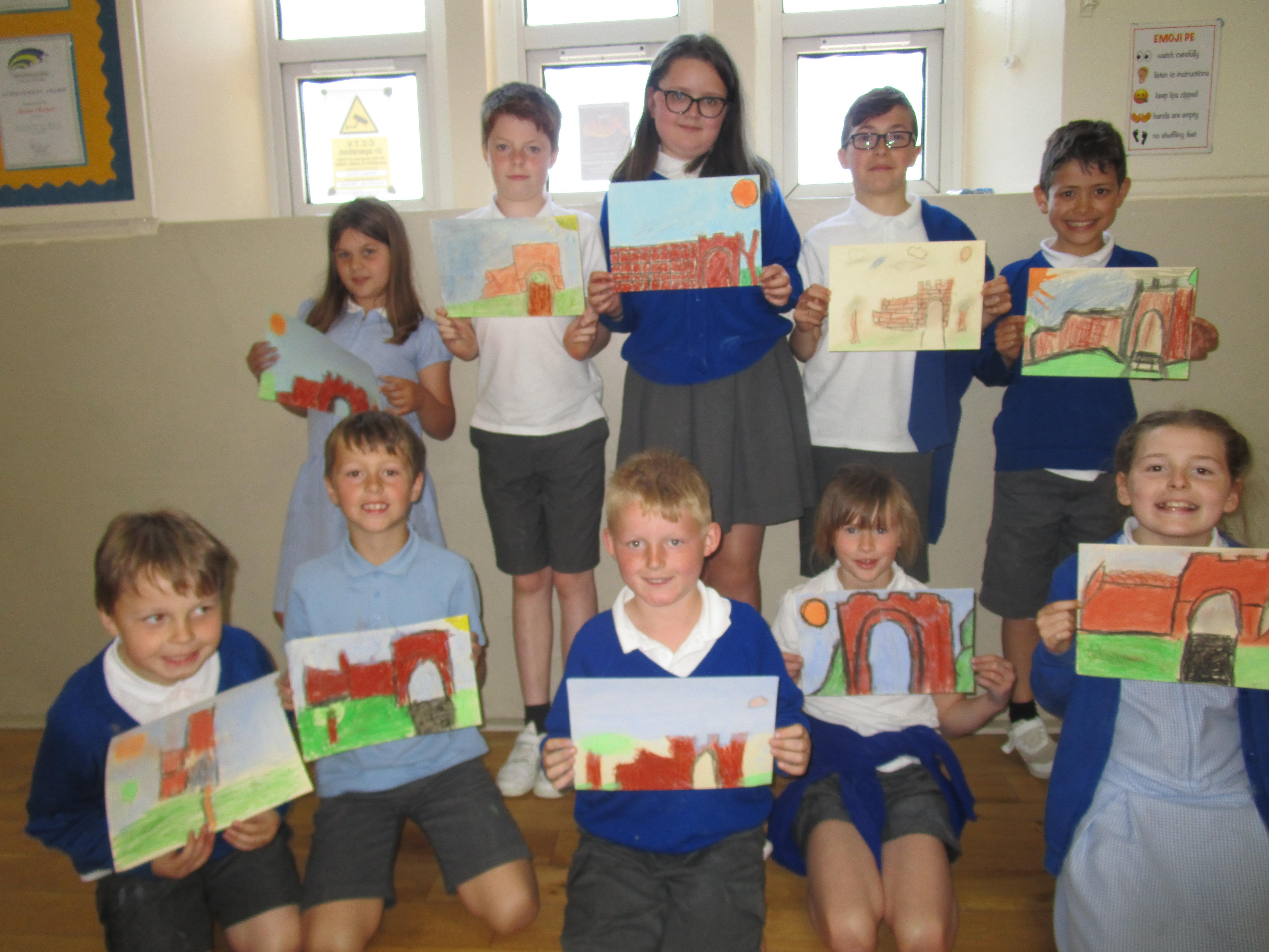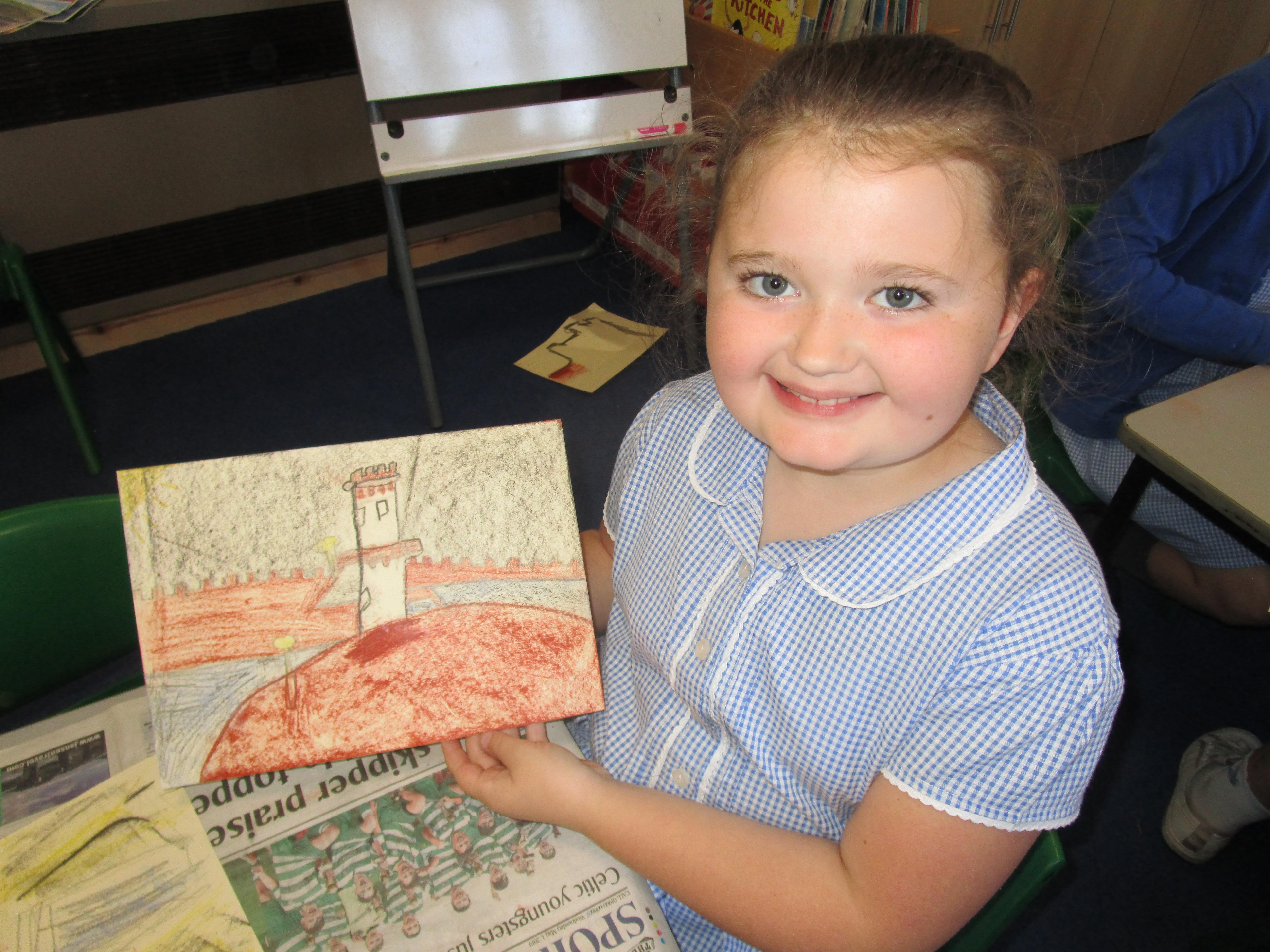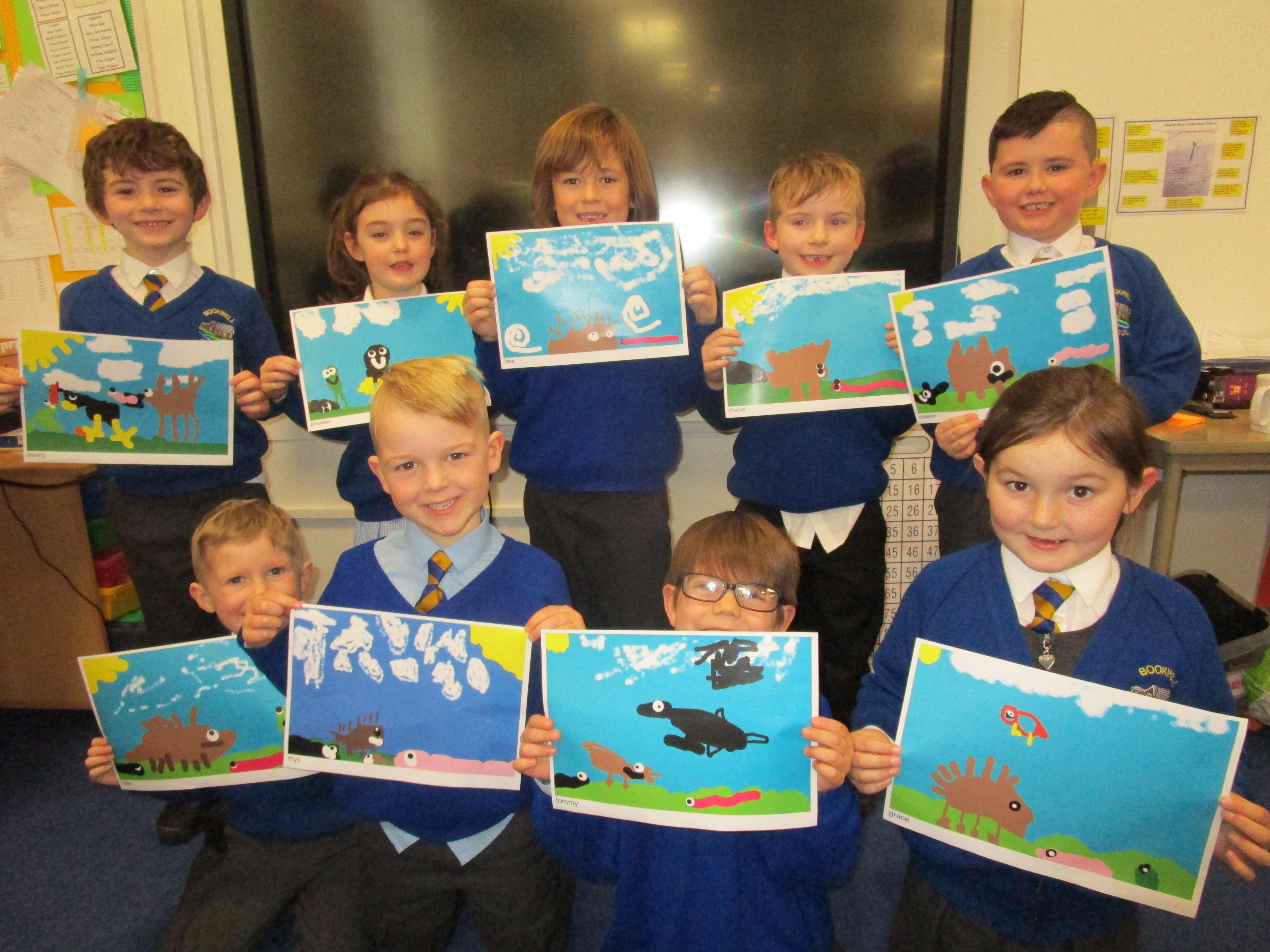 This week the Reception and Year 1 have produced a collage of a beach and the Year 2 and KS2 children have produced a chalk picture in the style of Percy Kelly.