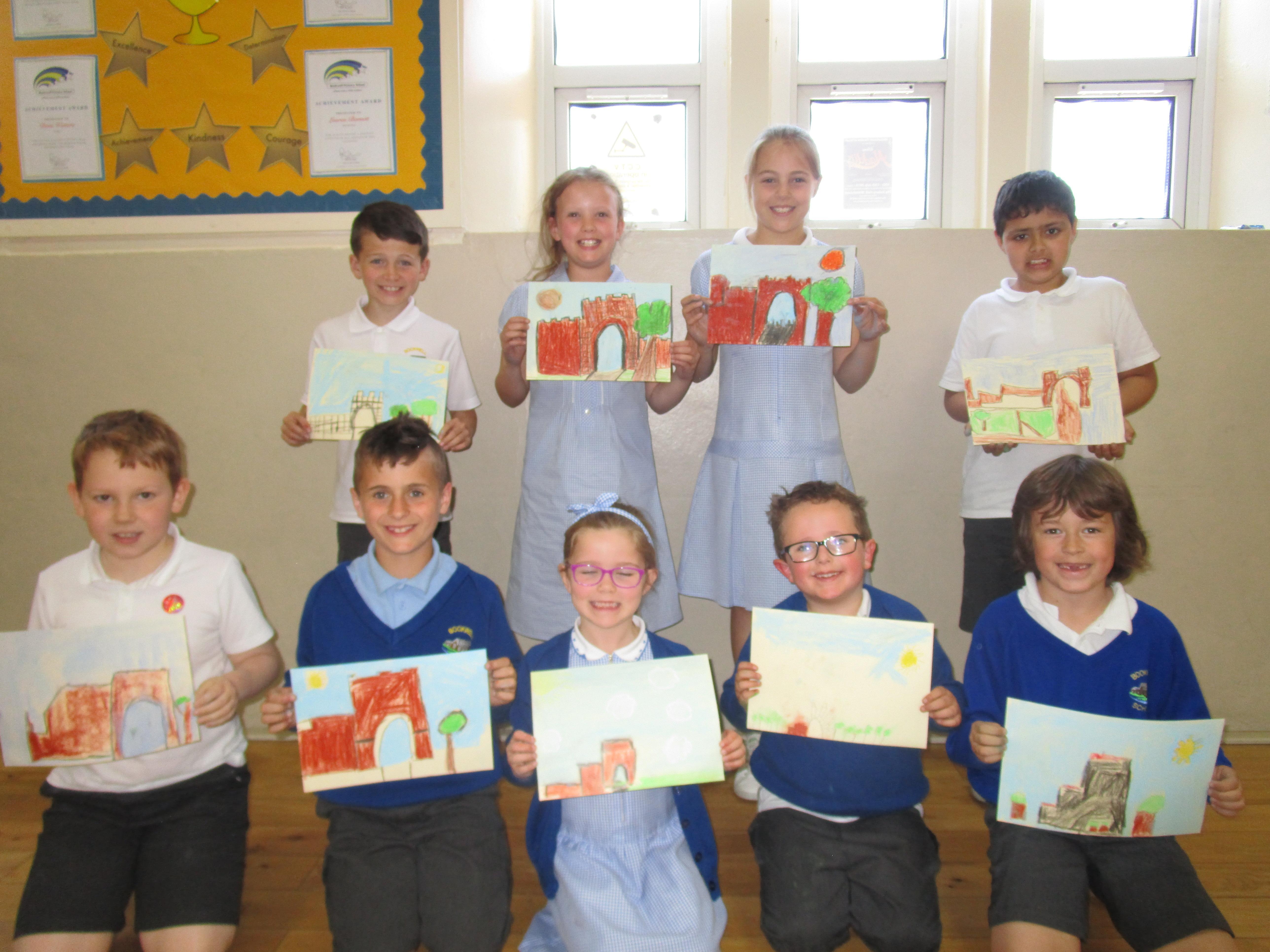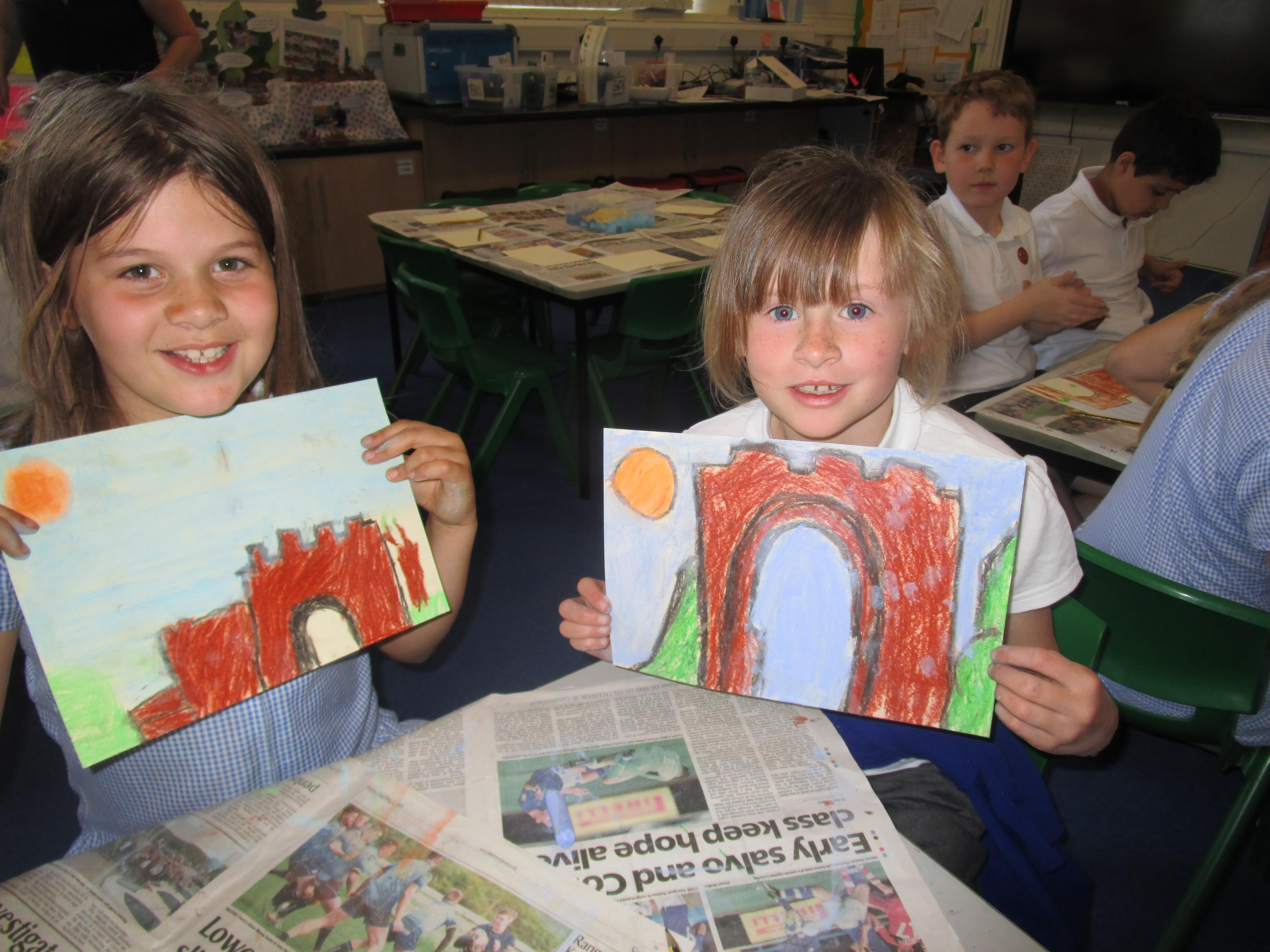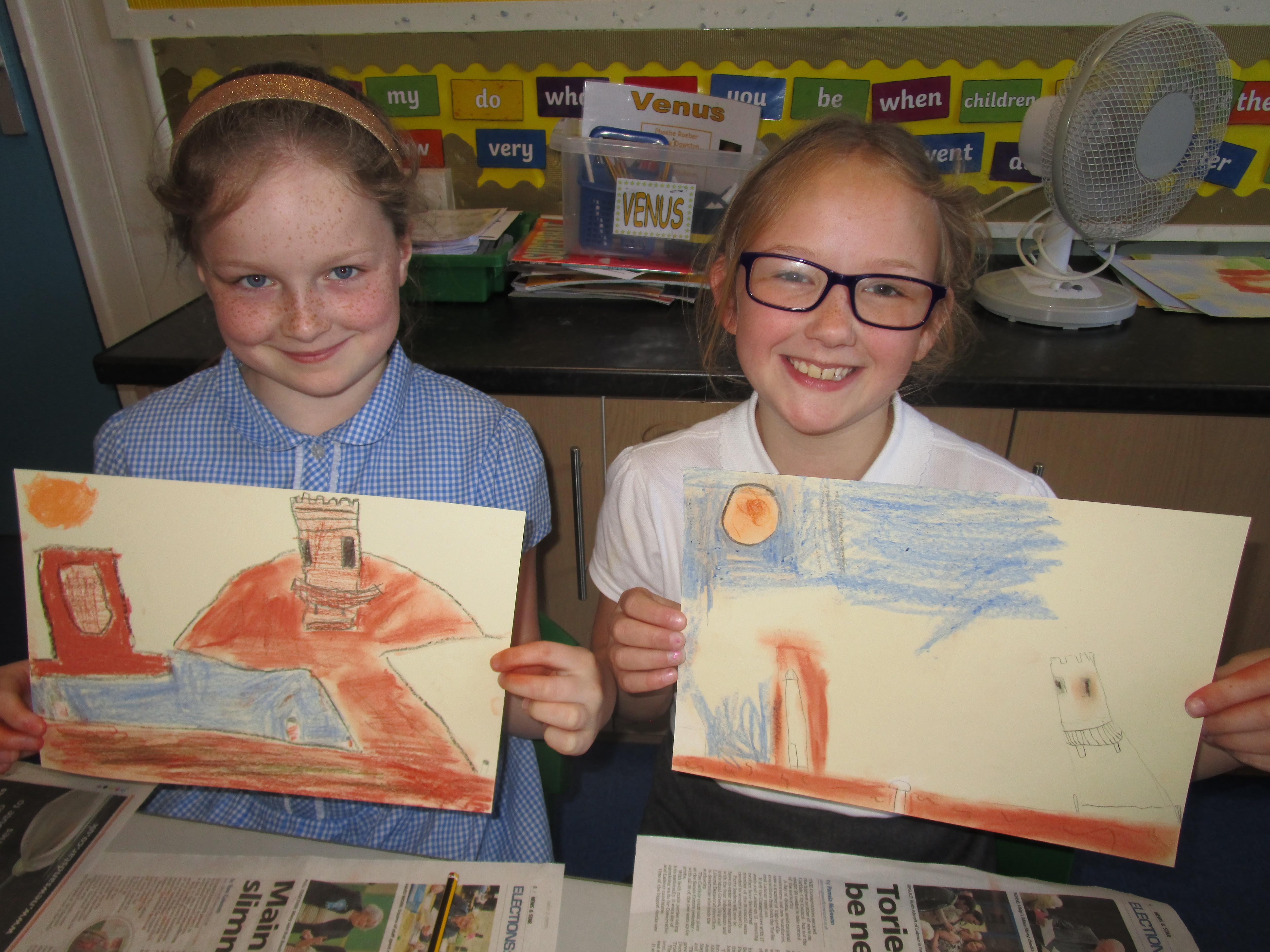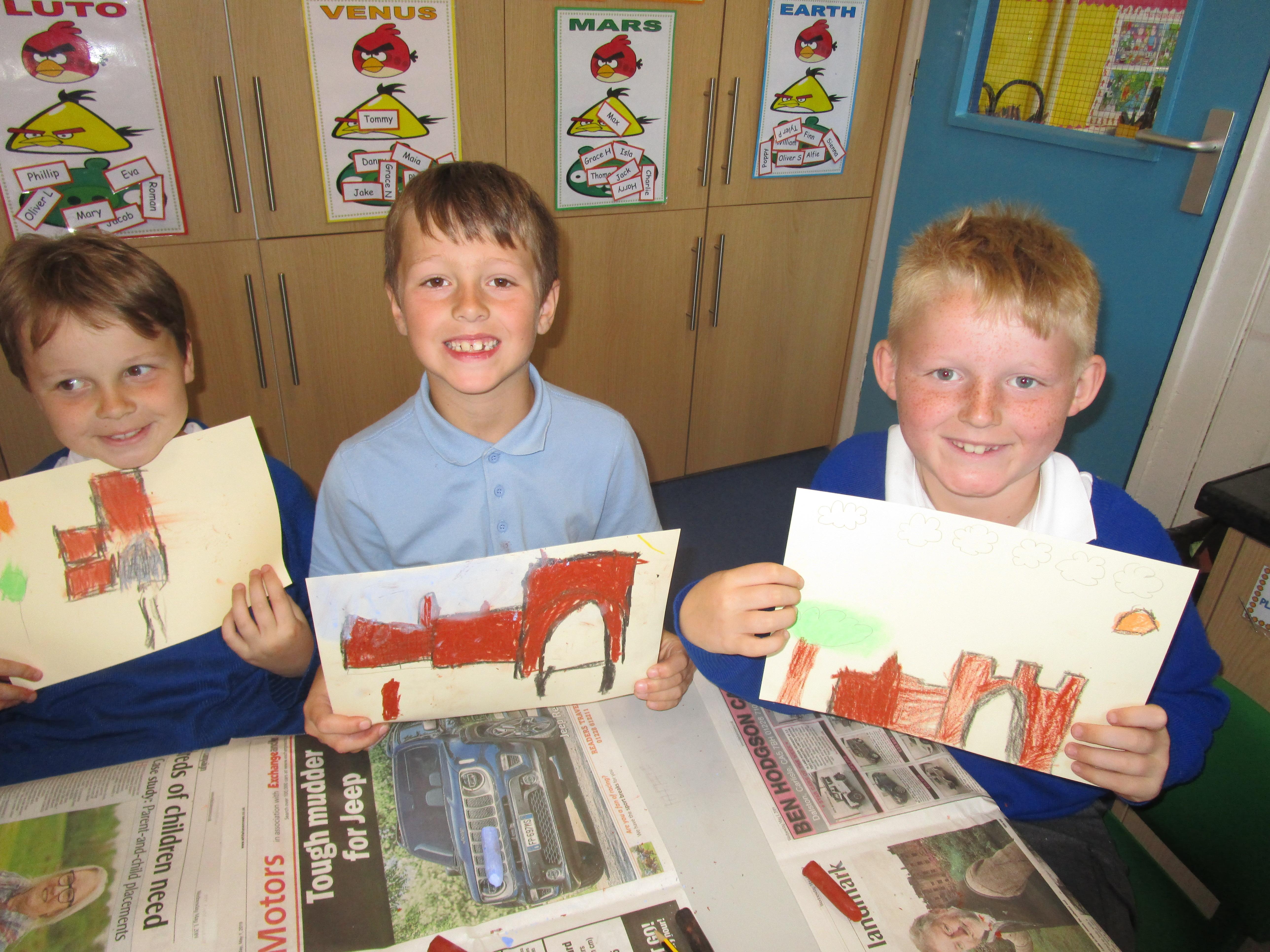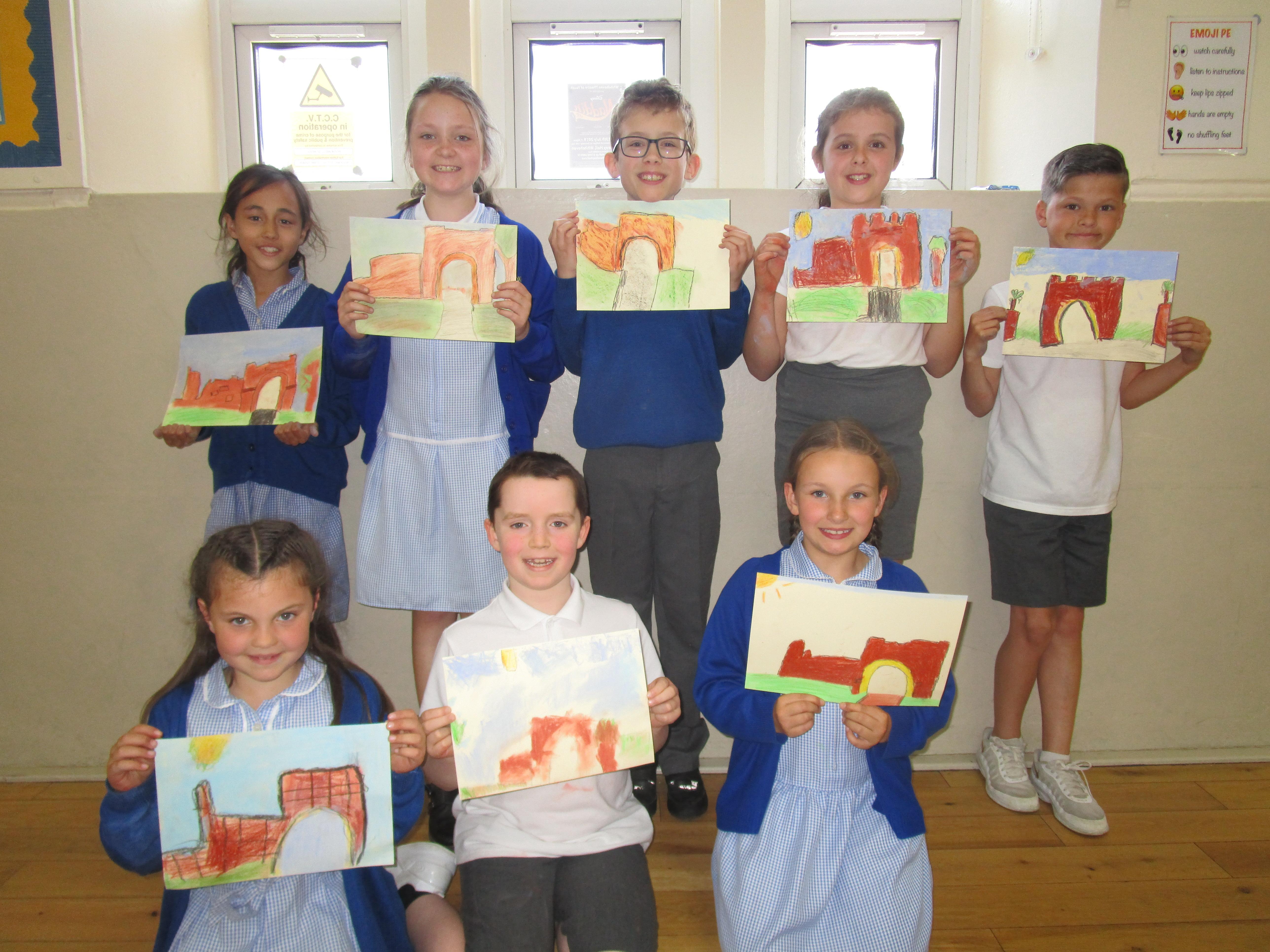 This week the Reception and Year 1 have produced a collage of a beach and the Year 2 and KS2 children have produced a chalk picture in the style of Percy Kelly.