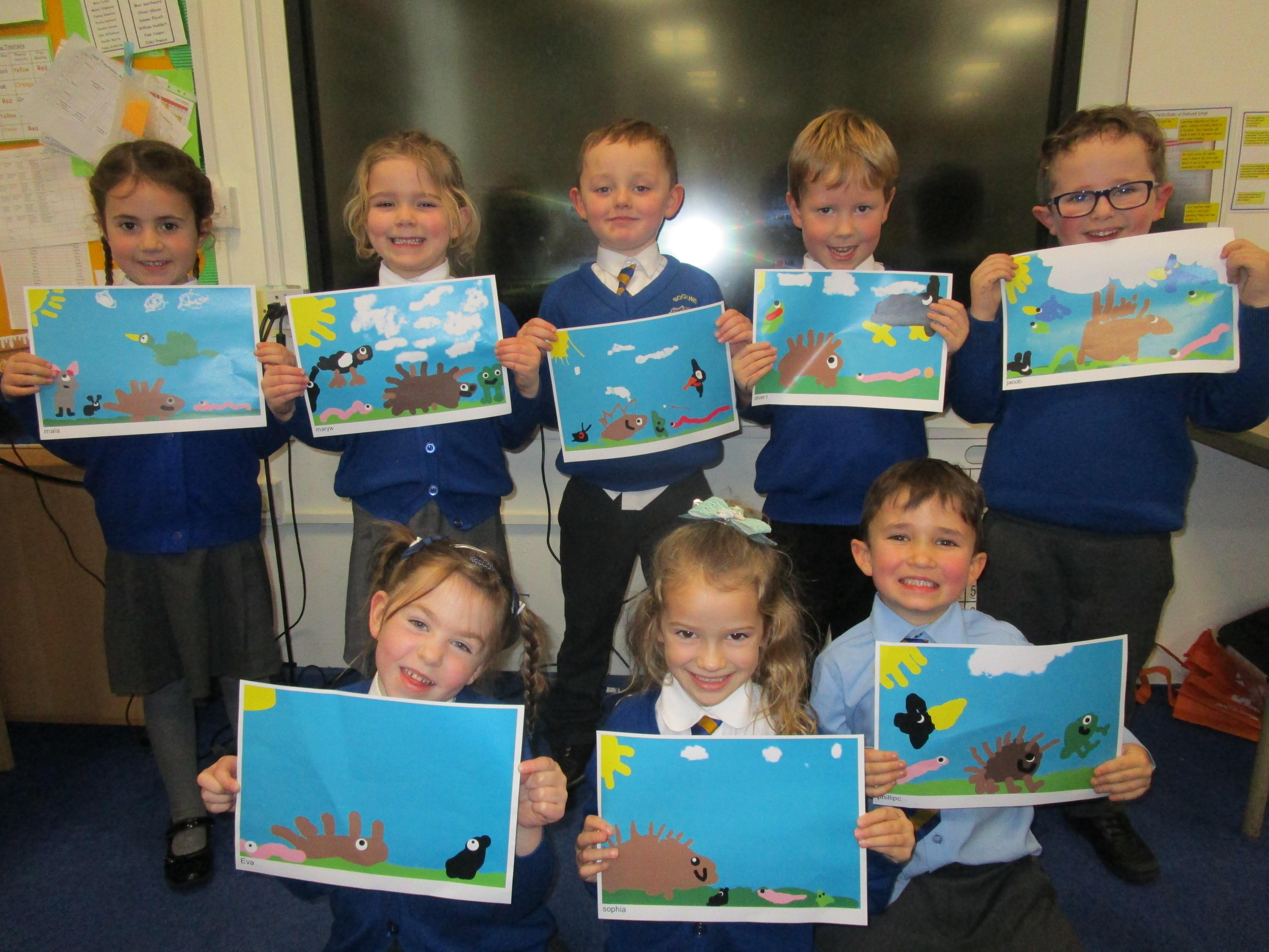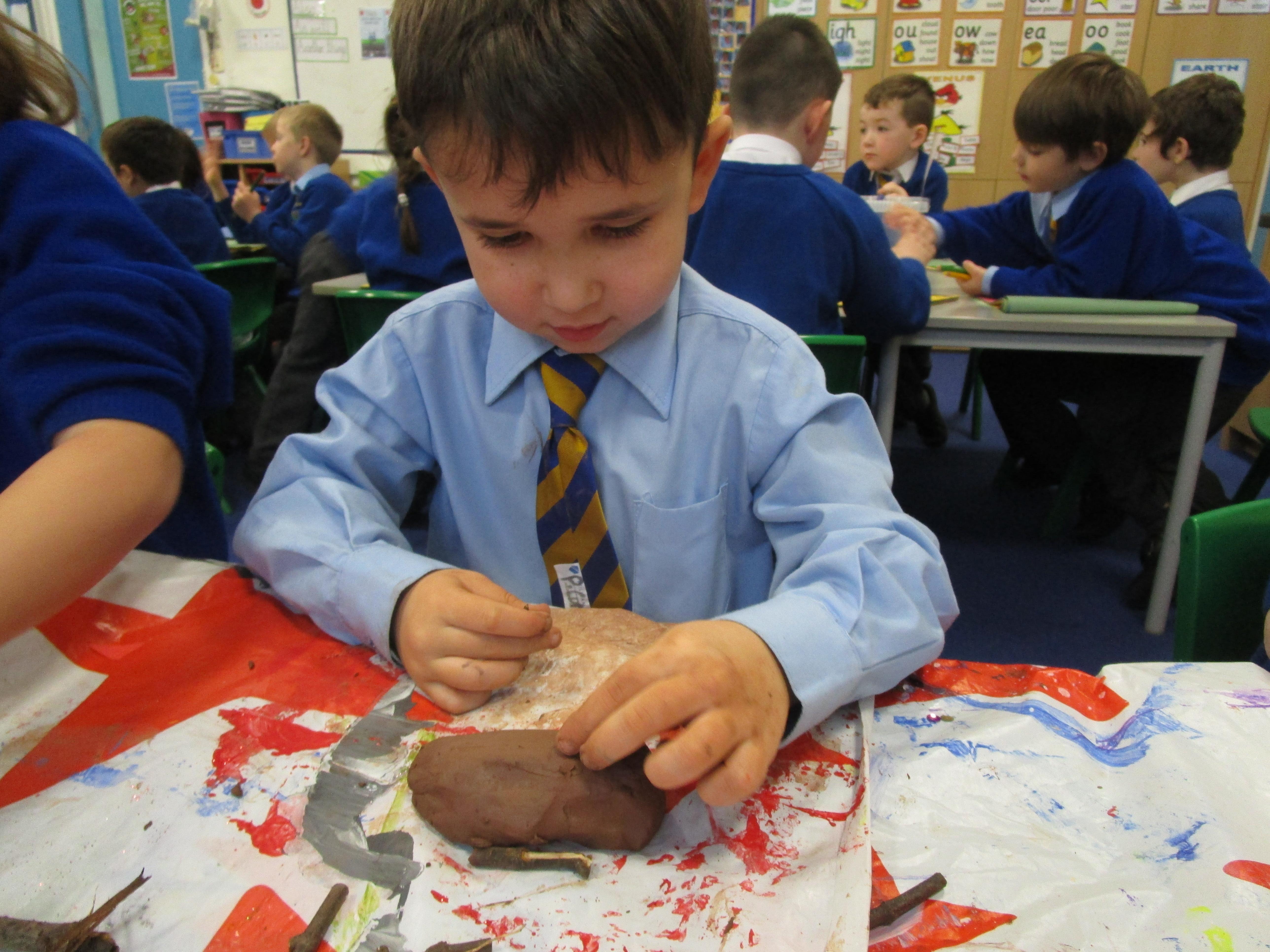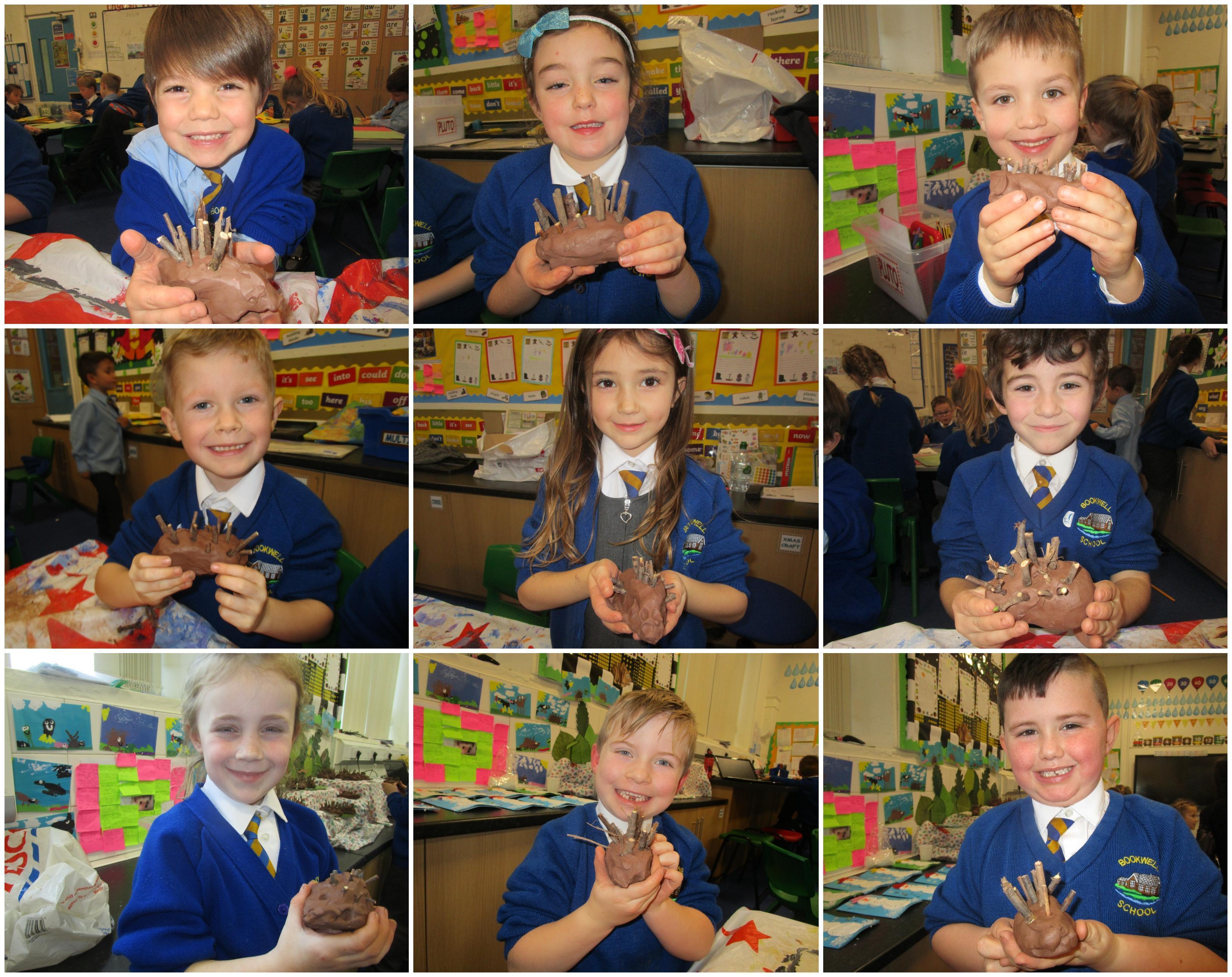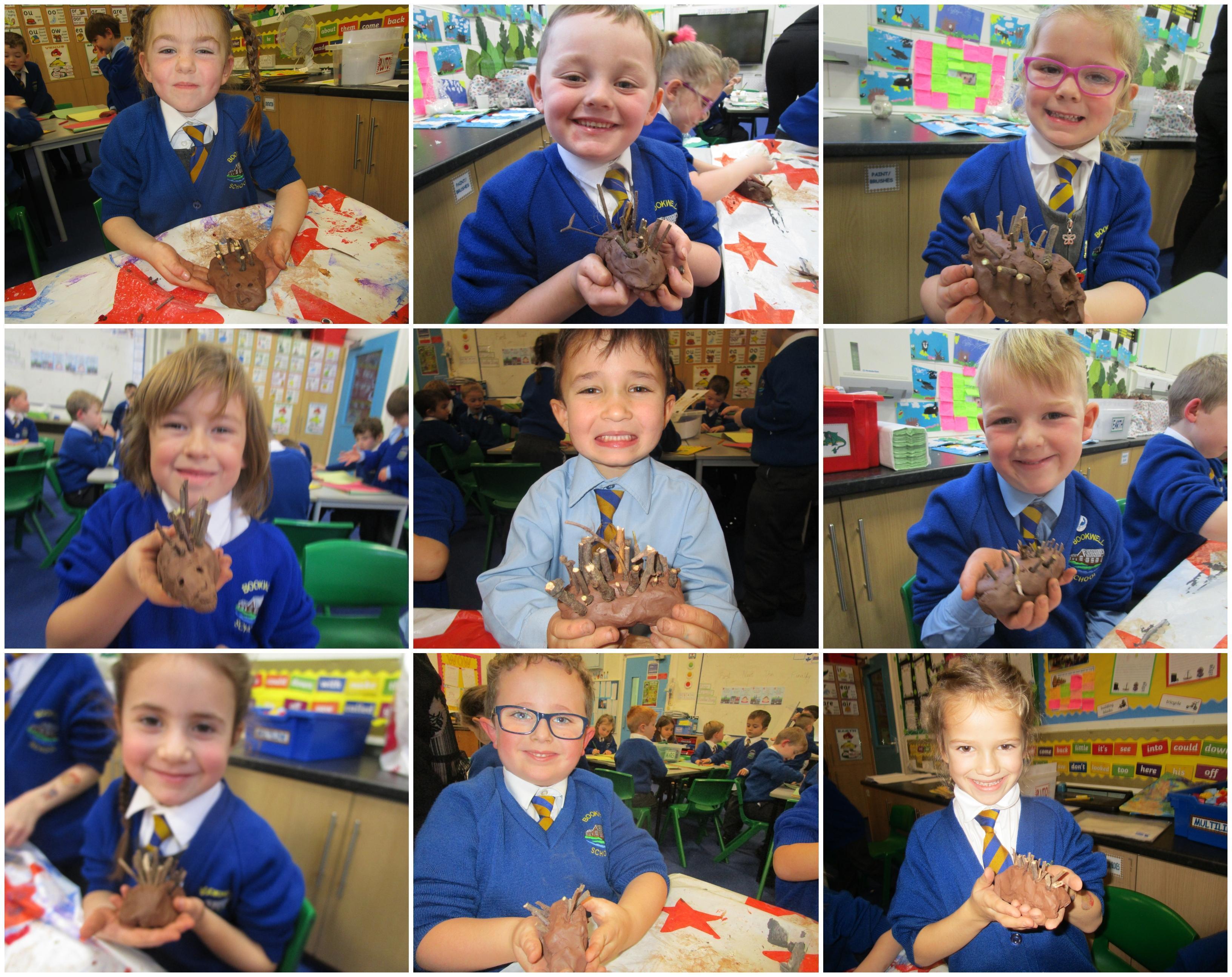 The children have had a fantastically messy time making their very own hedgehog! They made the body out of clay and used sticks for the hedgehog's spines. They were very proud of their what they'd made!