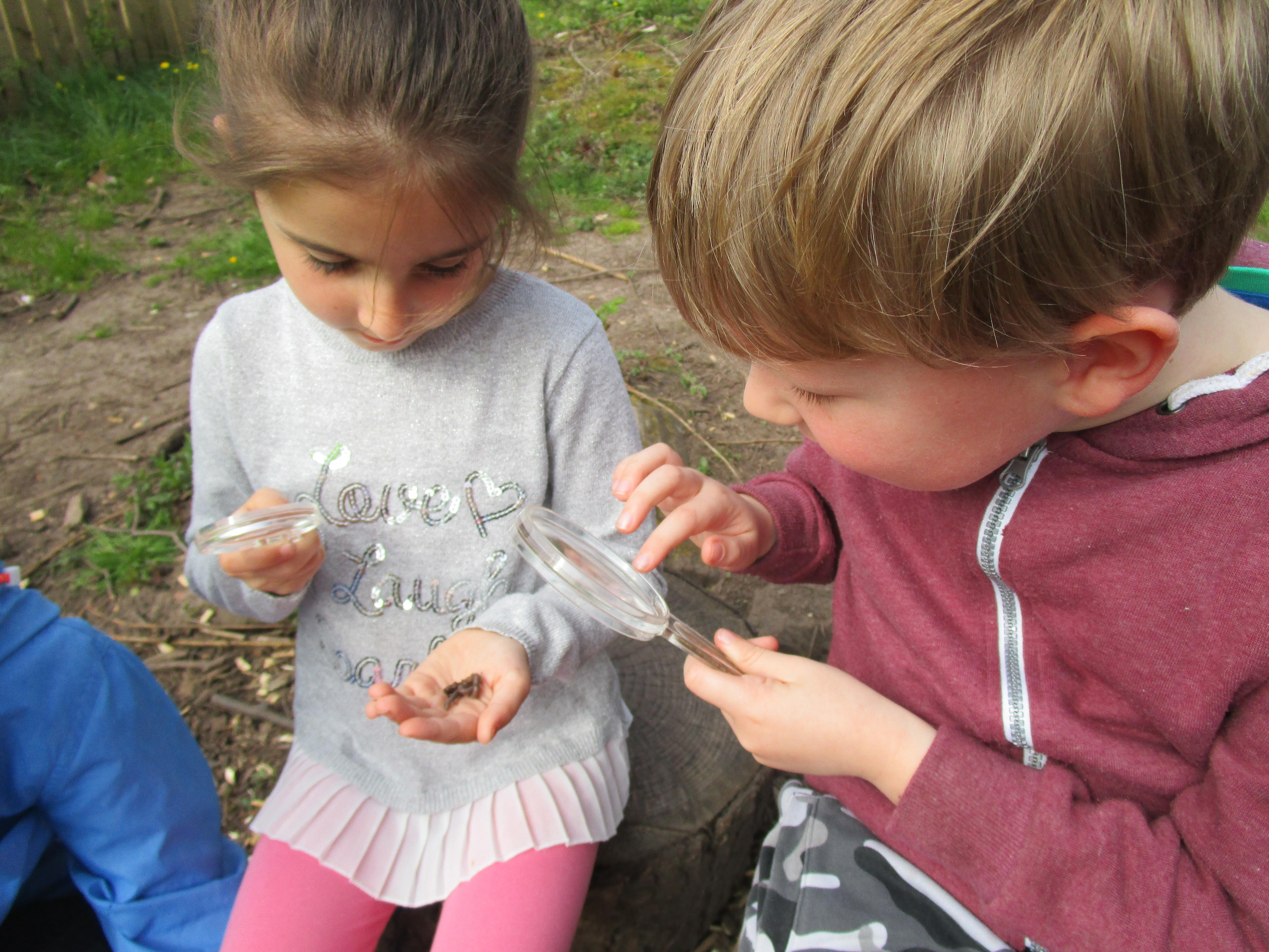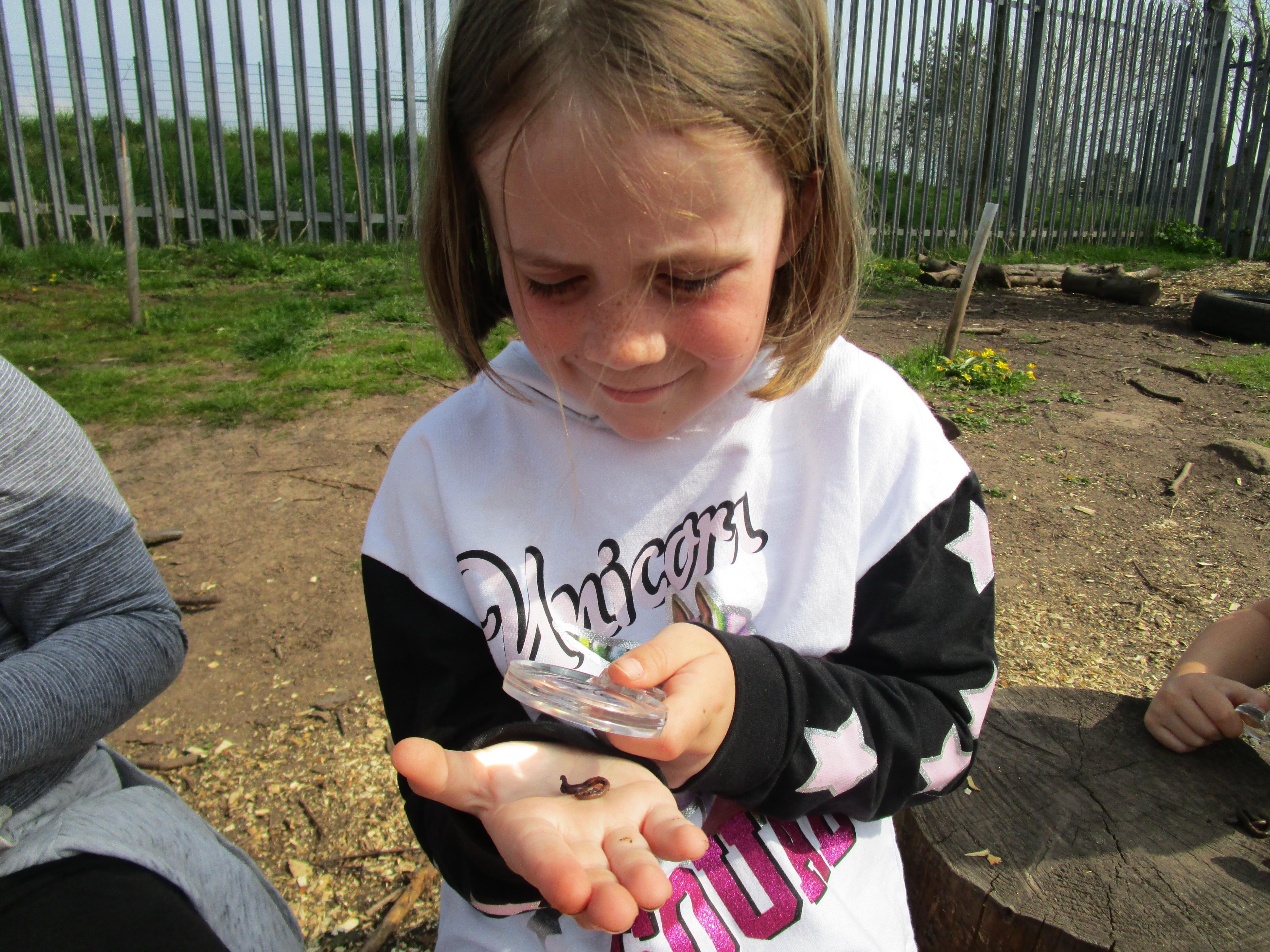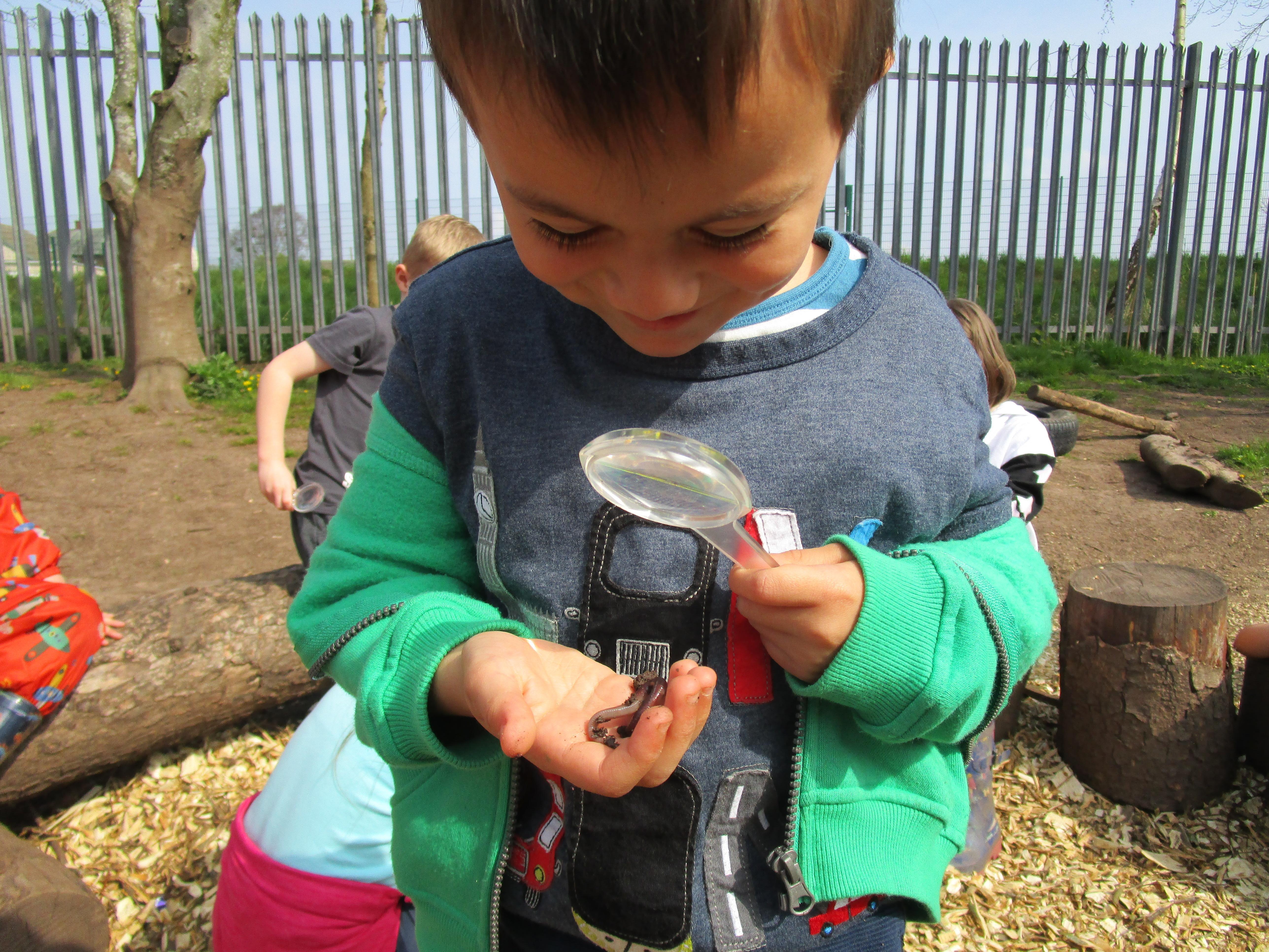 Then the children went to the forest school to try and find worms. They found most of their worms under stools and logs and we discussed that reason for this was that the soil was more moist in these places. Then the children used magnifying lenses to look more closely at the worm’s bodies.