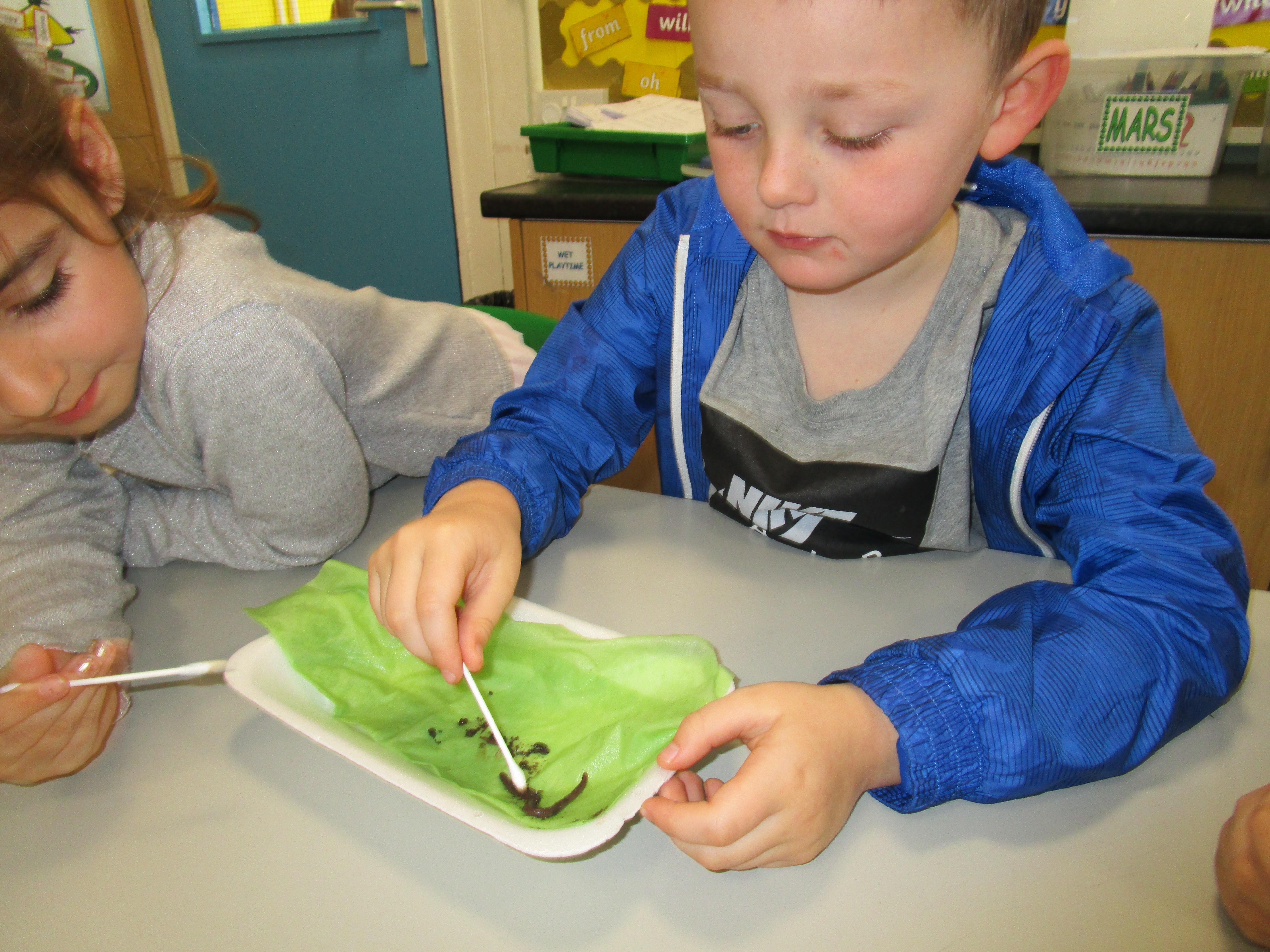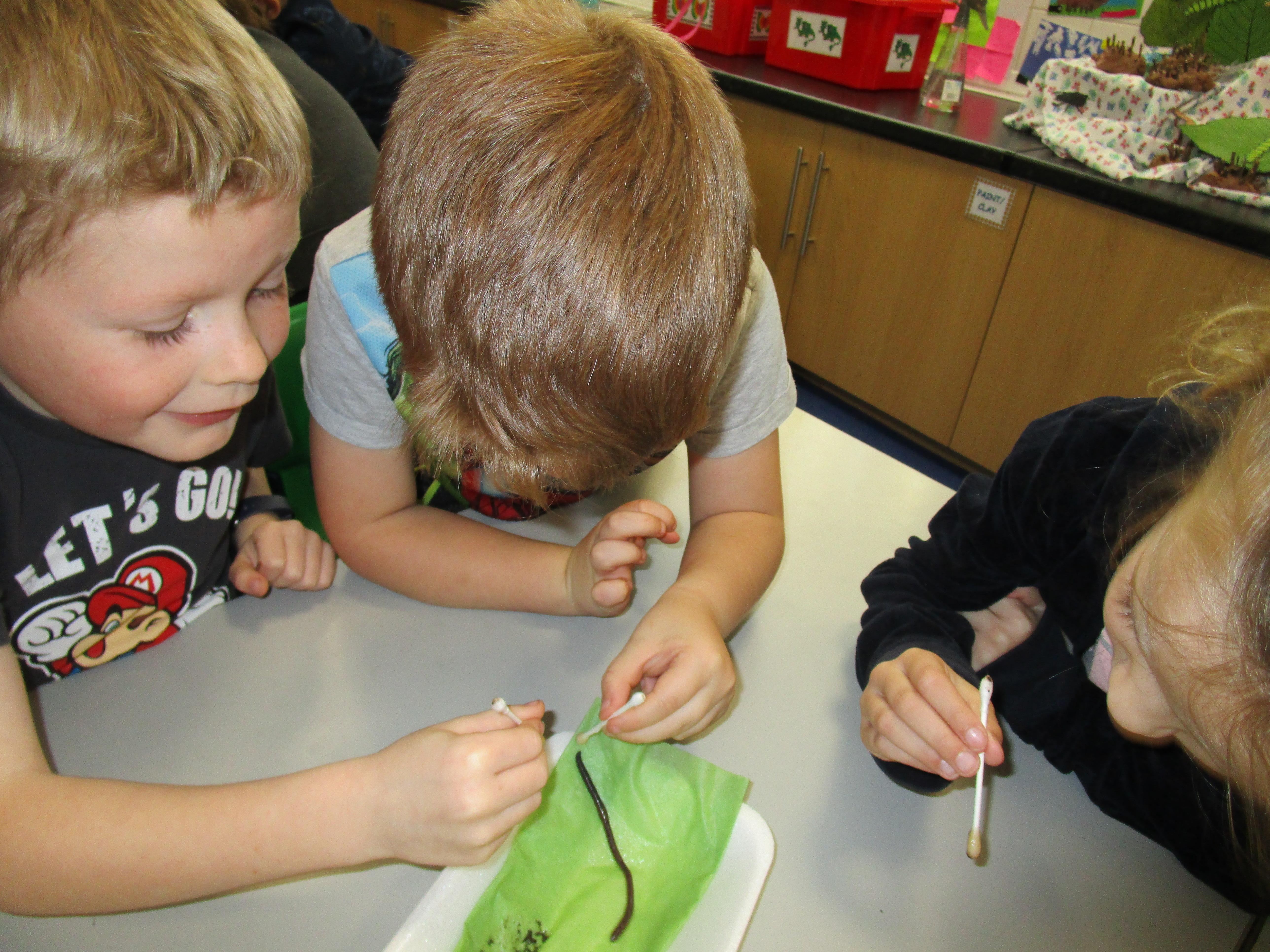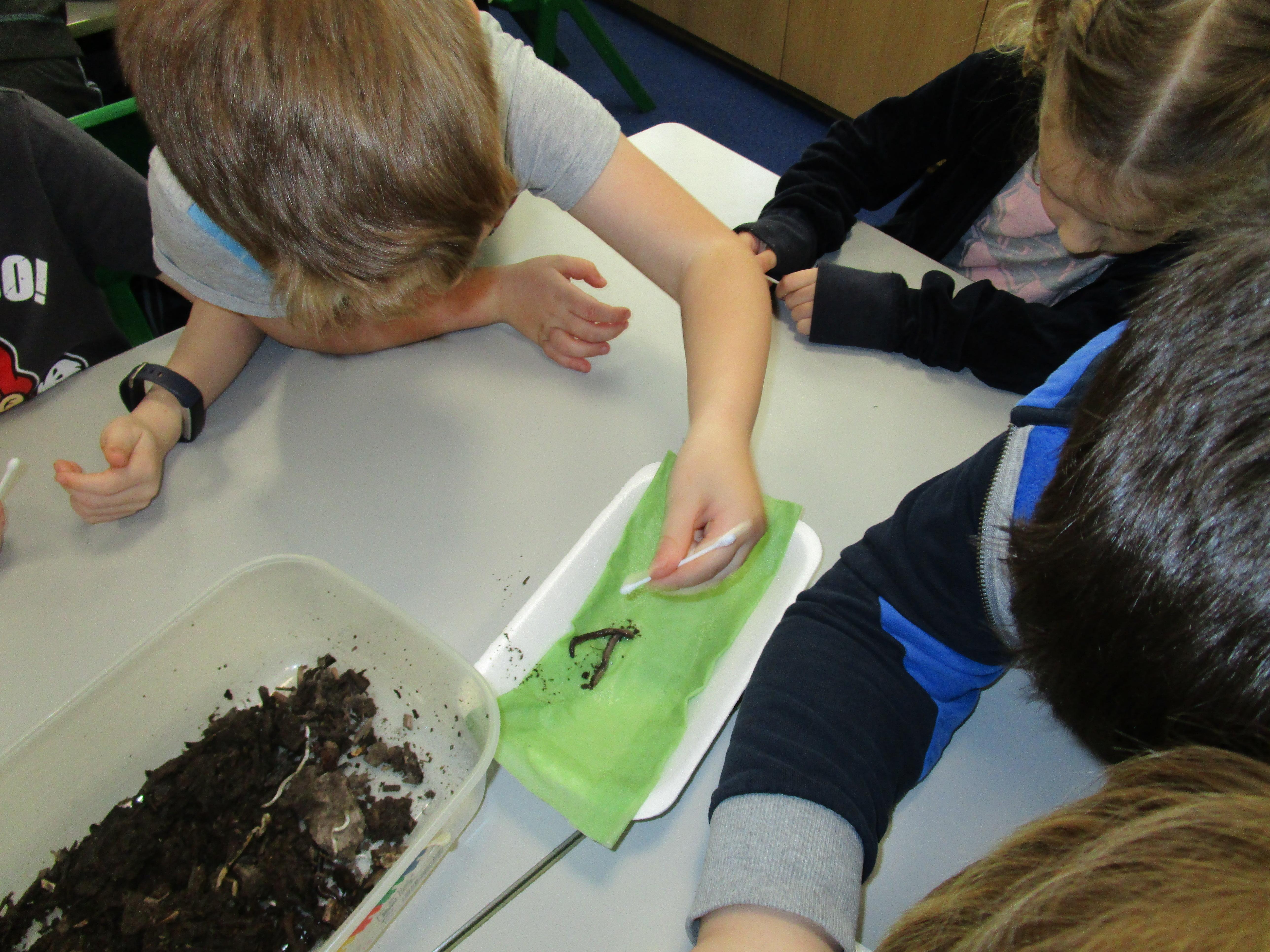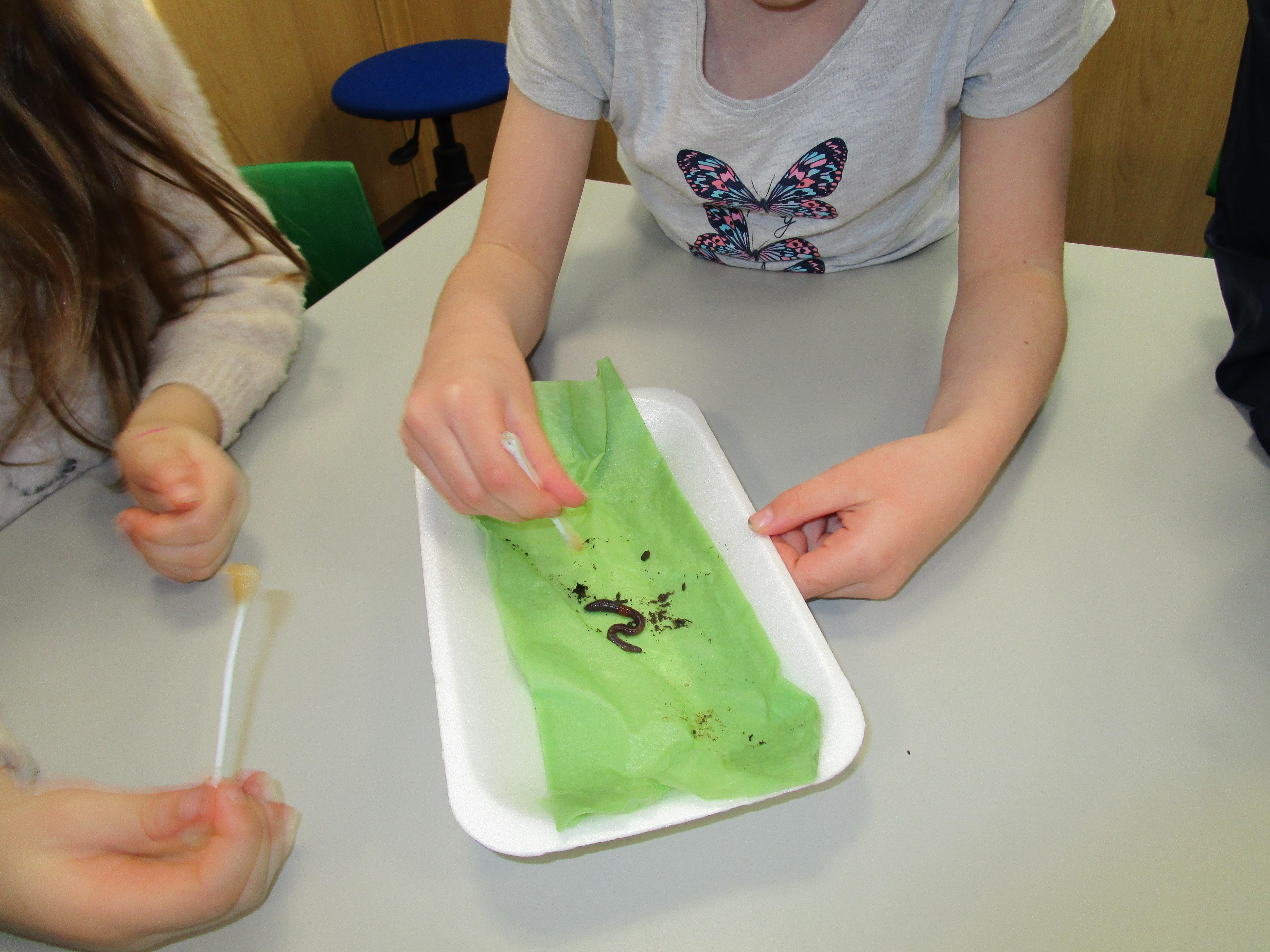 Then we performed four different tests. The first test was to check if worms respond to touch and the children tickled them with cotton buds. Then they tested whether the worms respond to sound by clapping closely to them. After this the children used a cotton bud soaked in vinegar to test whether they respond to smell. The final test was checking whether worms can sense light and we set up a tunnel to see if the worms would crawl into it.