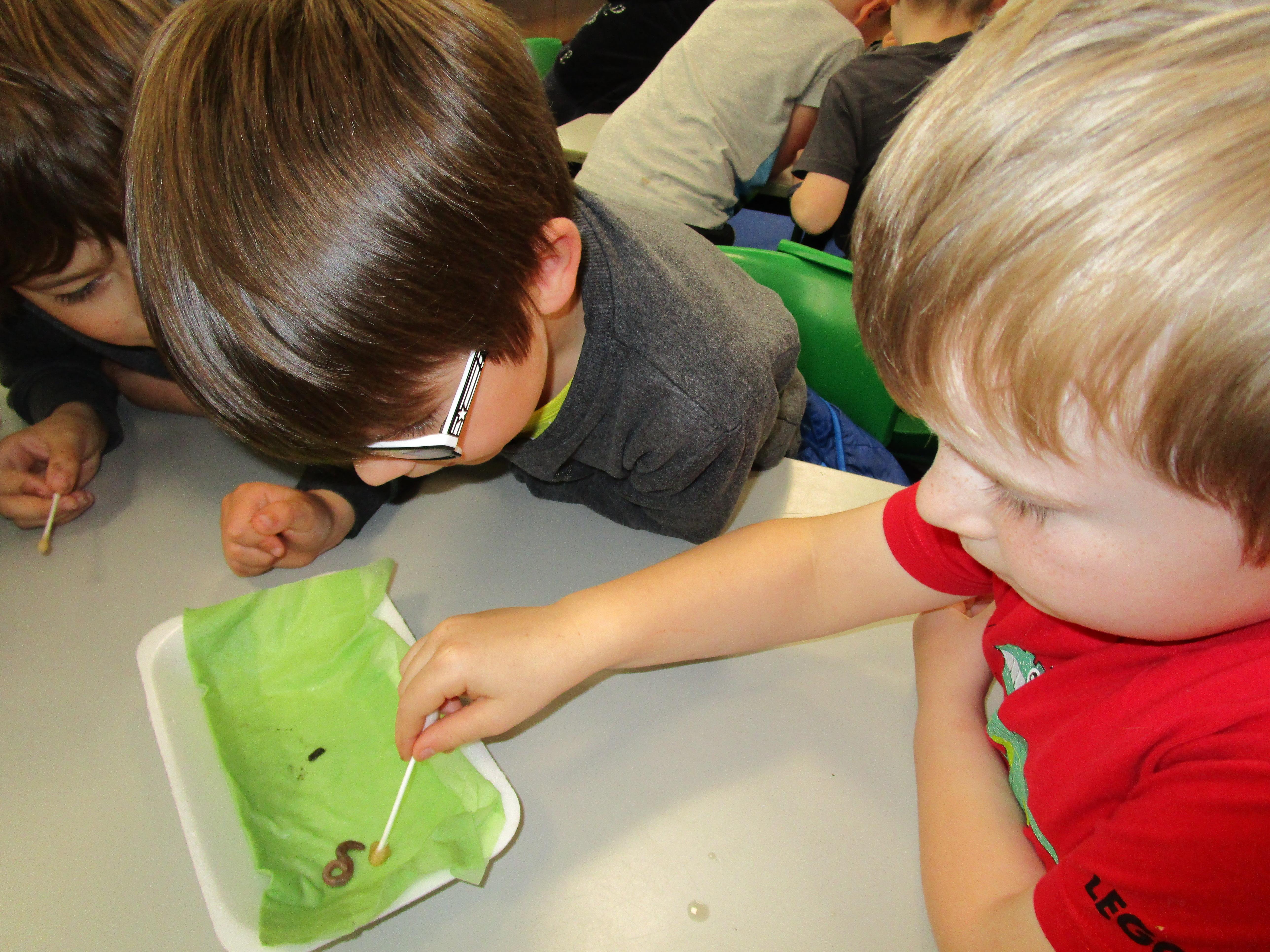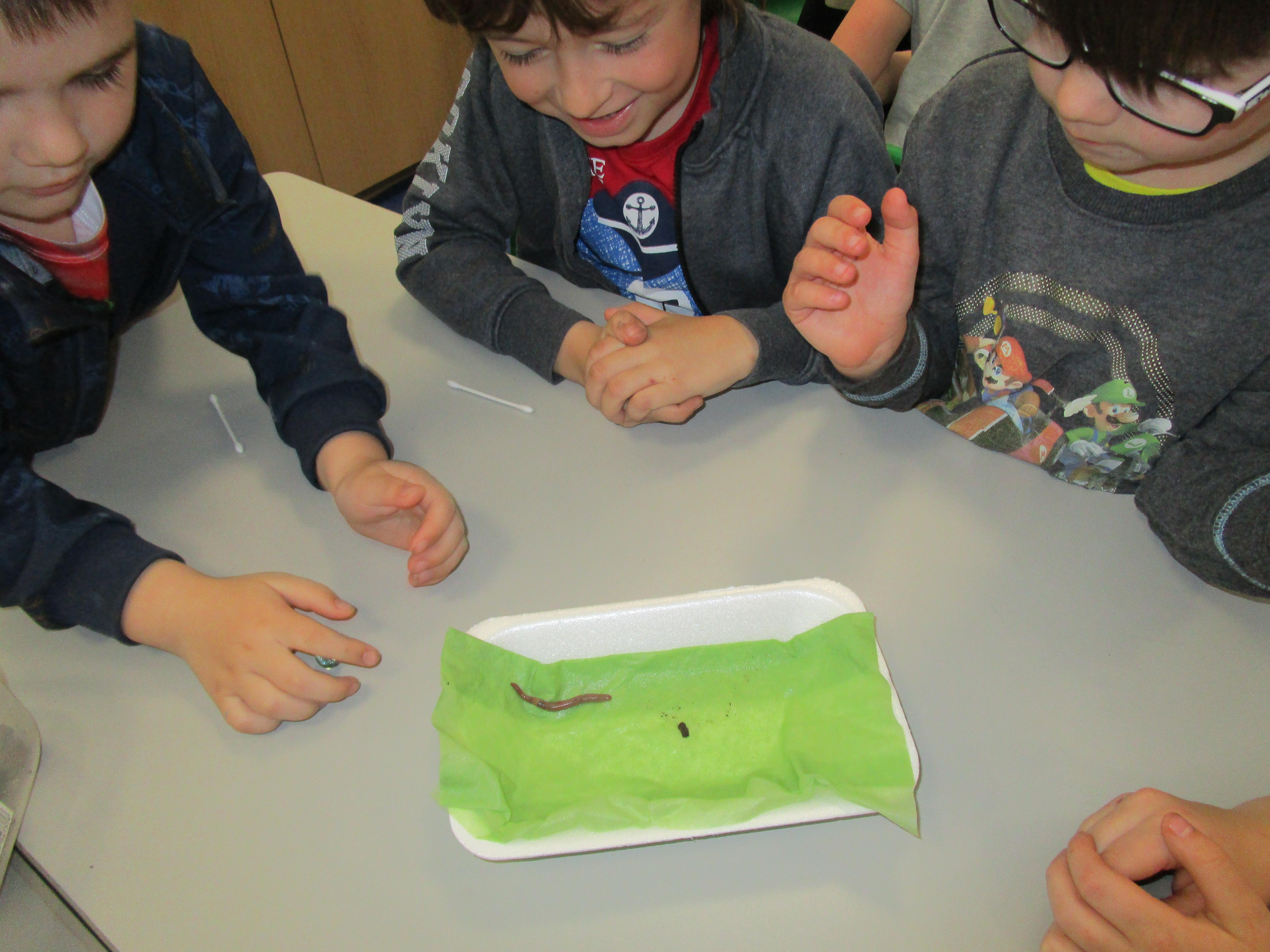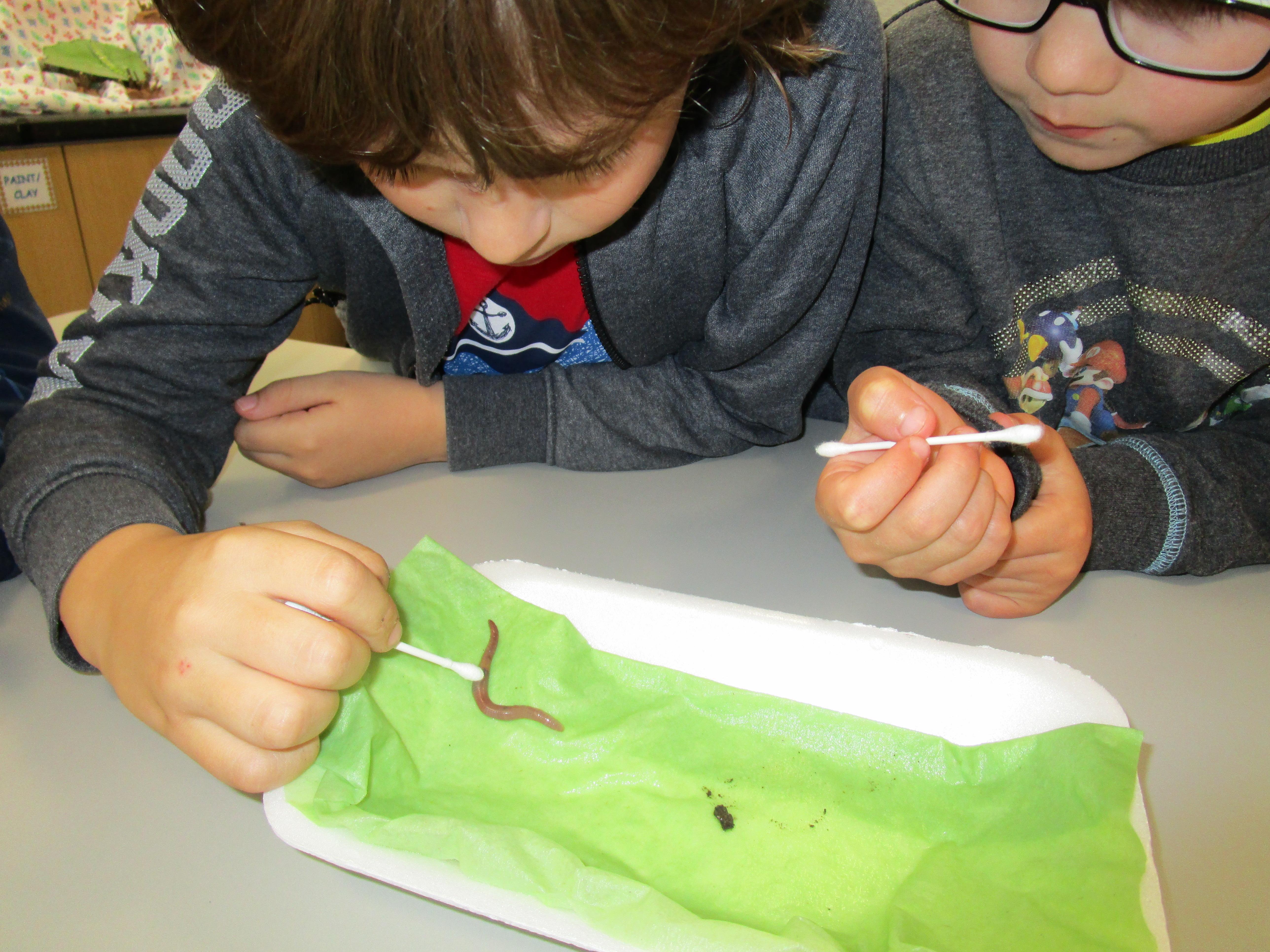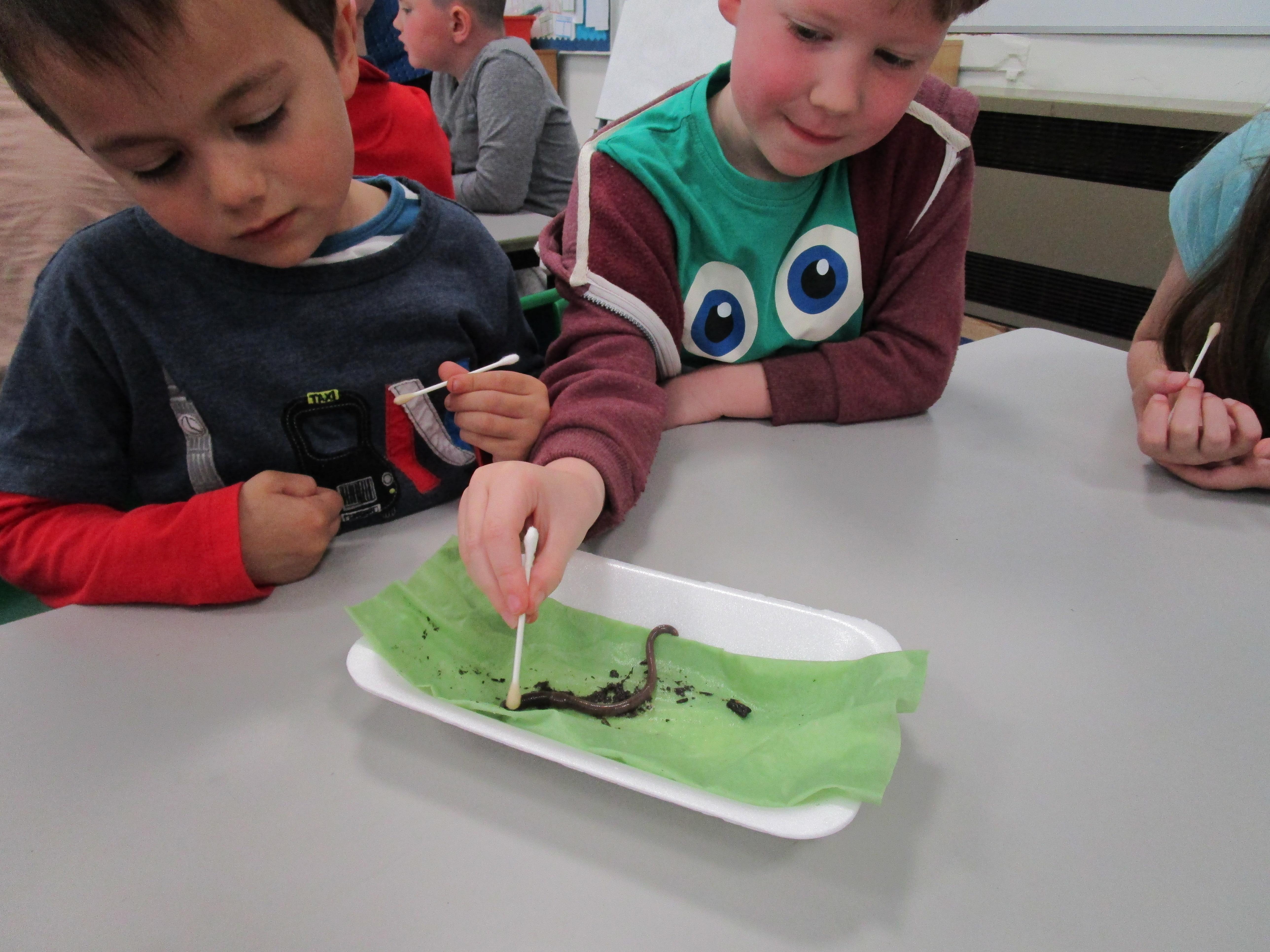 Then we performed four different tests. The first test was to check if worms respond to touch and the children tickled them with cotton buds. Then they tested whether the worms respond to sound by clapping closely to them. After this the children used a cotton bud soaked in vinegar to test whether they respond to smell. The final test was checking whether worms can sense light and we set up a tunnel to see if the worms would crawl into it.
