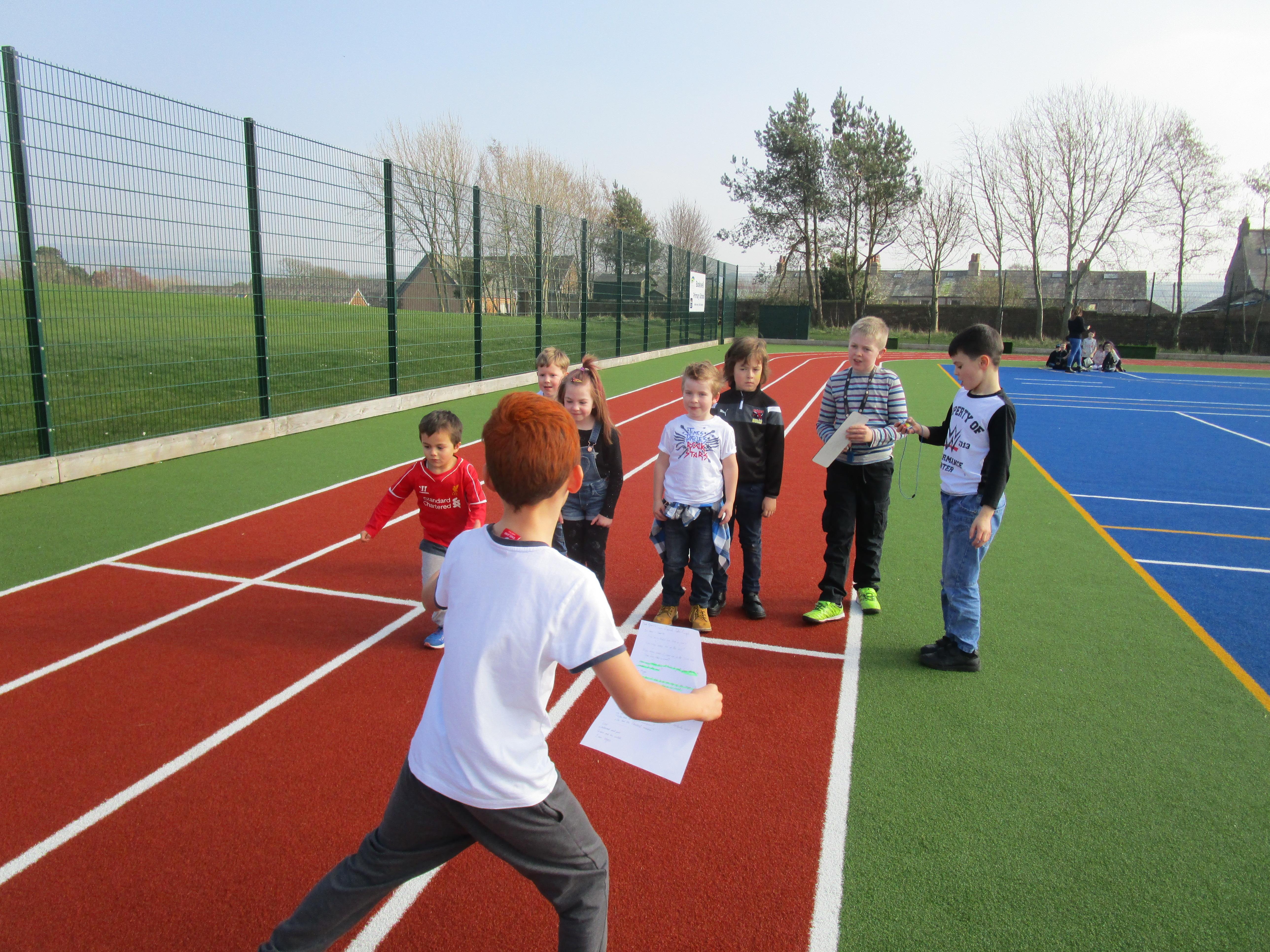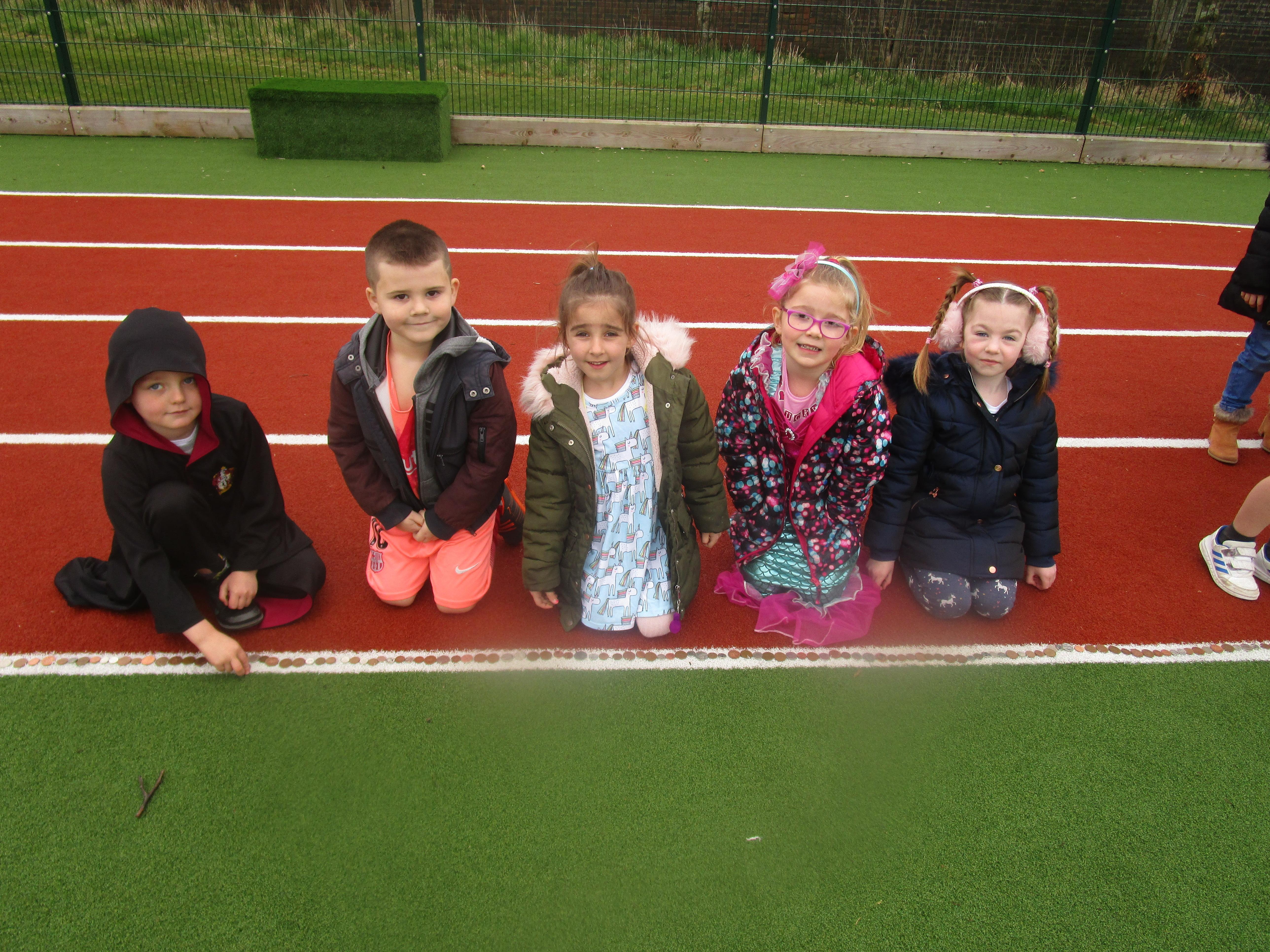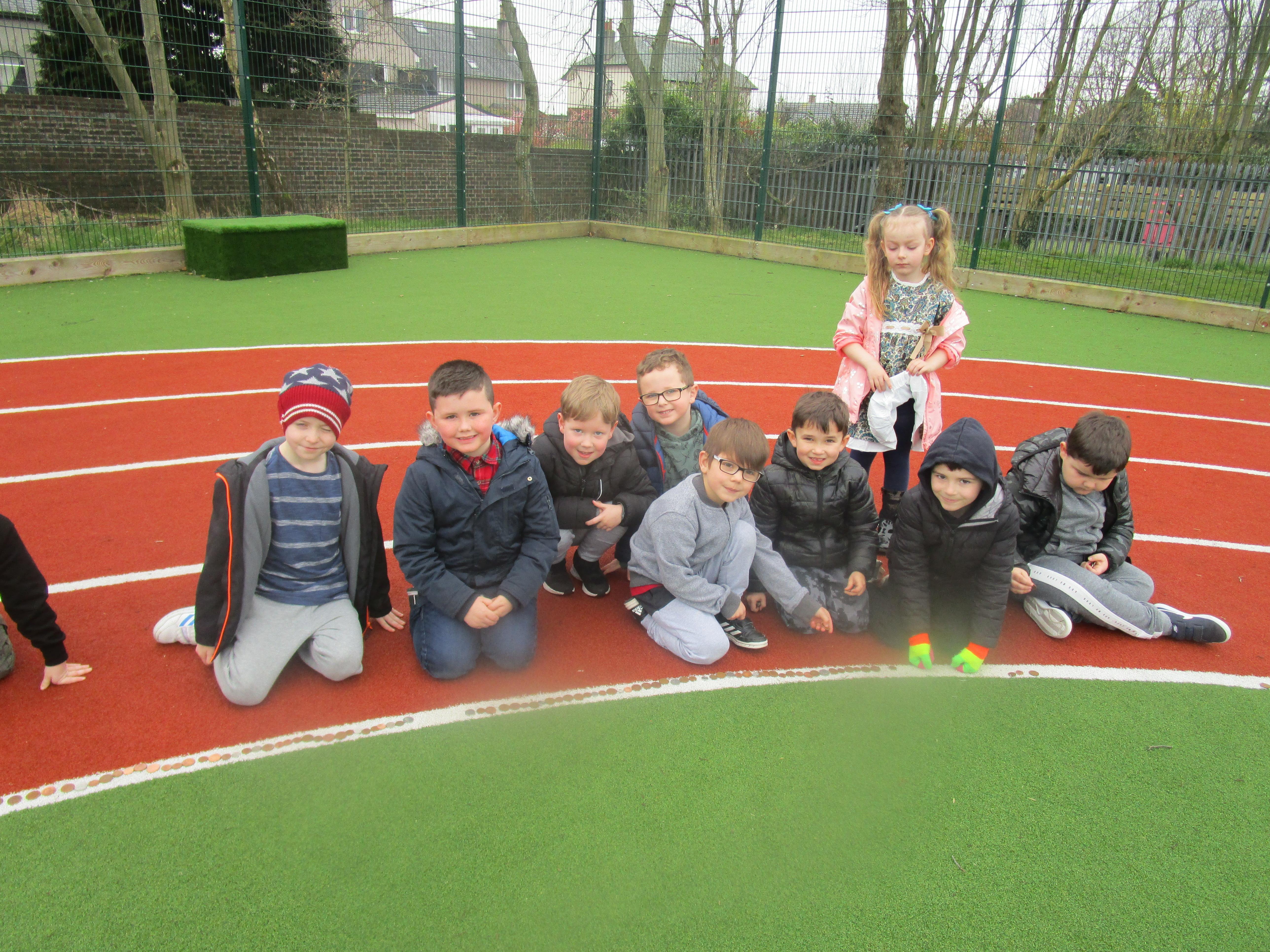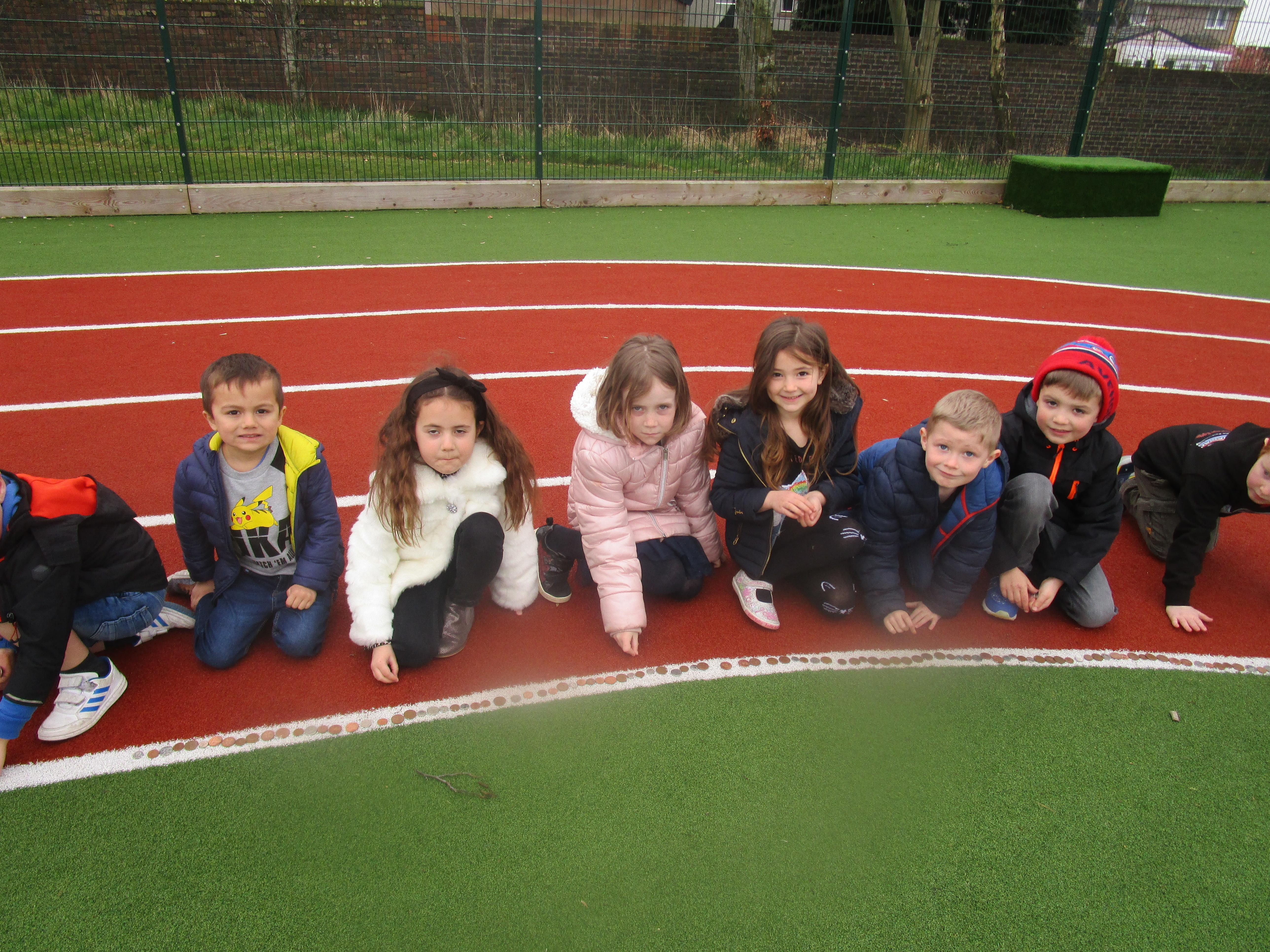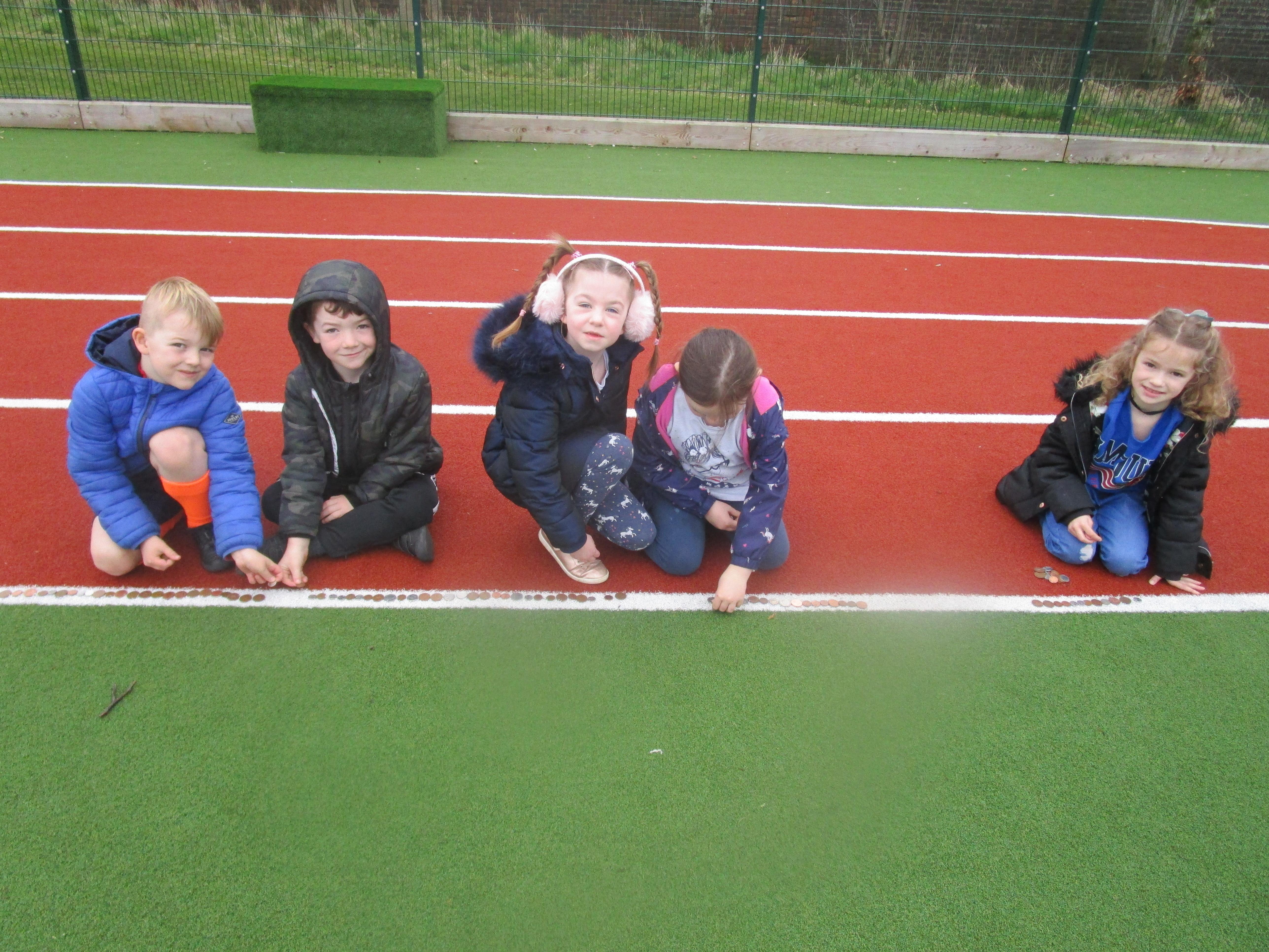Today the children have brought in change from home and made a chain of it around the race track on the MUGA. The money raised will go to the SIBBOO charity.