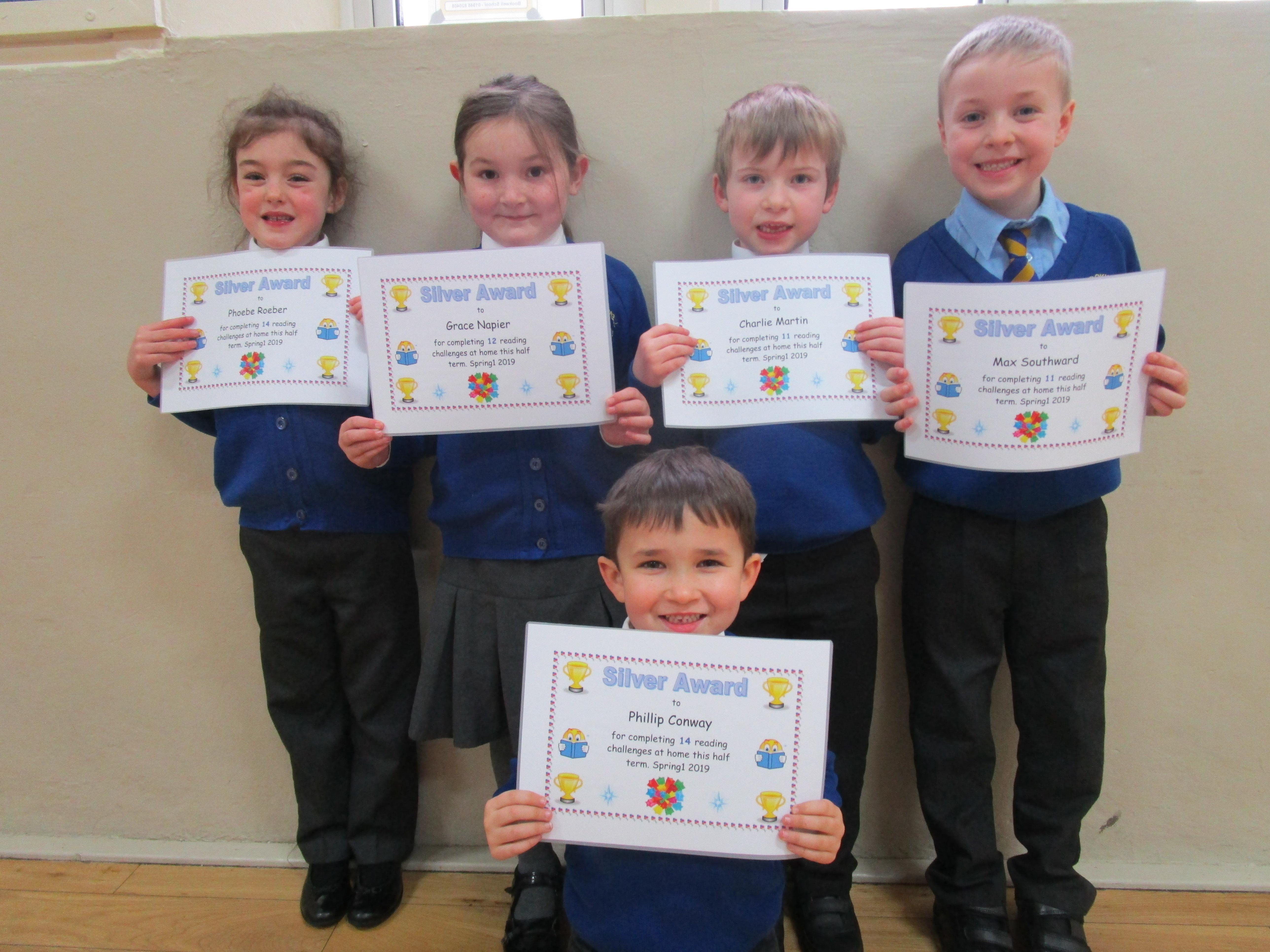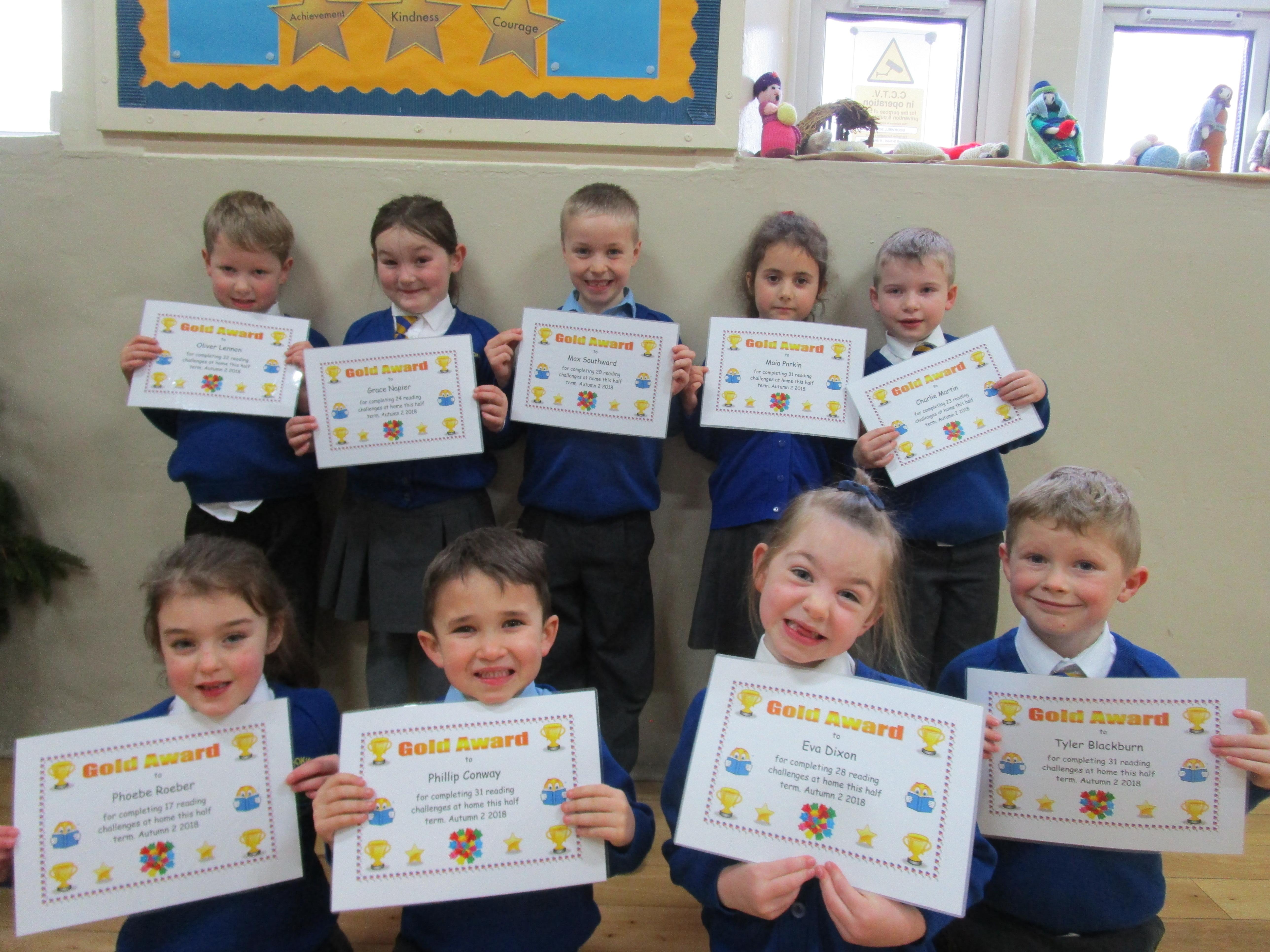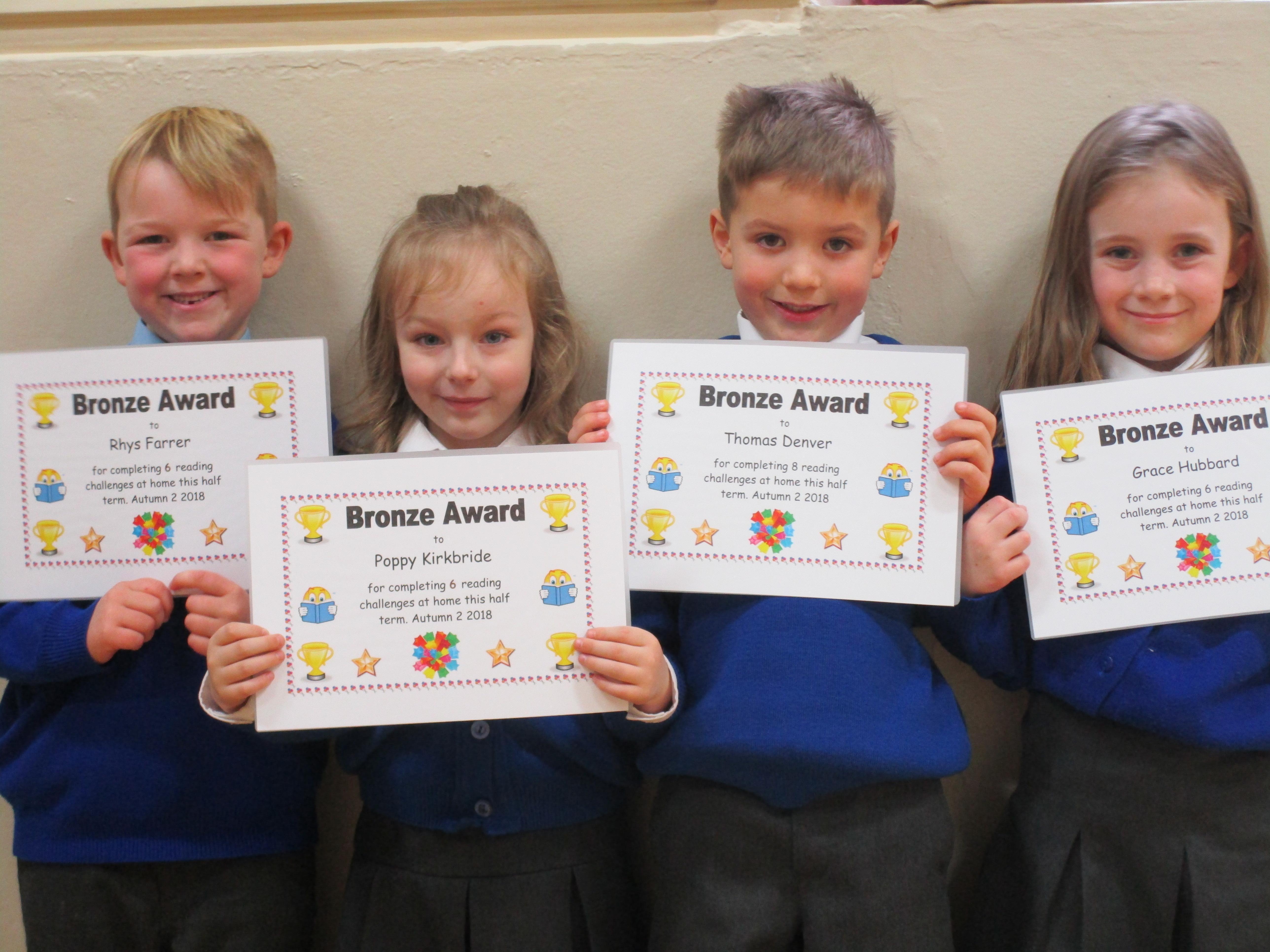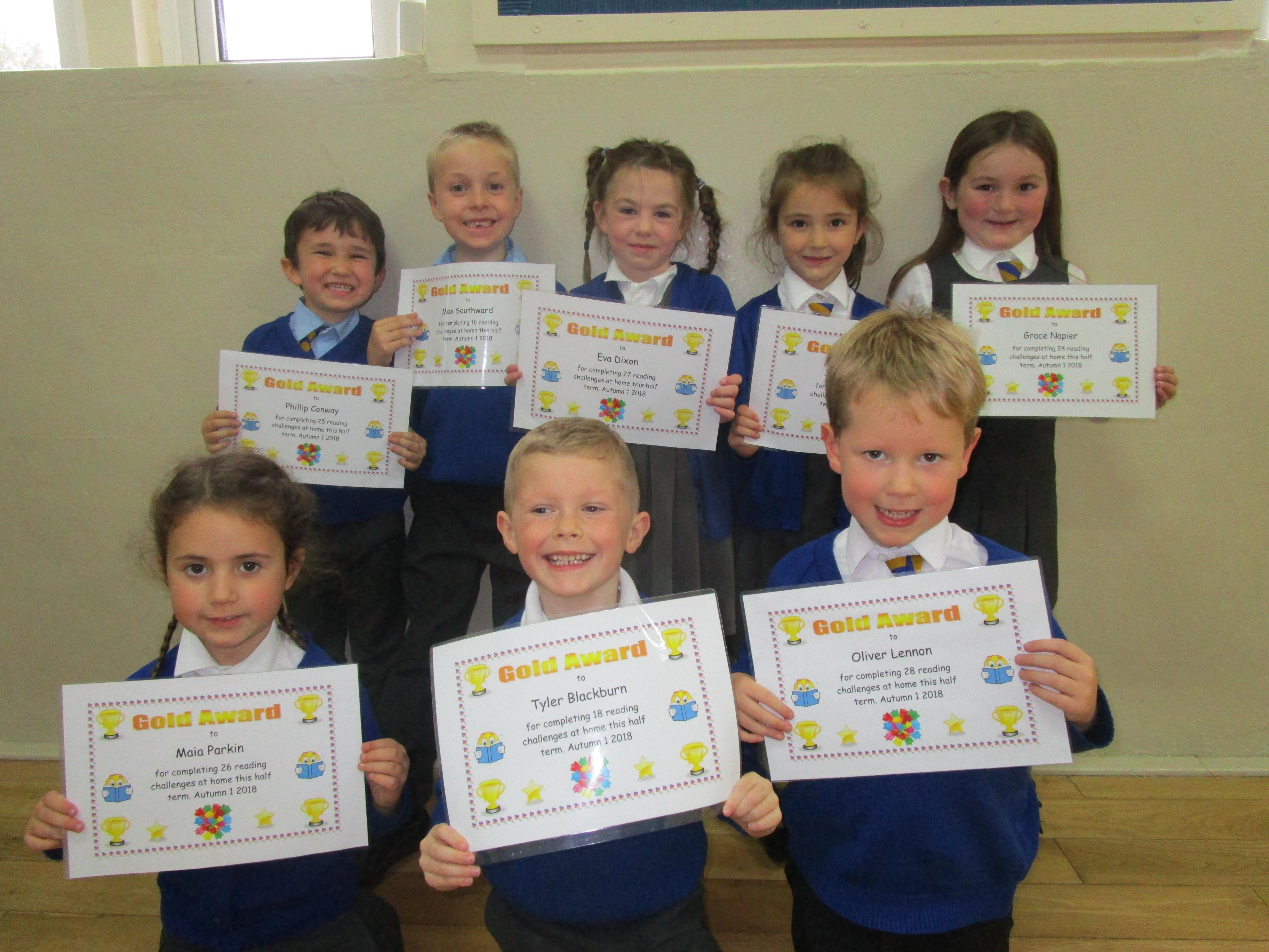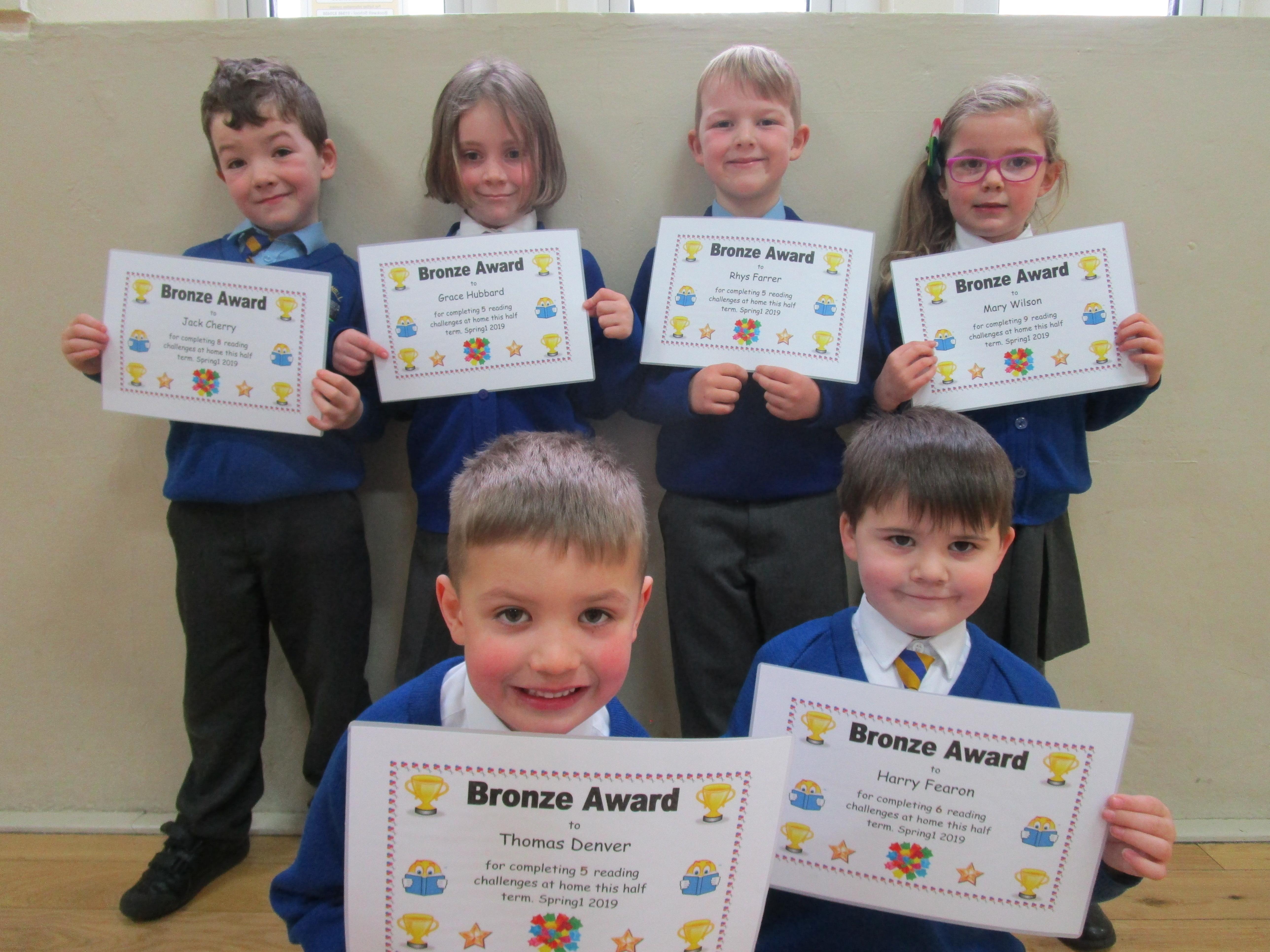 Each half-term Year 1 are set extra reading challenges to complete at home. Here are this half-term's Bronze, Silver and Gold certificate winners.