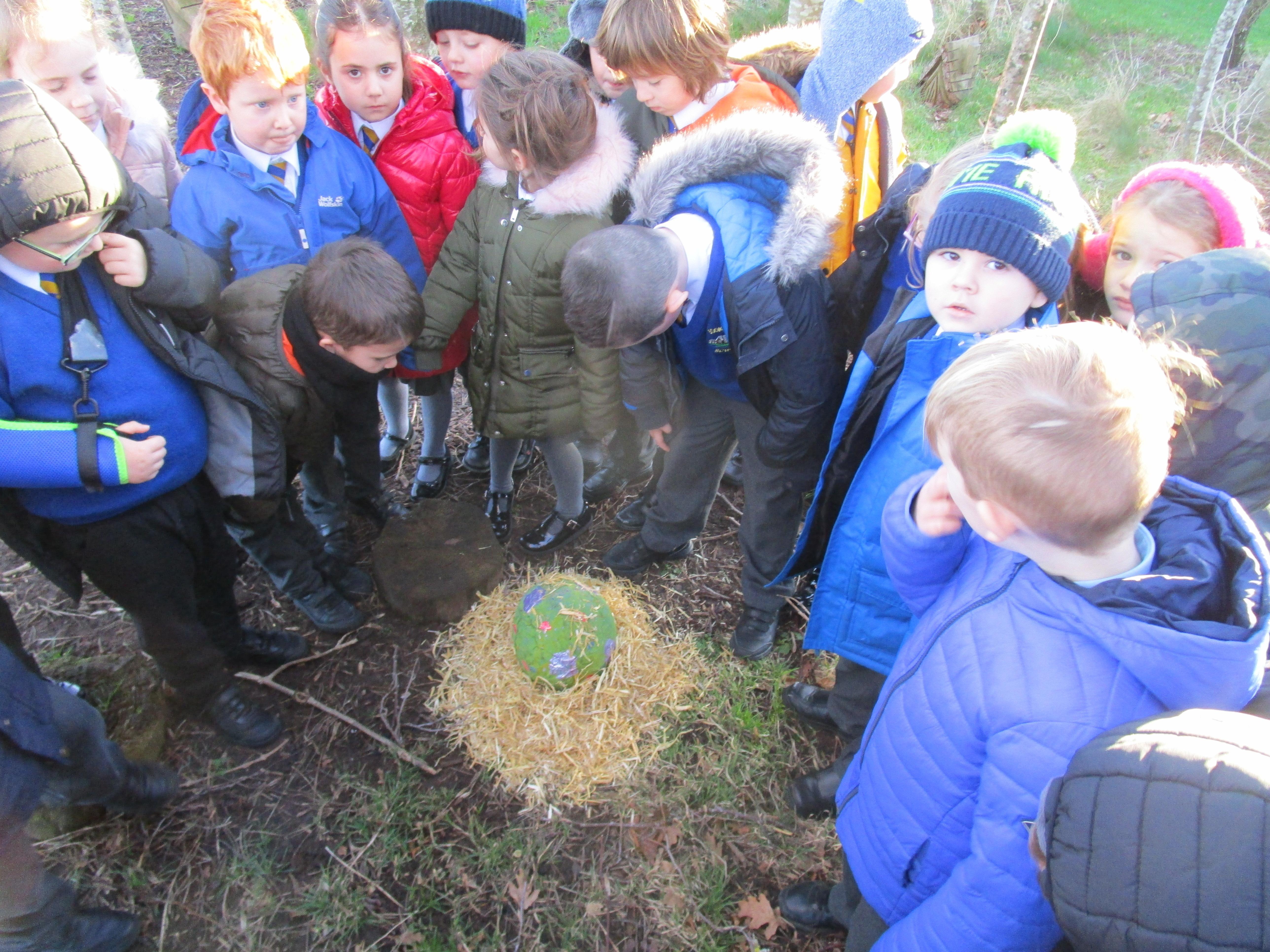 Today we went to the forest area to go on a bug hunt but when we got there we were surprised to find a colourful and spotty egg in a nest! The nest even had burnt straw in it so the children guessed that it must be a dragon's egg. We listened to the egg and could hear scratching noises inside and the children even found some dragon footprints!