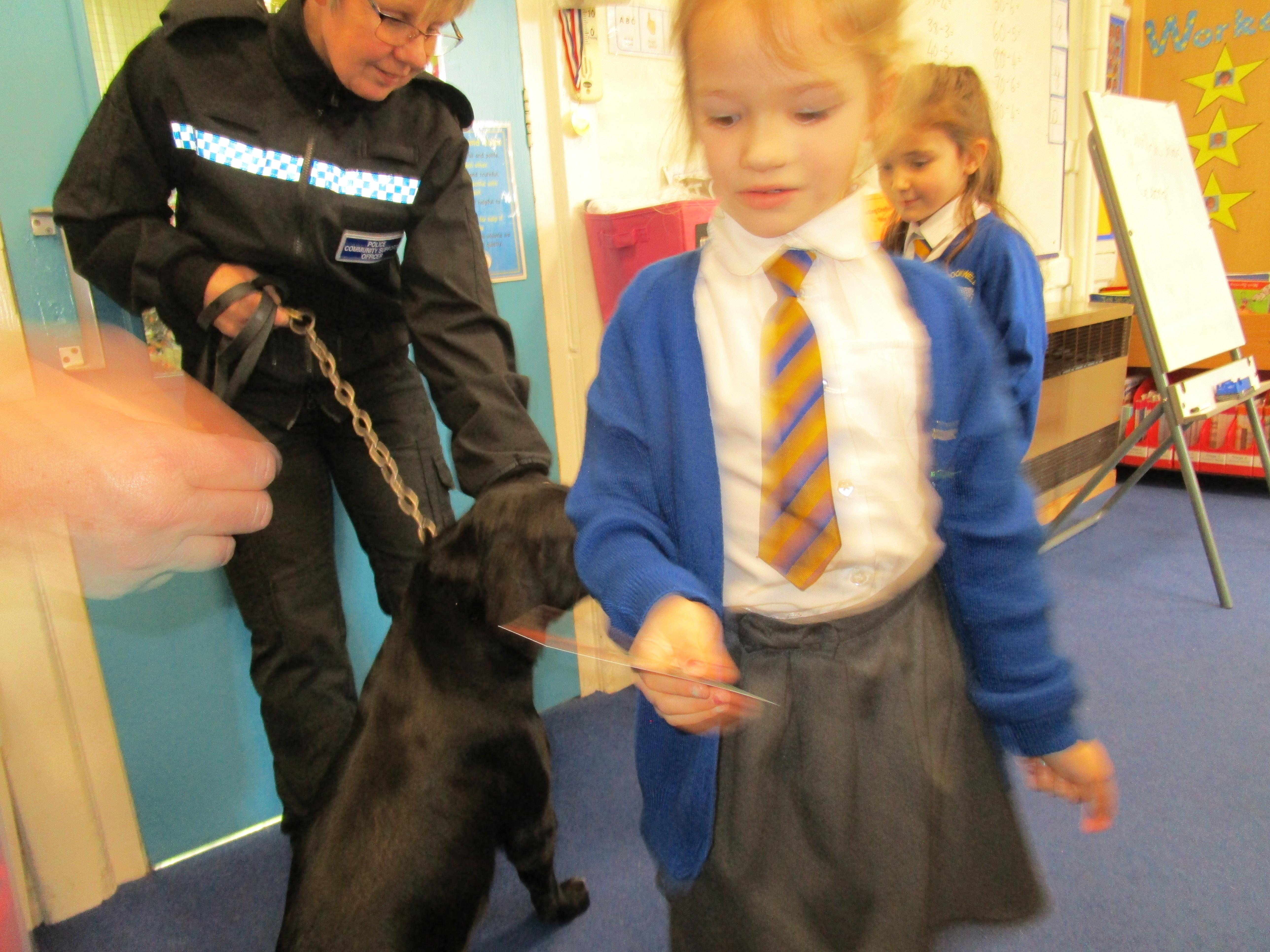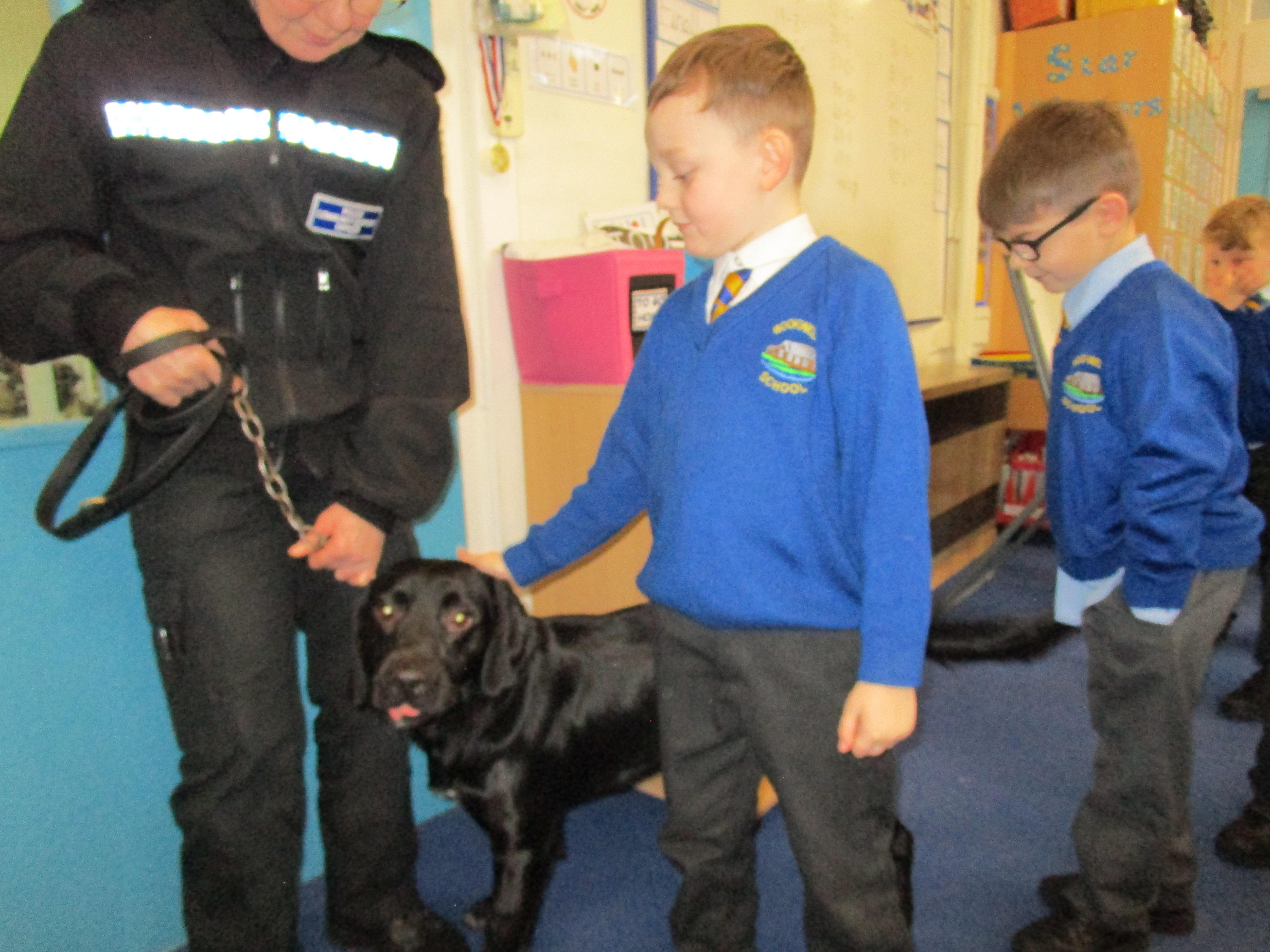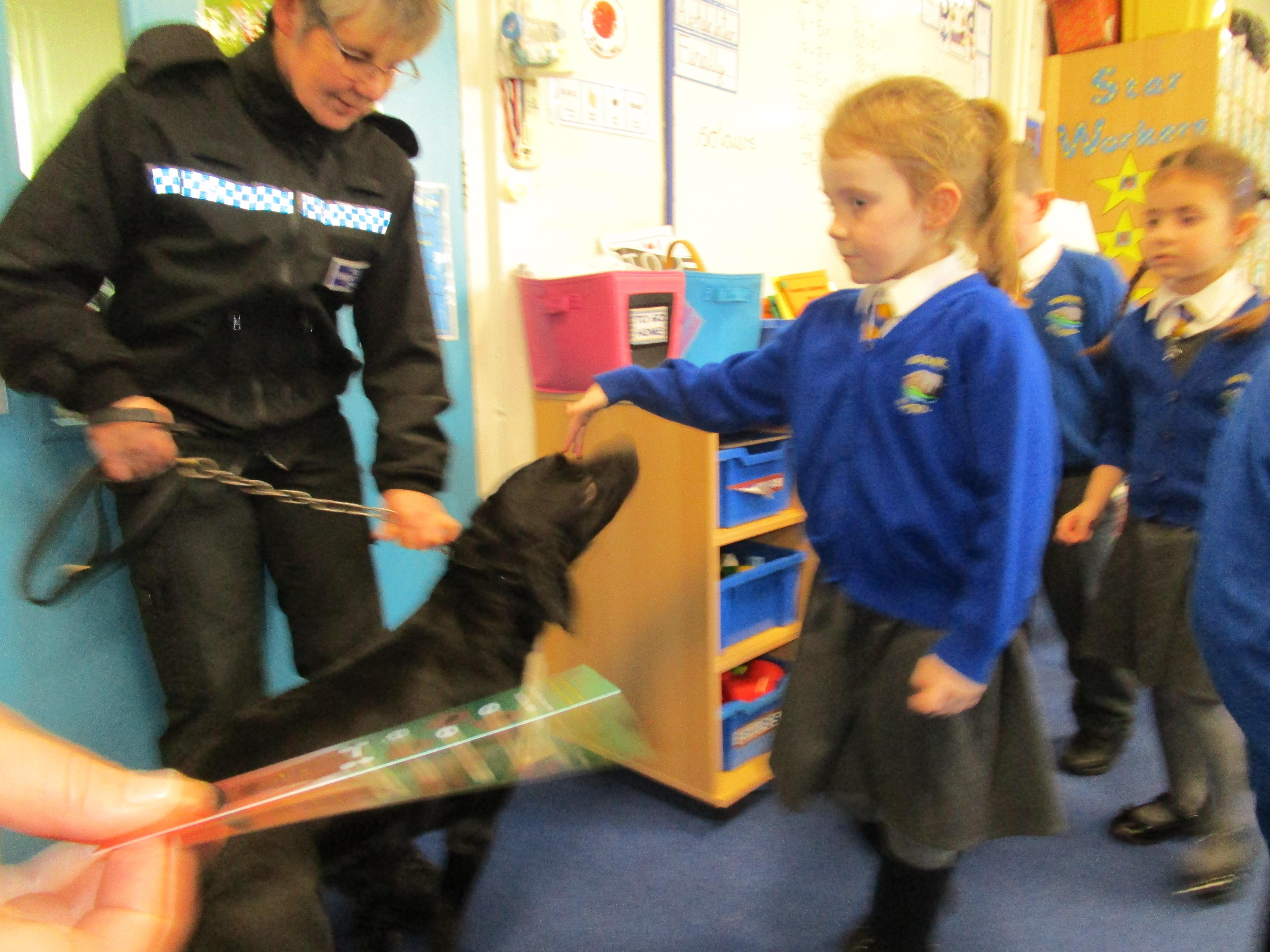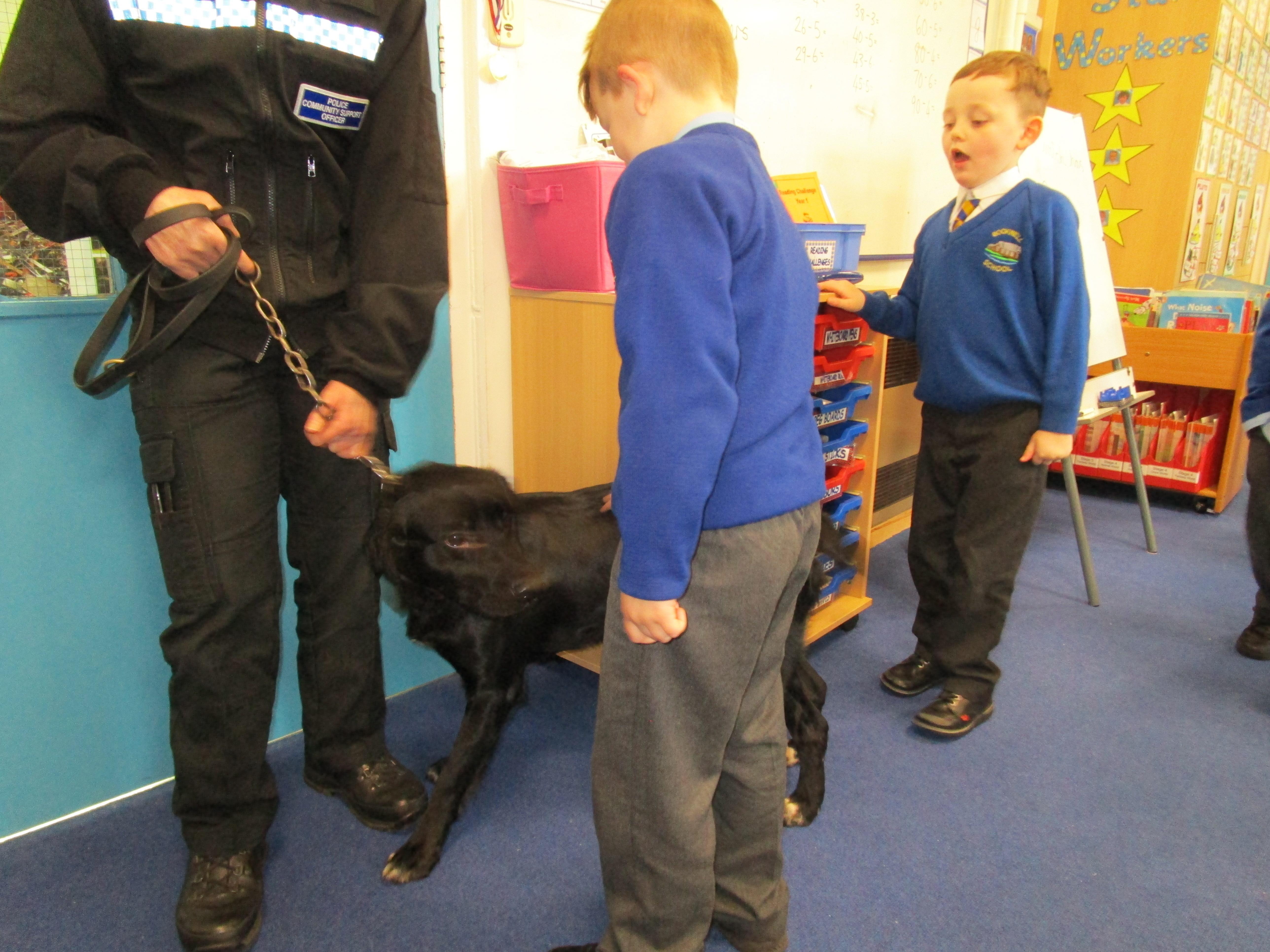 Today we were really lucky as we were visited by some PCSO's and they brought their police dog to meet the children.
