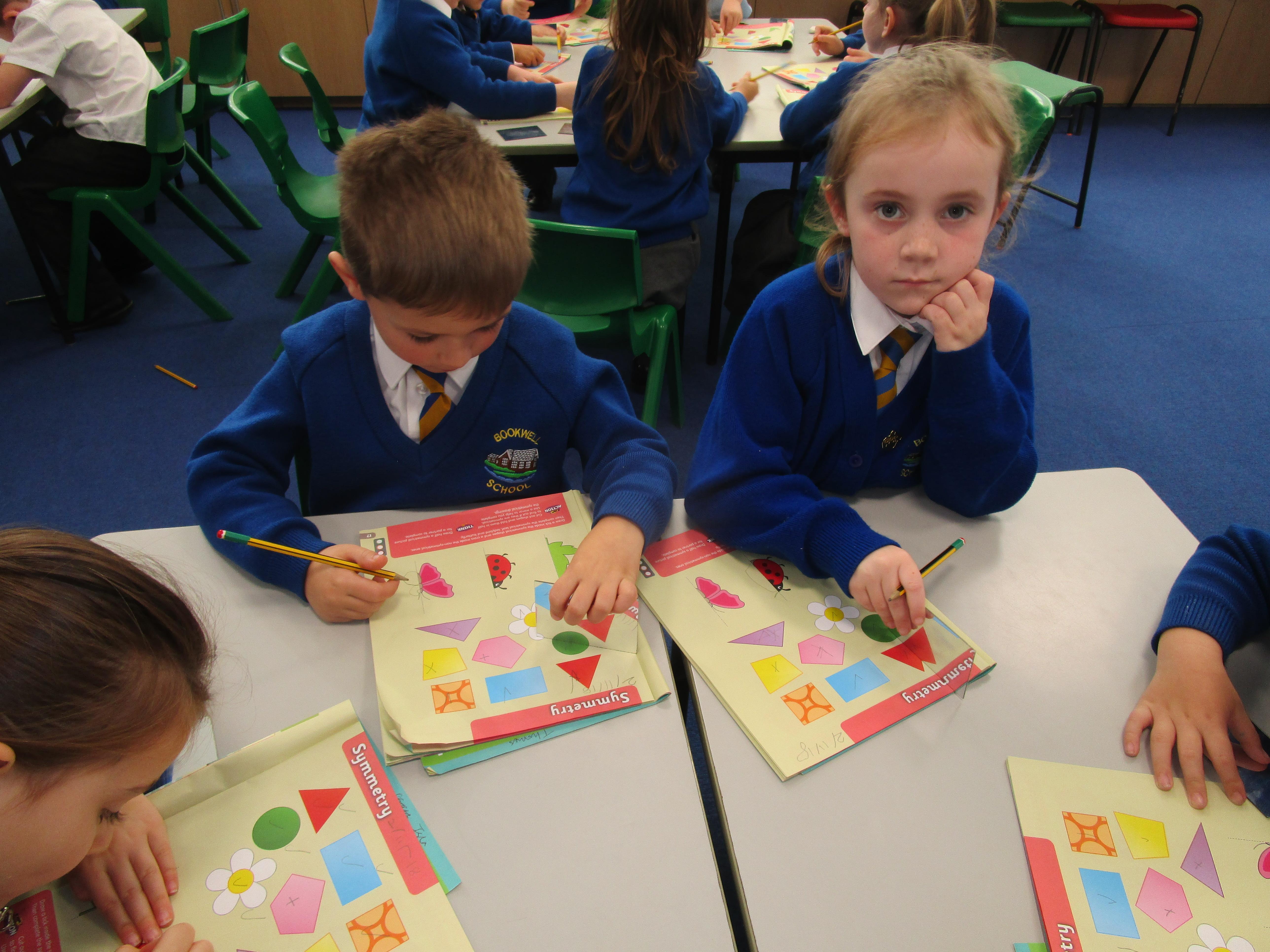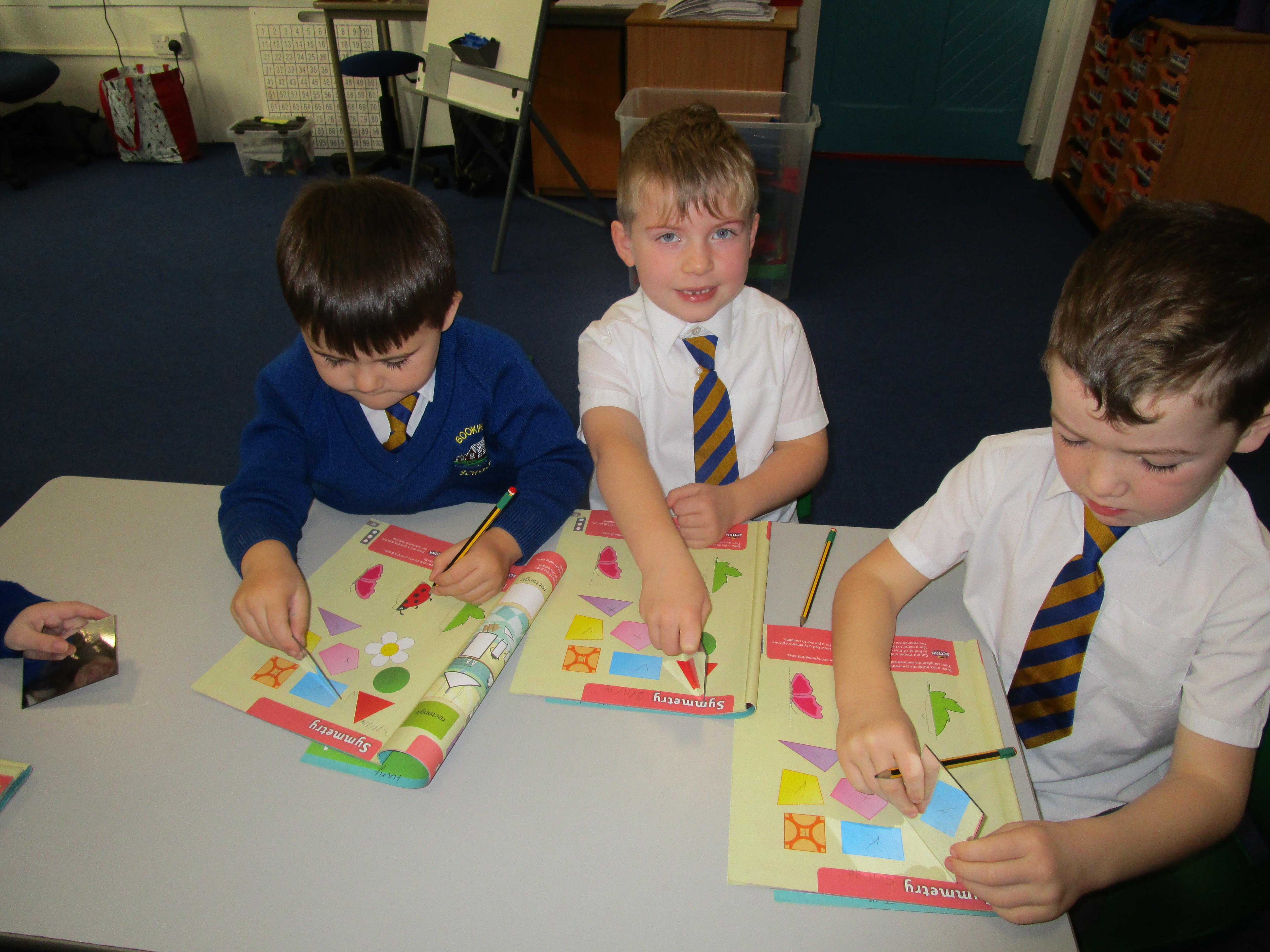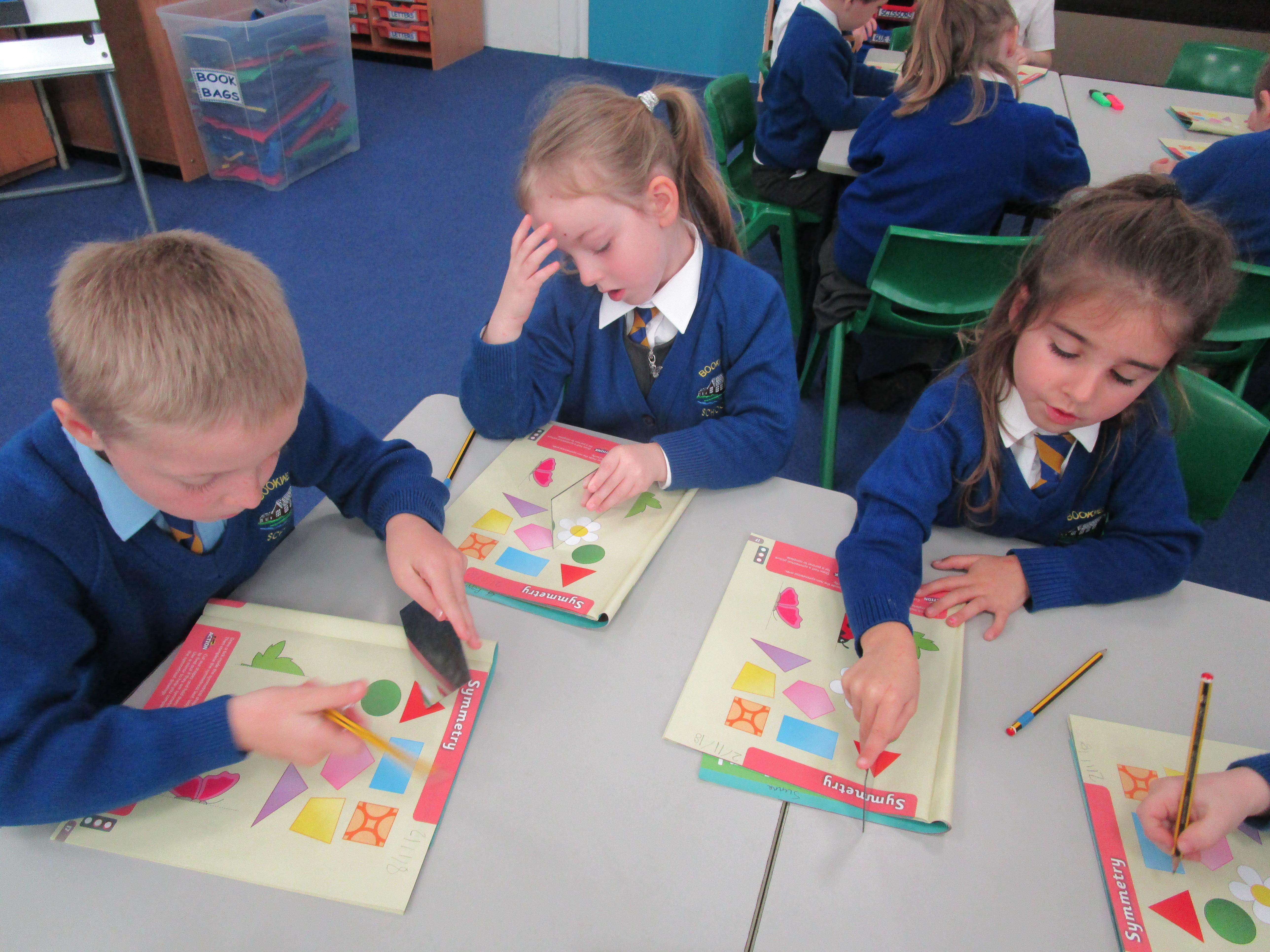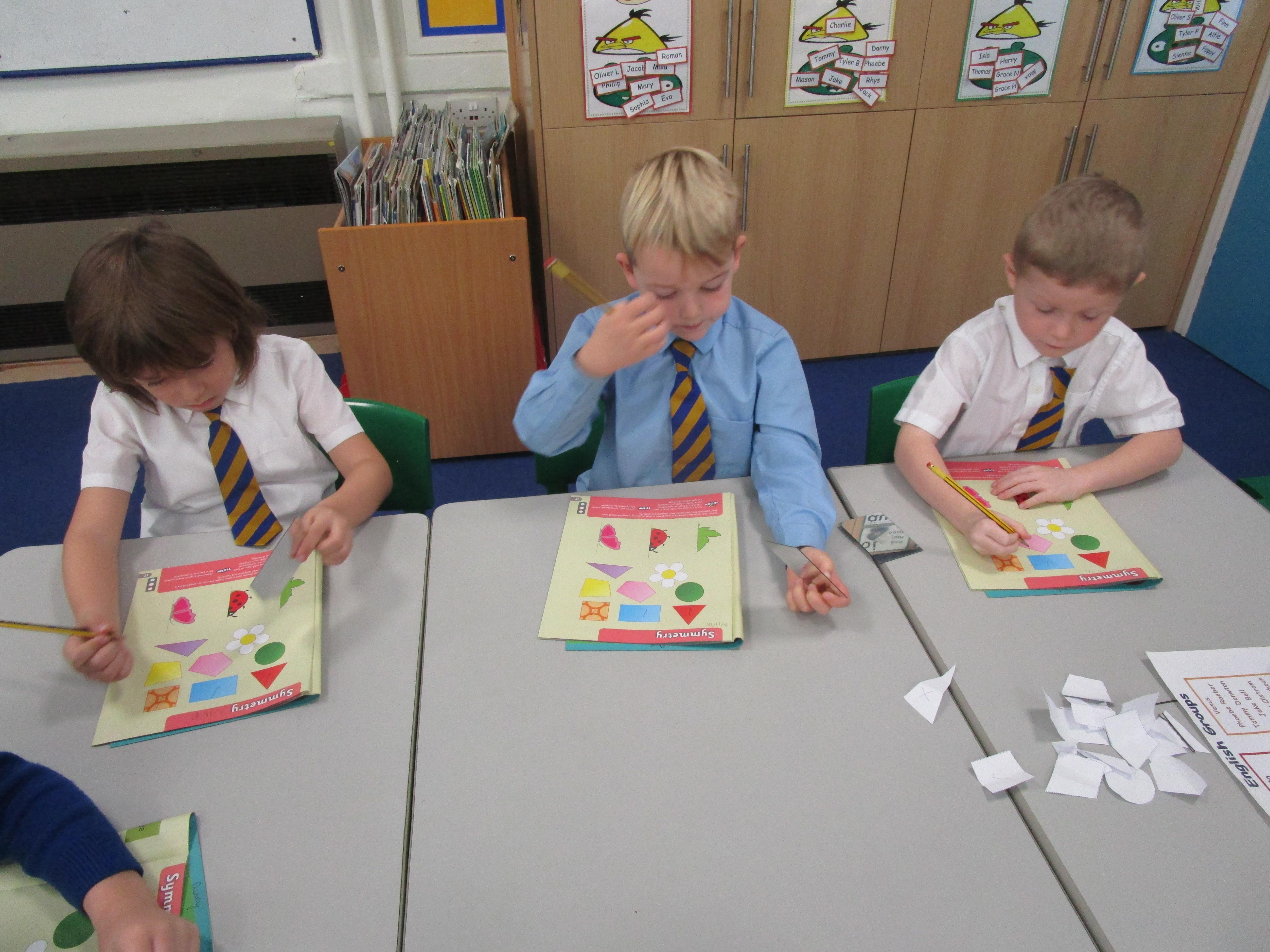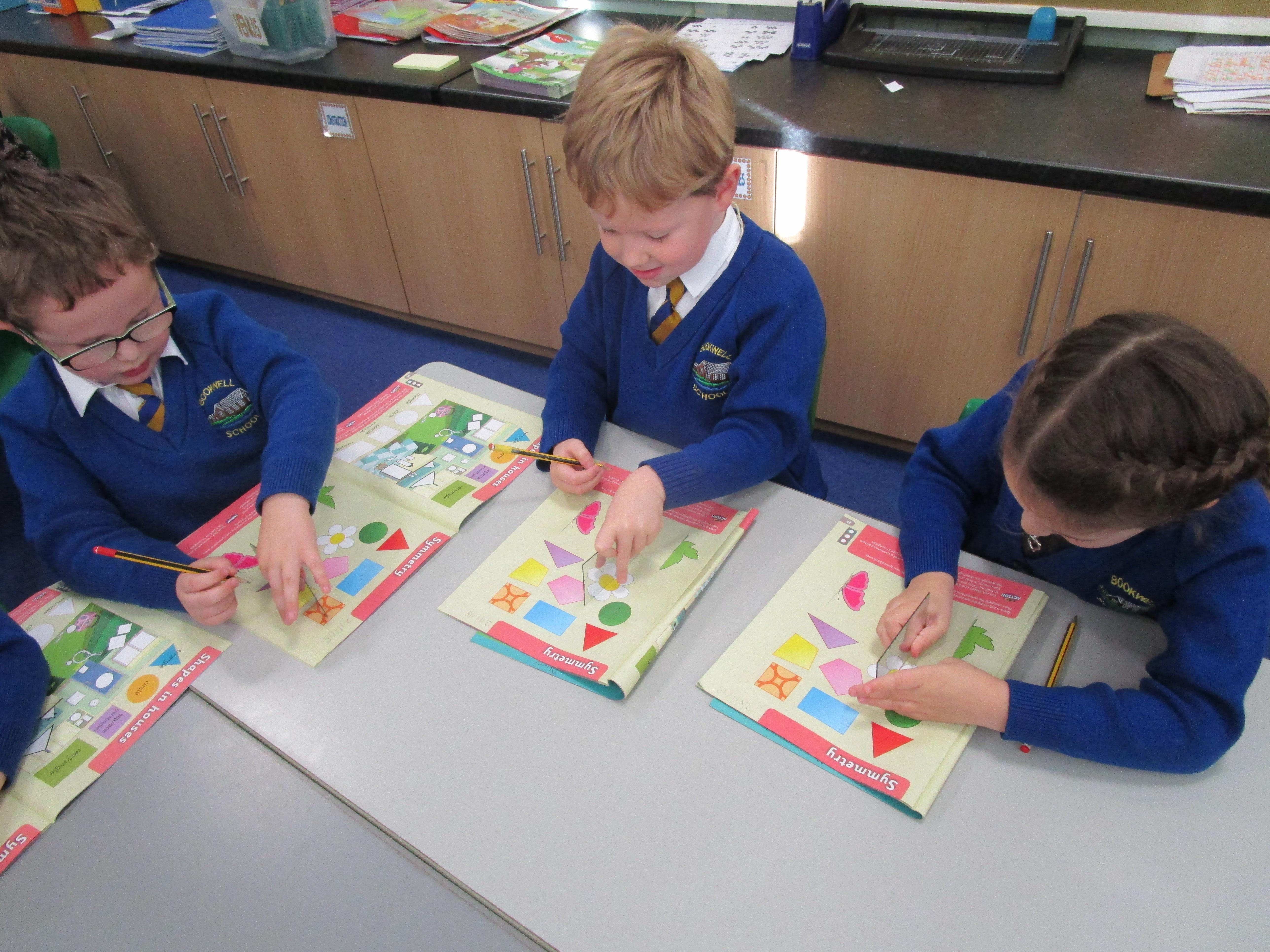 Today the children have been working with Mrs Borewell exploring symmetry. First they had to fold shapes to find lines of symmetry and then they had to identify which shapes were symmetrical in their workbooks.