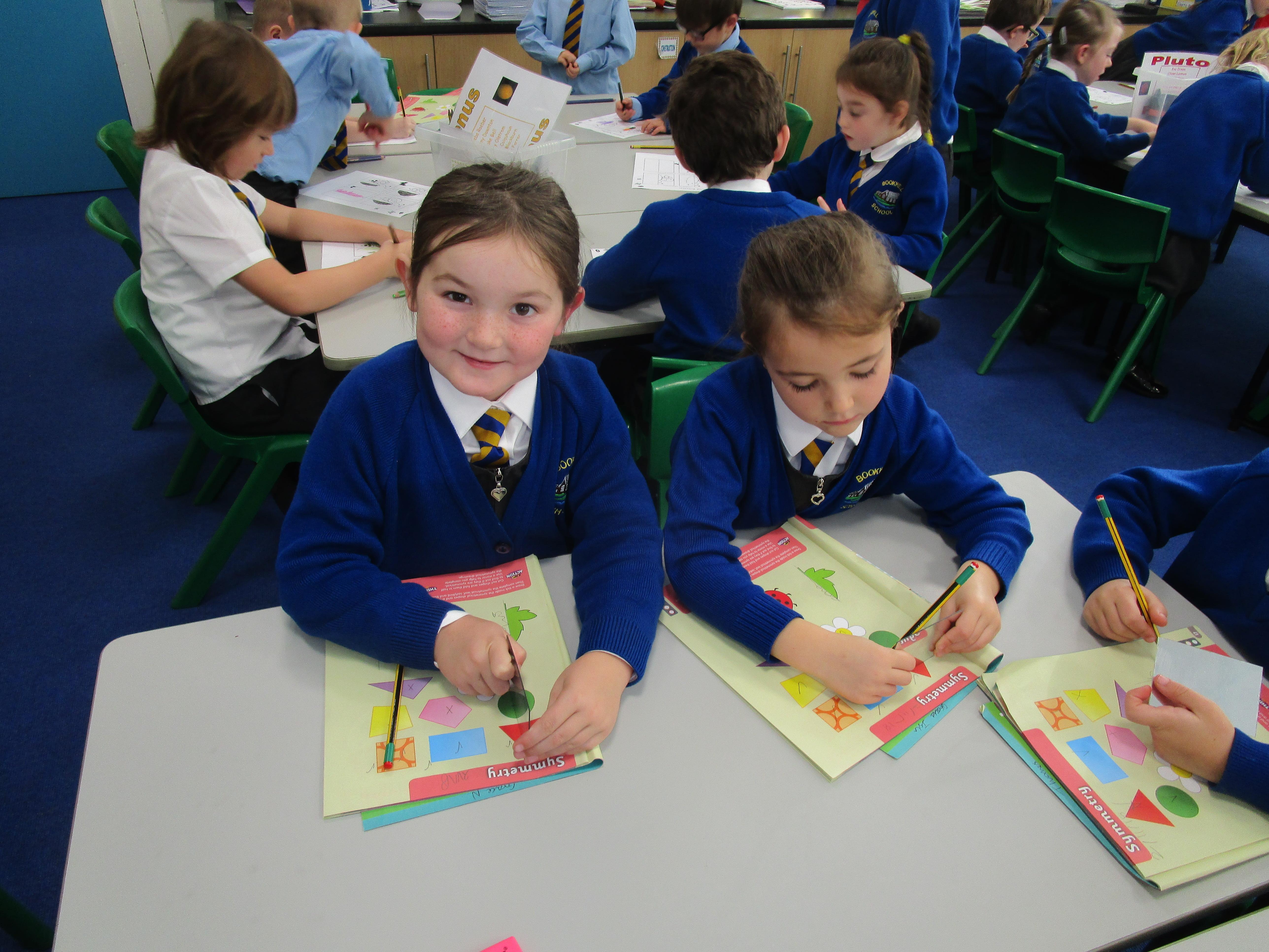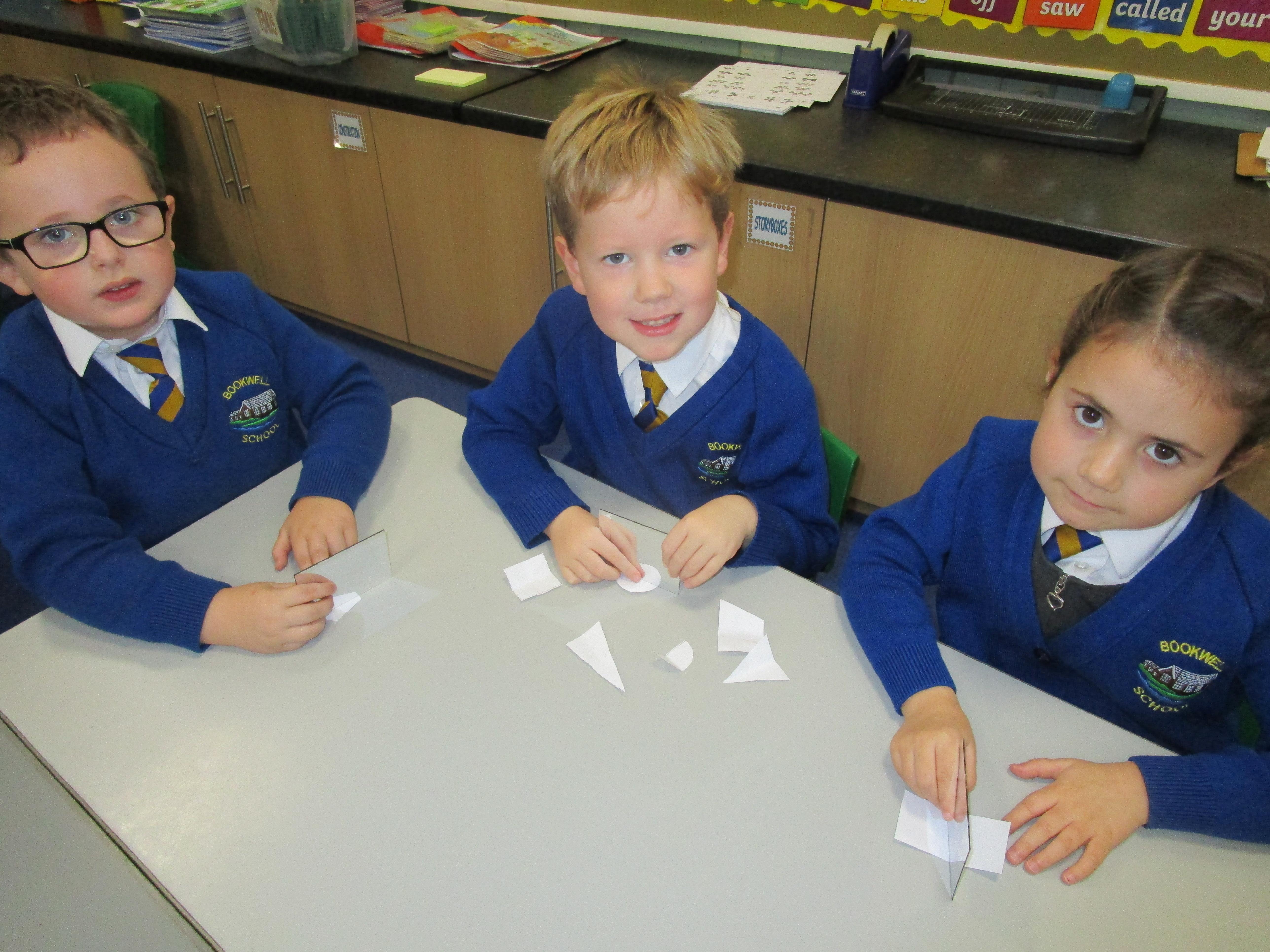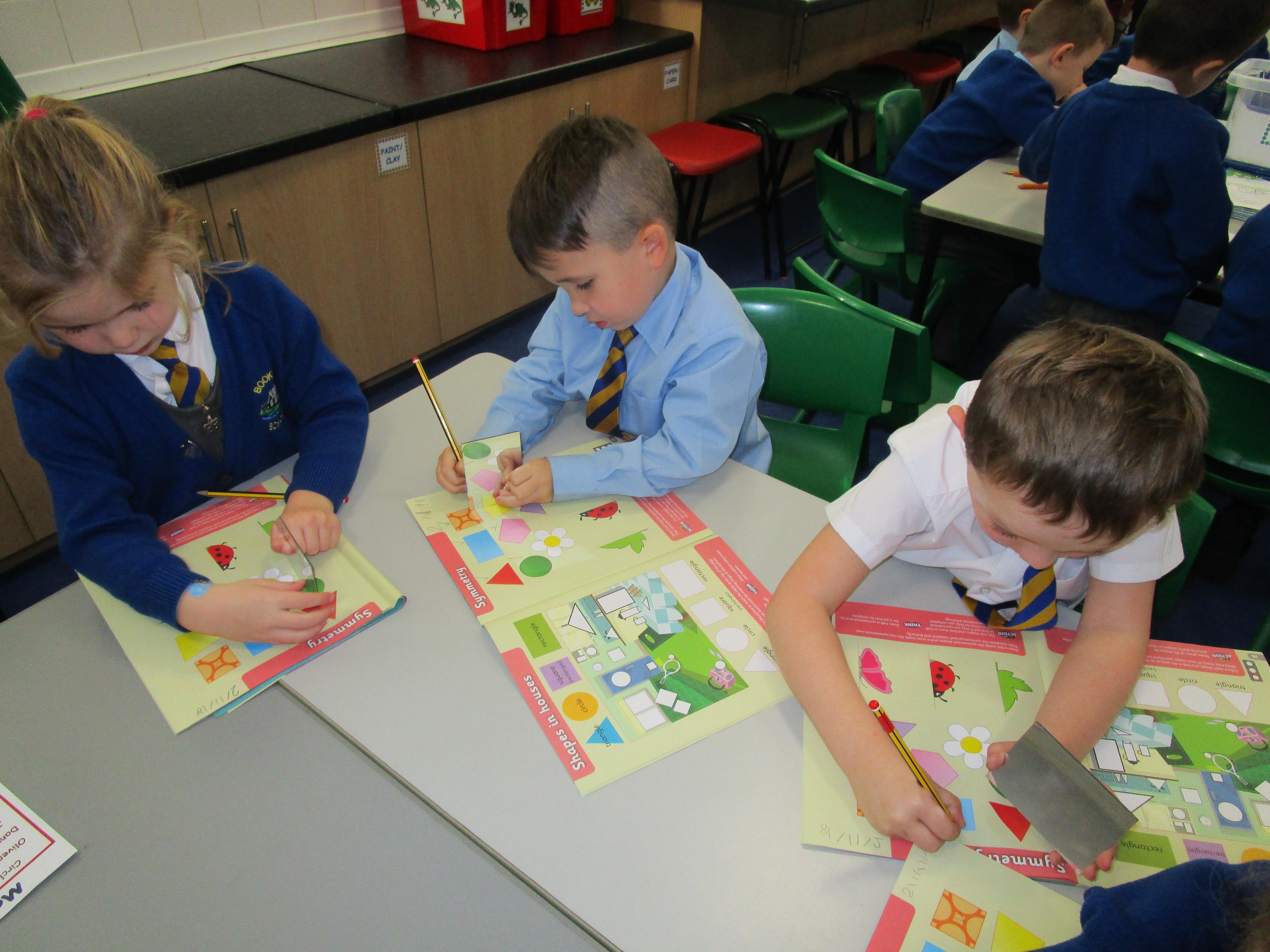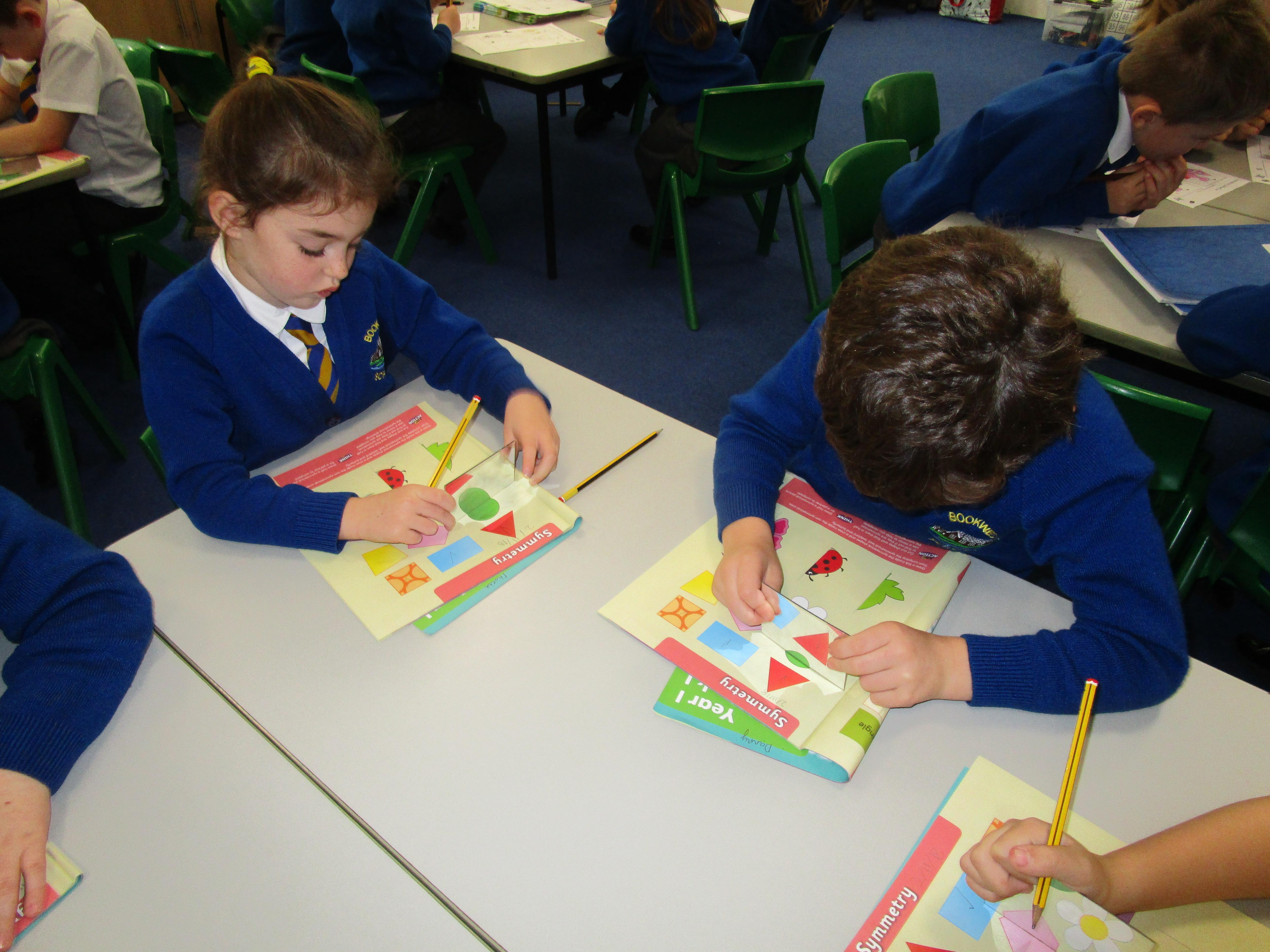 Today the children have been working with Mrs Borewell exploring symmetry. First they had to fold shapes to find lines of symmetry and then they had to identify which shapes were symmetrical in their workbooks.