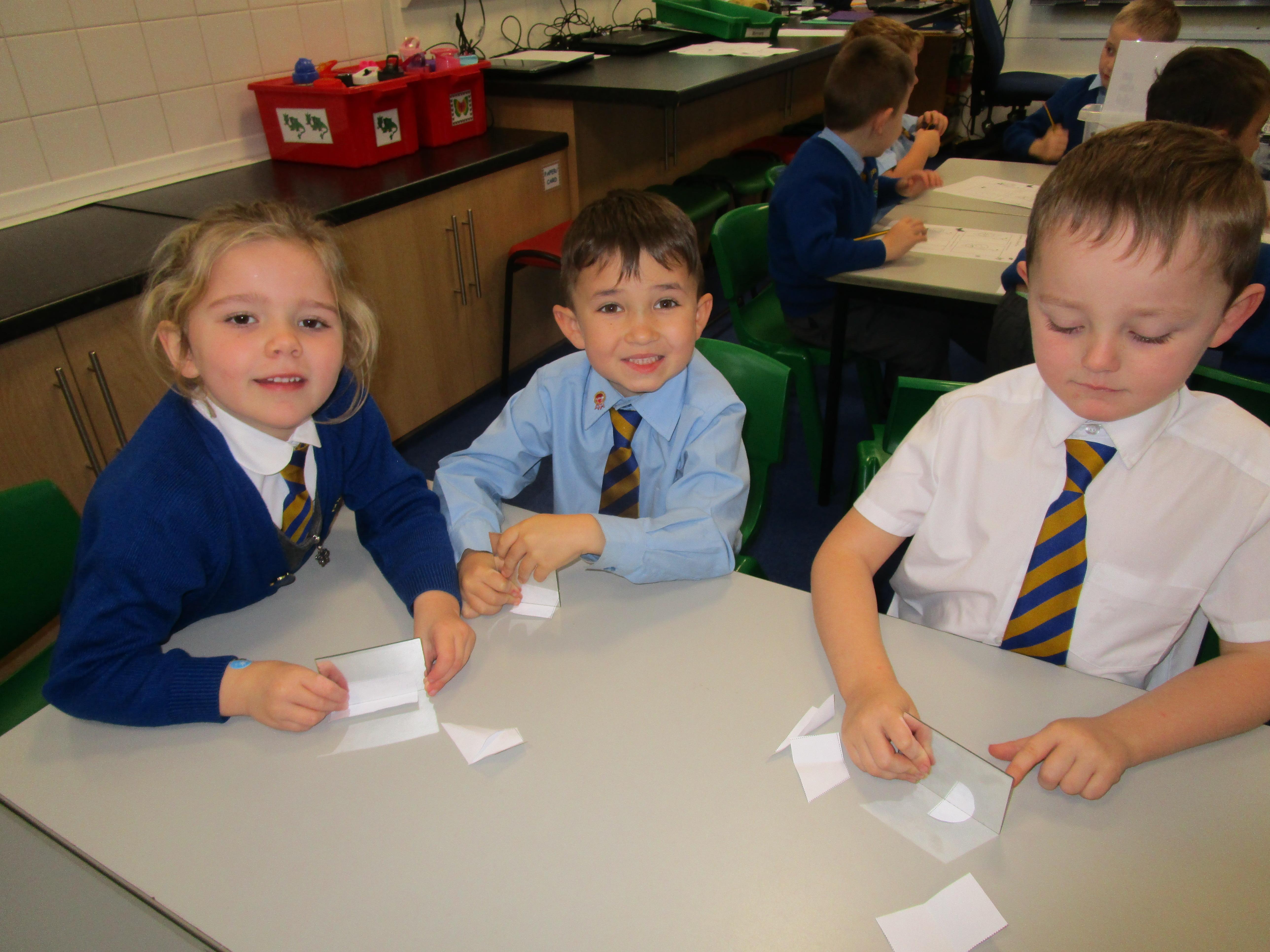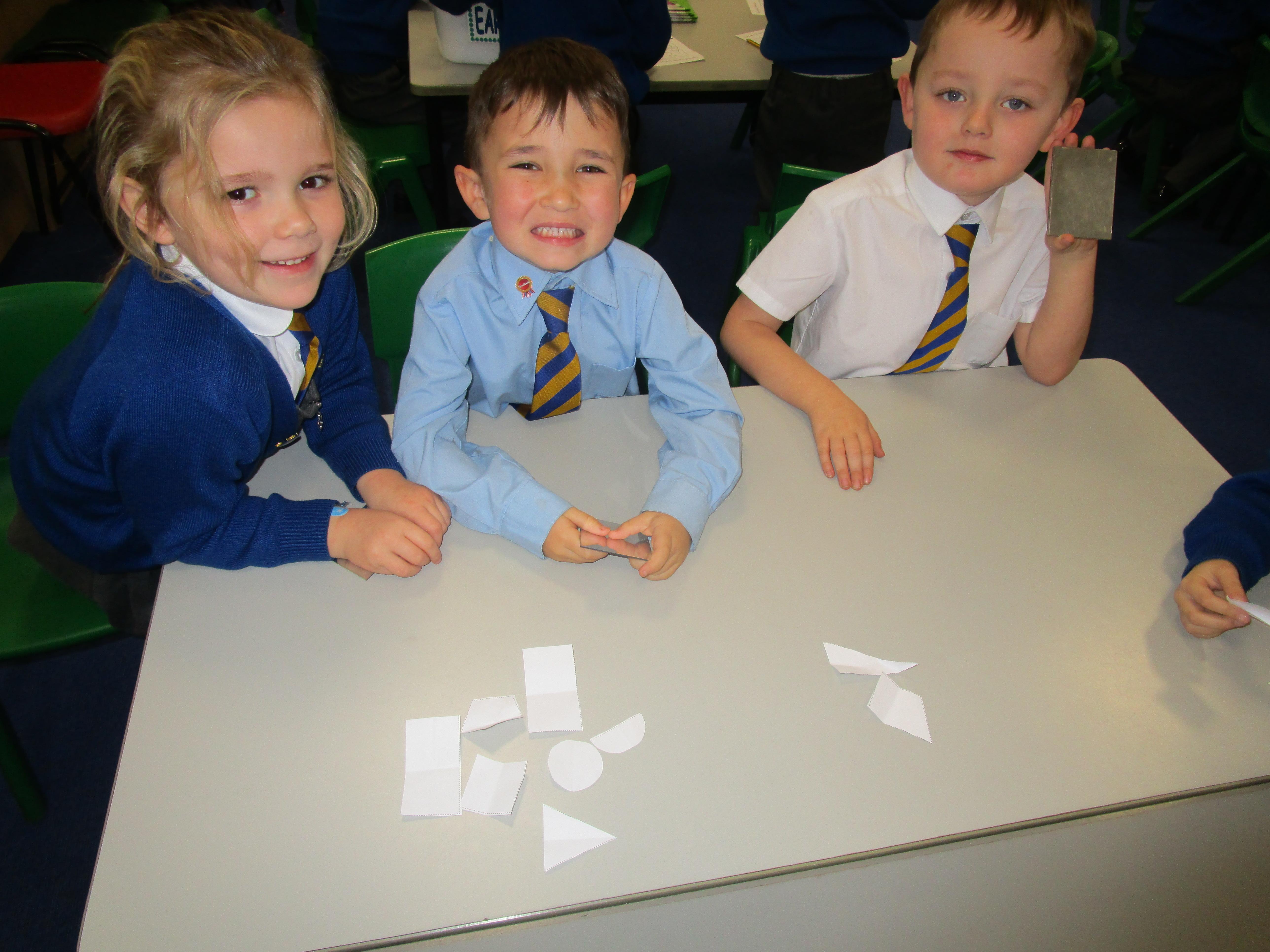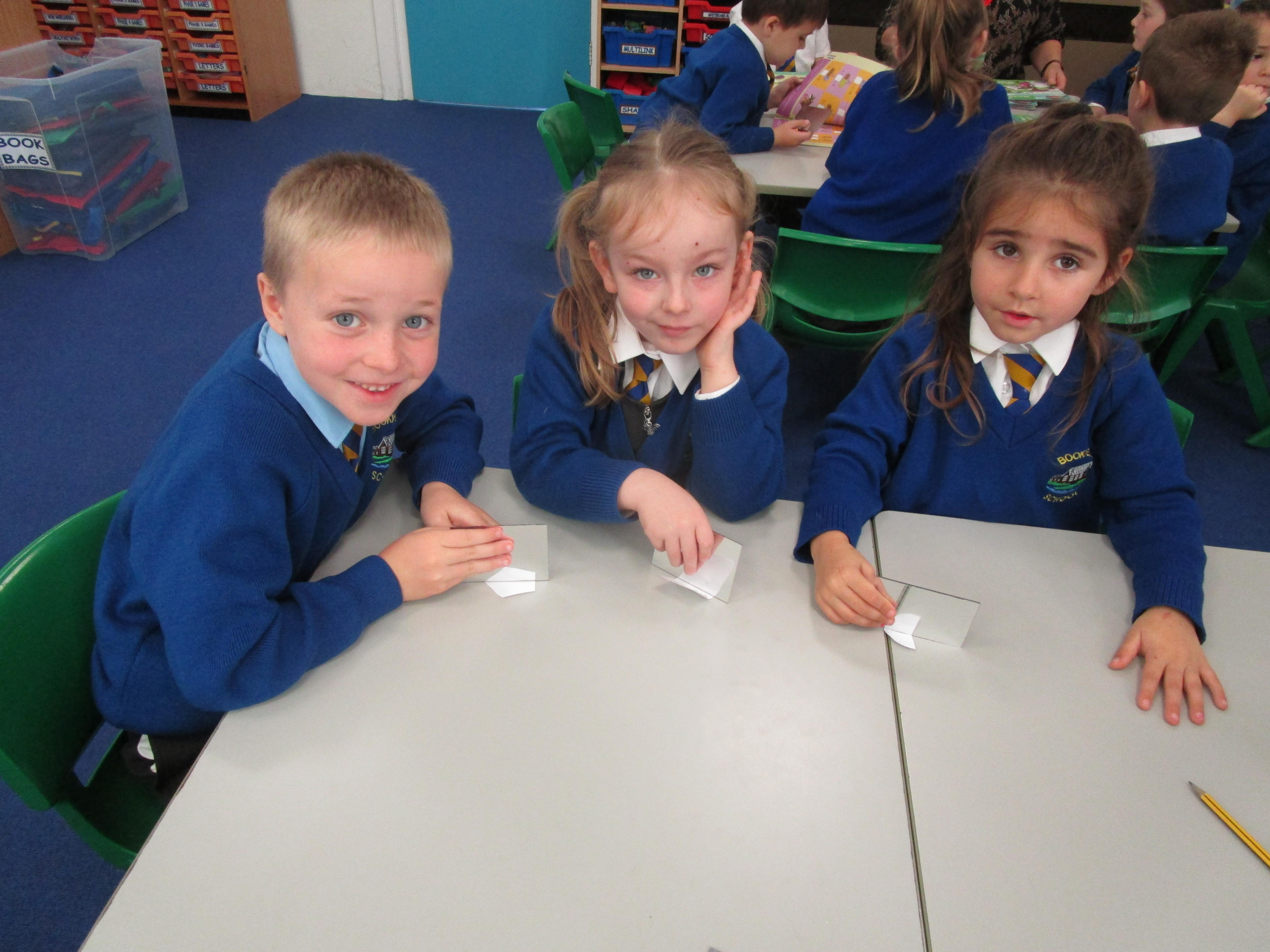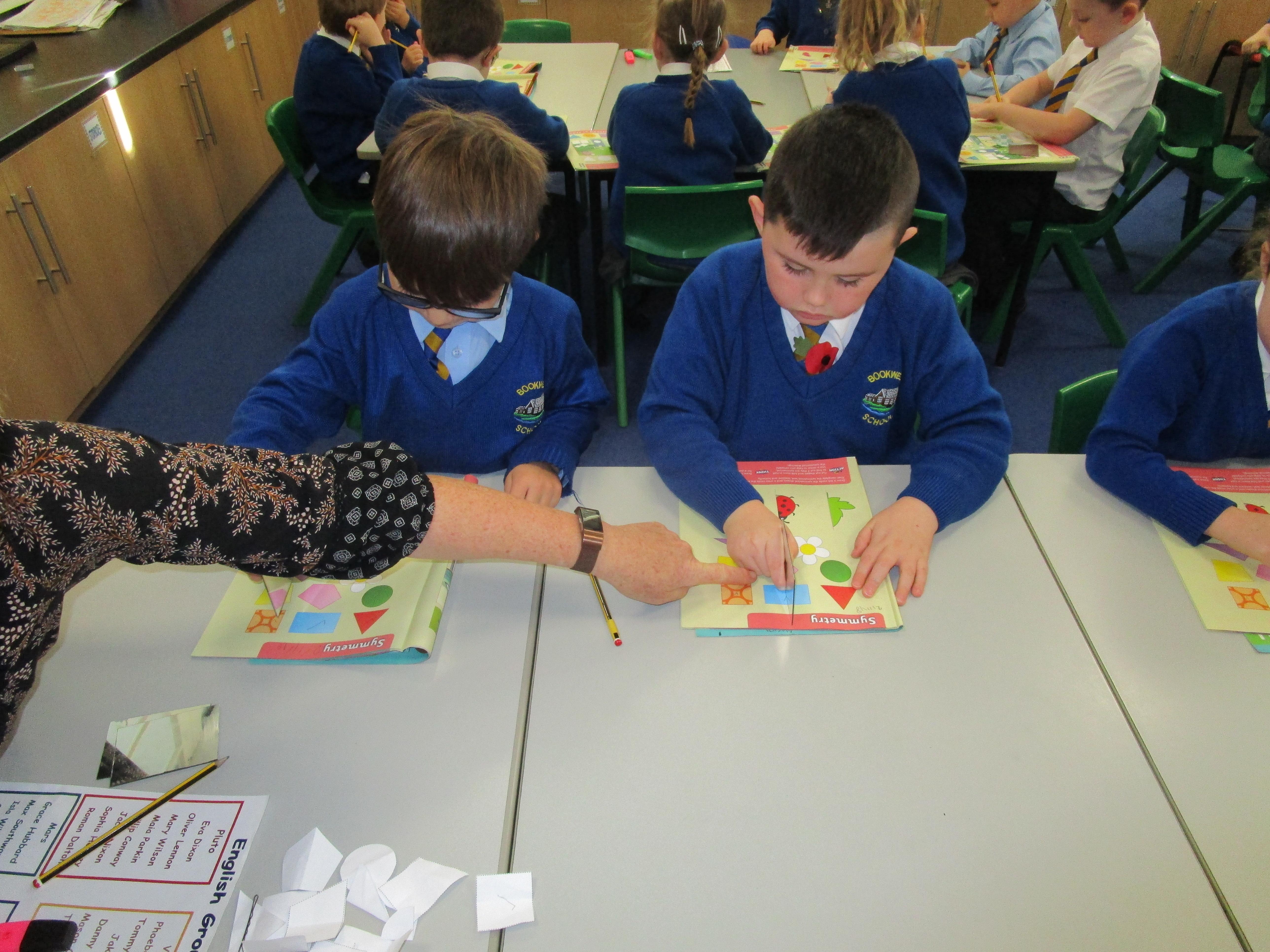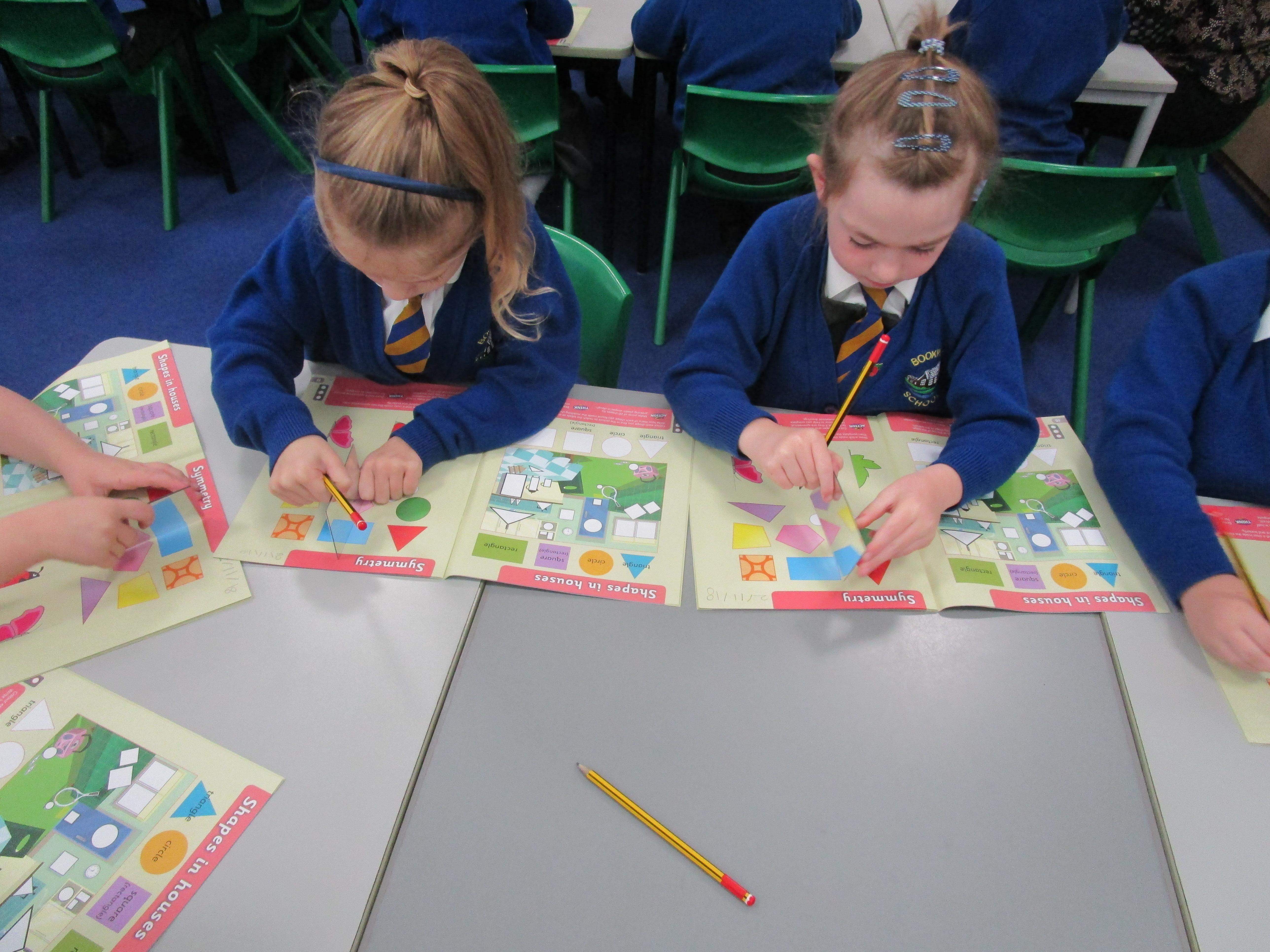 Today the children have been working with Mrs Borewell exploring symmetry. First they had to fold shapes to find lines of symmetry and then they had to identify which shapes were symmetrical in their workbooks.
