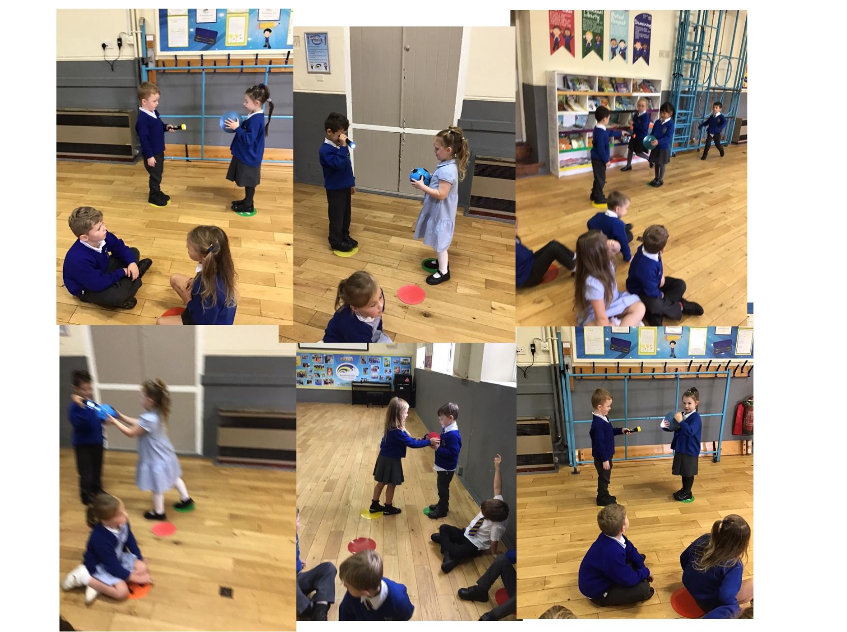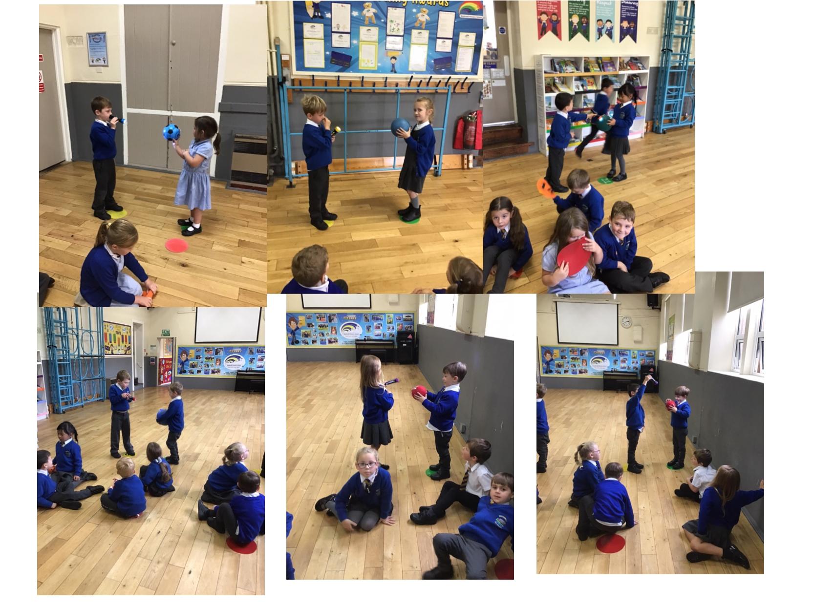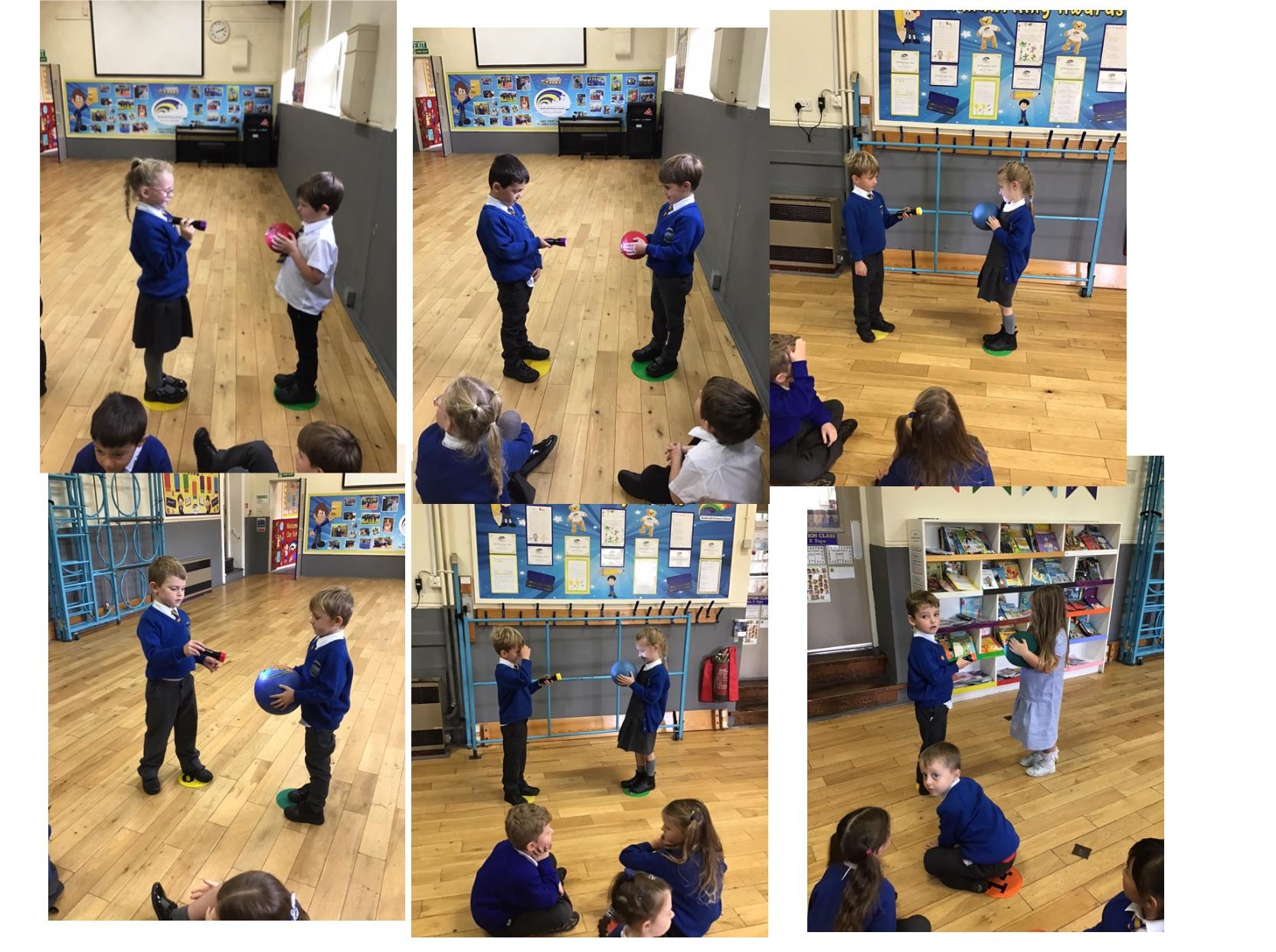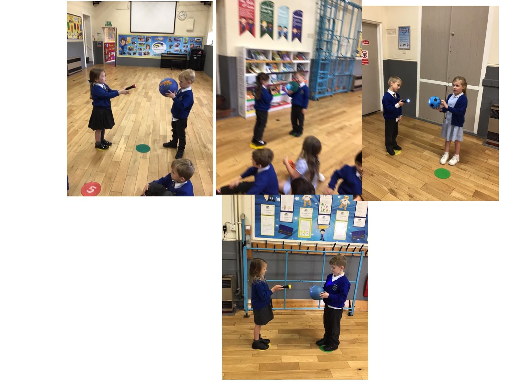 We have been learning about day and night. We used torches for the sun and balls to represent the Earth . In pairs we demonstrated how the Earth rotates on its axis to face the sun during the day and away from the sun at night.
