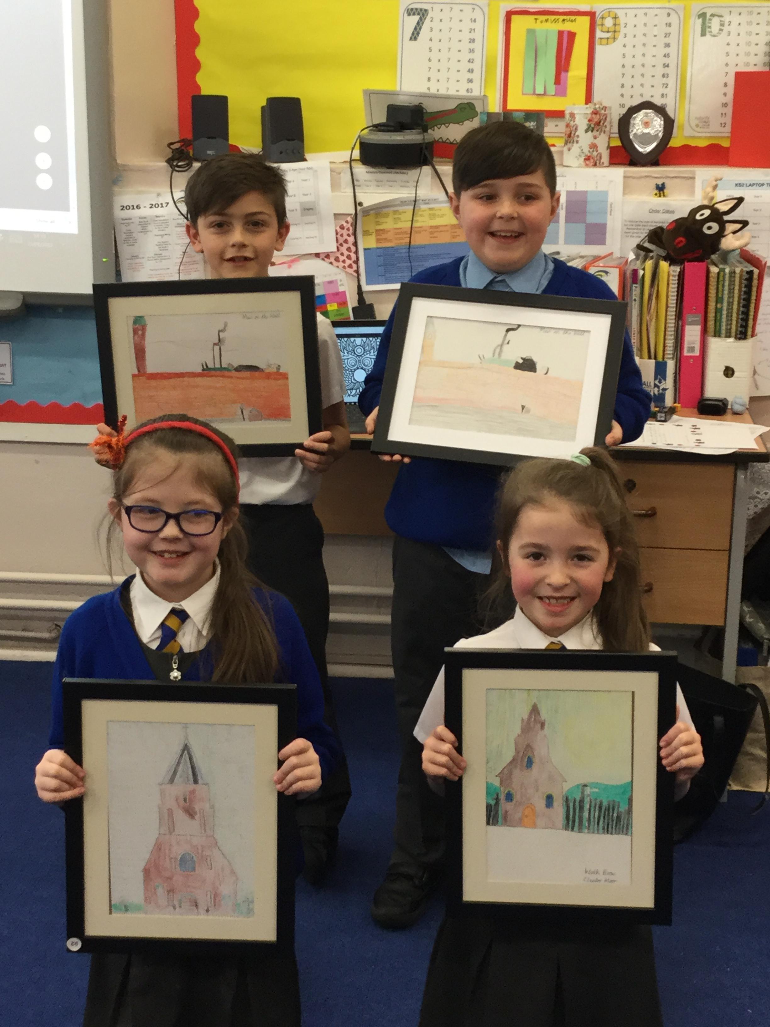 Well done to Joe, Casson, Chloe and Ruby on their fantastic drawings inspired by the works of L.S Lowry's 'Man on the Wall' and 'Wath Brow' church. Their pictures, along with others in school will be on display at the Lowes Court Gallery, so go and pay a visit!