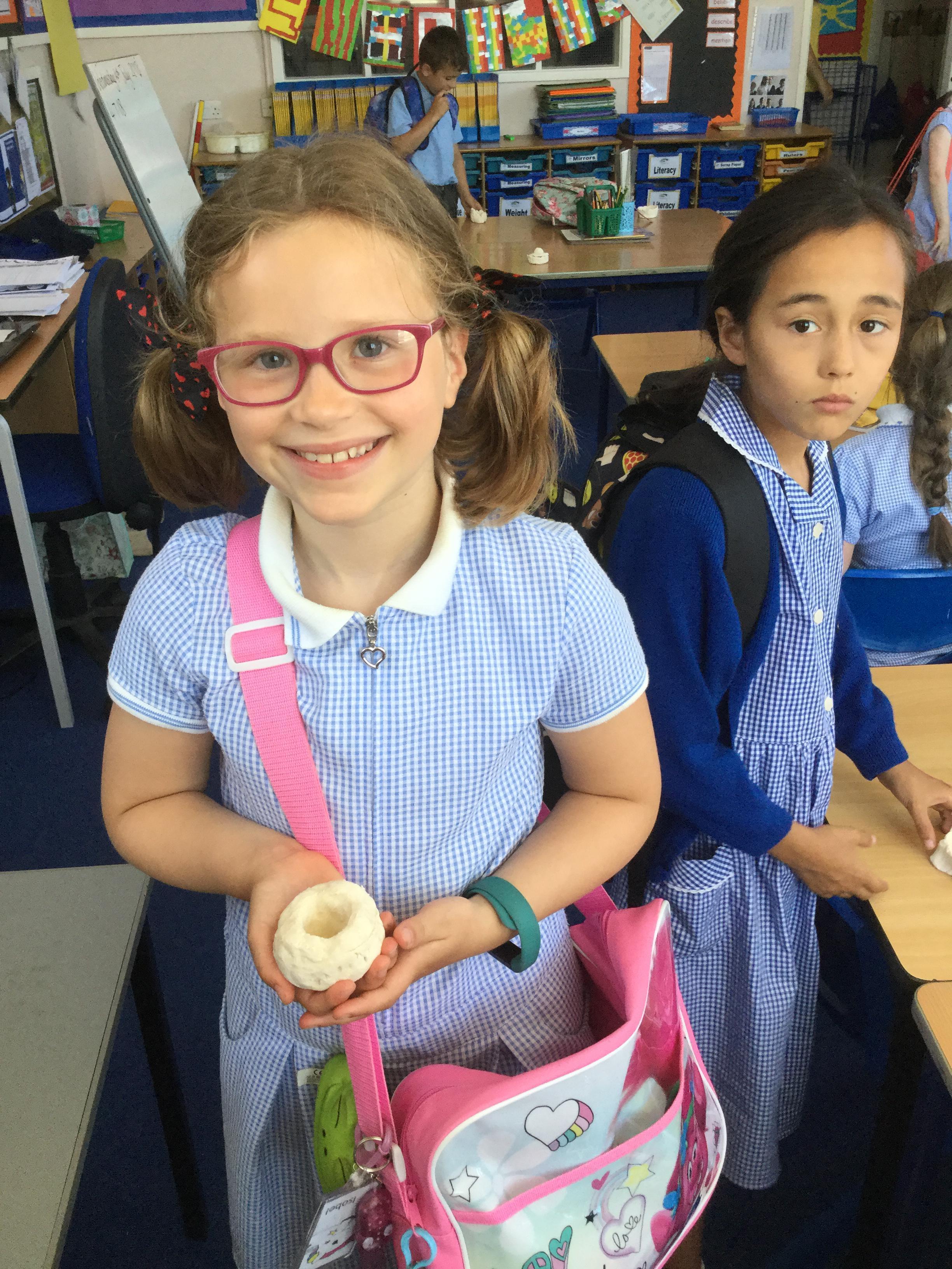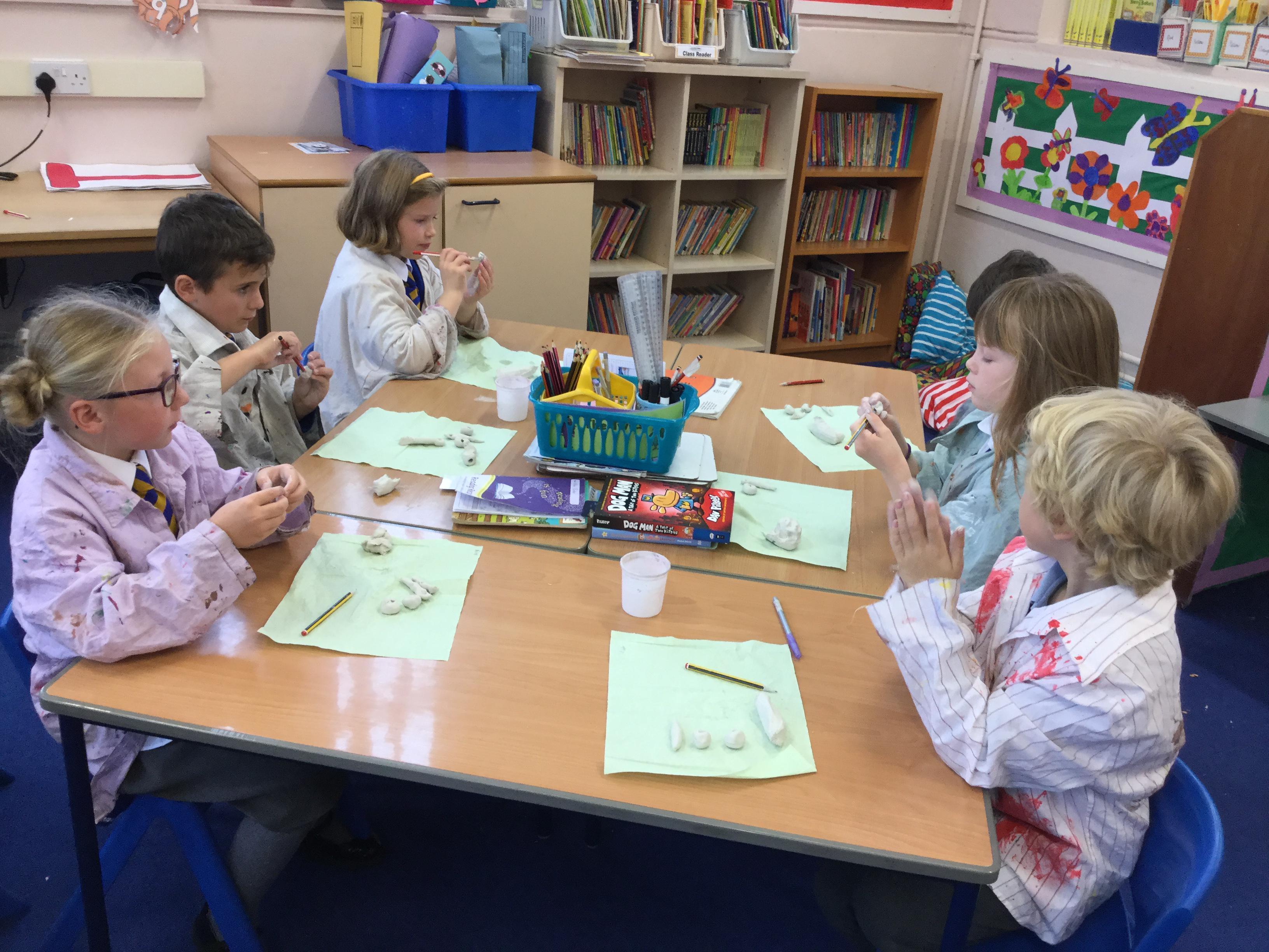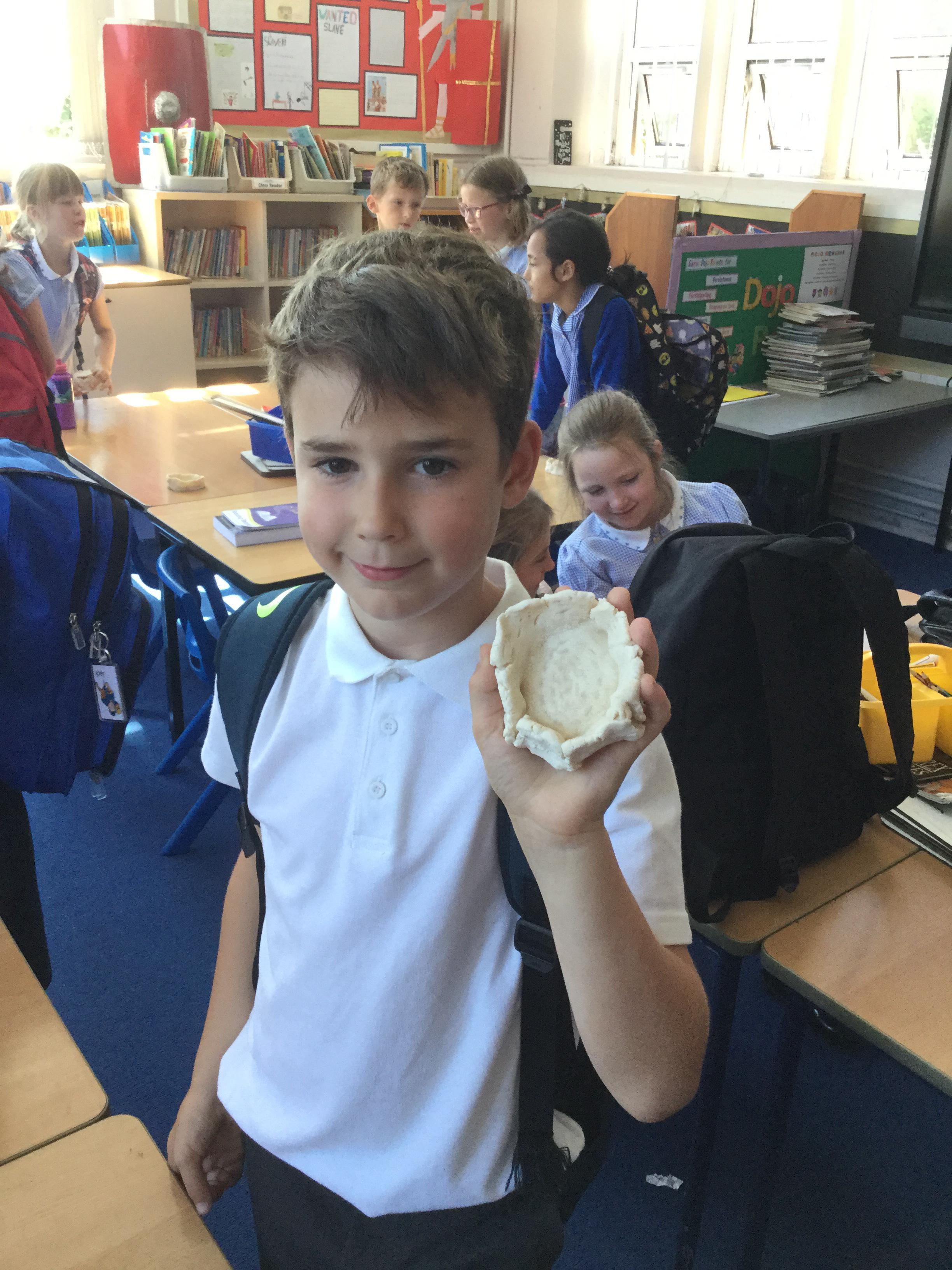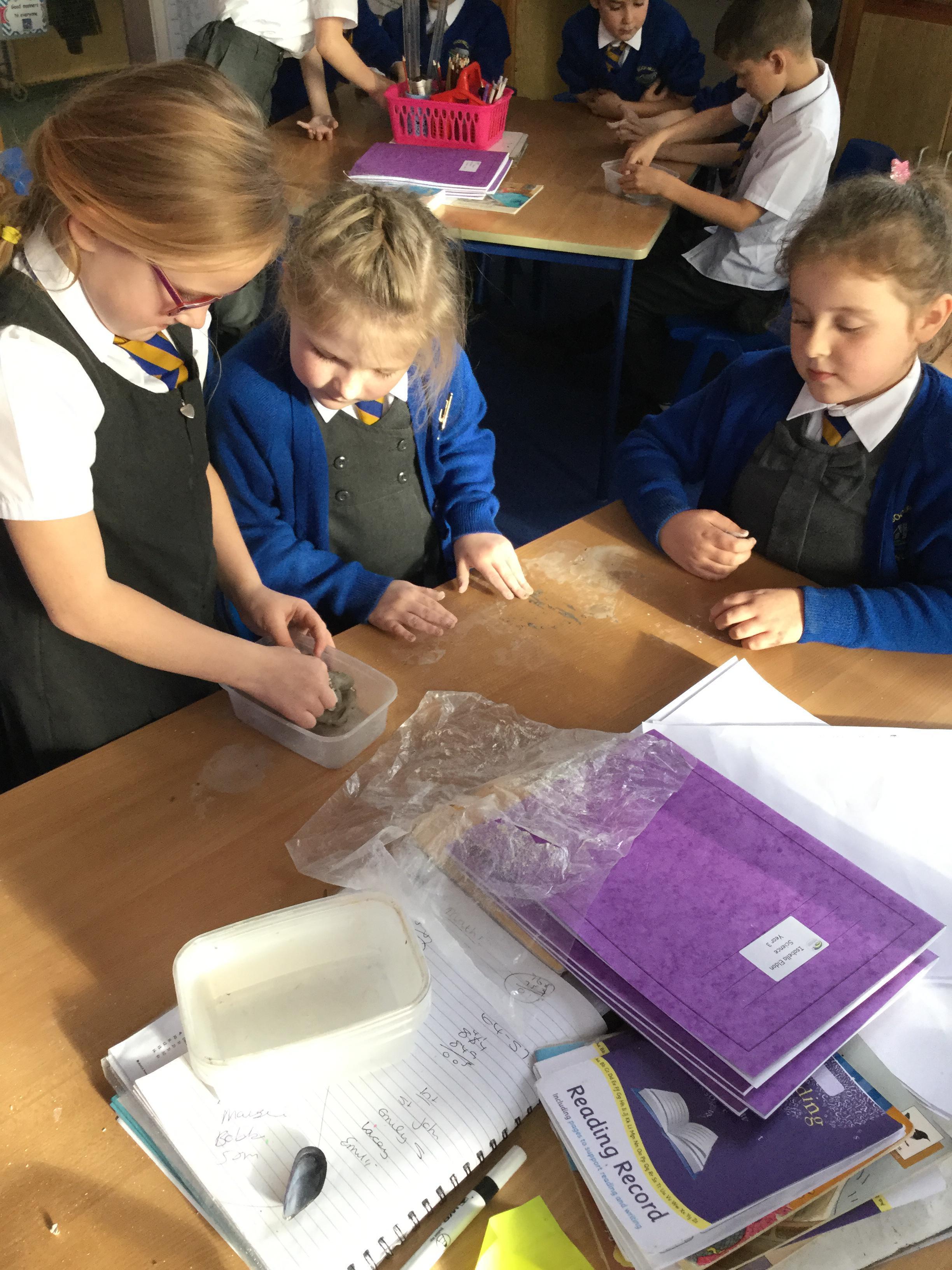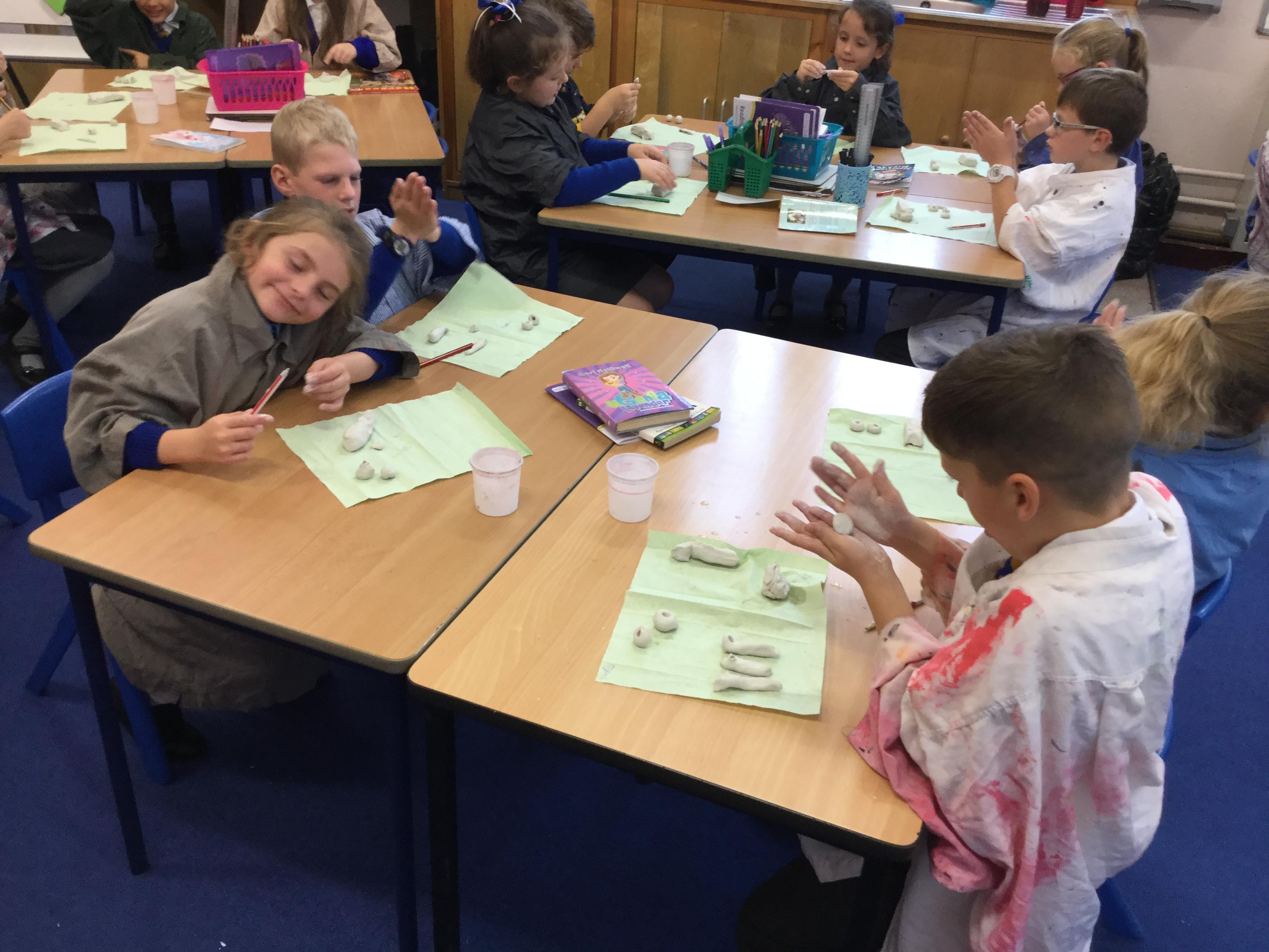 As part of our Stone Age learning we made clay necklaces. We understand that jewellery was found on the site of Skara Brae. The villagers that lived during this period would have made jewellery from animal bones and tusks.