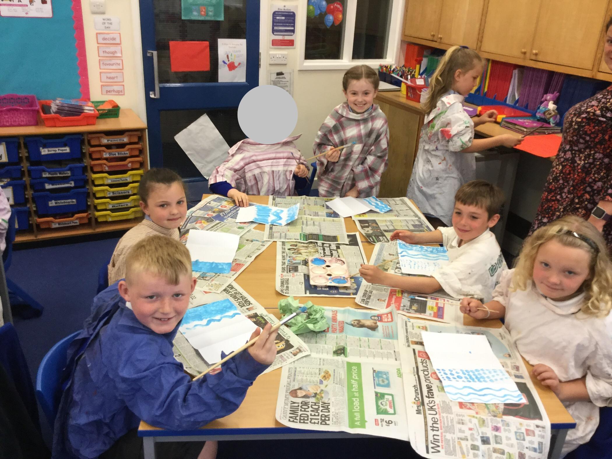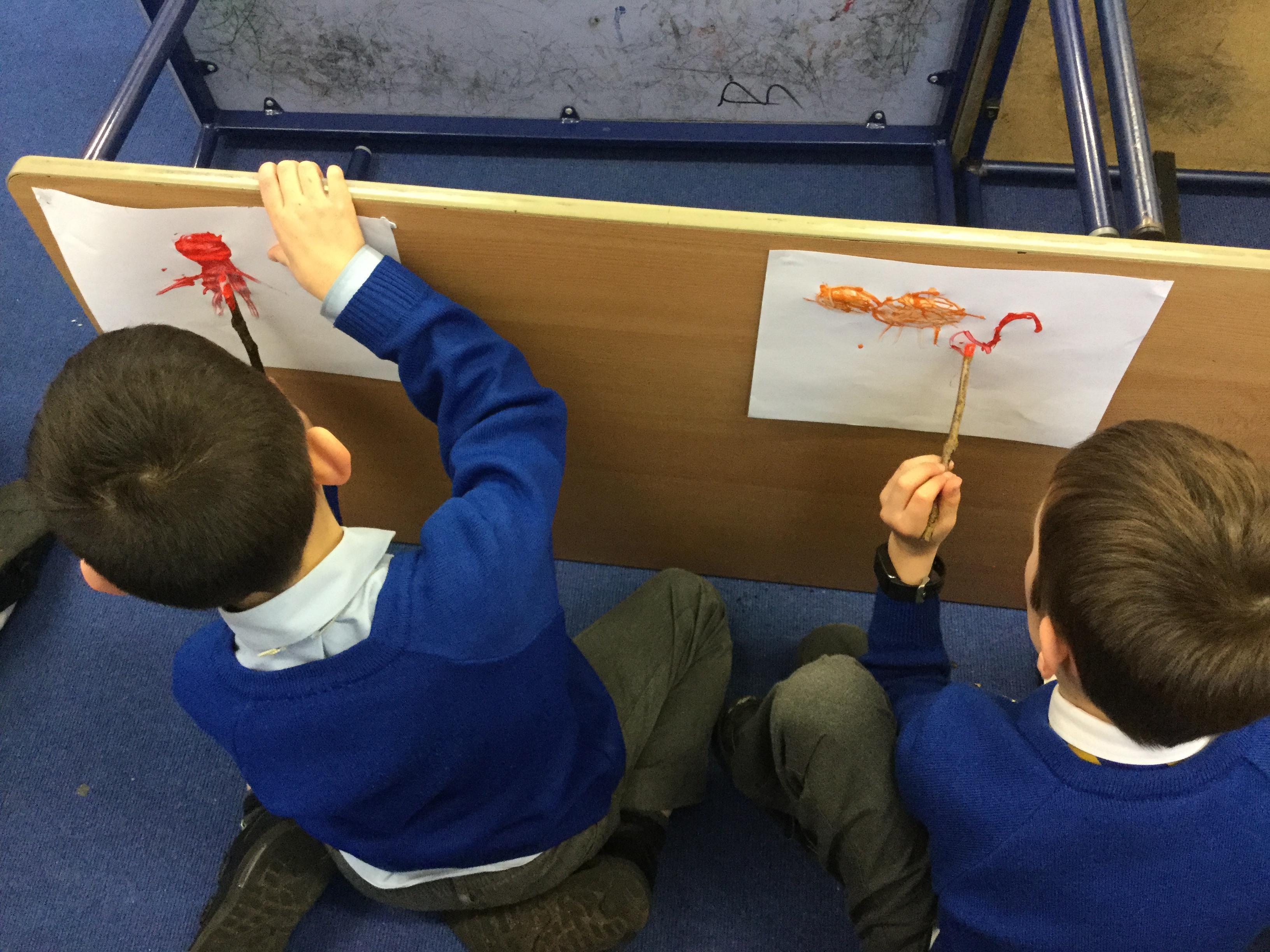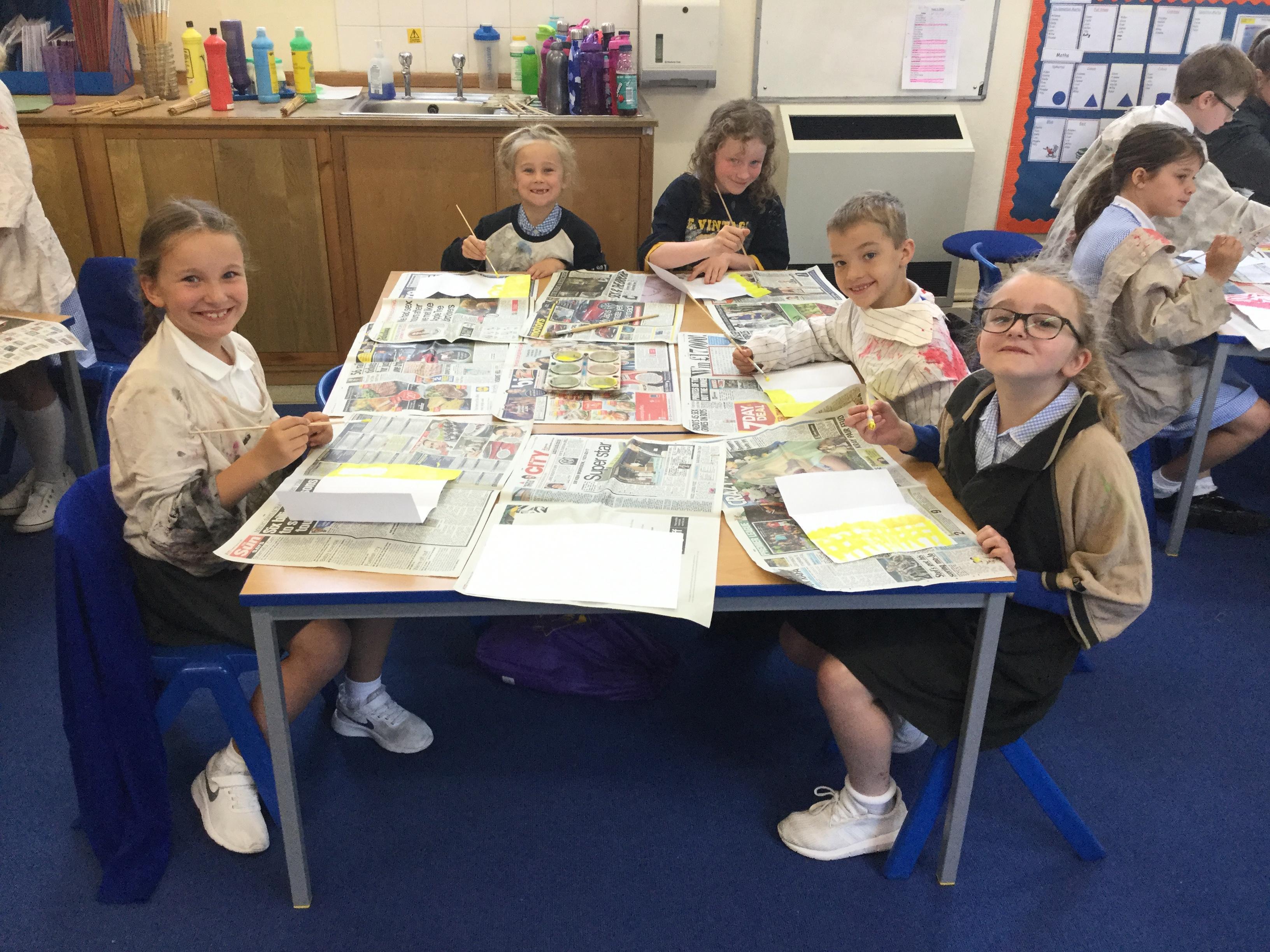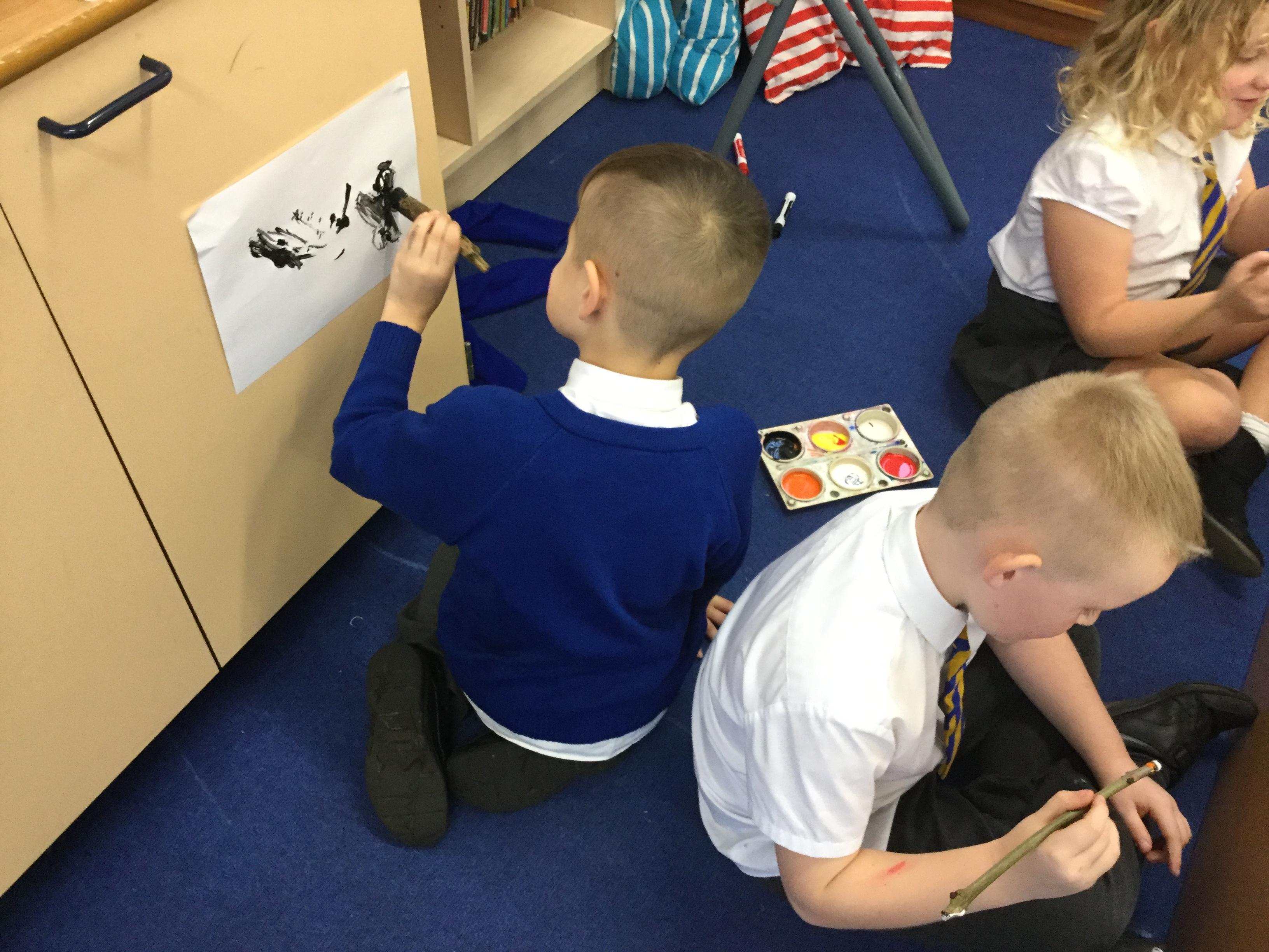 We studied 'The Starry Night' by Vincent Van Gogh, paying particular attention to the brush strokes. We then explored different brush strokes using a range of brush sizes and ways to apply it to the paper.