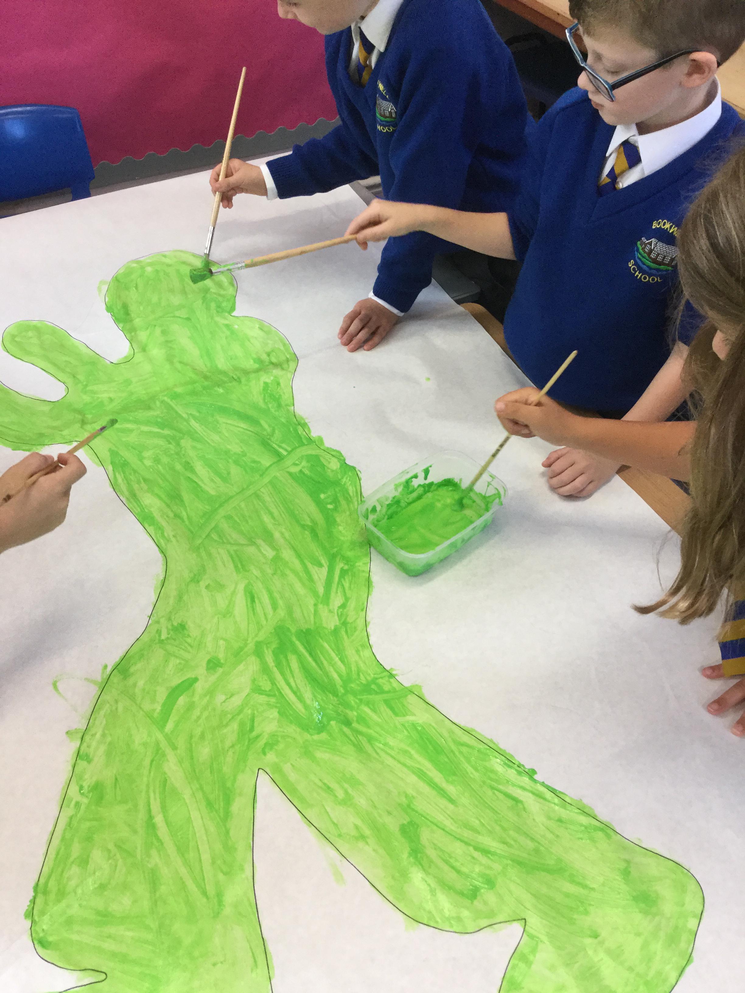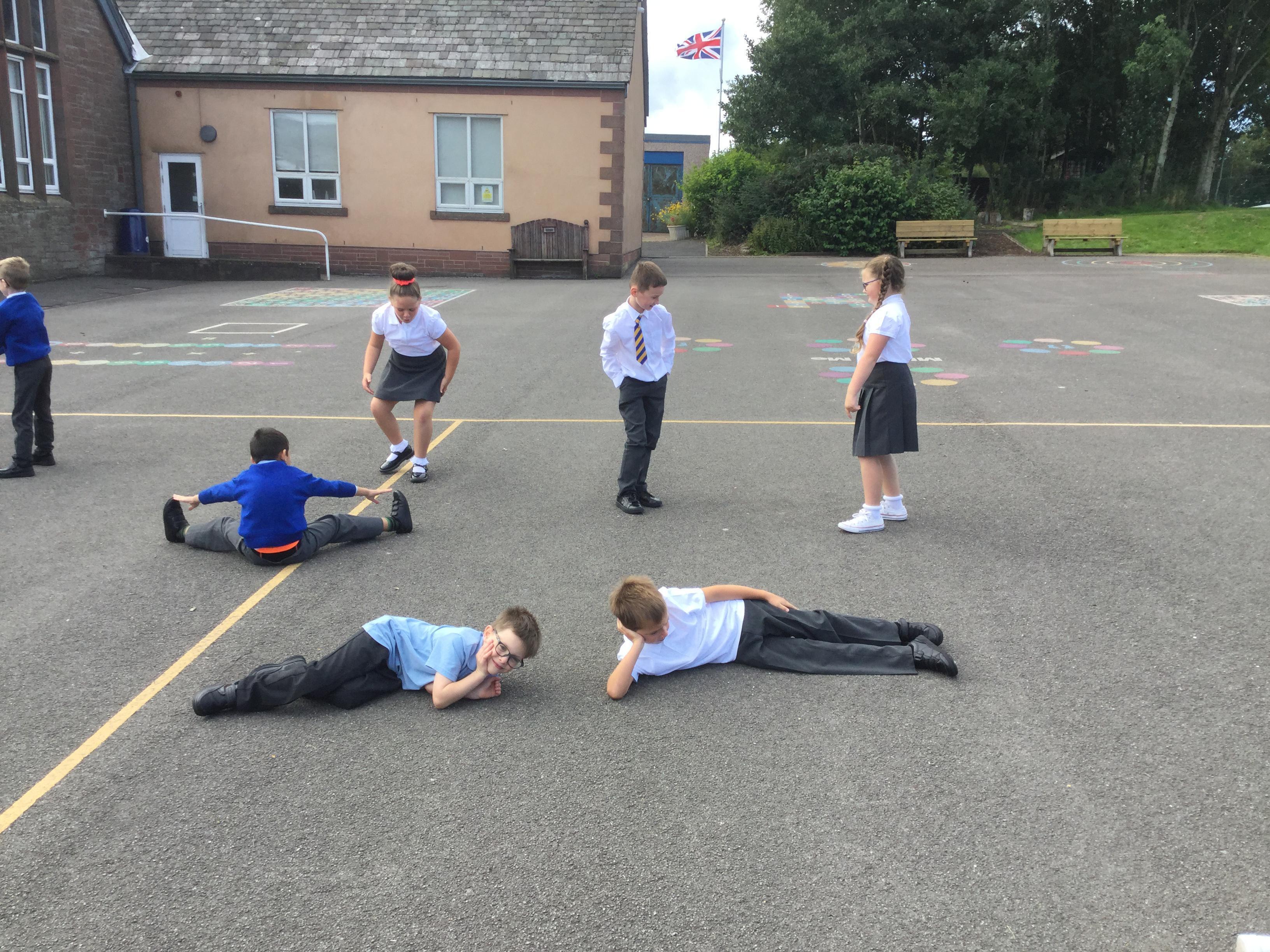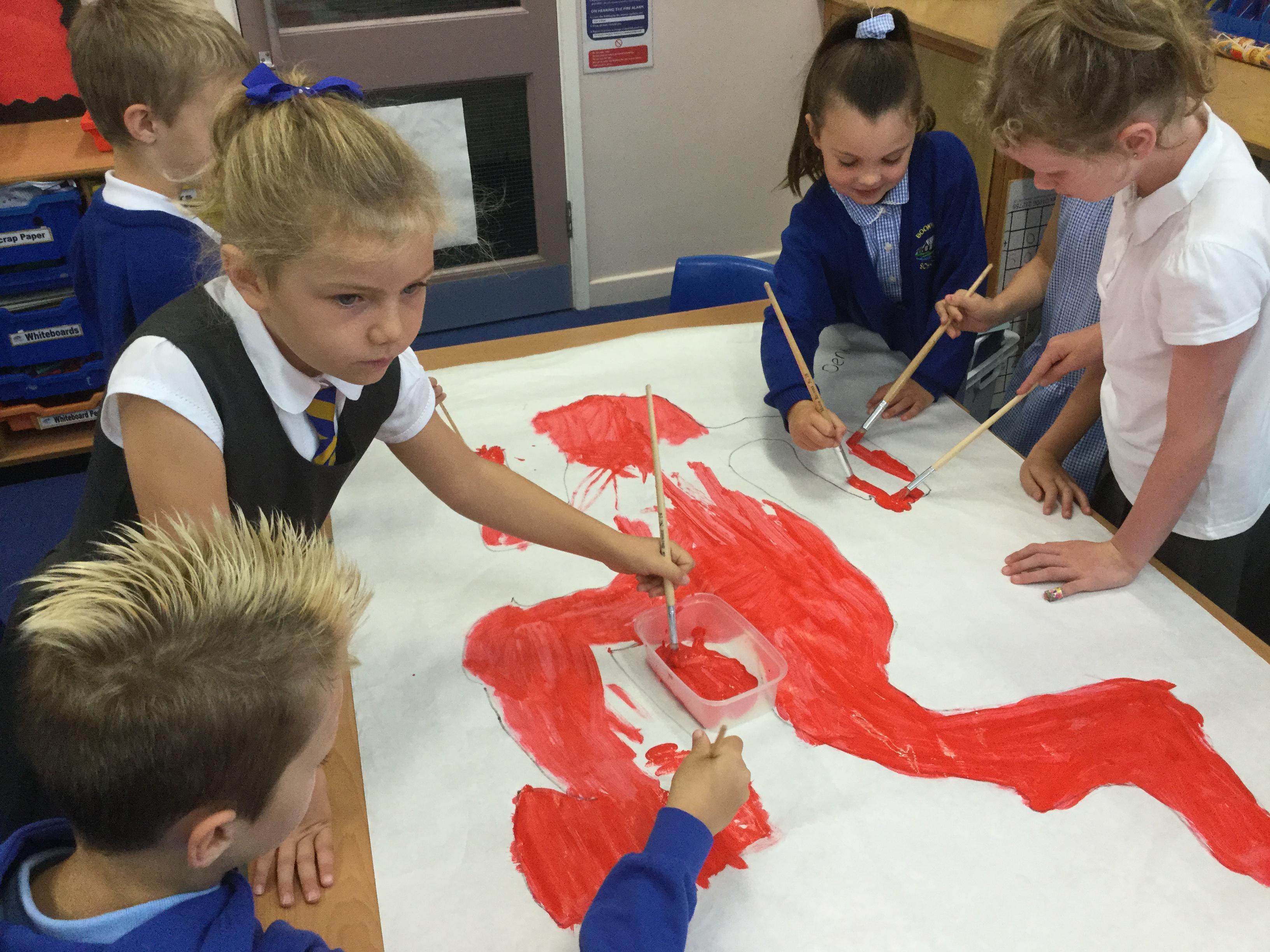 We have been learning about pop art during our first week back. It is bright, colourful and fun art. We looked at lots of different art. Our class focused on Keith Haring who was an American pop artist. He tended to create colourful people by drawing, painting and sculpting. These people were in lots of different positions. We experimented with posing in lots of different positions like Keith's art. We then got some members of the class to lie down in these positions and we drew round them. After that, we painted and cut round the outline creating our own Keith Haring pop art.