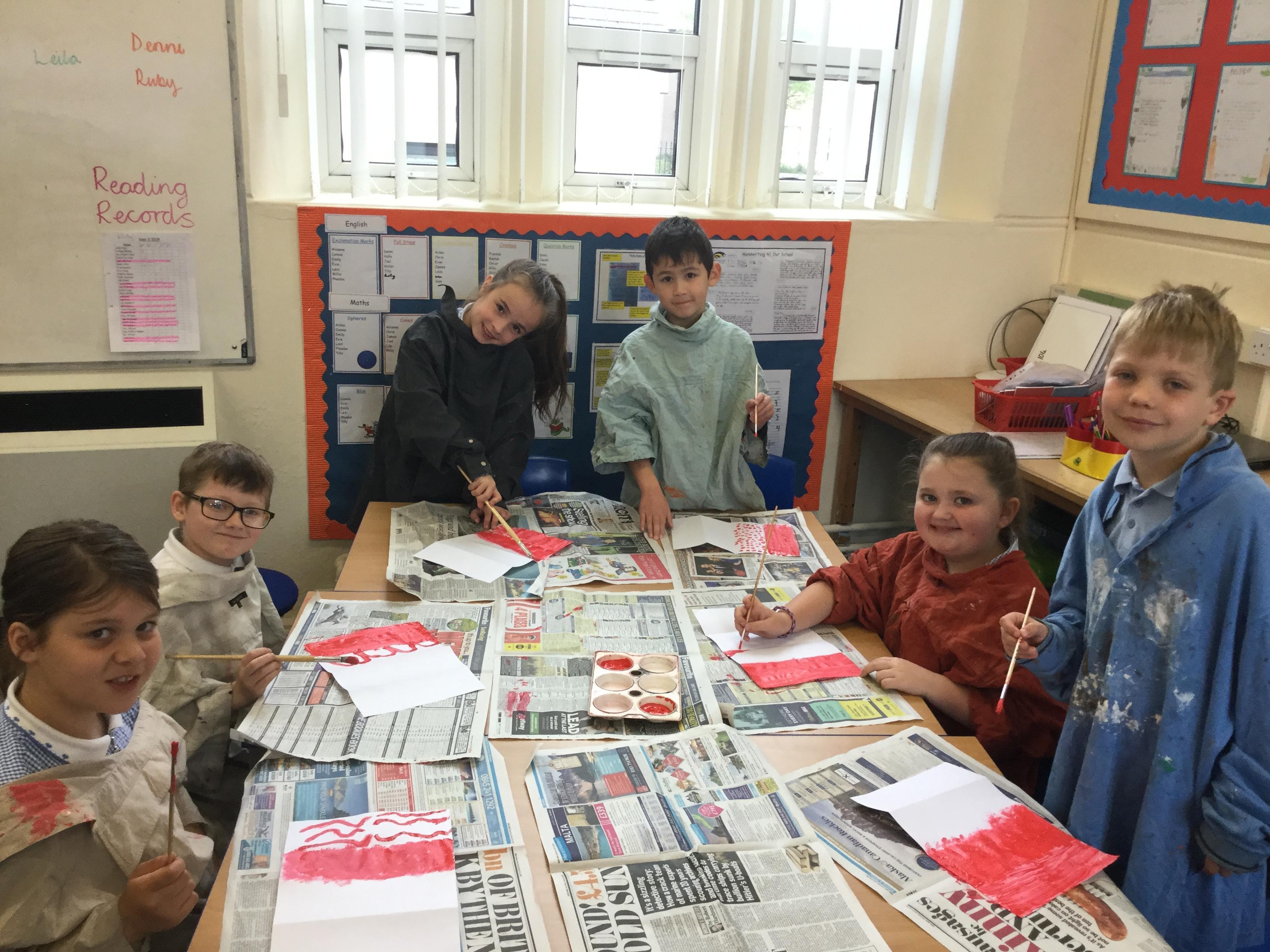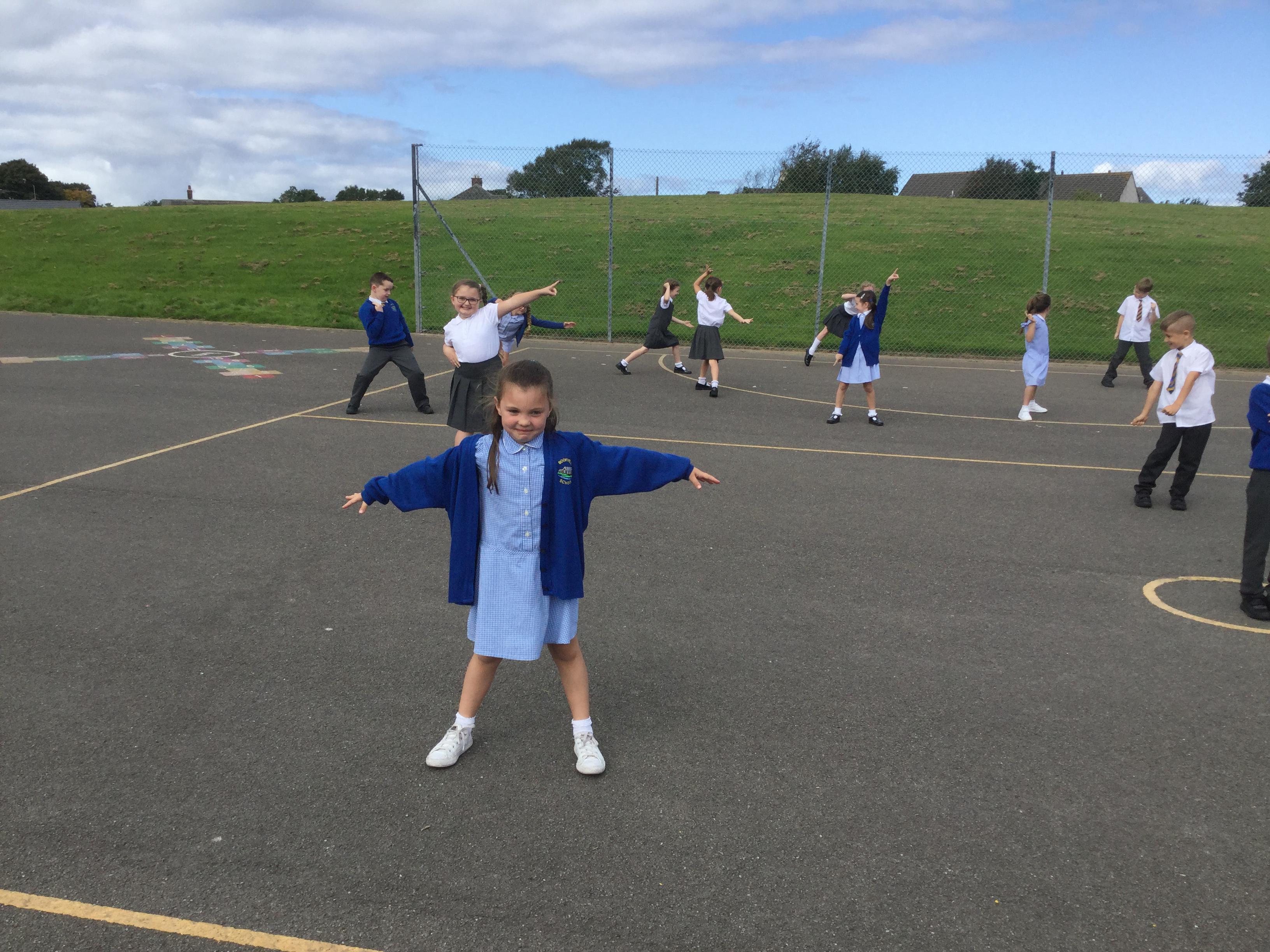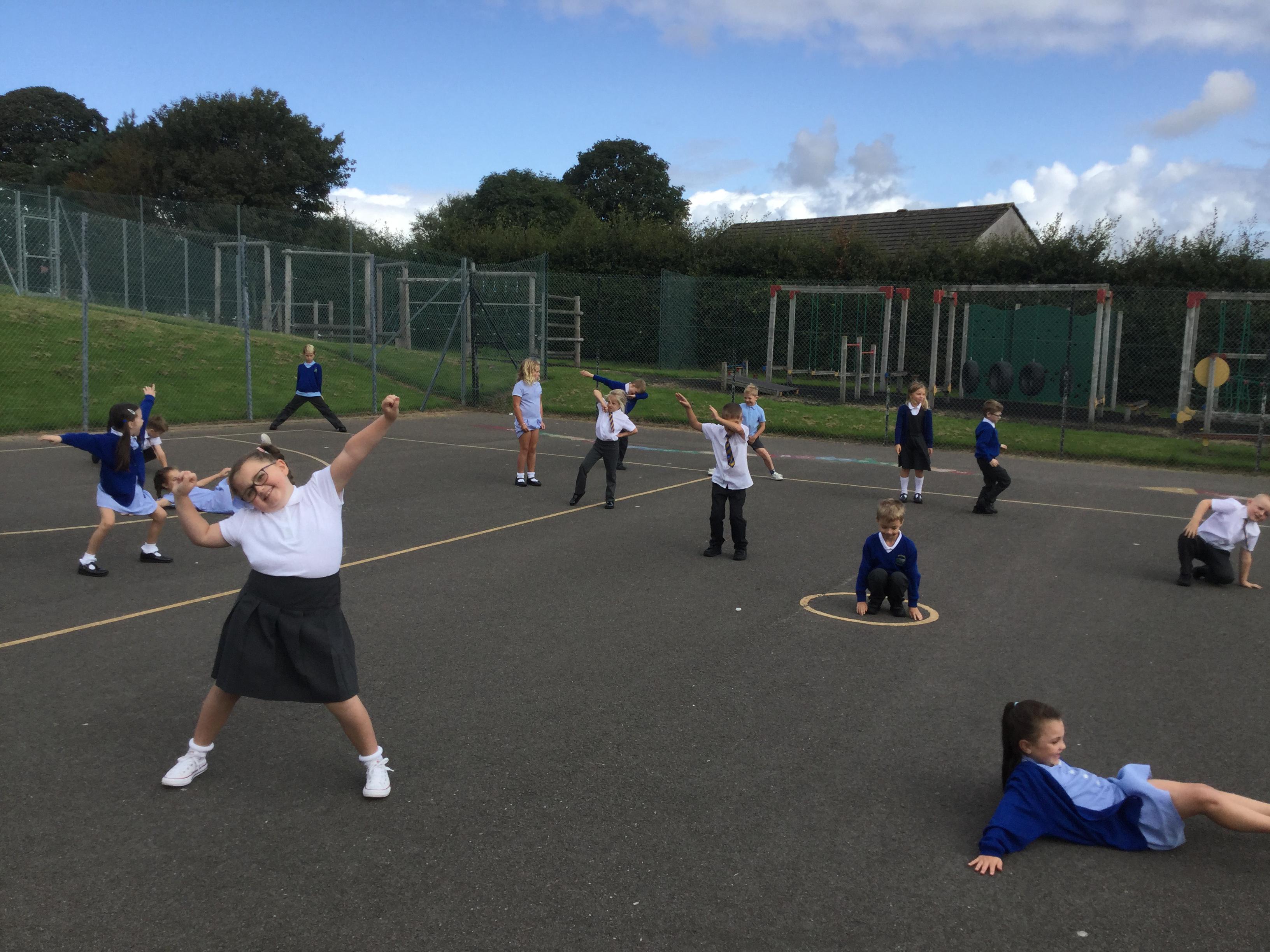 We have been learning about pop art during our first week back. It is bright, colourful and fun art. We looked at lots of different art. Our class focused on Keith Haring who was an American pop artist. He tended to create colourful people by drawing, painting and sculpting. These people were in lots of different positions. We experimented with posing in lots of different positions like Keith's art. We then got some members of the class to lie down in these positions and we drew round them. After that, we painted and cut round the outline creating our own Keith Haring pop art.