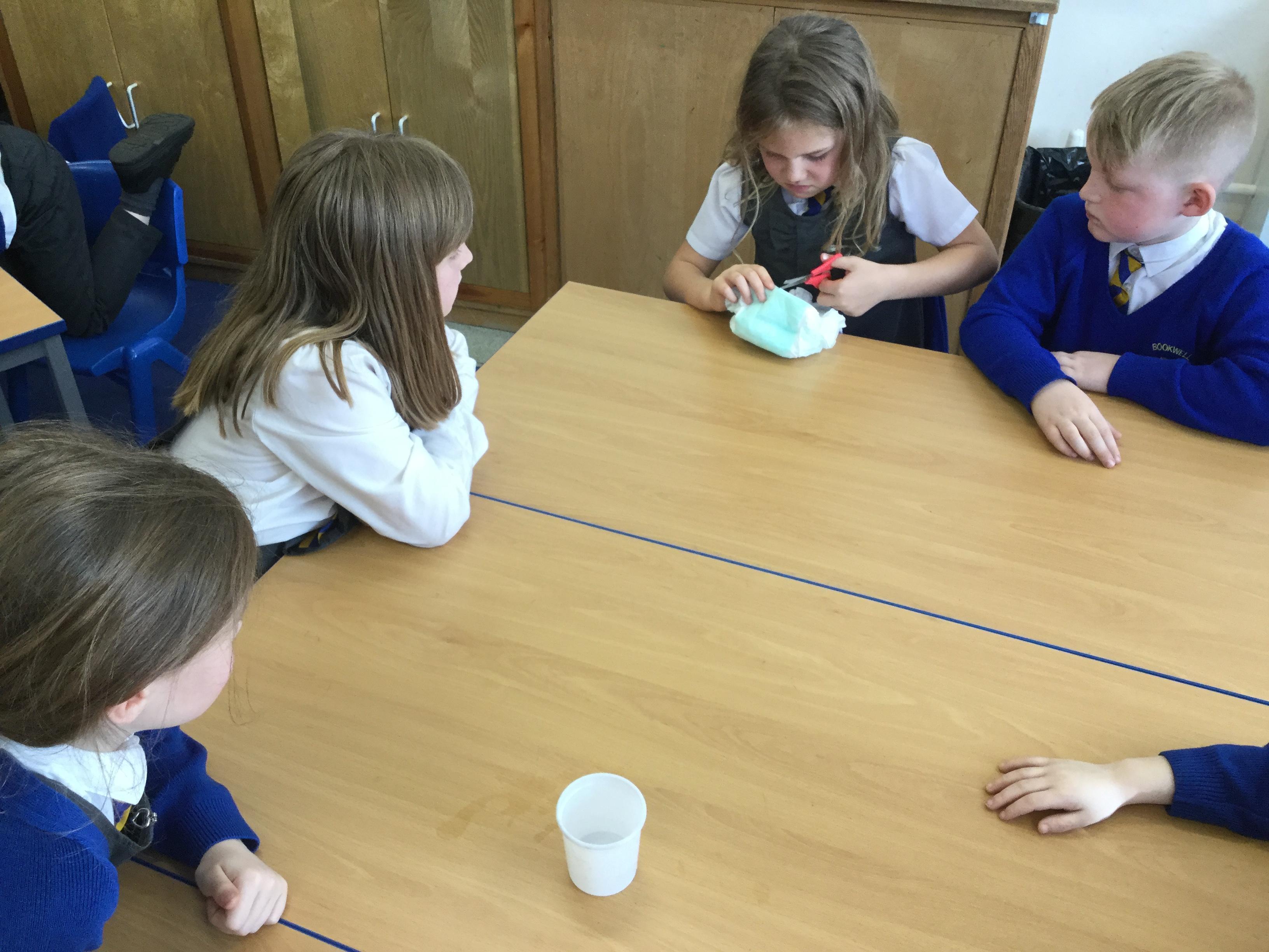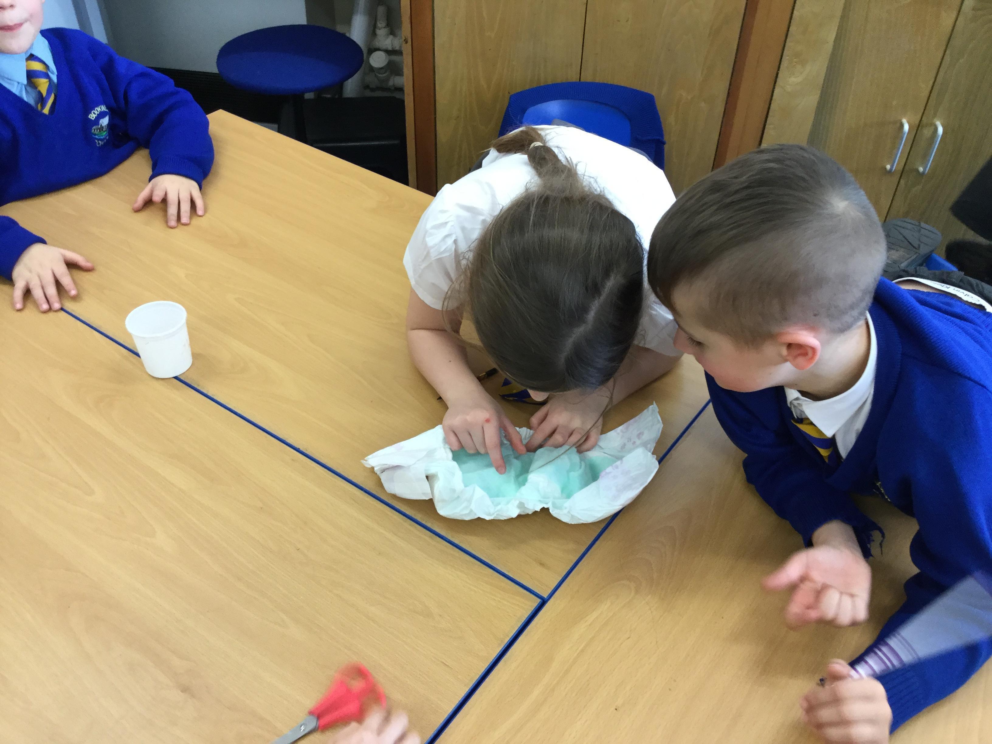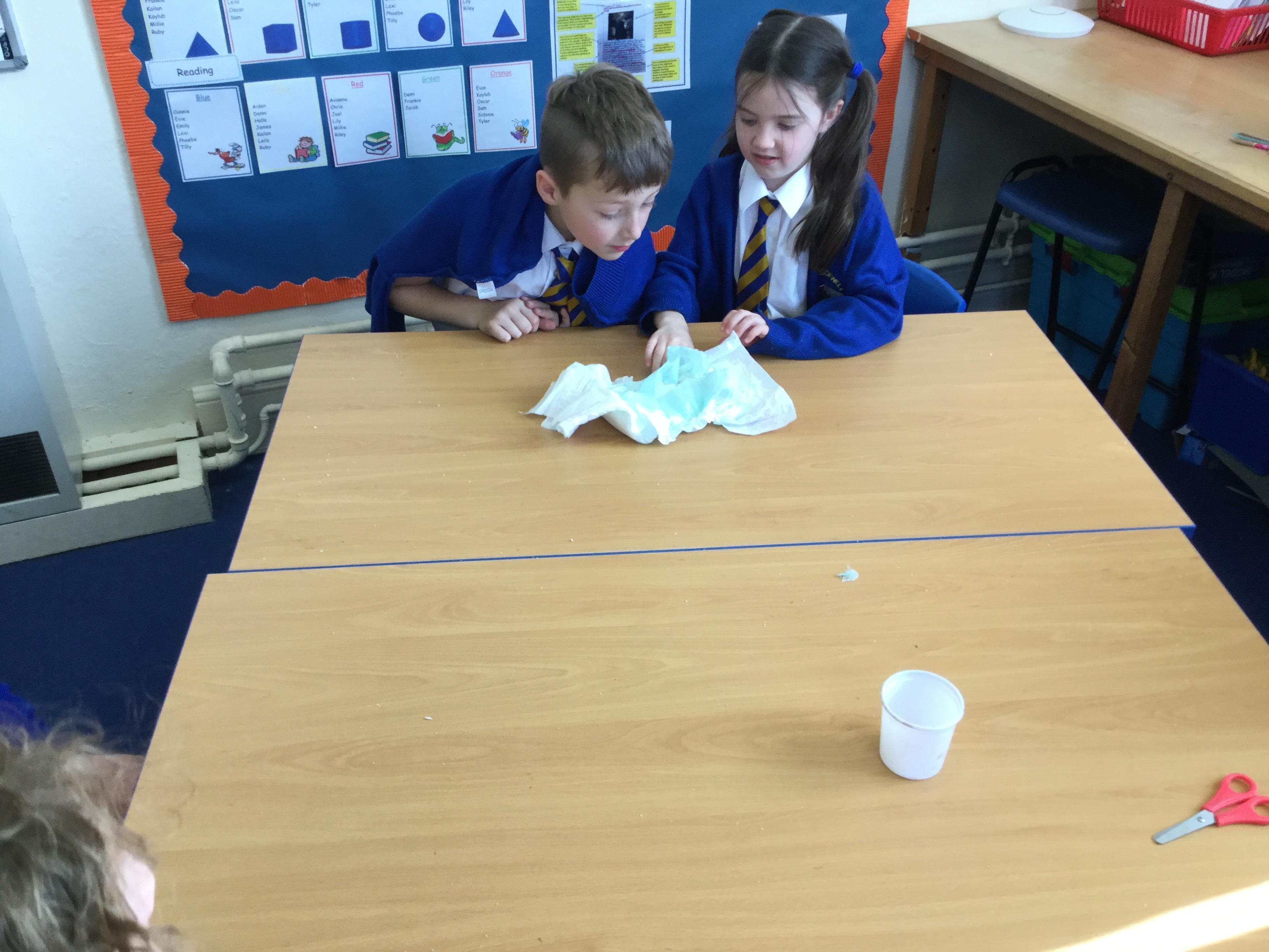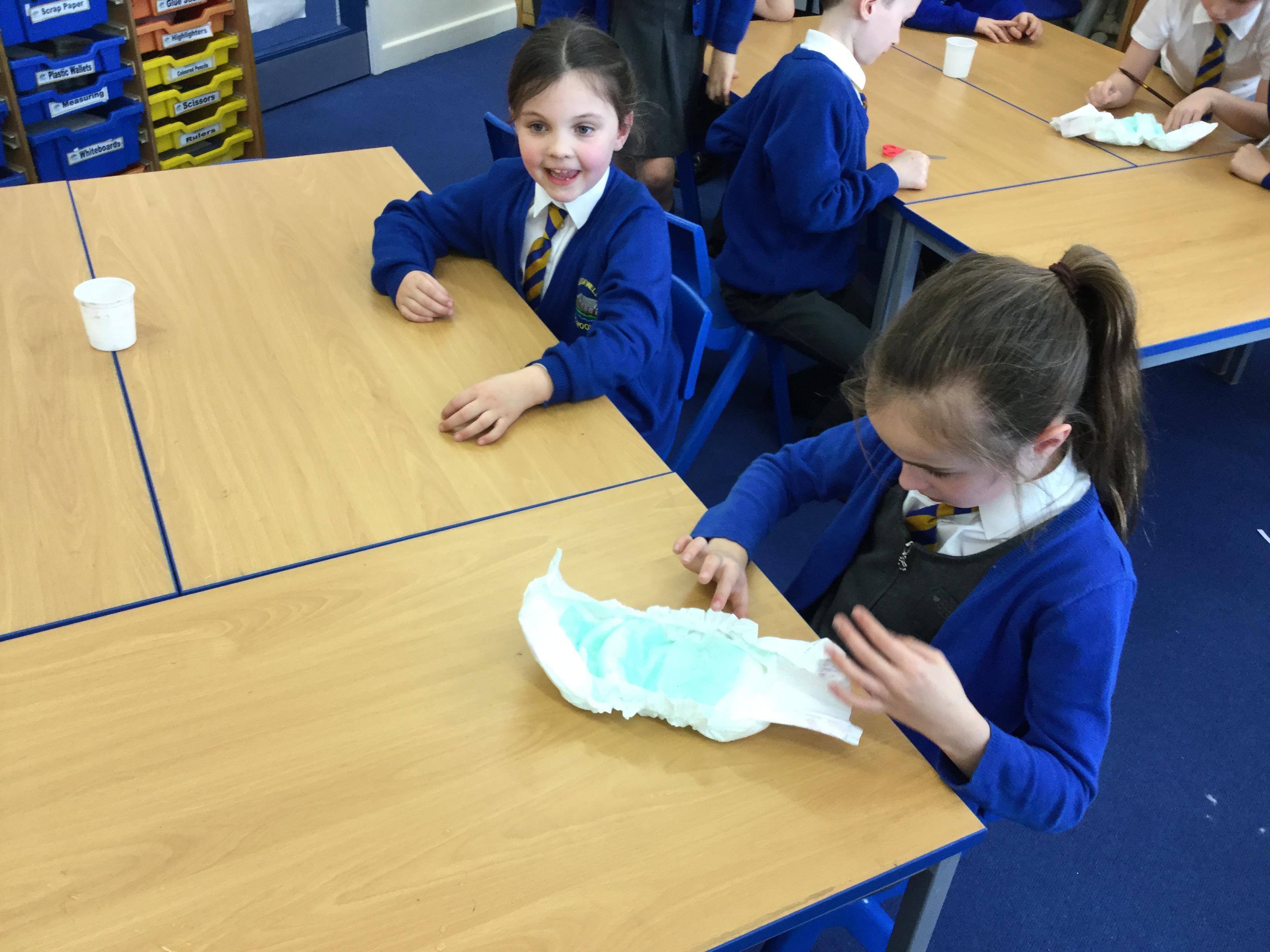 We investigated a disposible nappy. We looked at the materials it was made of and their properties. The nappy was absorbent, could fasten together, was light, was soft and was stretchy. Using scissors, we cut the nappy open to look at what was inside. We discovered little crystals that absorb and expand when they come into contact with liquid. Cool!