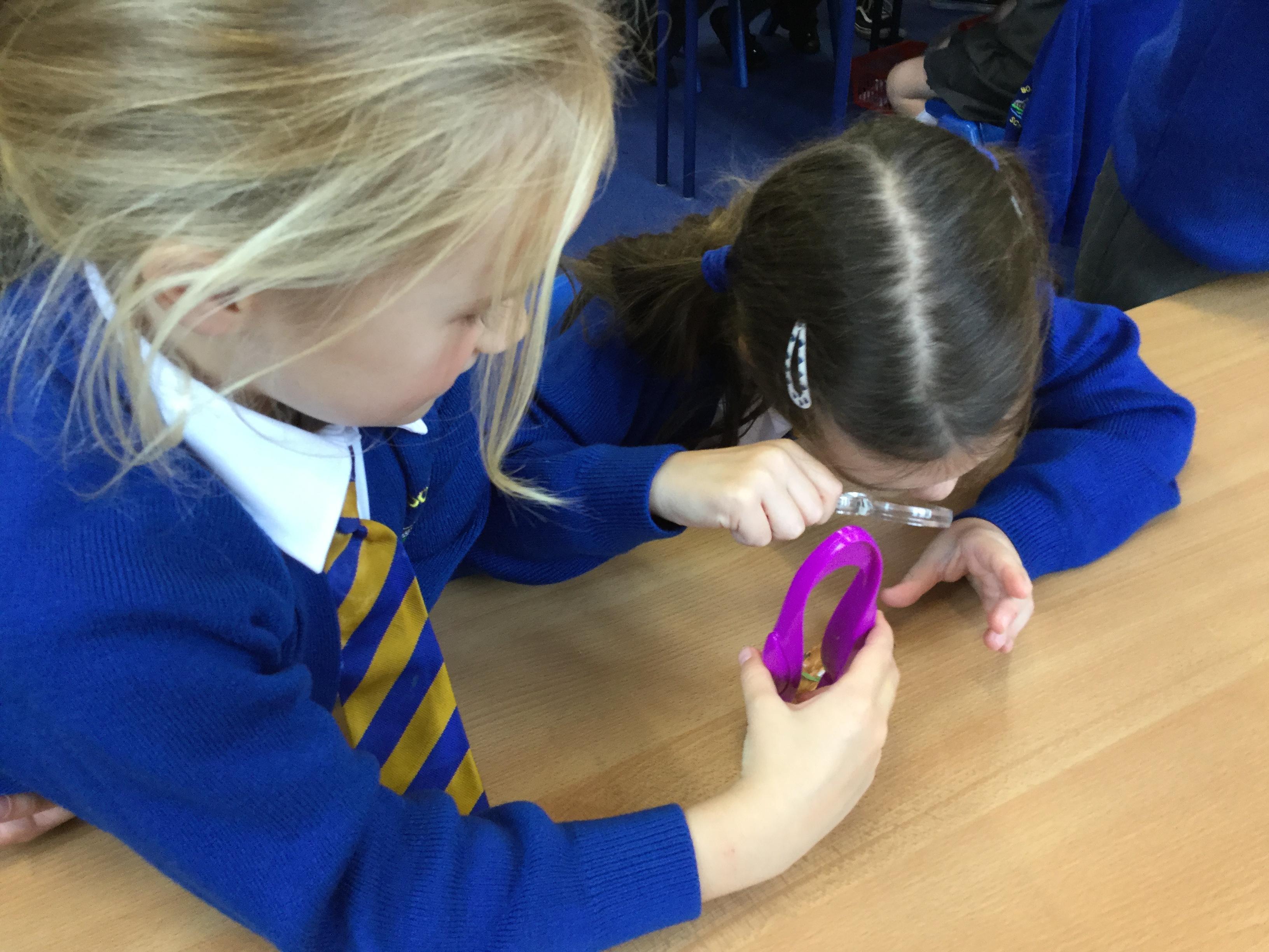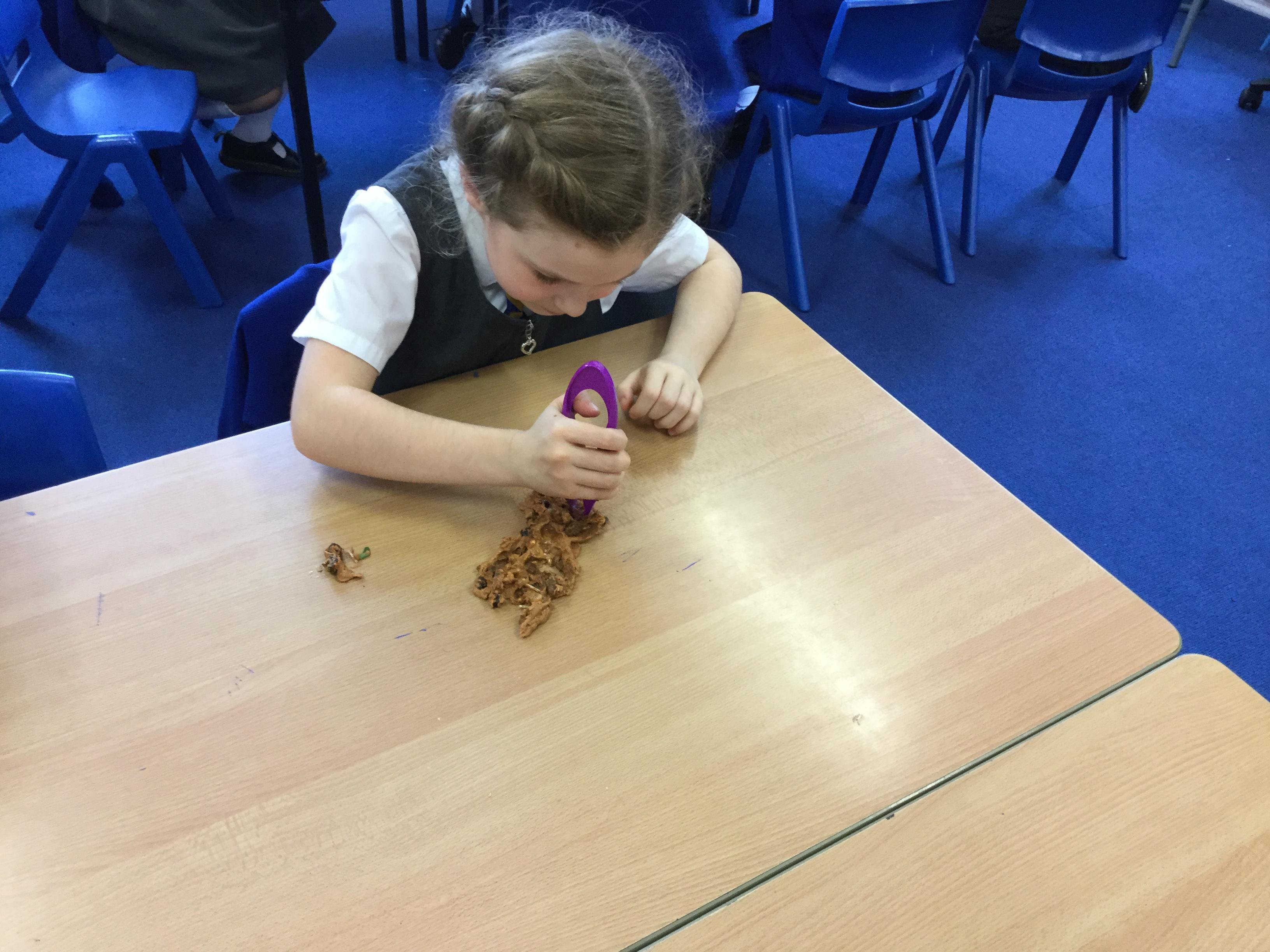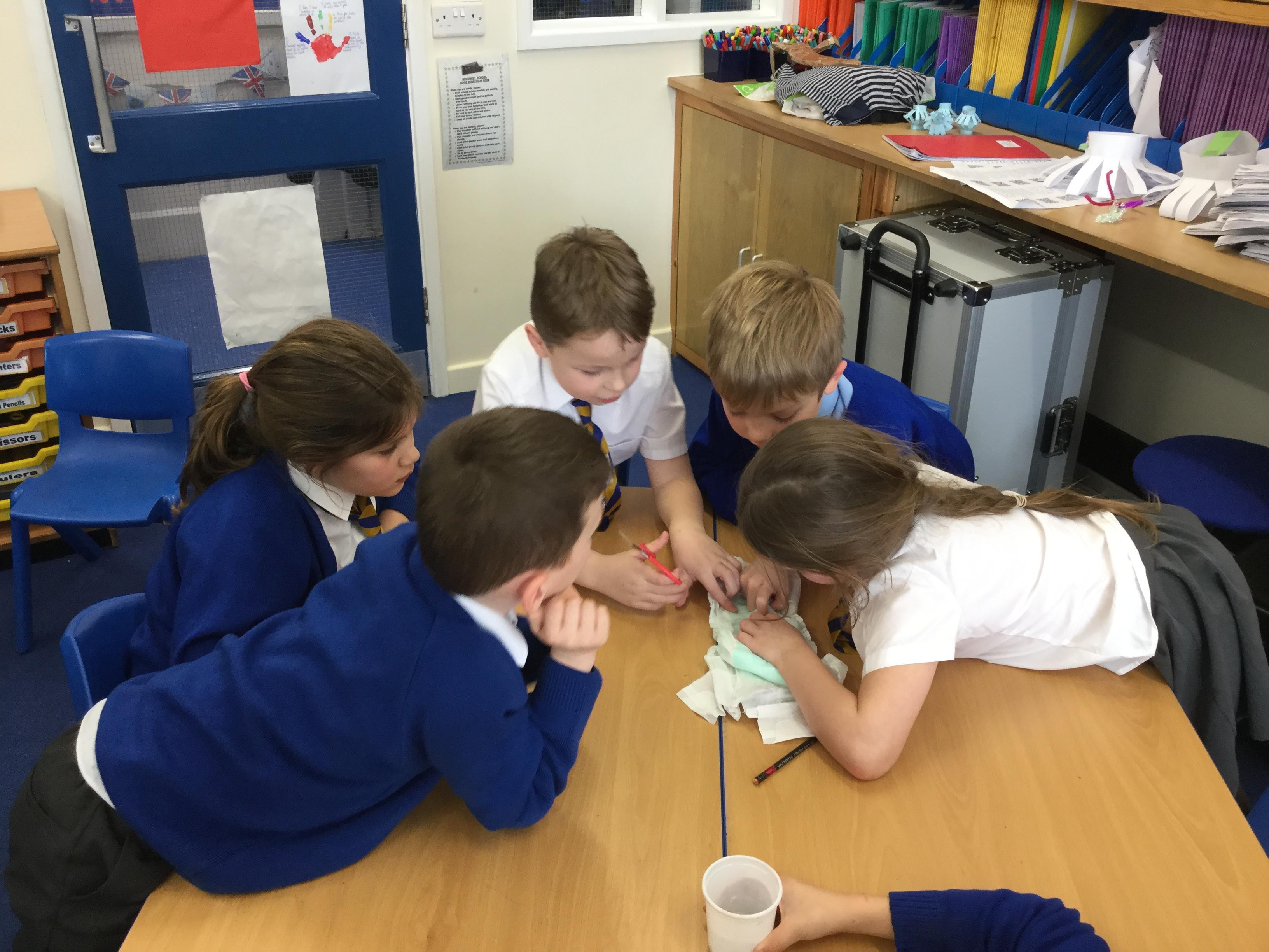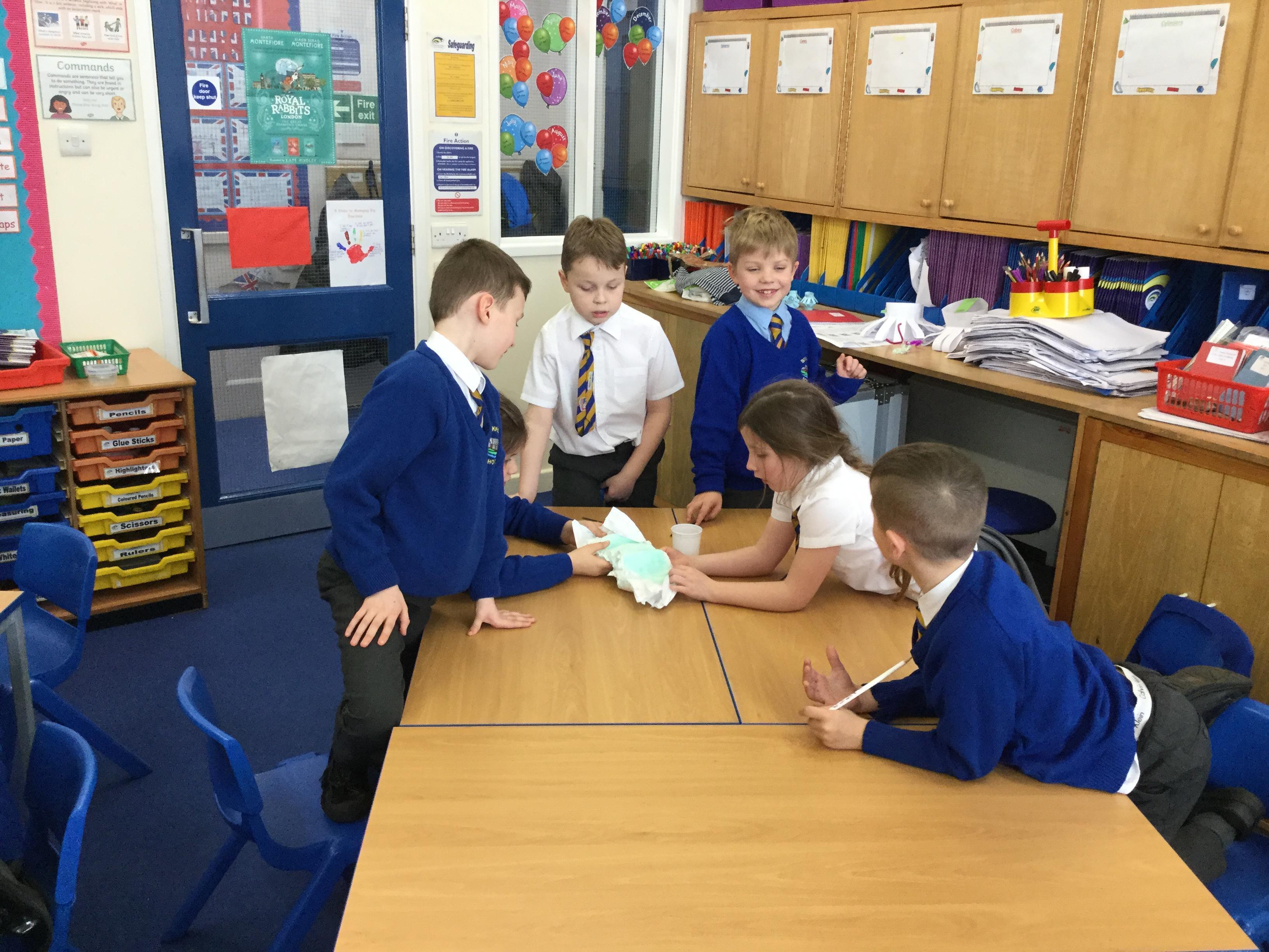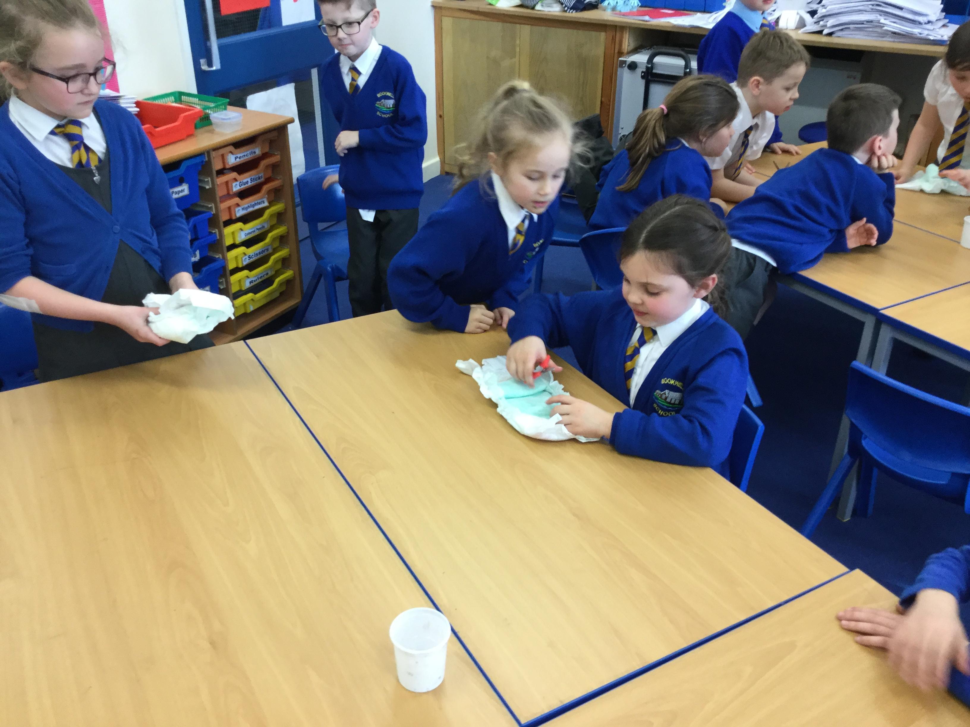 We investigated a disposible nappy. We looked at the materials it was made of and their properties. The nappy was absorbent, could fasten together, was light, was soft and was stretchy. Using scissors, we cut the nappy open to look at what was inside. We discovered little crystals that absorb and expand when they come into contact with liquid. Cool!