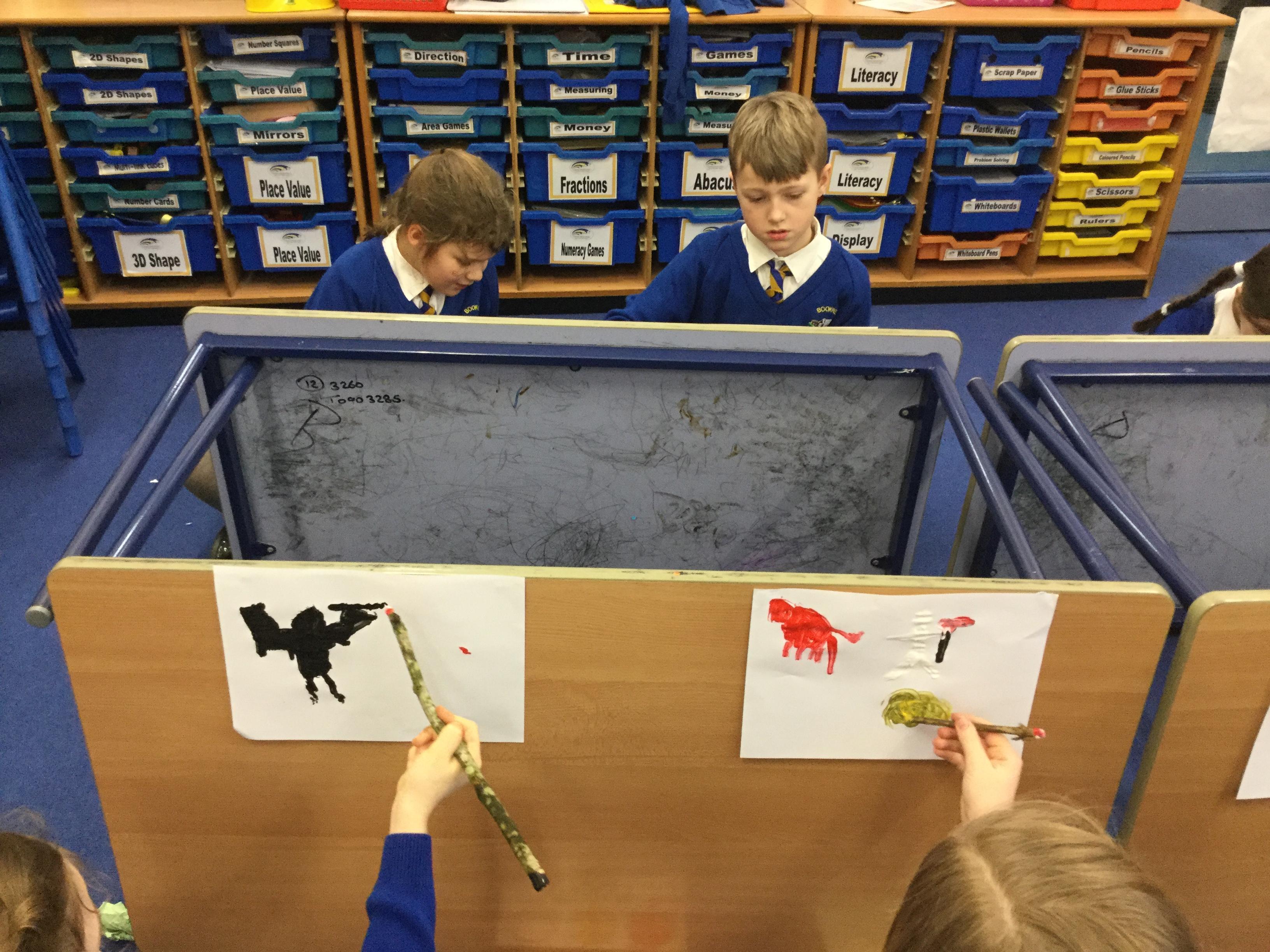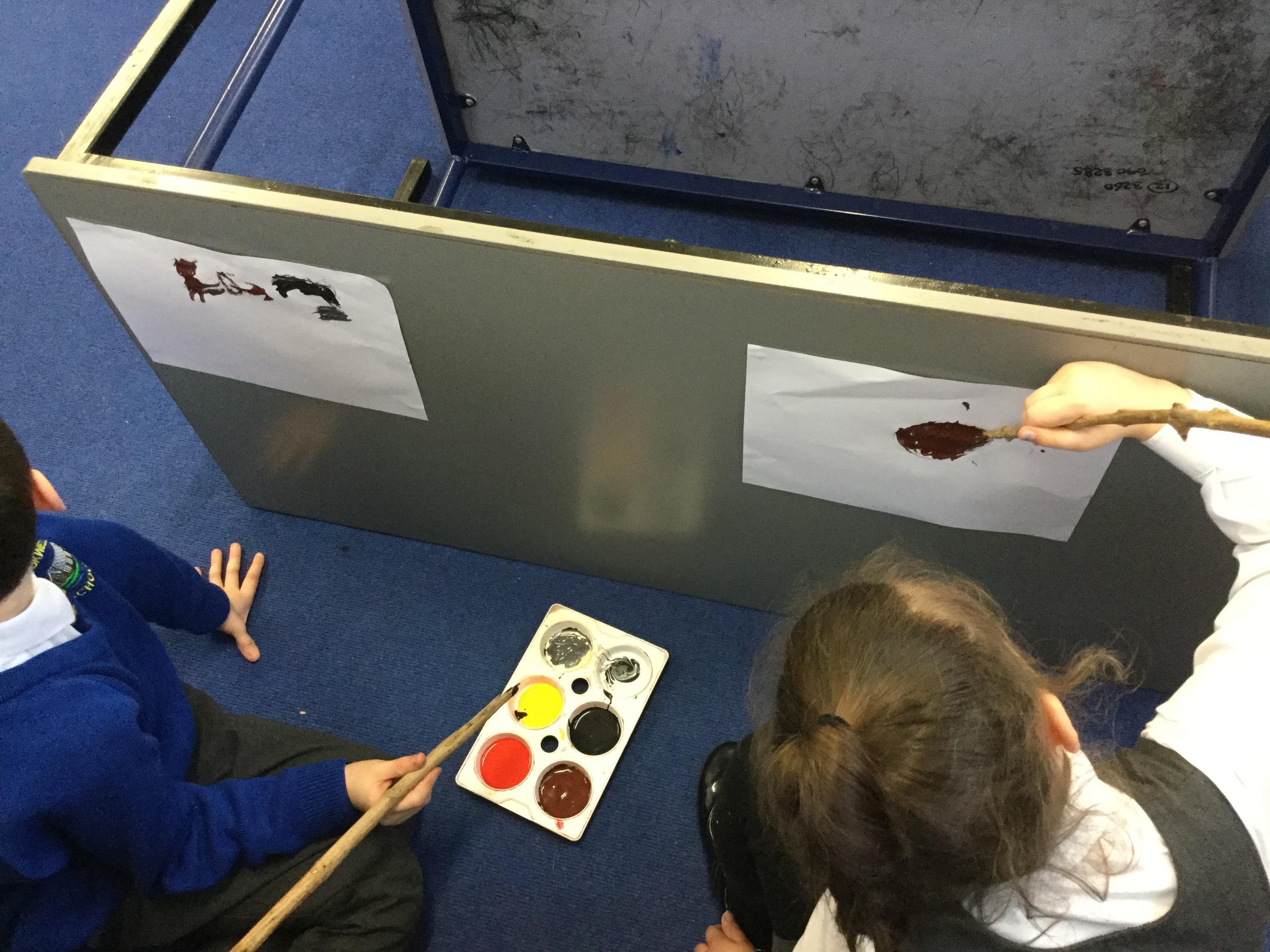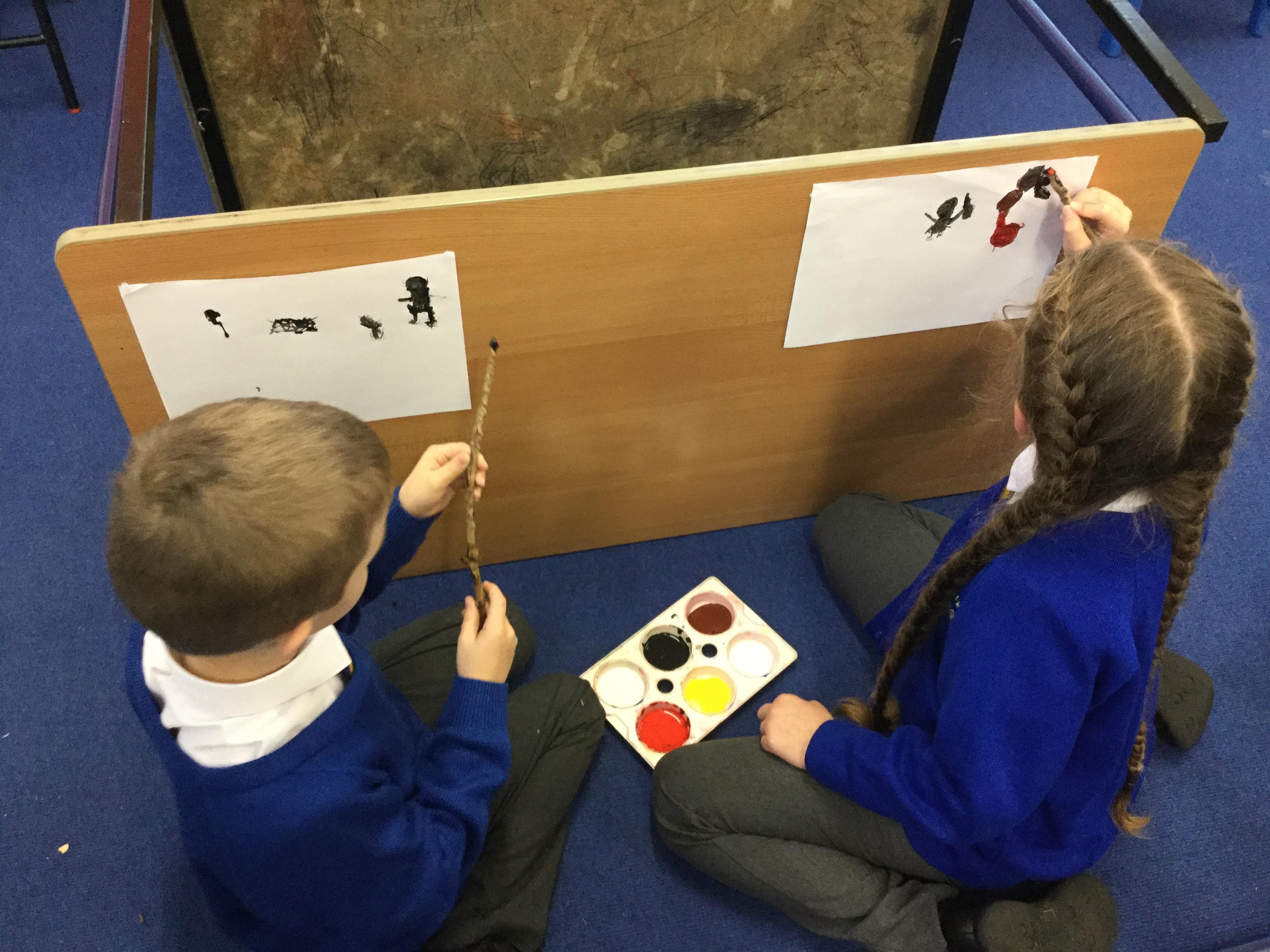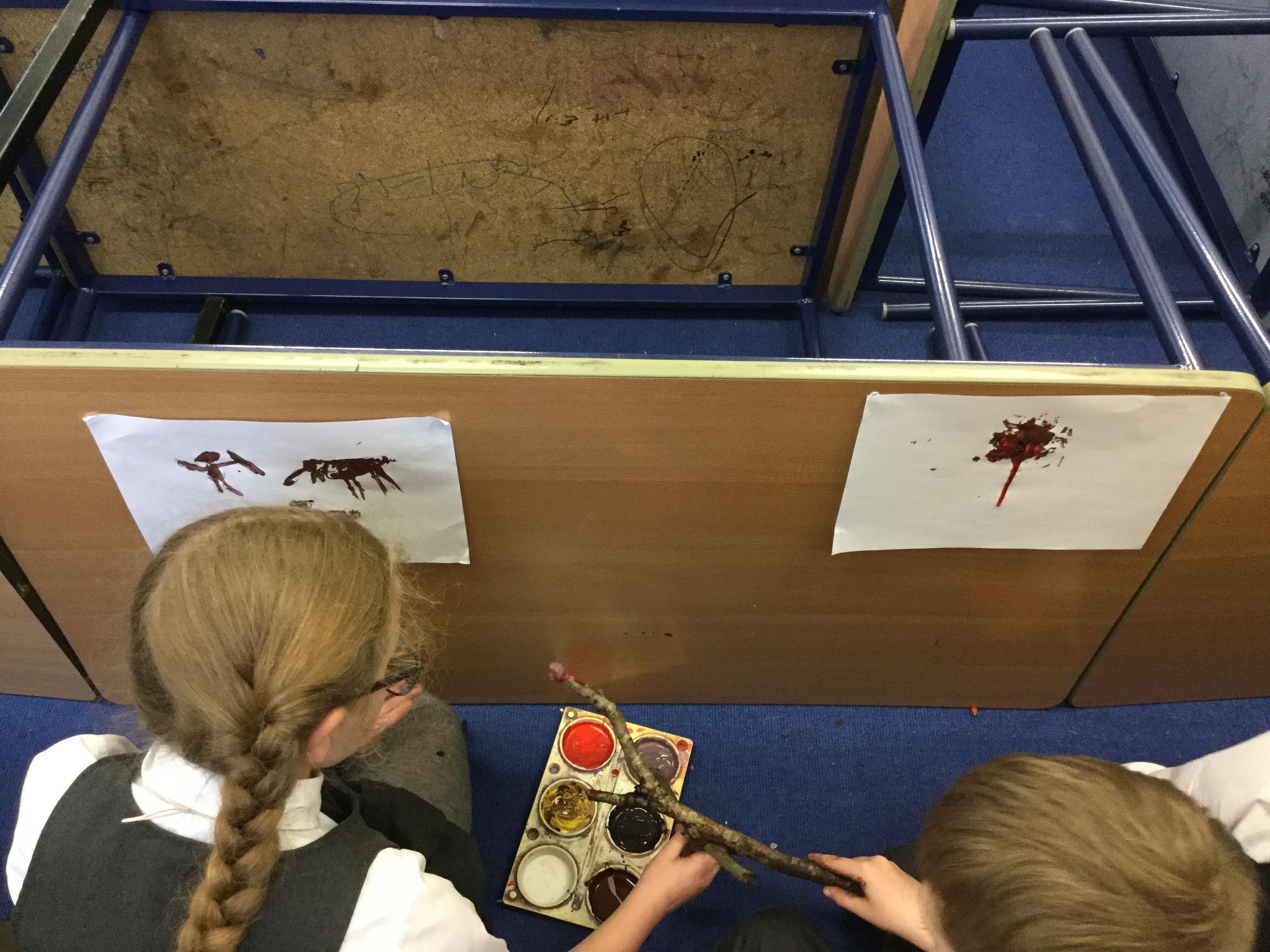 Mrs McEwan turned the tables on their side and we collected sticks on order to create some cave art. We used coloured paint instead of chalk, red ochre and charcoal. People in the Stone Age painted animals and hunting scenes so we decided to do the same. What do you think of our cave paintings?
