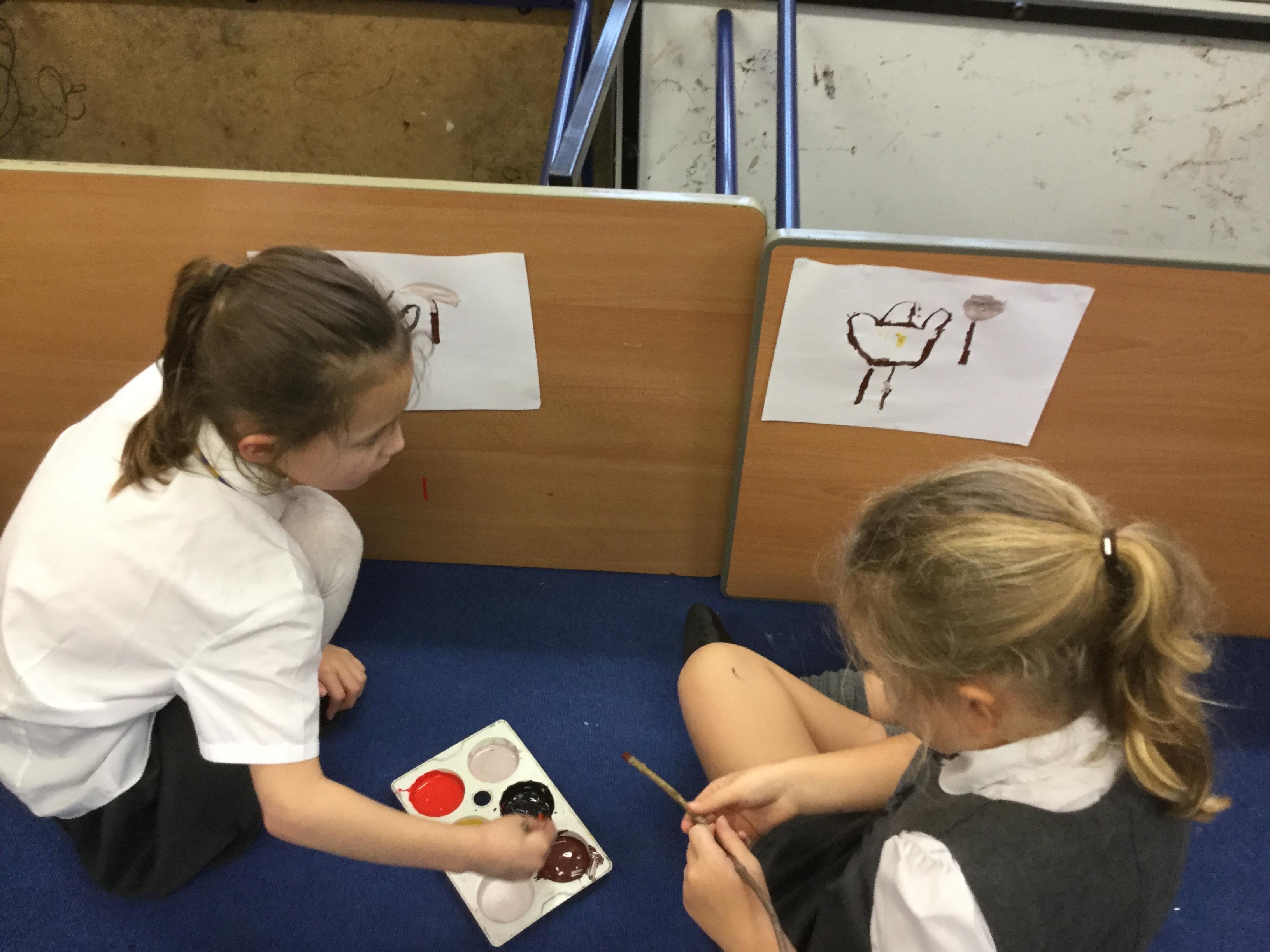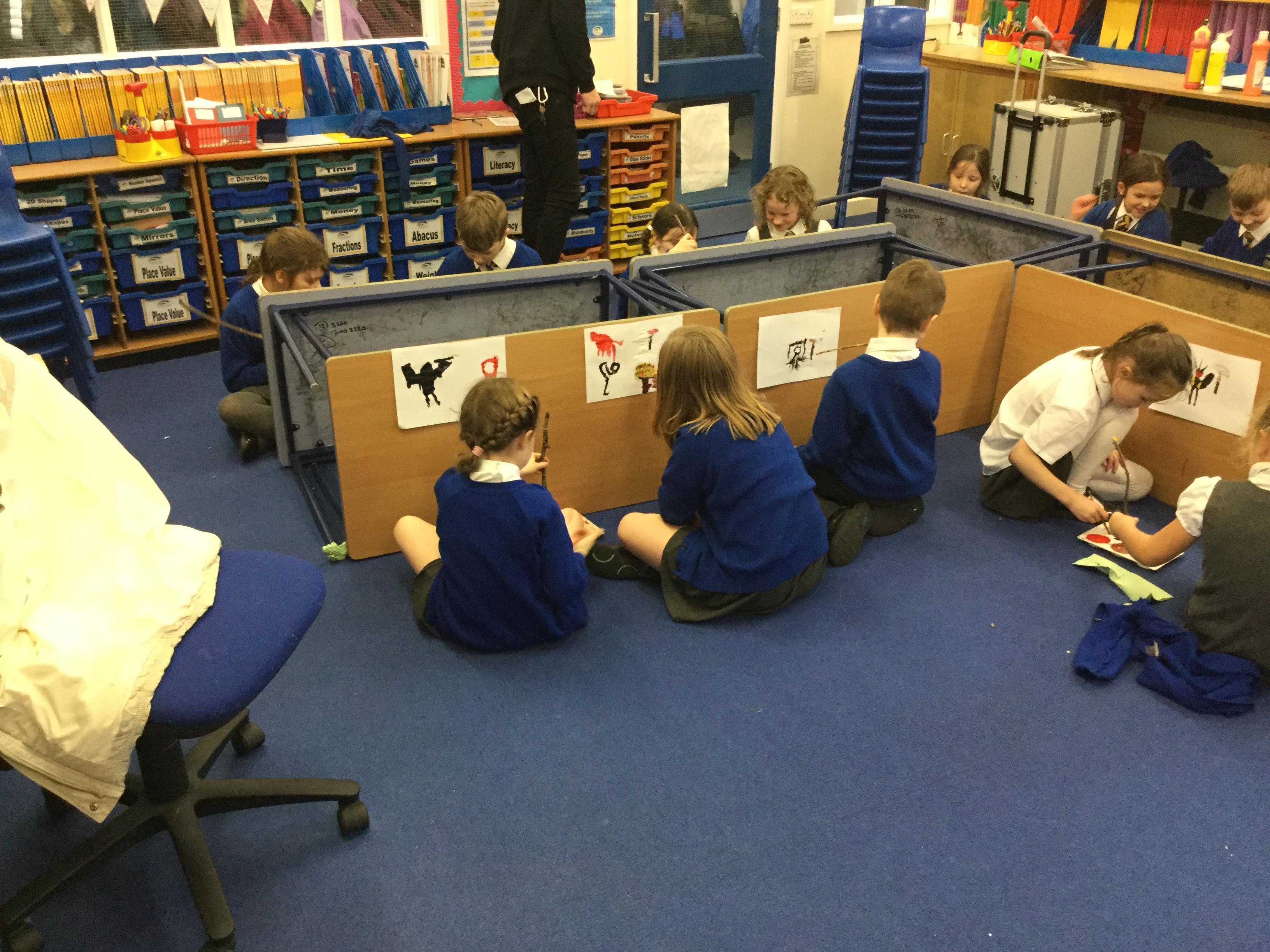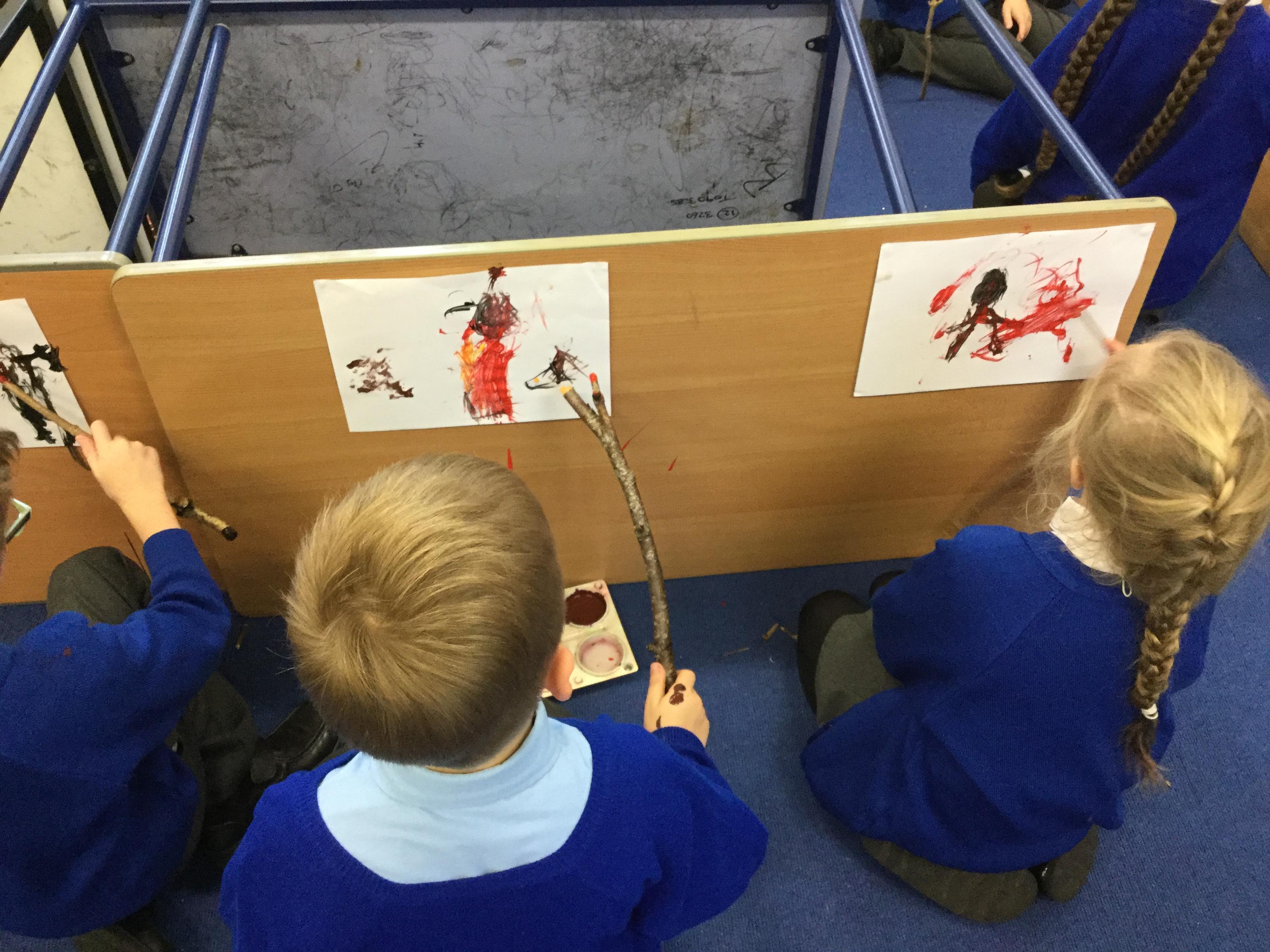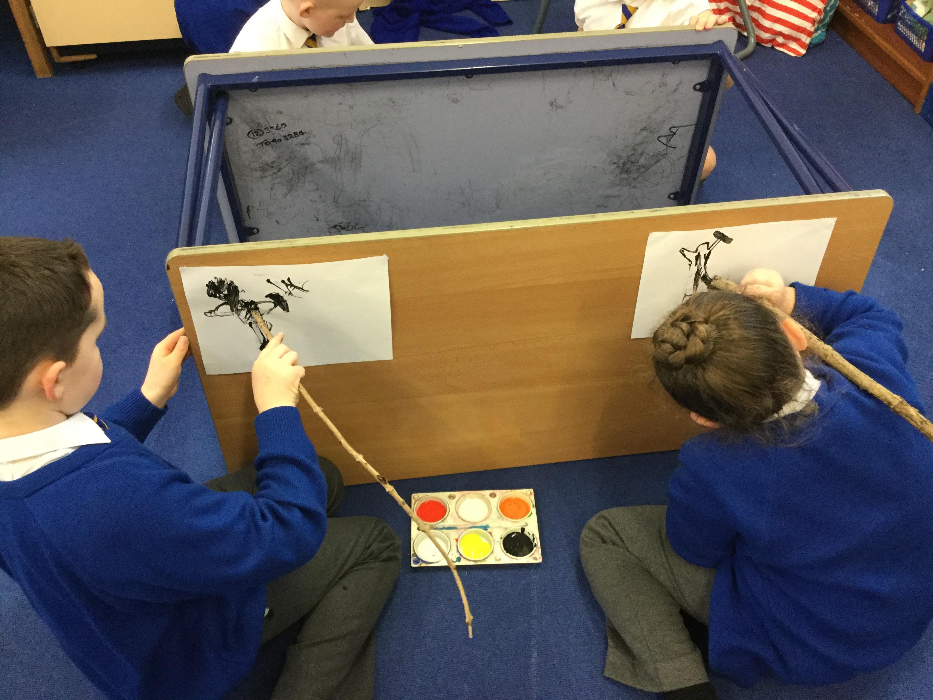 Mrs McEwan turned the tables on their side and we collected sticks on order to create some cave art. We used coloured paint instead of chalk, red ochre and charcoal. People in the Stone Age painted animals and hunting scenes so we decided to do the same. What do you think of our cave paintings?
