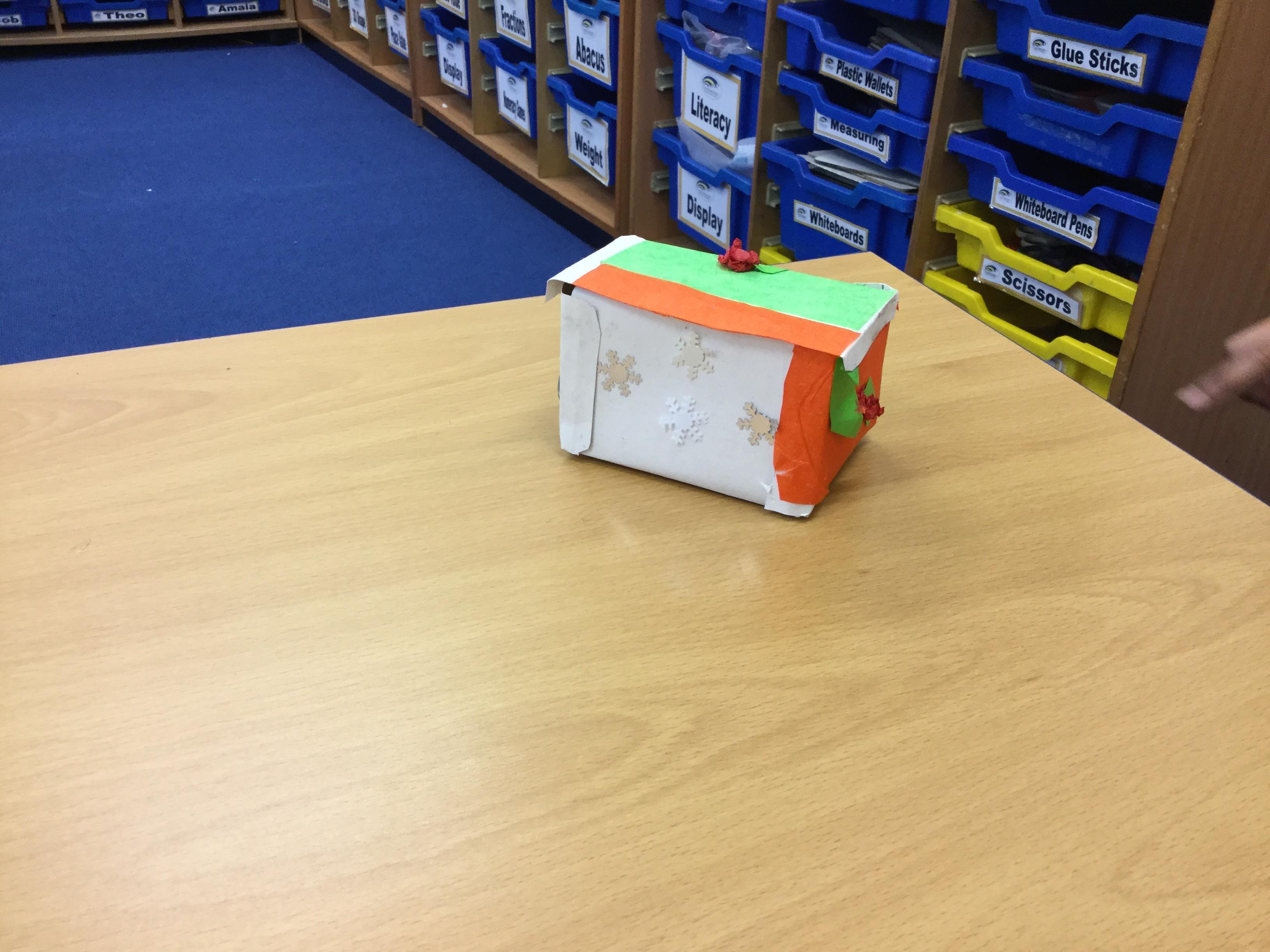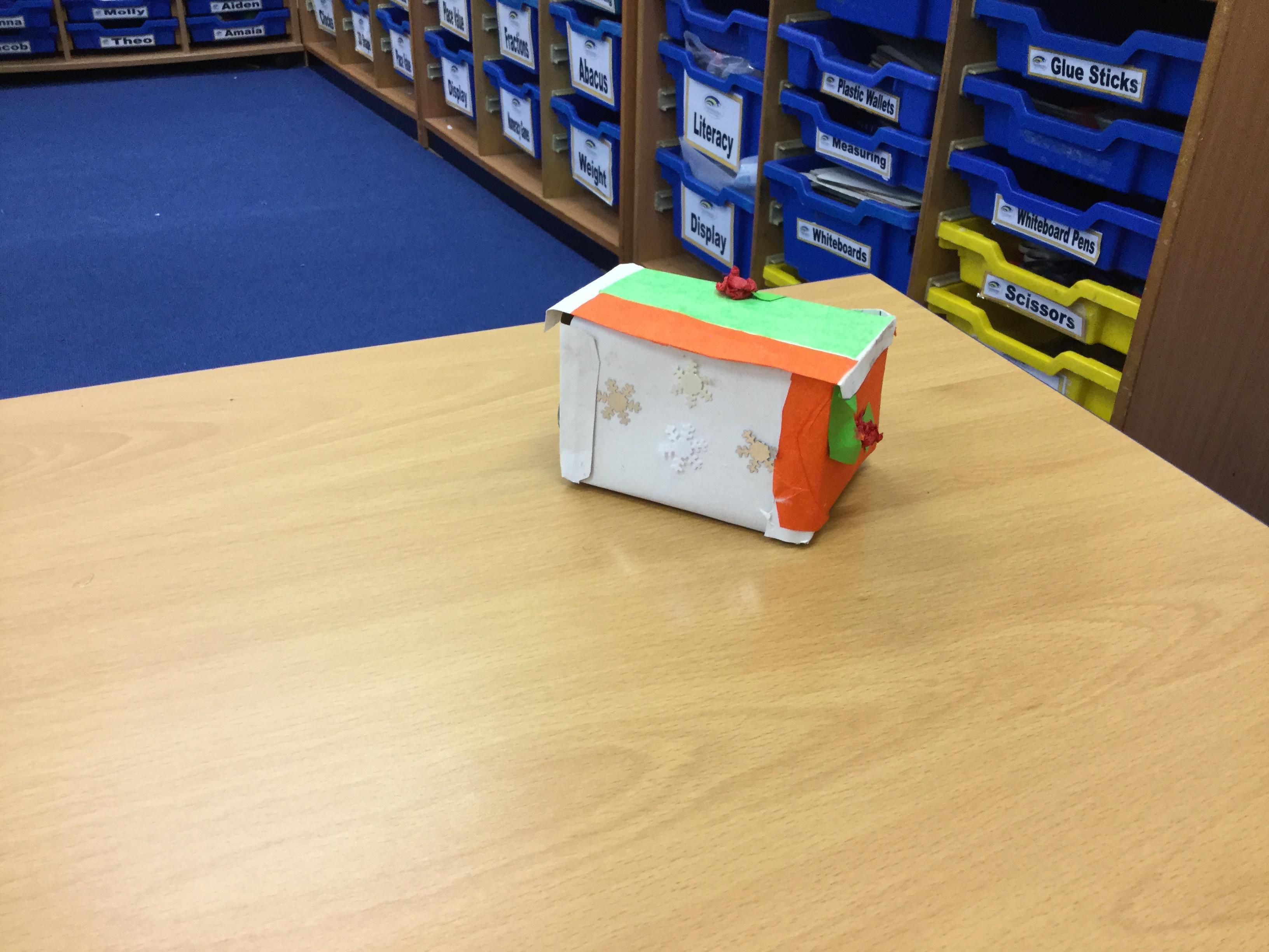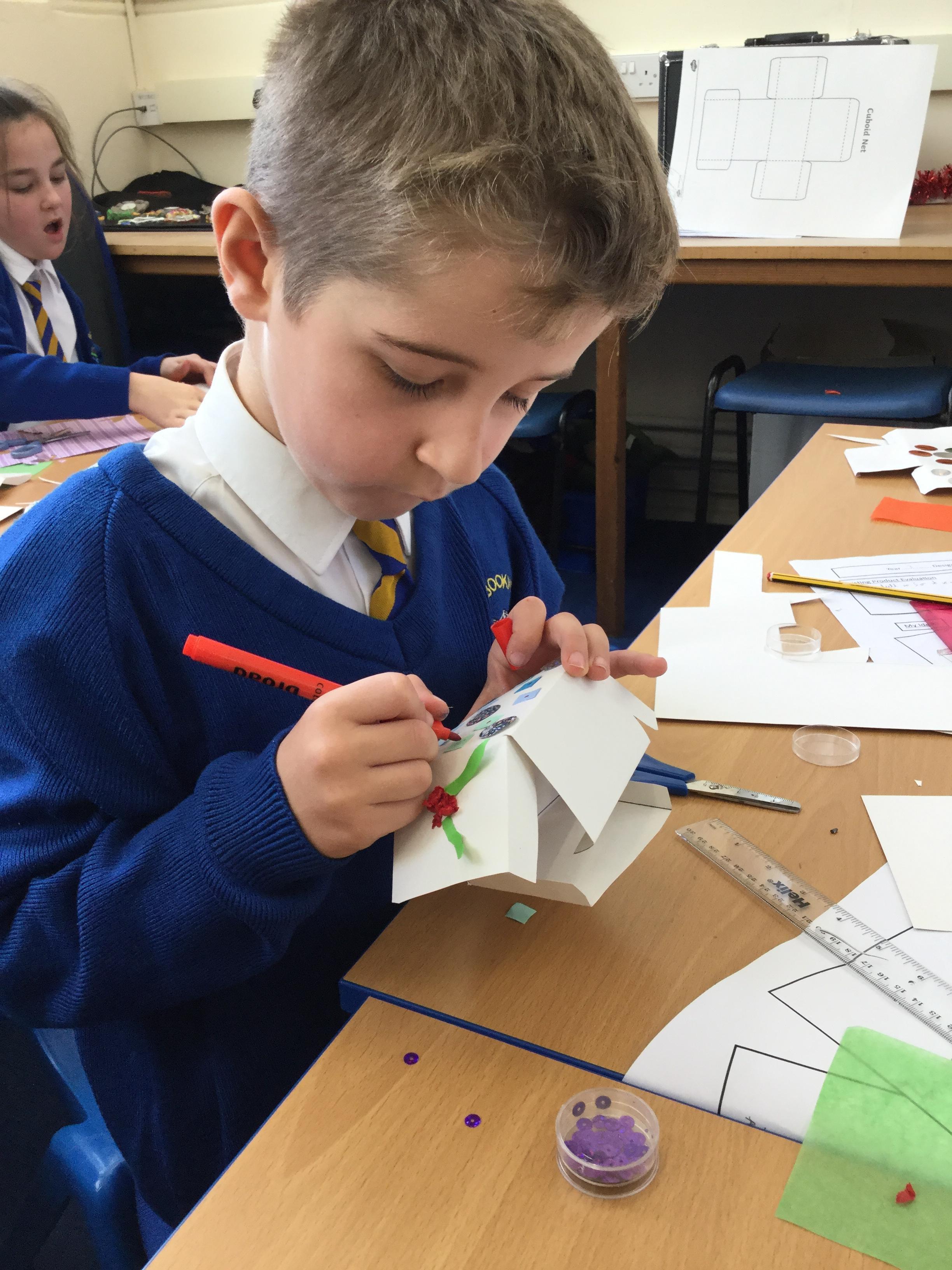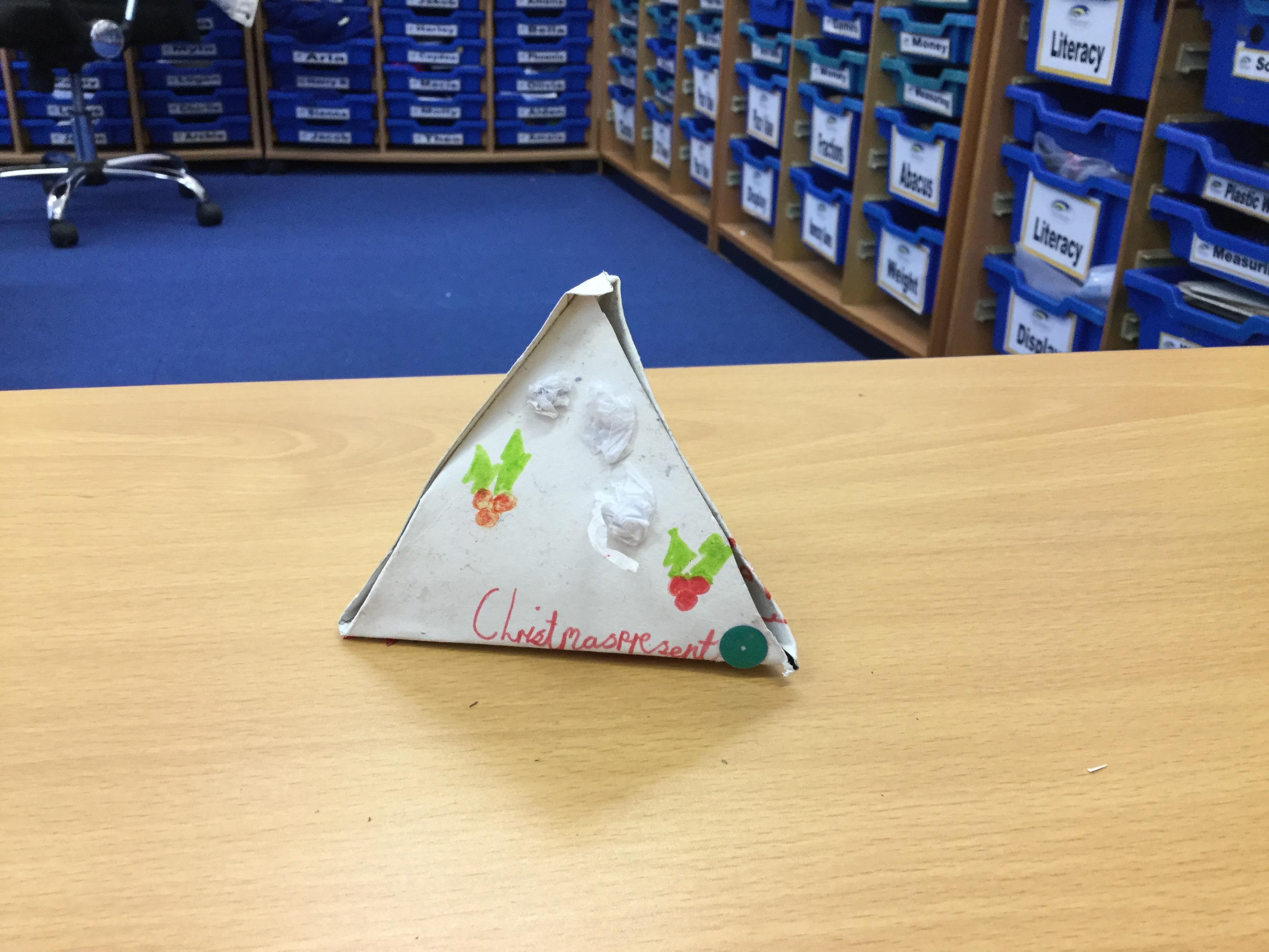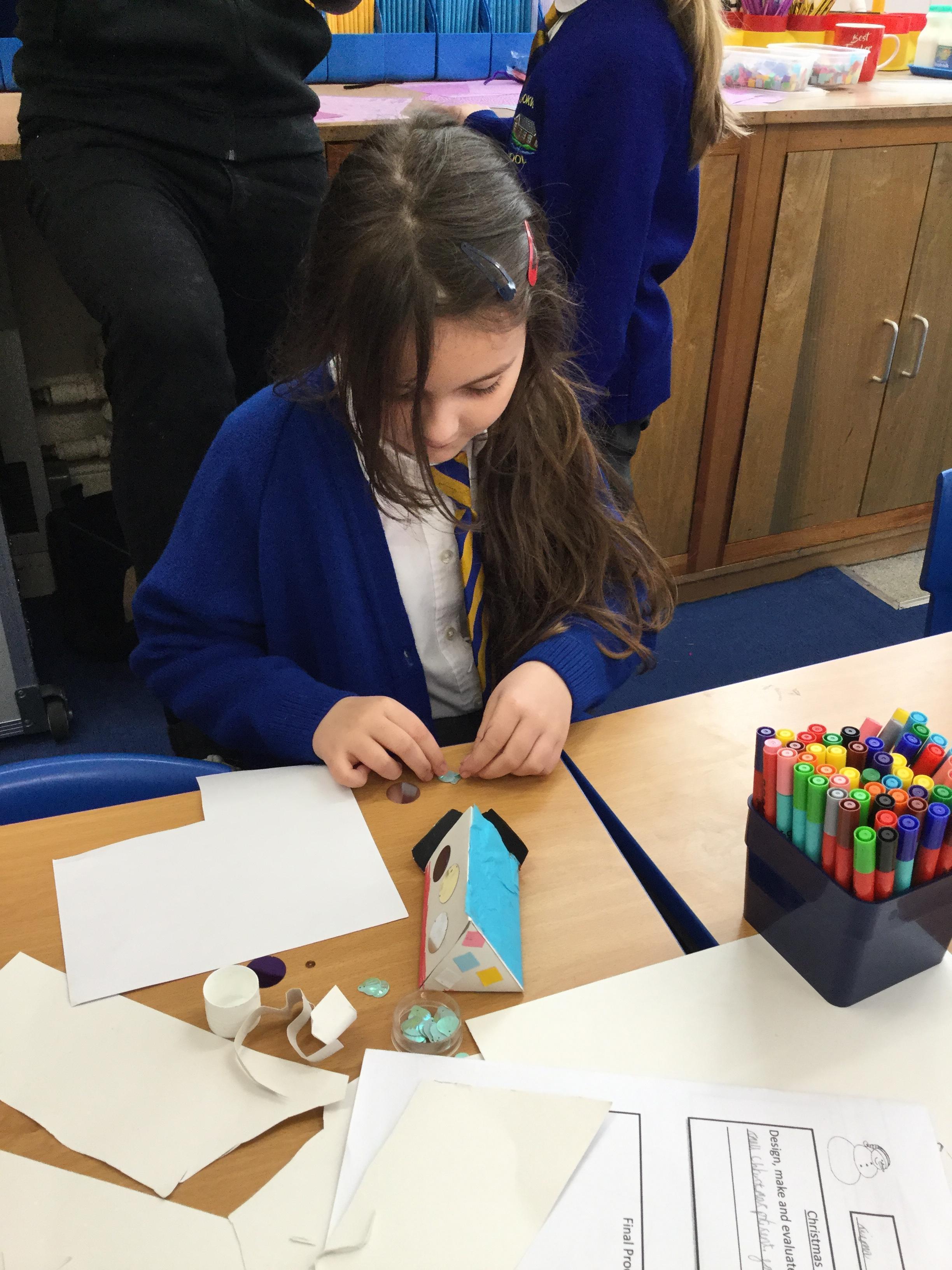 Christmas gift boxes were what we were producing today. Our design brief was to plan, make and evaluate a box for a small Christmas gift. We explored and planned our gift boxes the previous afternoon and had our ideas ready to make this morning. Firstly, we had to create our own nets using shapes which was quite difficult. Then we had to decorate our boxes from our plan. We used tissue paper, sequins, pens, pencils and card.