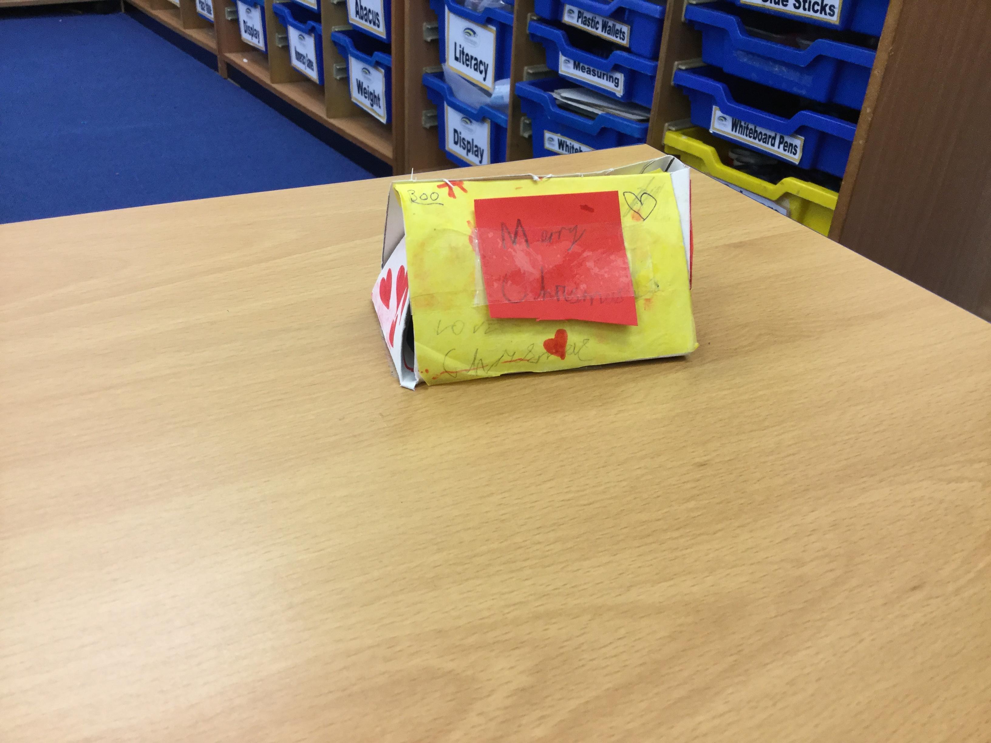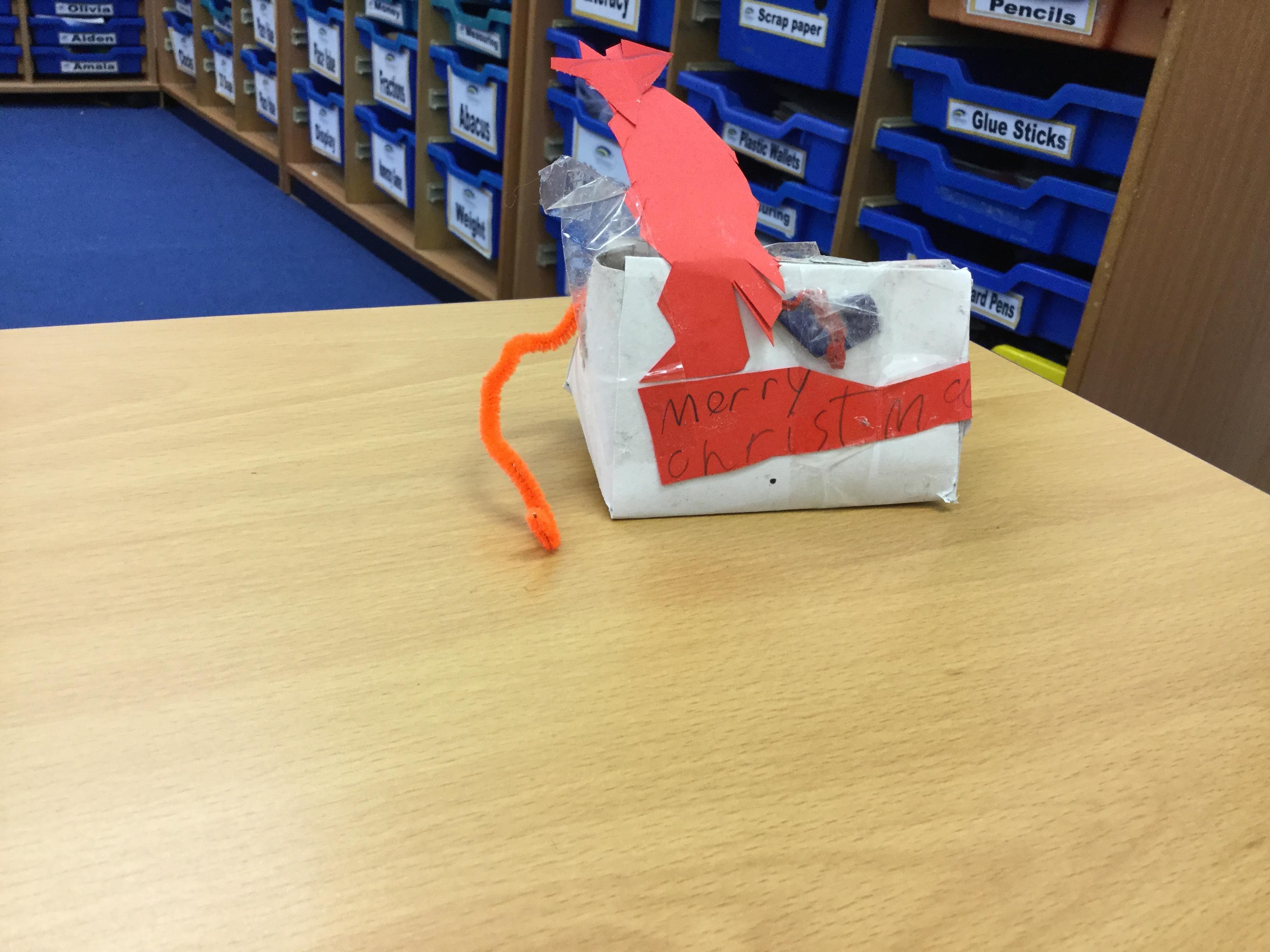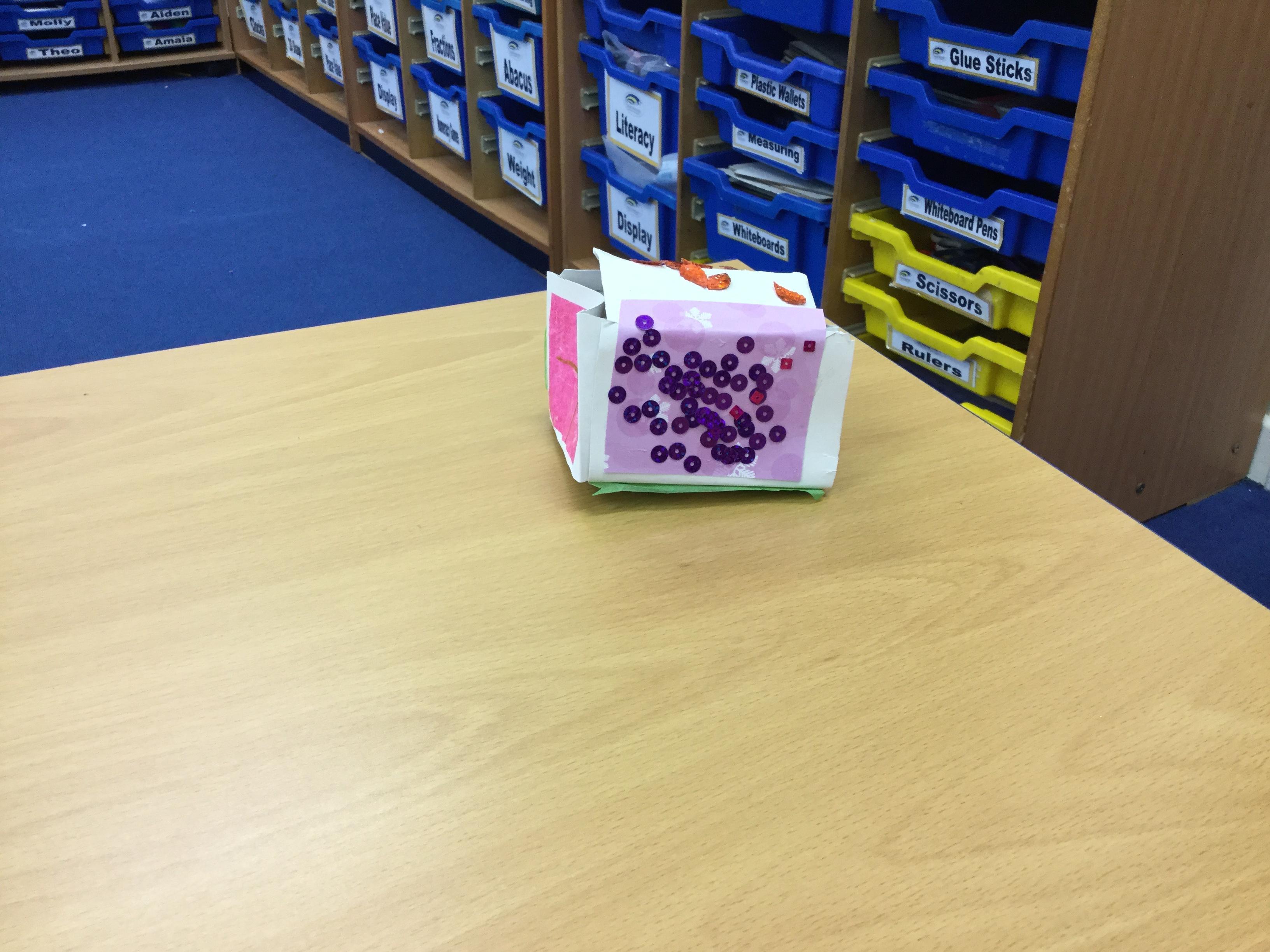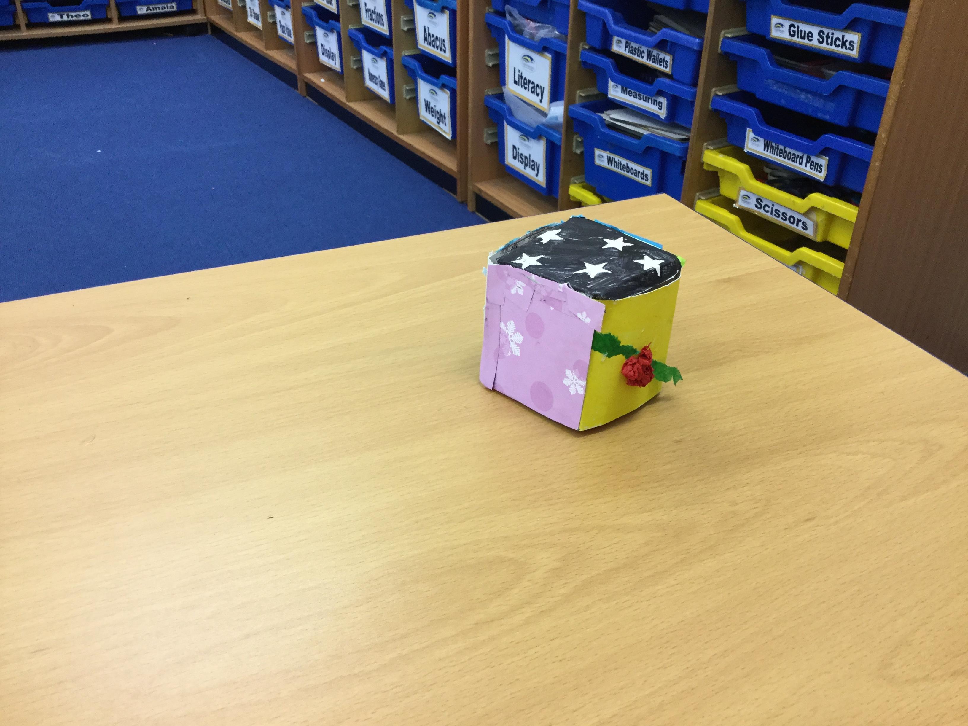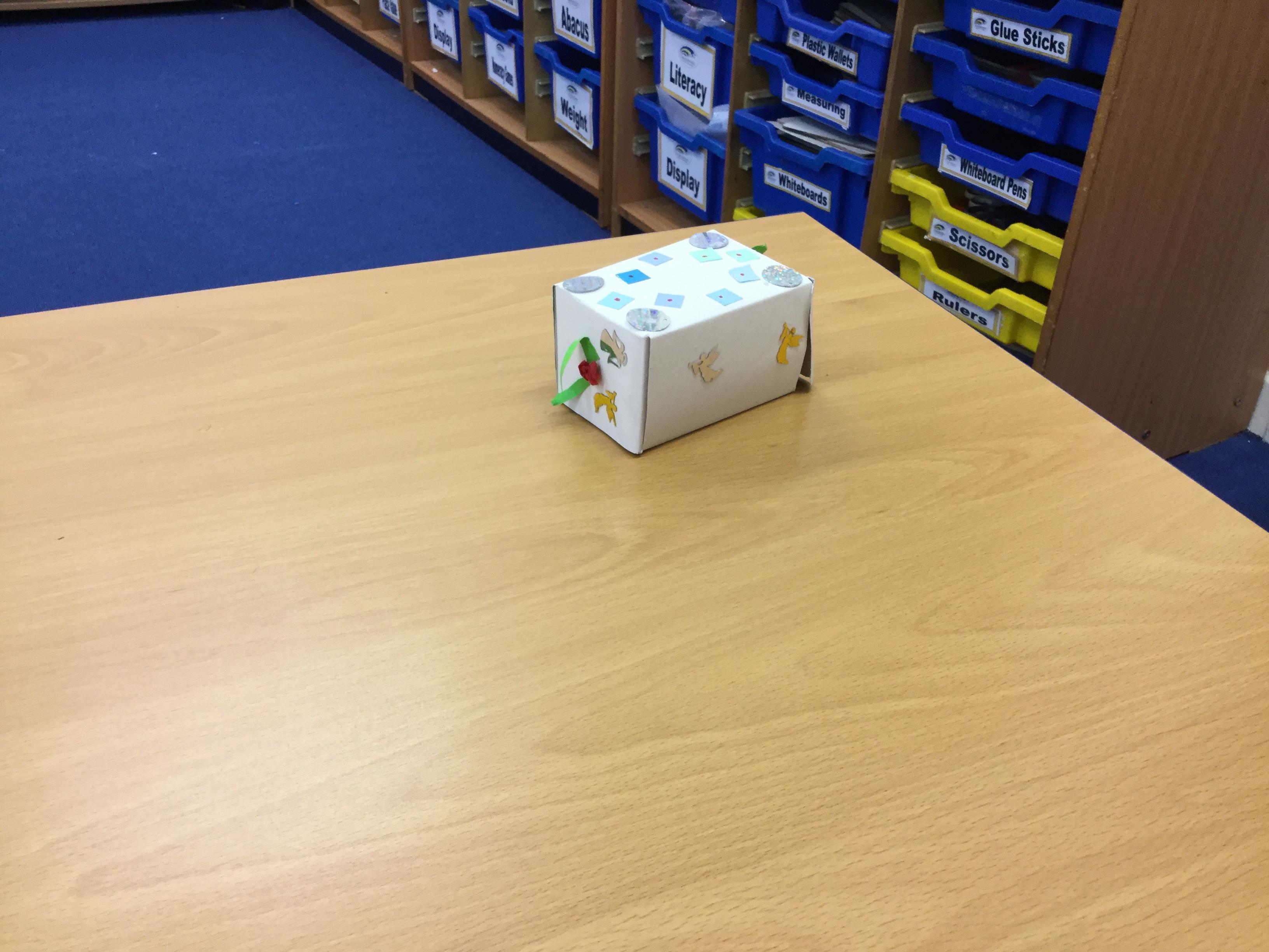 Christmas gift boxes were what we were producing today. Our design brief was to plan, make and evaluate a box for a small Christmas gift. We explored and planned our gift boxes the previous afternoon and had our ideas ready to make this morning. Firstly, we had to create our own nets using shapes which was quite difficult. Then we had to decorate our boxes from our plan. We used tissue paper, sequins, pens, pencils and card.