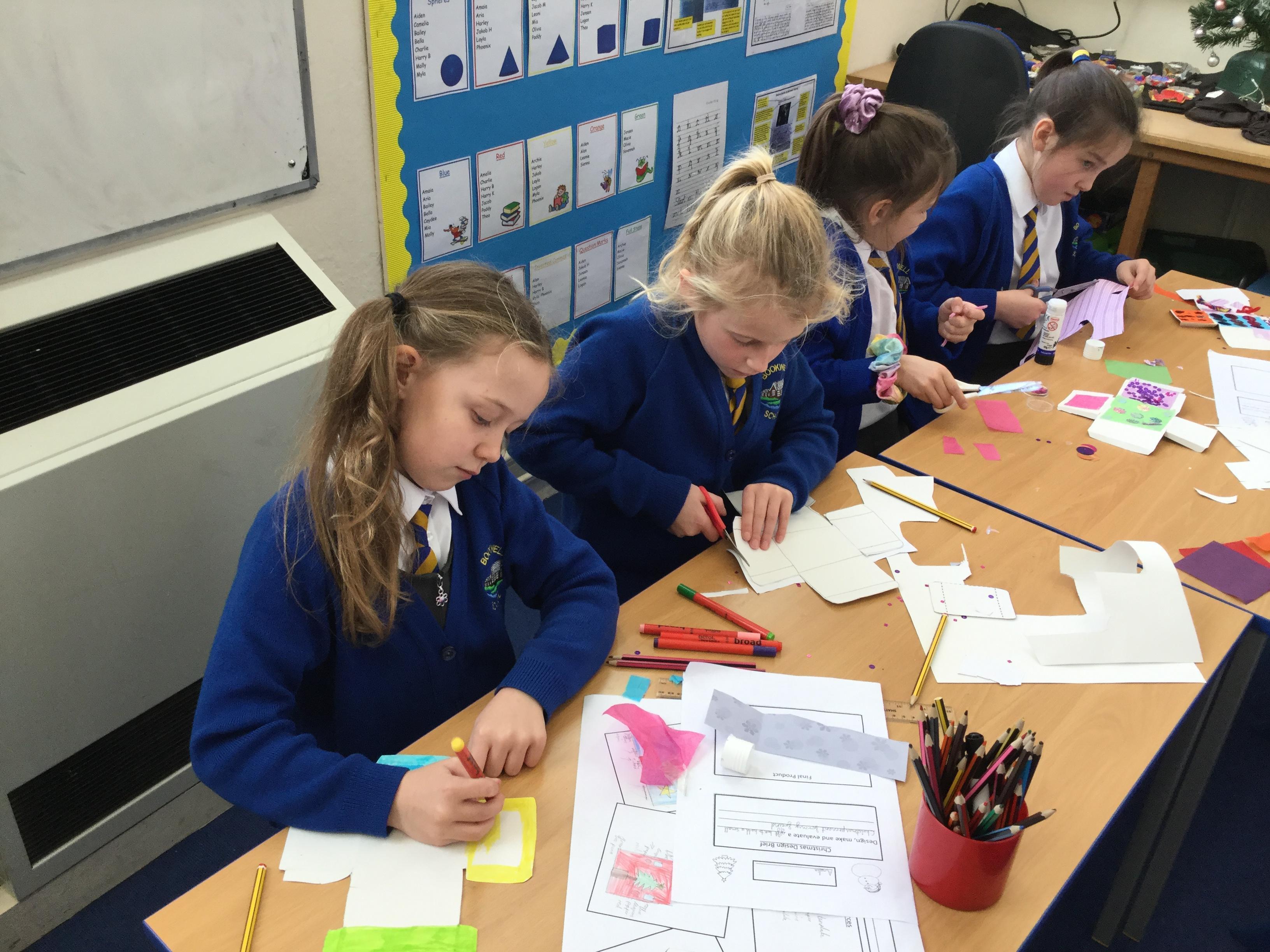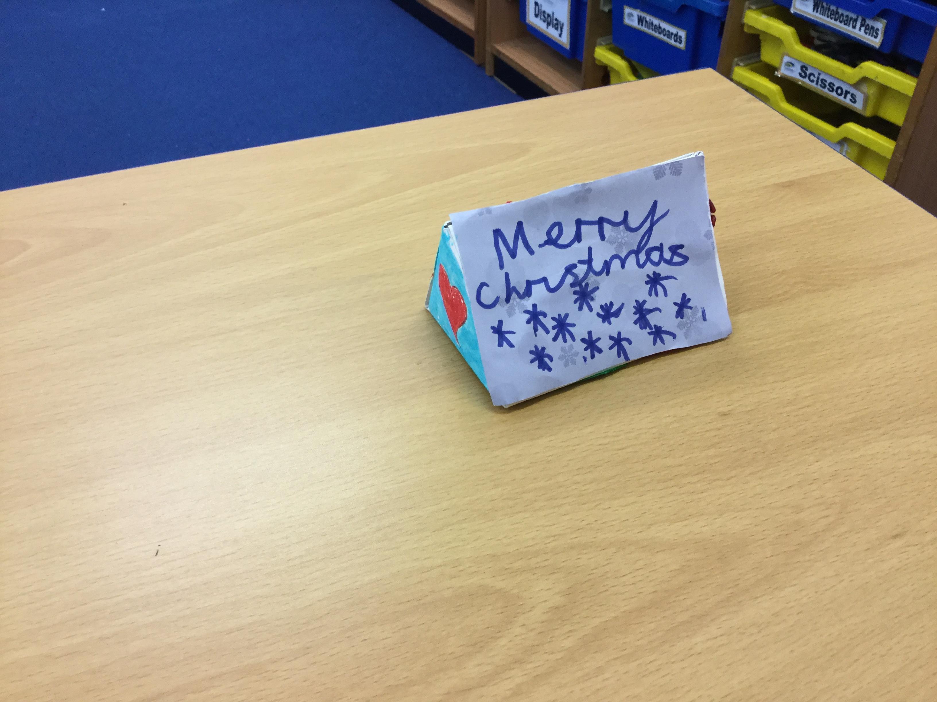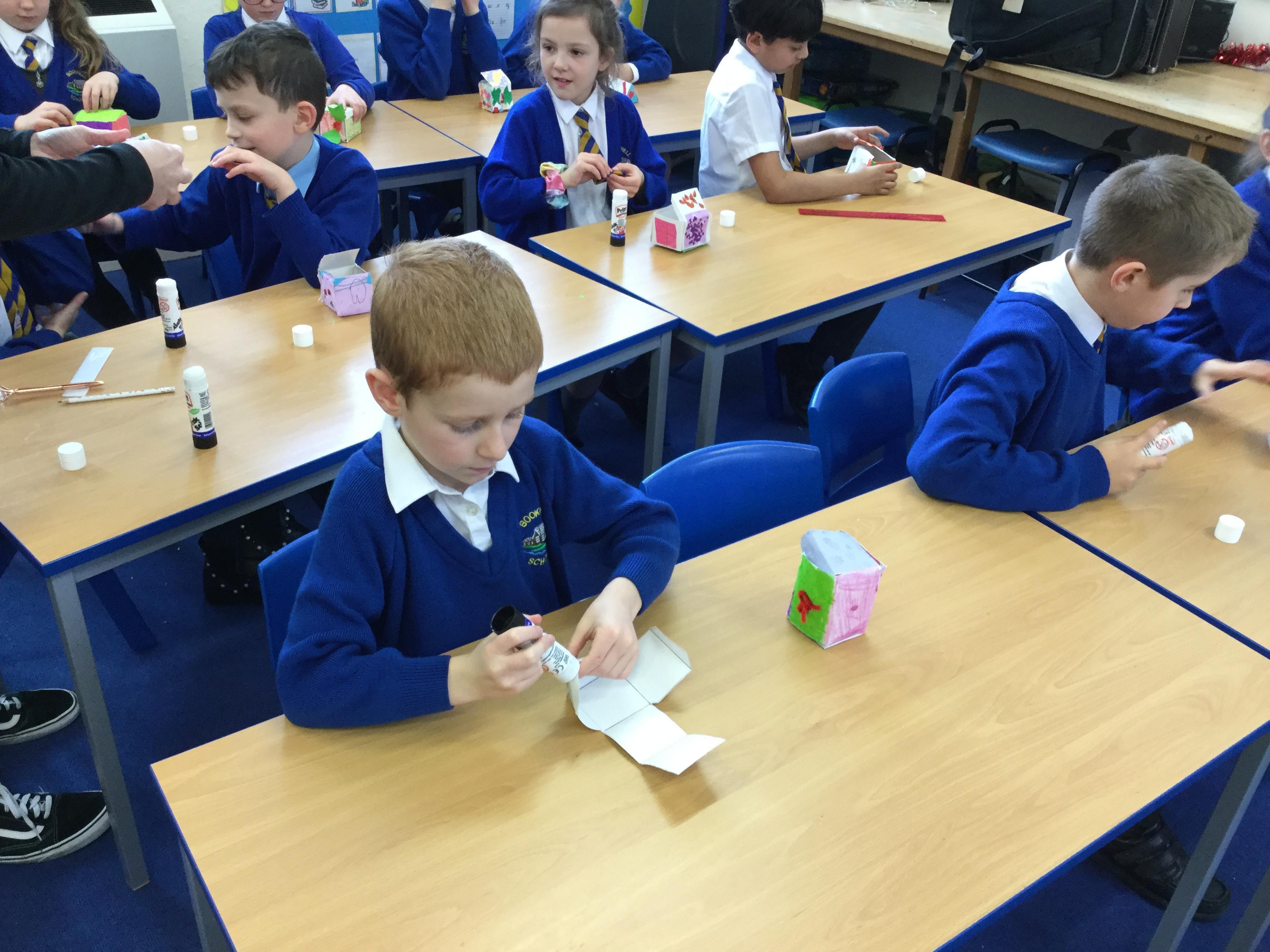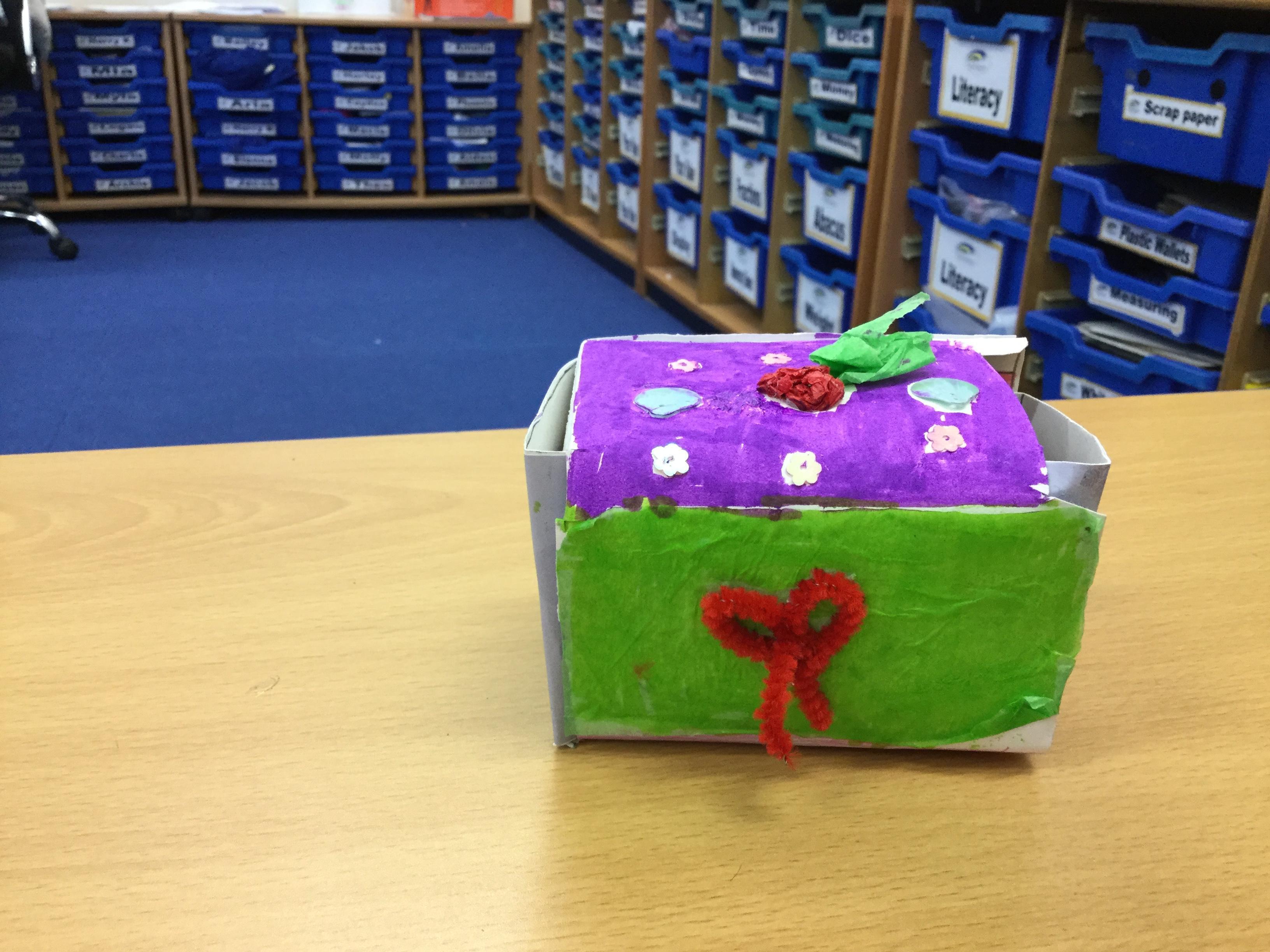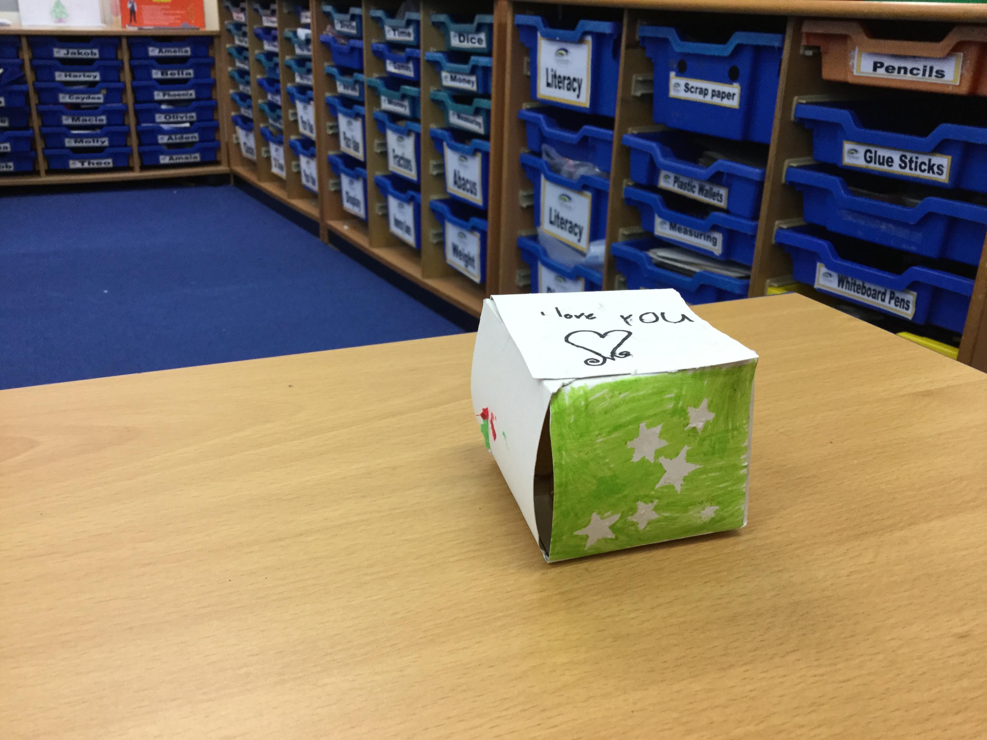 Christmas gift boxes were what we were producing today. Our design brief was to plan, make and evaluate a box for a small Christmas gift. We explored and planned our gift boxes the previous afternoon and had our ideas ready to make this morning. Firstly, we had to create our own nets using shapes which was quite difficult. Then we had to decorate our boxes from our plan. We used tissue paper, sequins, pens, pencils and card.