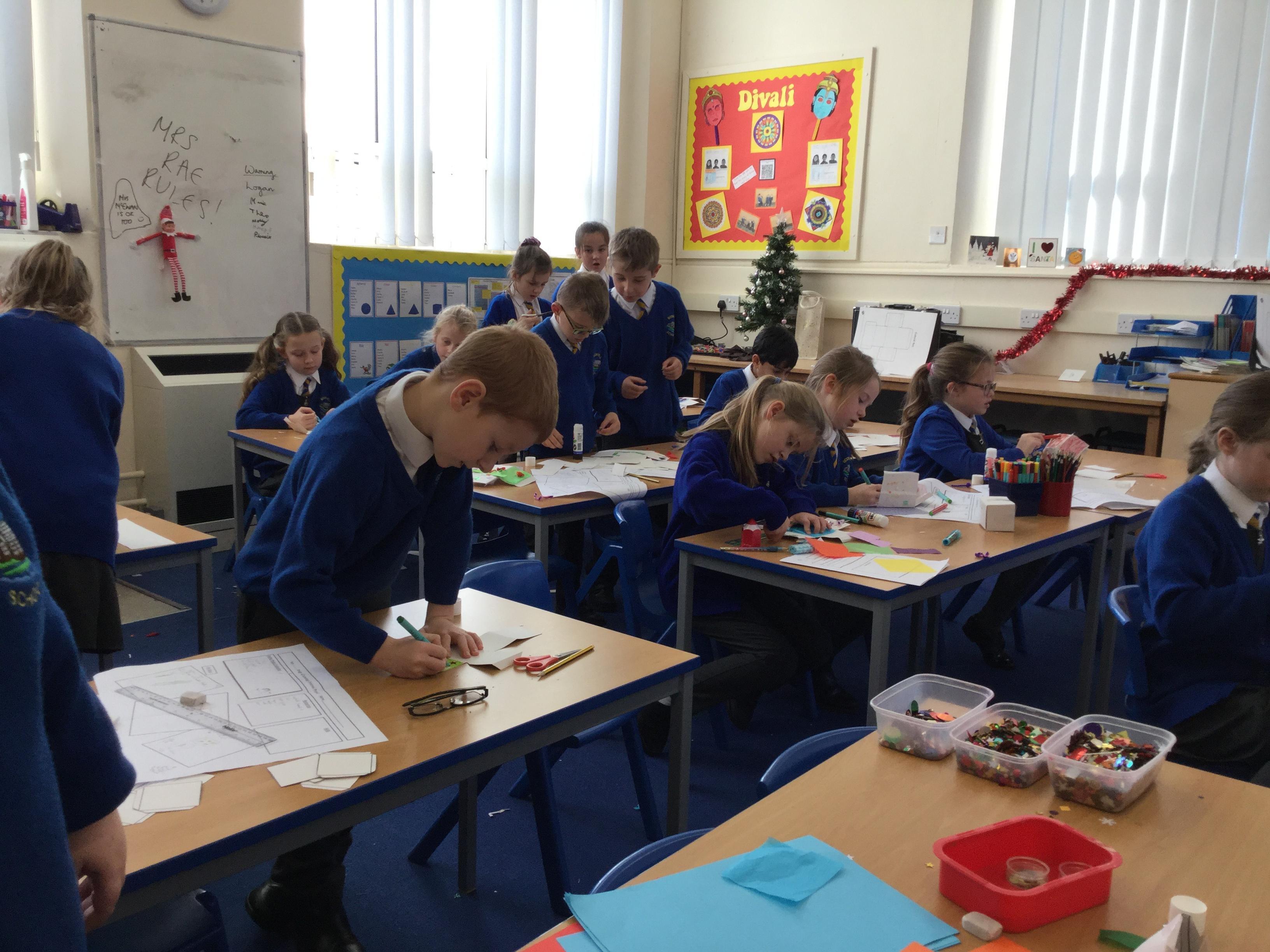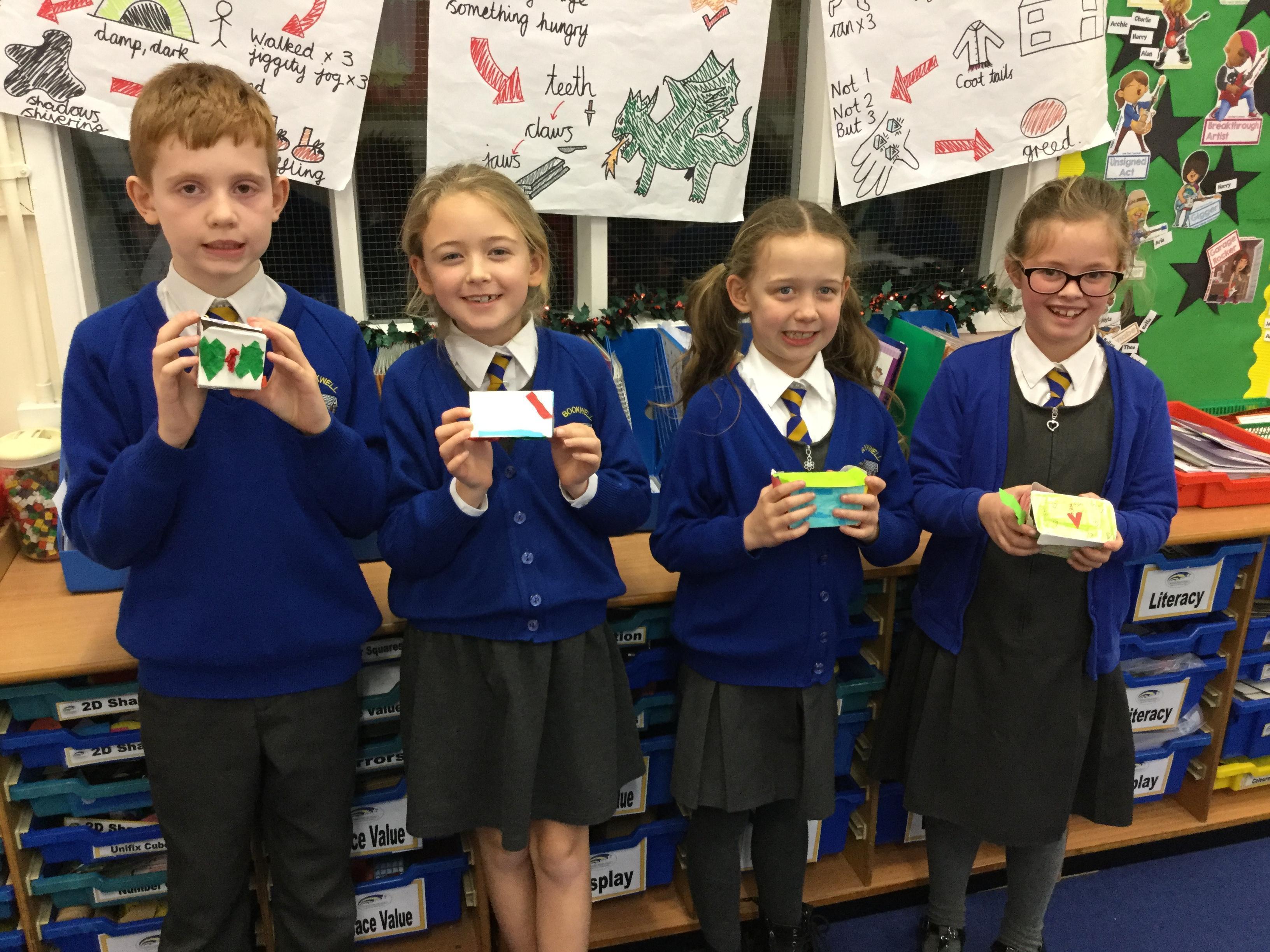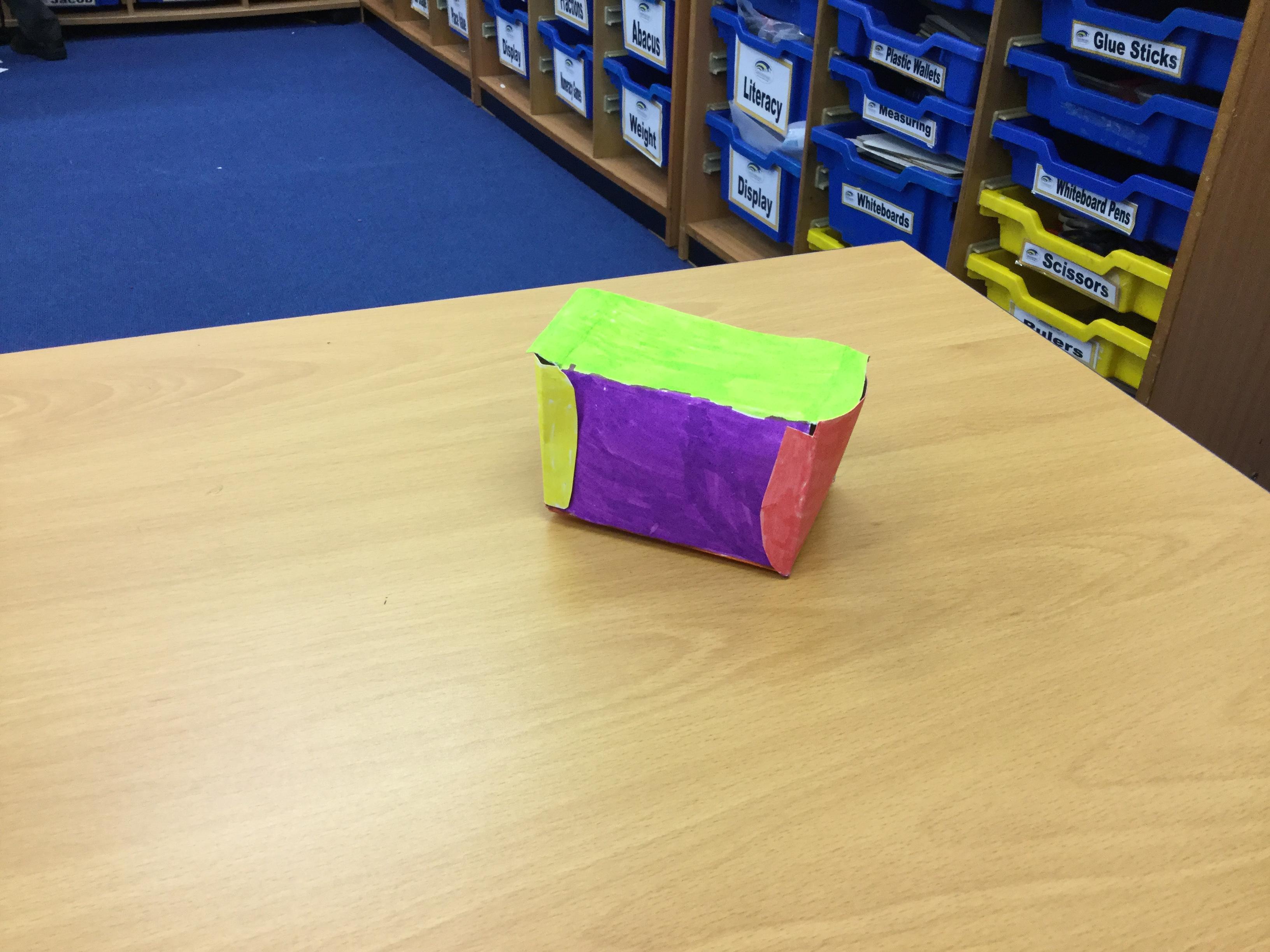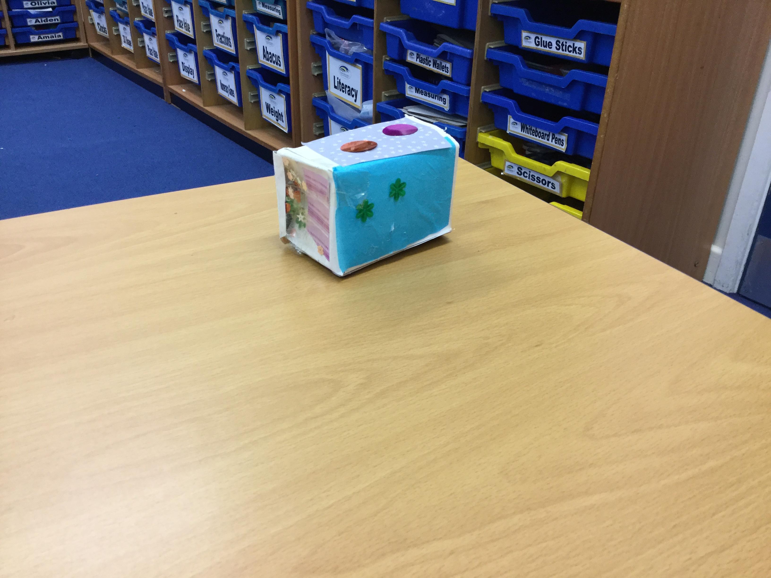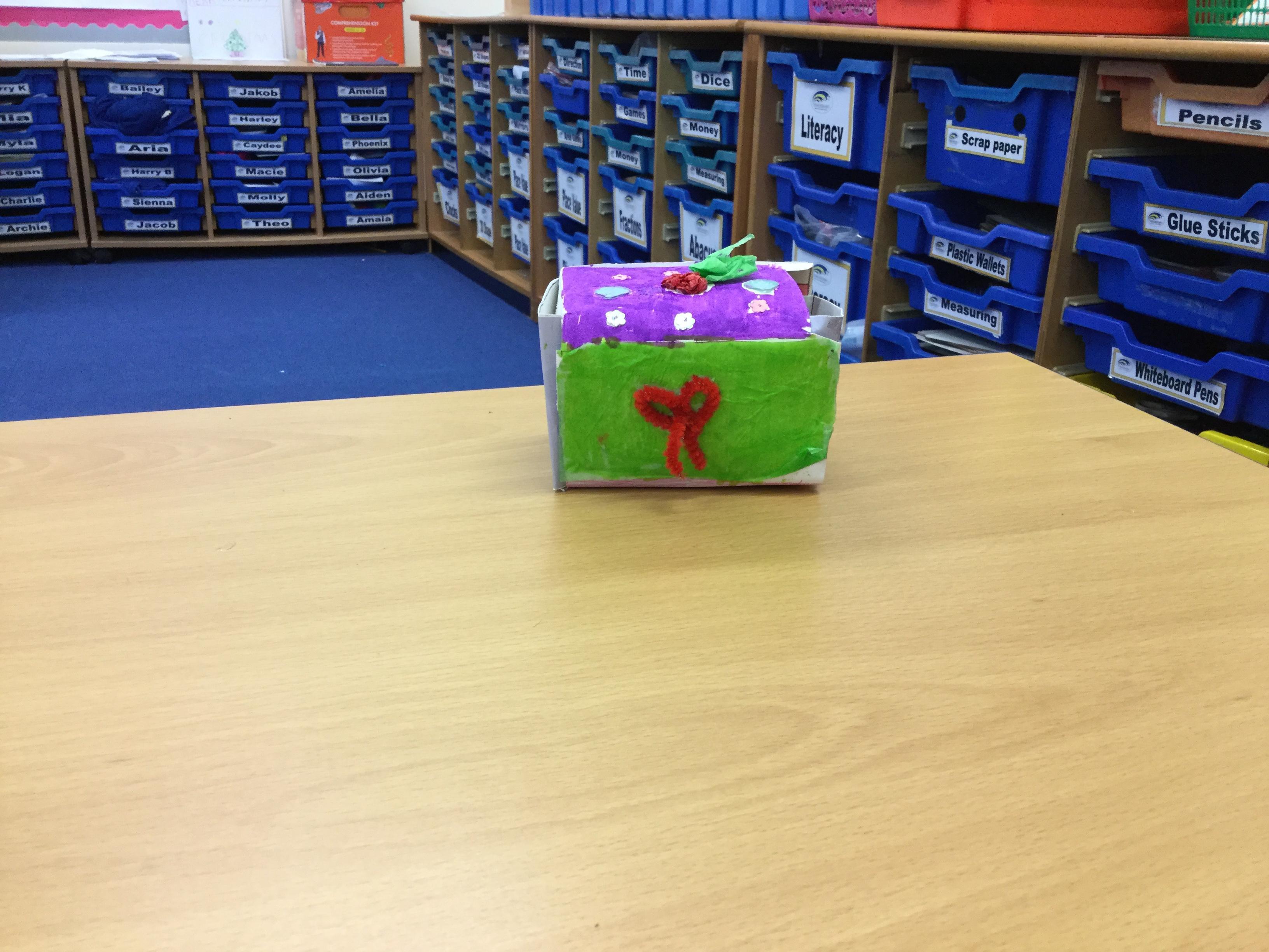 Christmas gift boxes were what we were producing today. Our design brief was to plan, make and evaluate a box for a small Christmas gift. We explored and planned our gift boxes the previous afternoon and had our ideas ready to make this morning. Firstly, we had to create our own nets using shapes which was quite difficult. Then we had to decorate our boxes from our plan. We used tissue paper, sequins, pens, pencils and card.