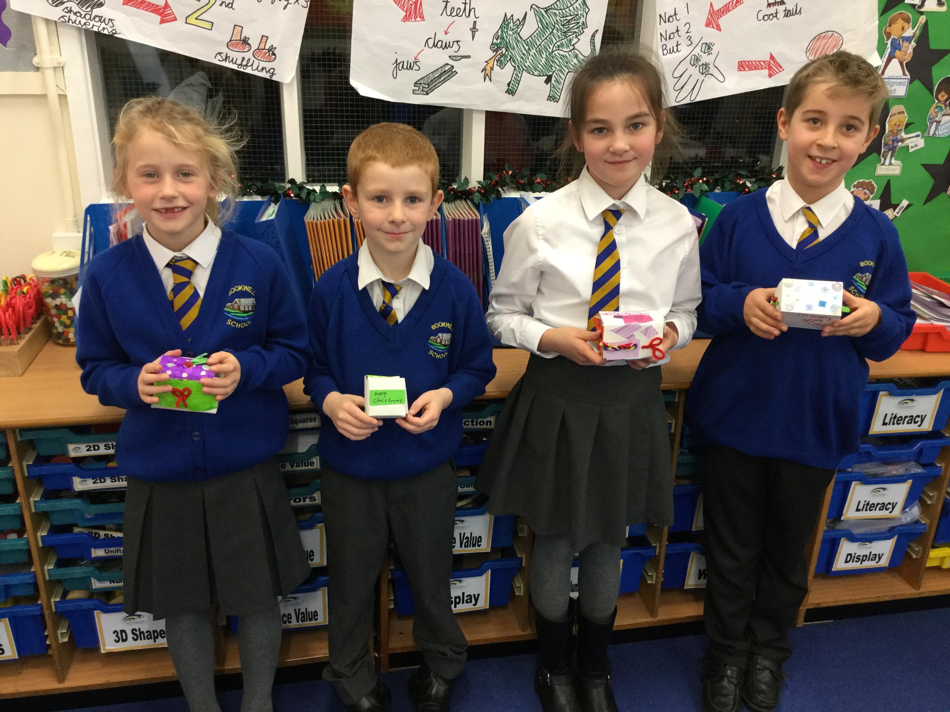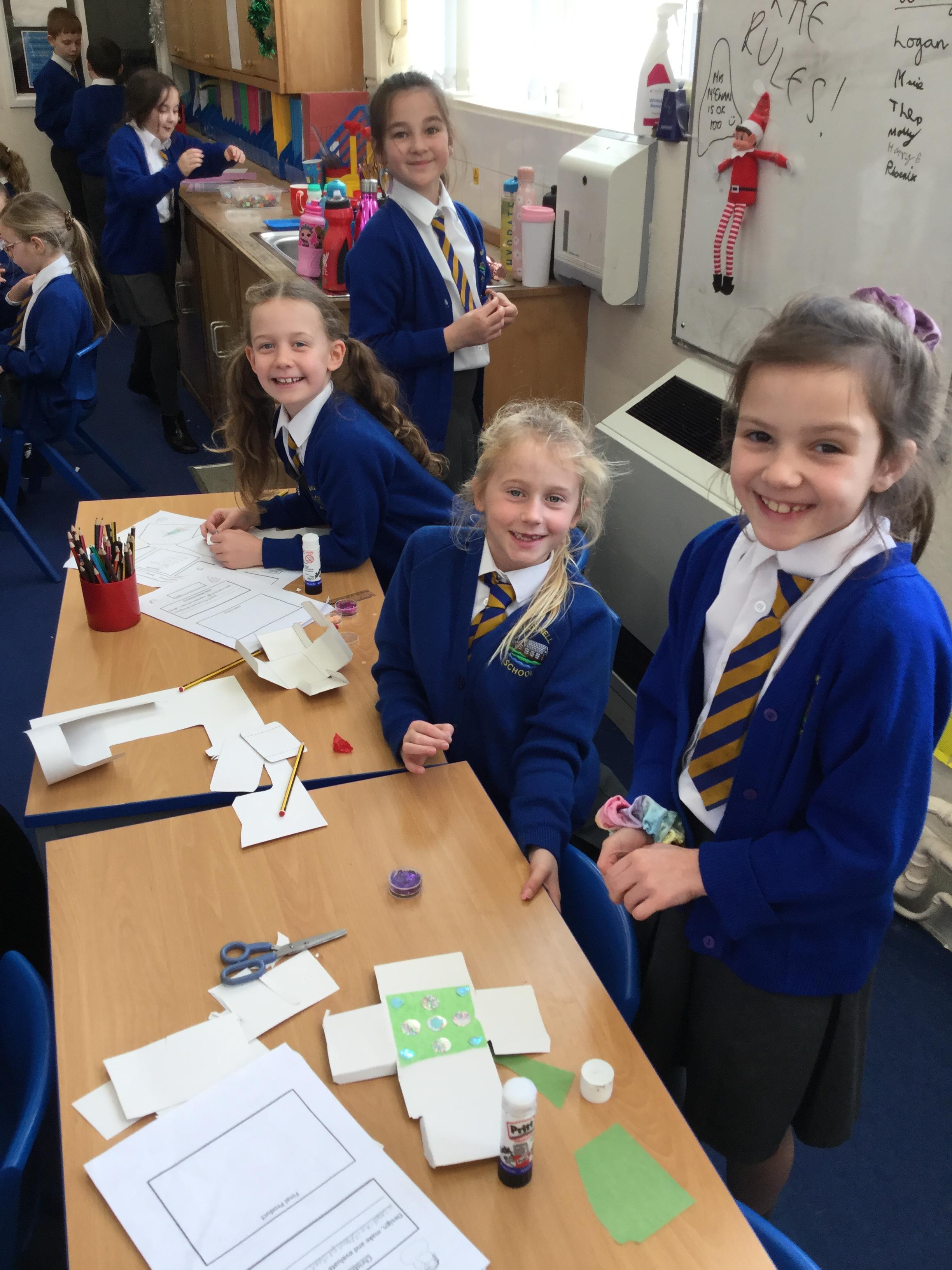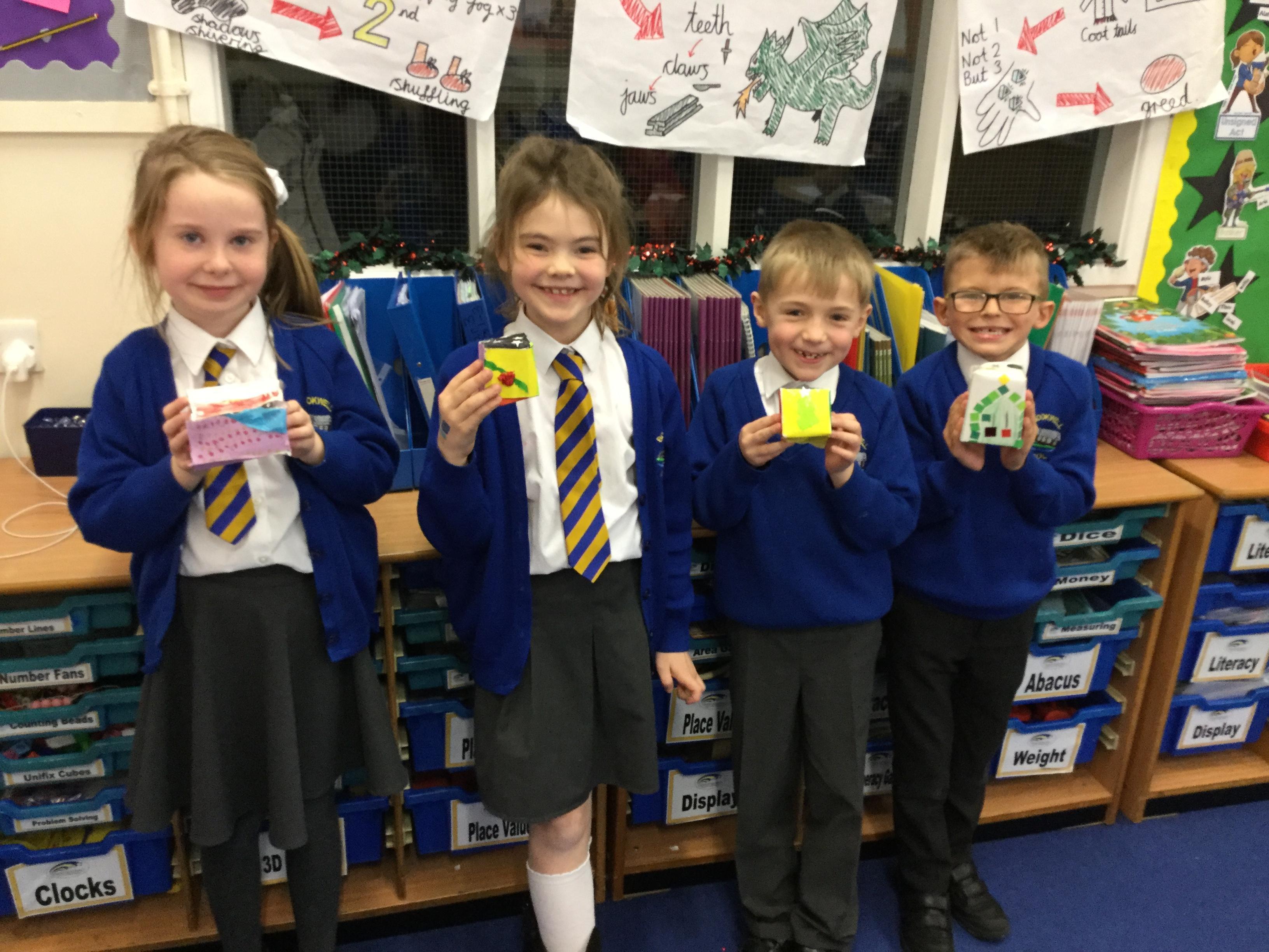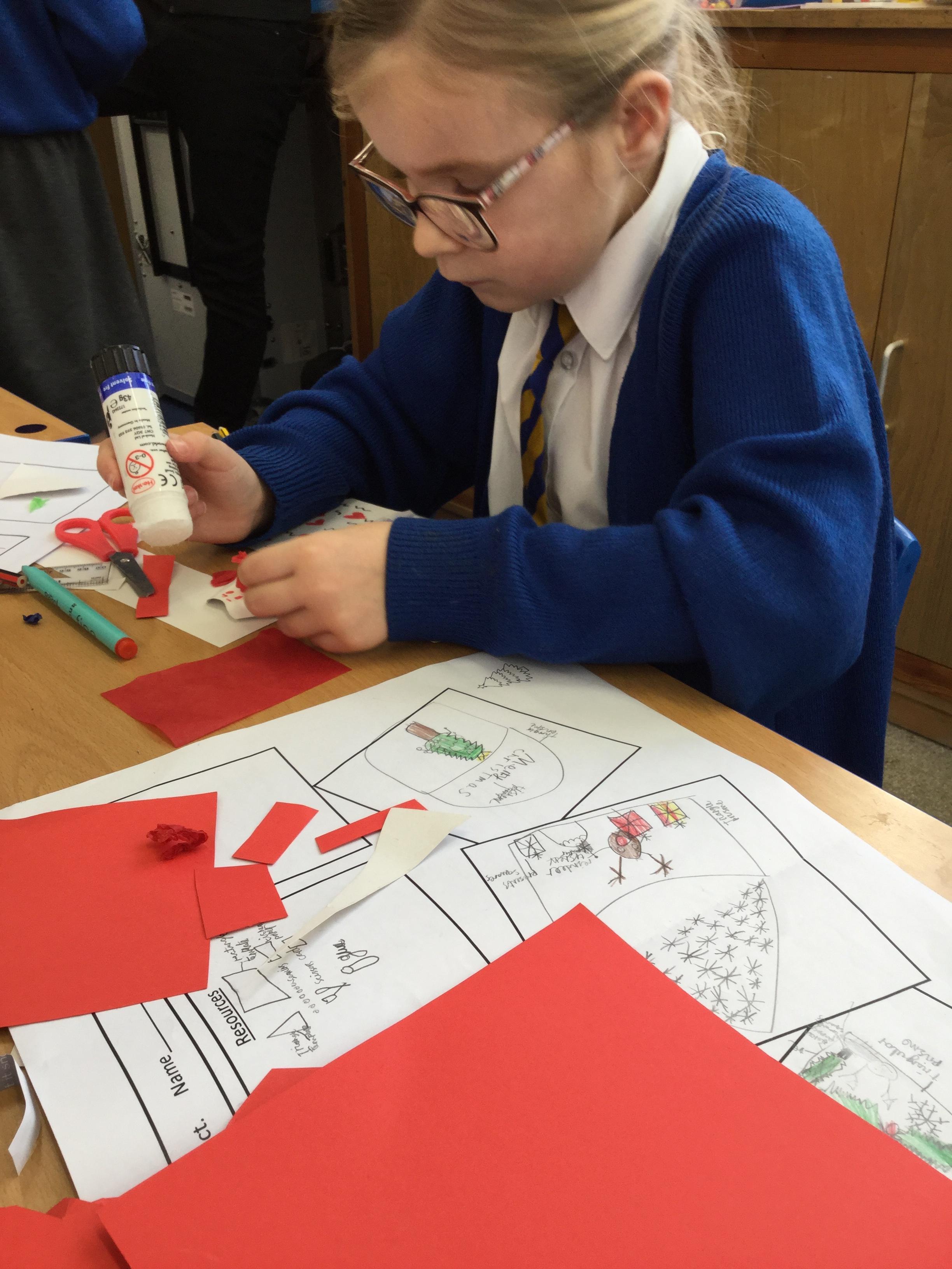 Christmas gift boxes were what we were producing today. Our design brief was to plan, make and evaluate a box for a small Christmas gift. We explored and planned our gift boxes the previous afternoon and had our ideas ready to make this morning. Firstly, we had to create our own nets using shapes which was quite difficult. Then we had to decorate our boxes from our plan. We used tissue paper, sequins, pens, pencils and card.