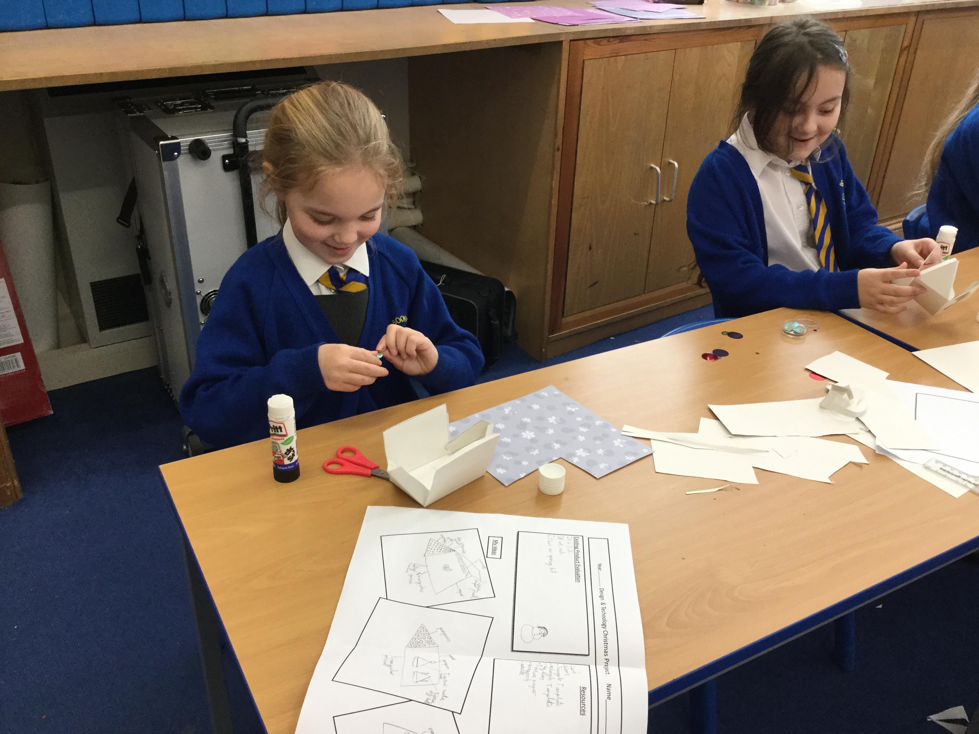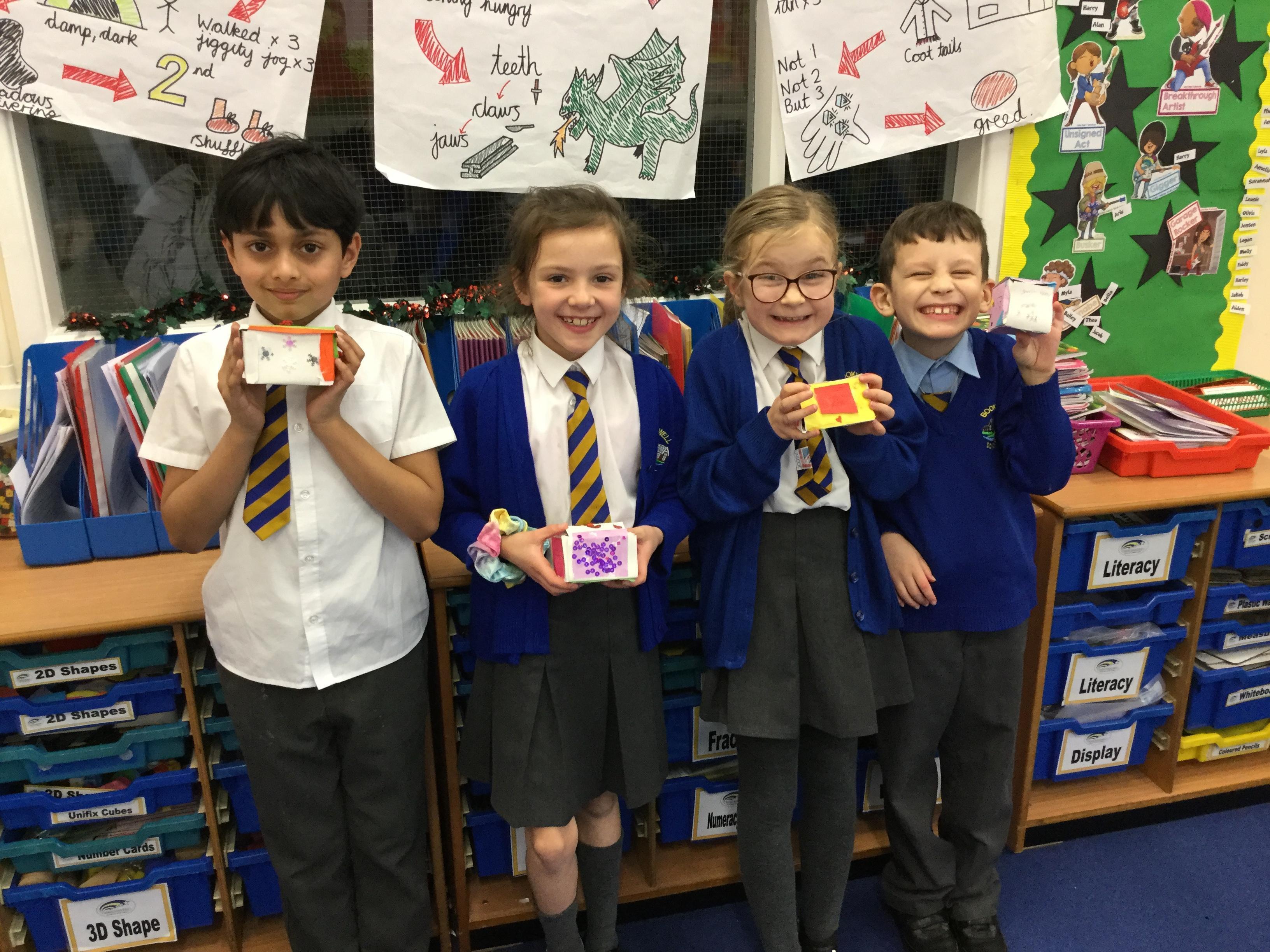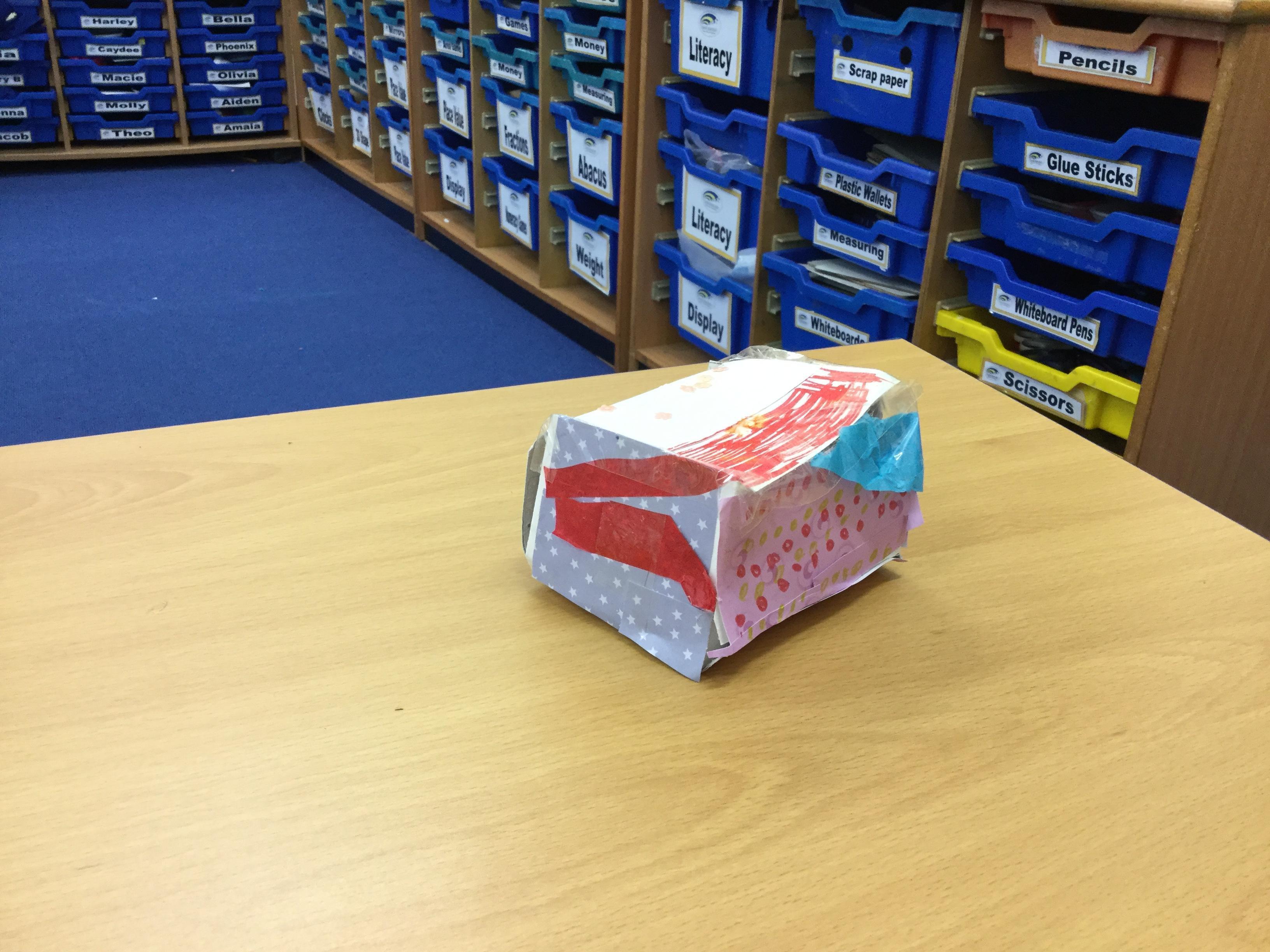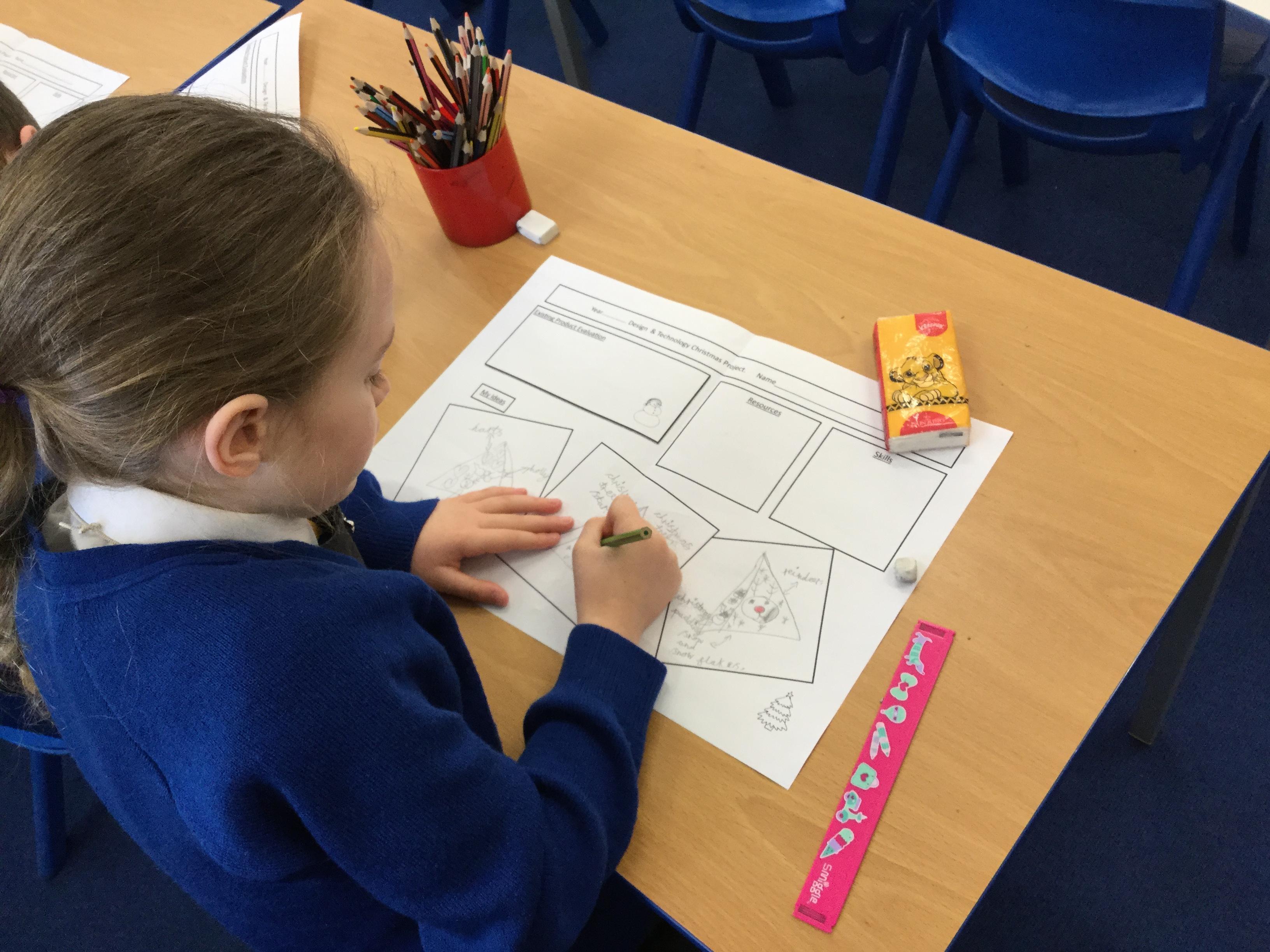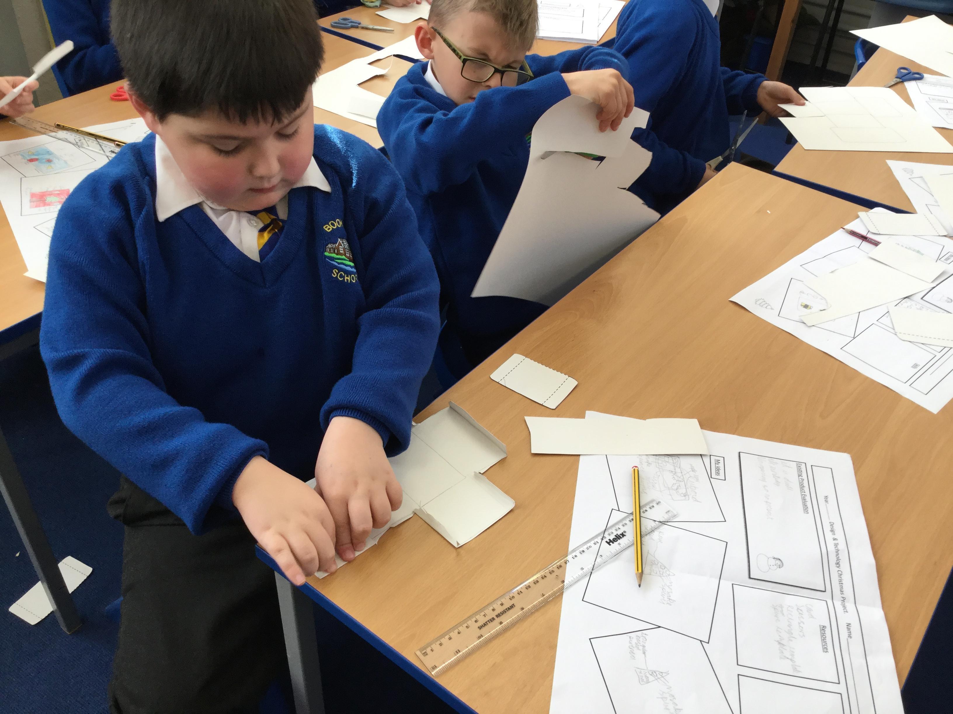 Christmas gift boxes were what we were producing today. Our design brief was to plan, make and evaluate a box for a small Christmas gift. We explored and planned our gift boxes the previous afternoon and had our ideas ready to make this morning. Firstly, we had to create our own nets using shapes which was quite difficult. Then we had to decorate our boxes from our plan. We used tissue paper, sequins, pens, pencils and card.