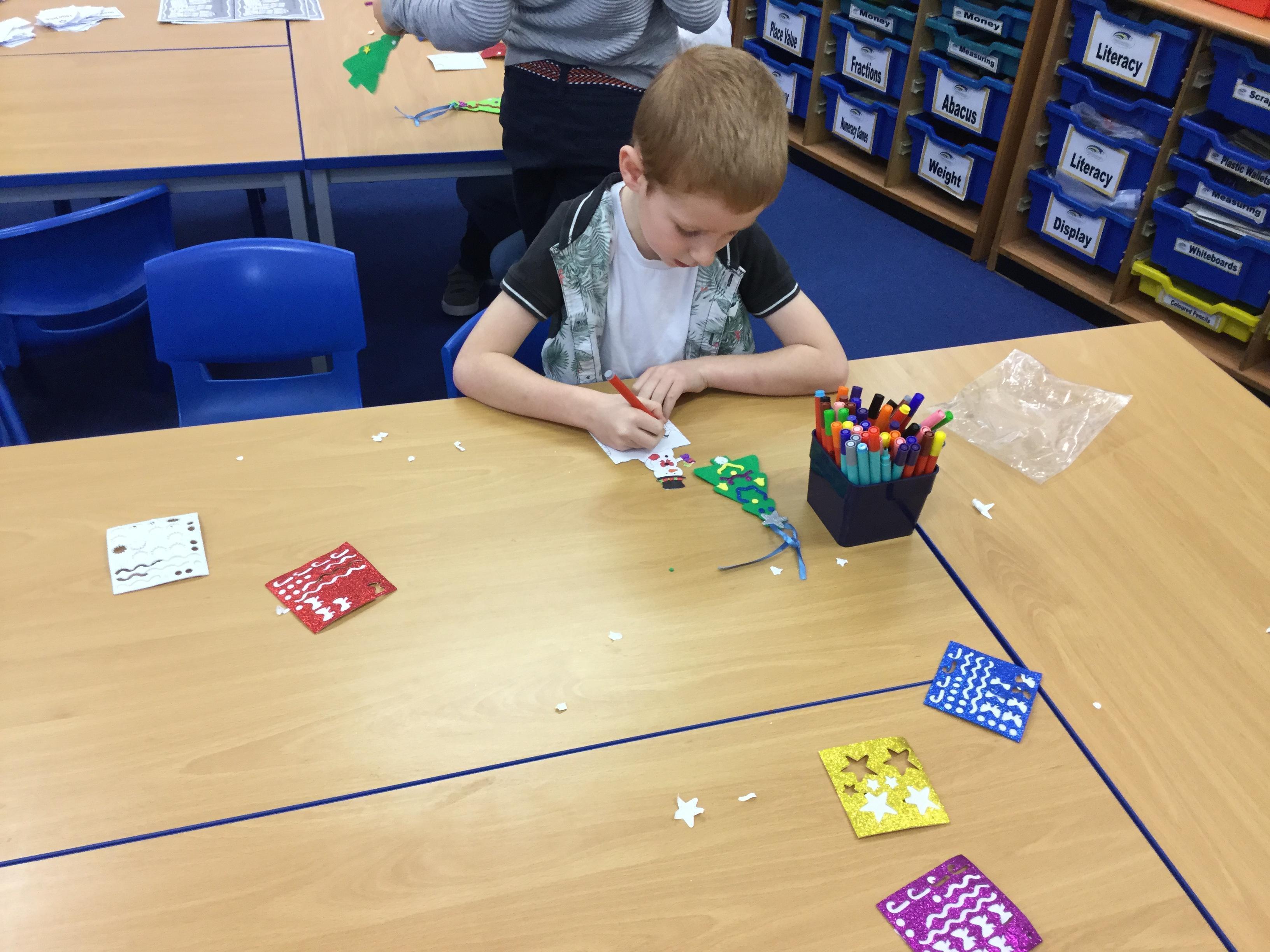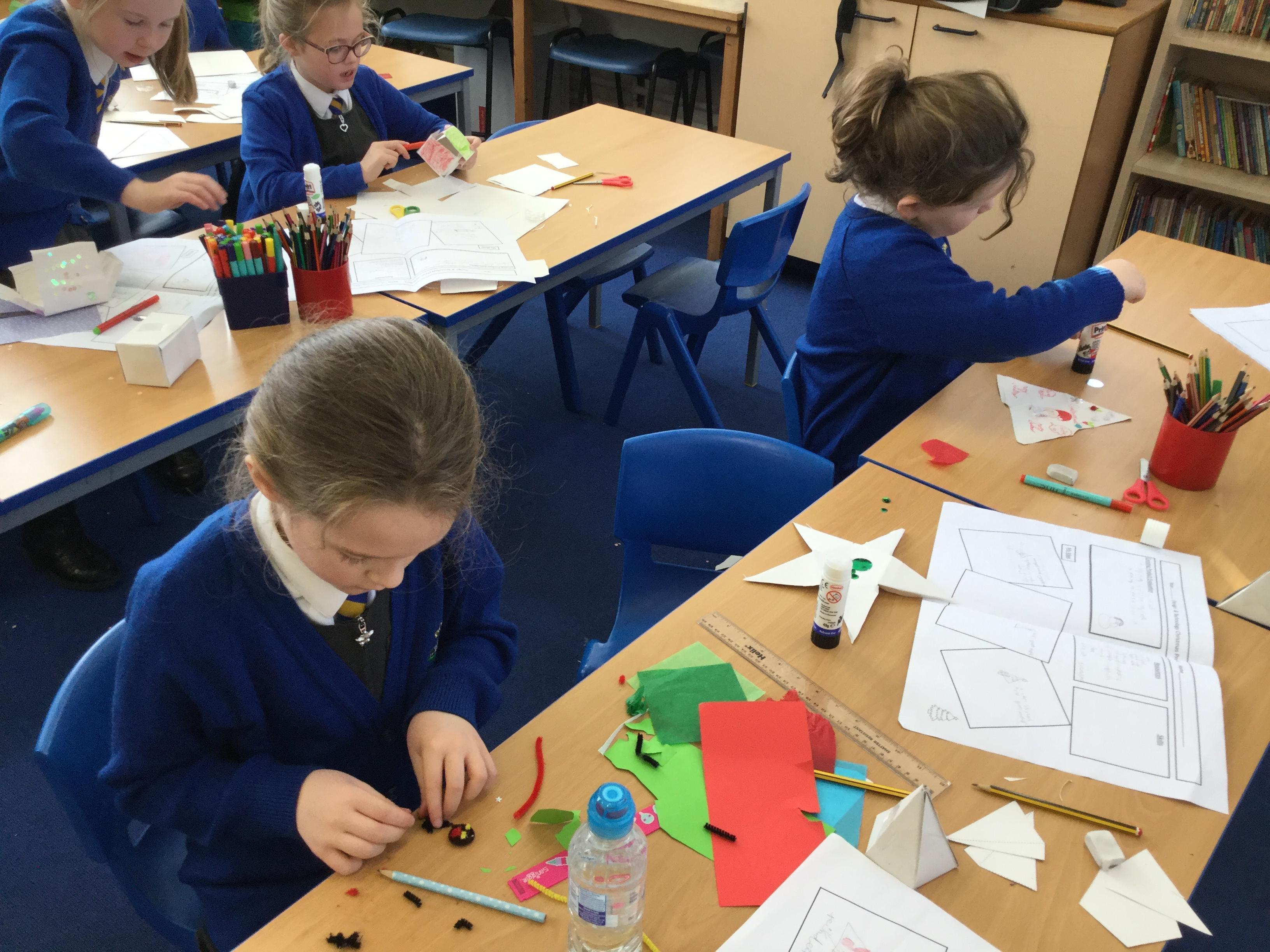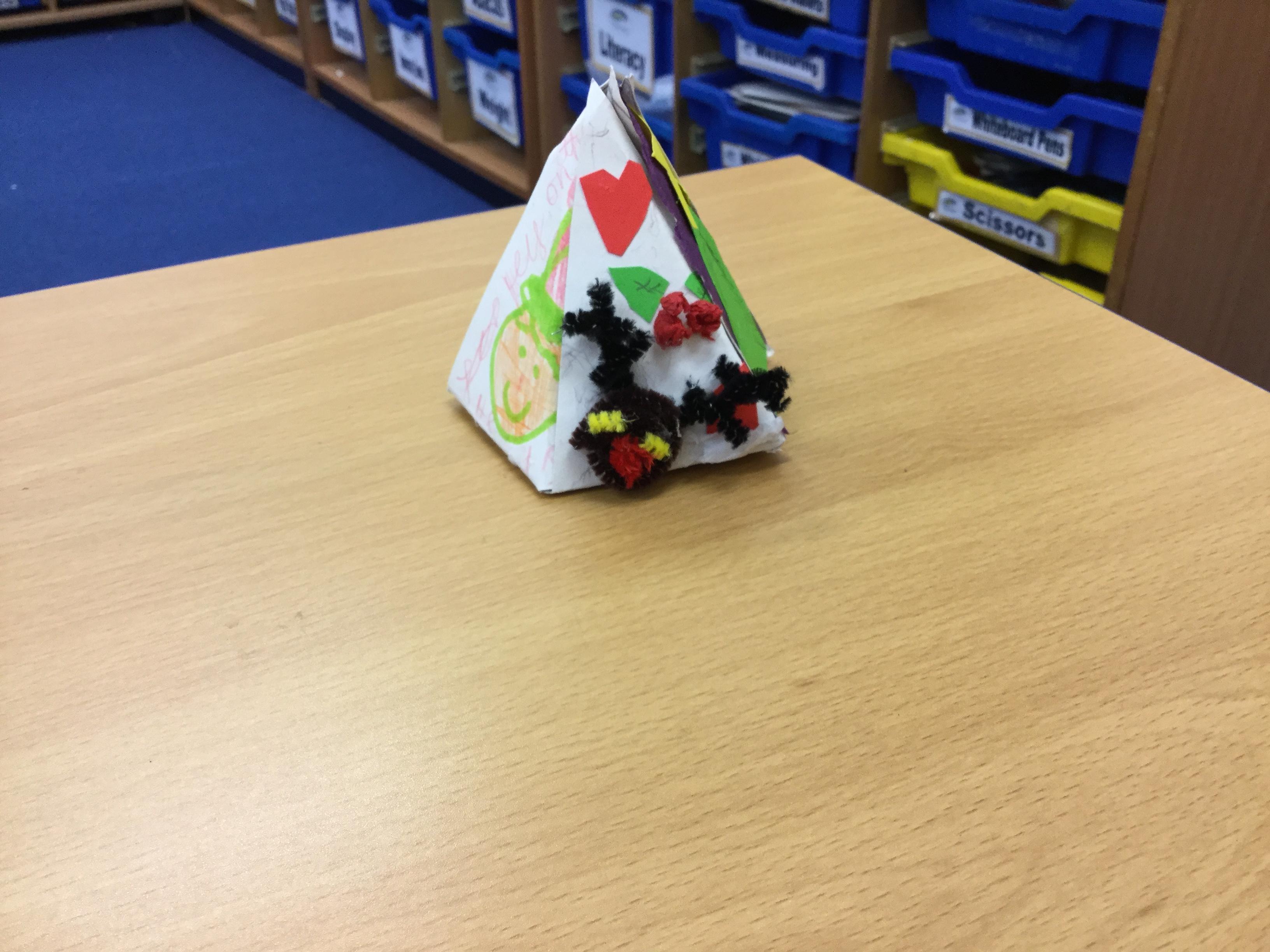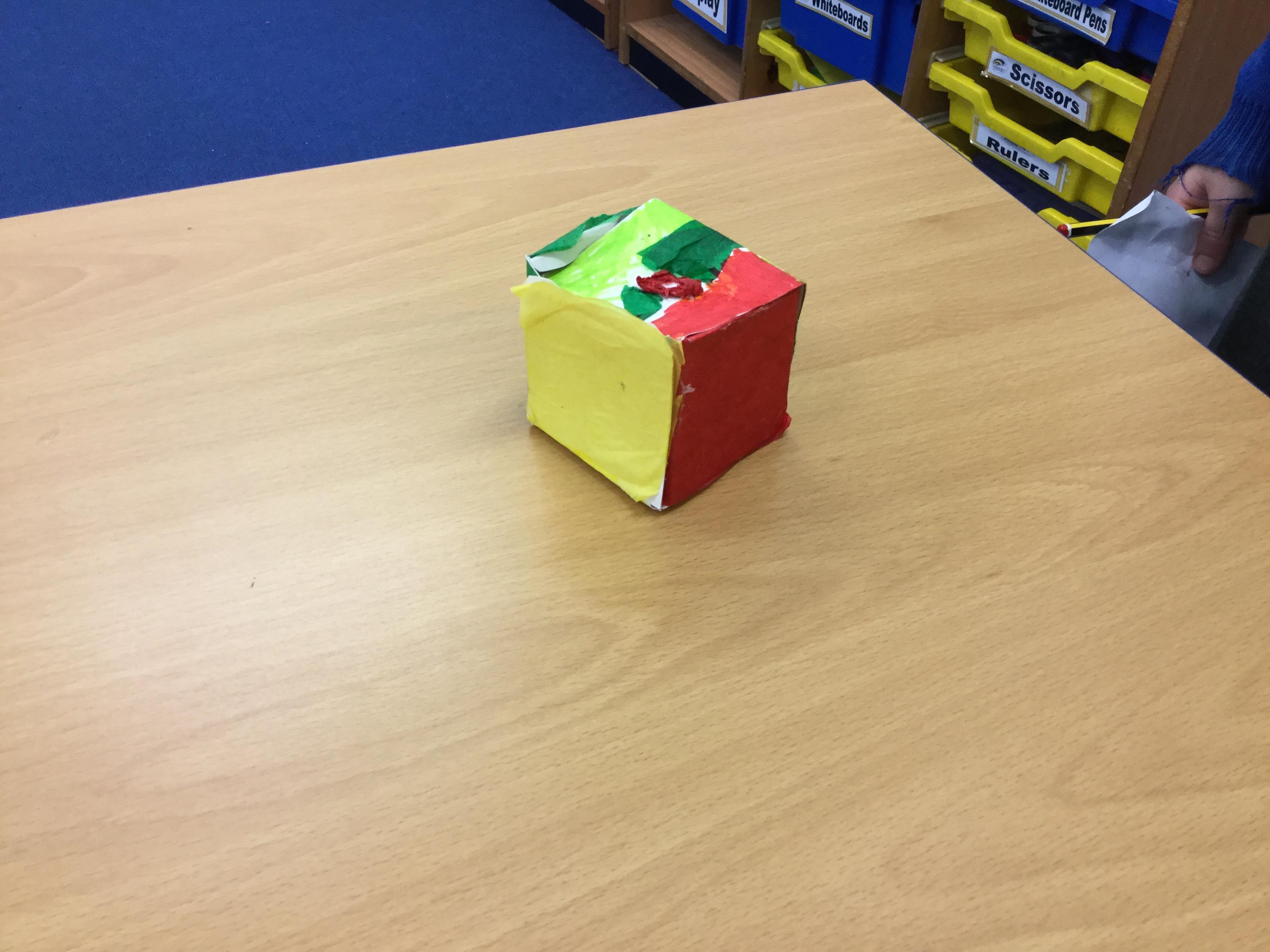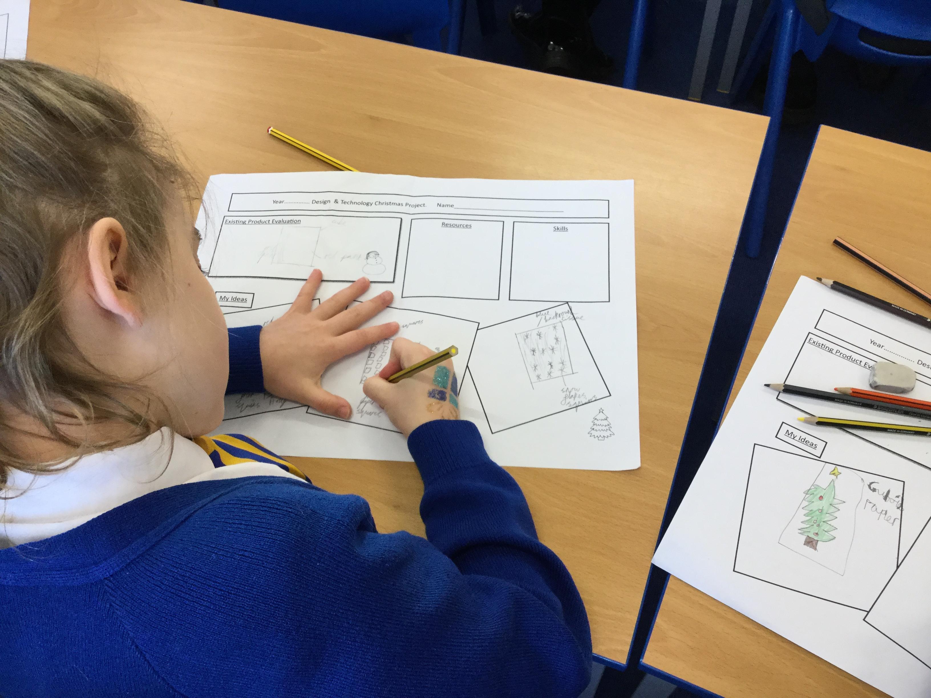 Christmas gift boxes were what we were producing today. Our design brief was to plan, make and evaluate a box for a small Christmas gift. We explored and planned our gift boxes the previous afternoon and had our ideas ready to make this morning. Firstly, we had to create our own nets using shapes which was quite difficult. Then we had to decorate our boxes from our plan. We used tissue paper, sequins, pens, pencils and card.