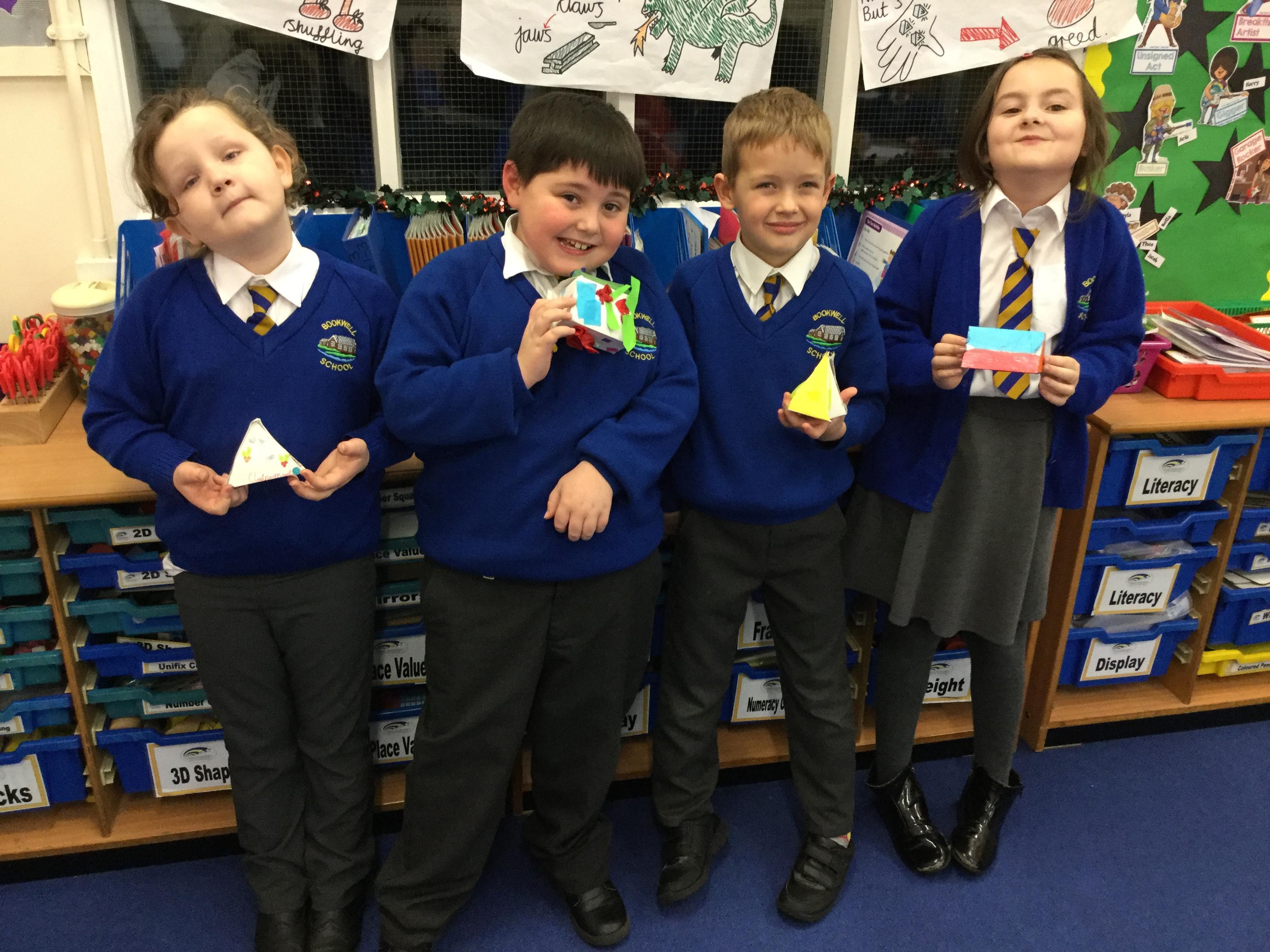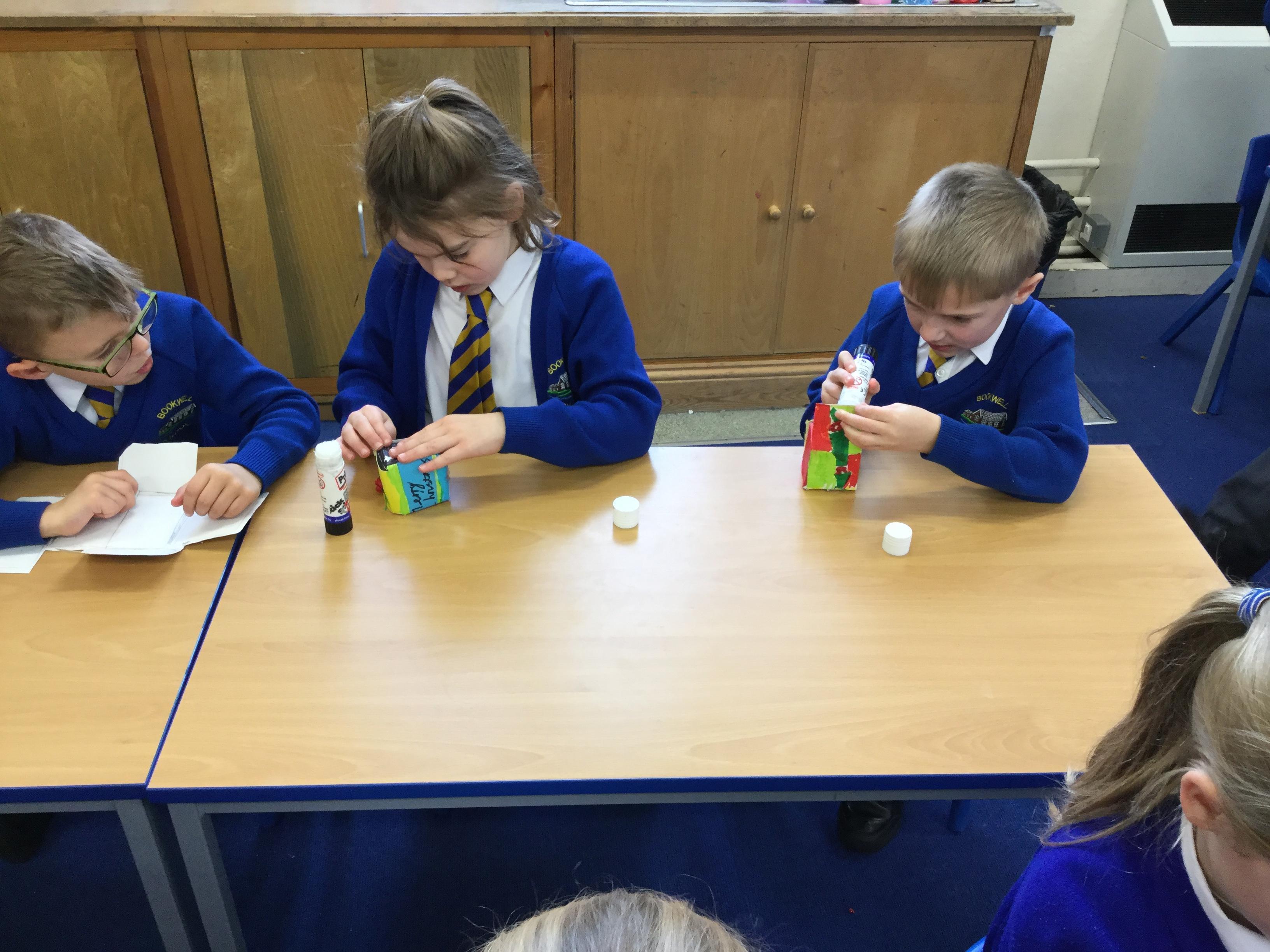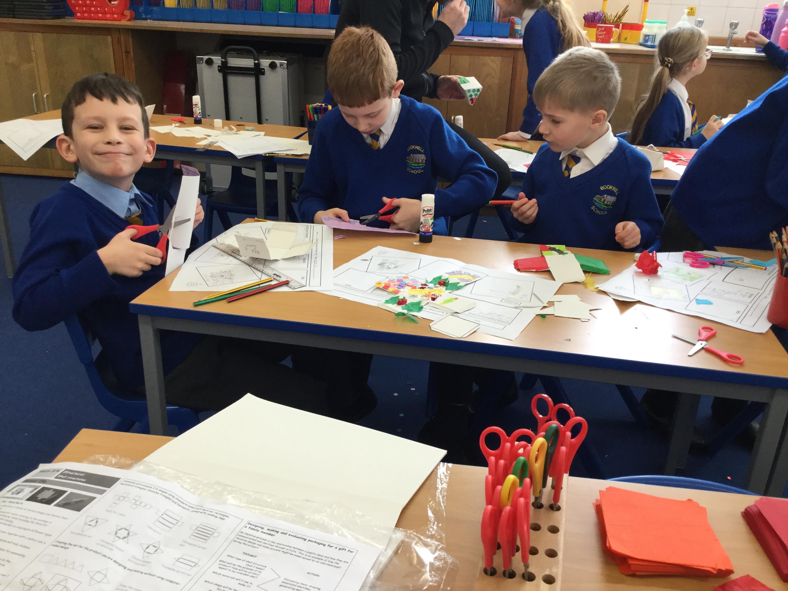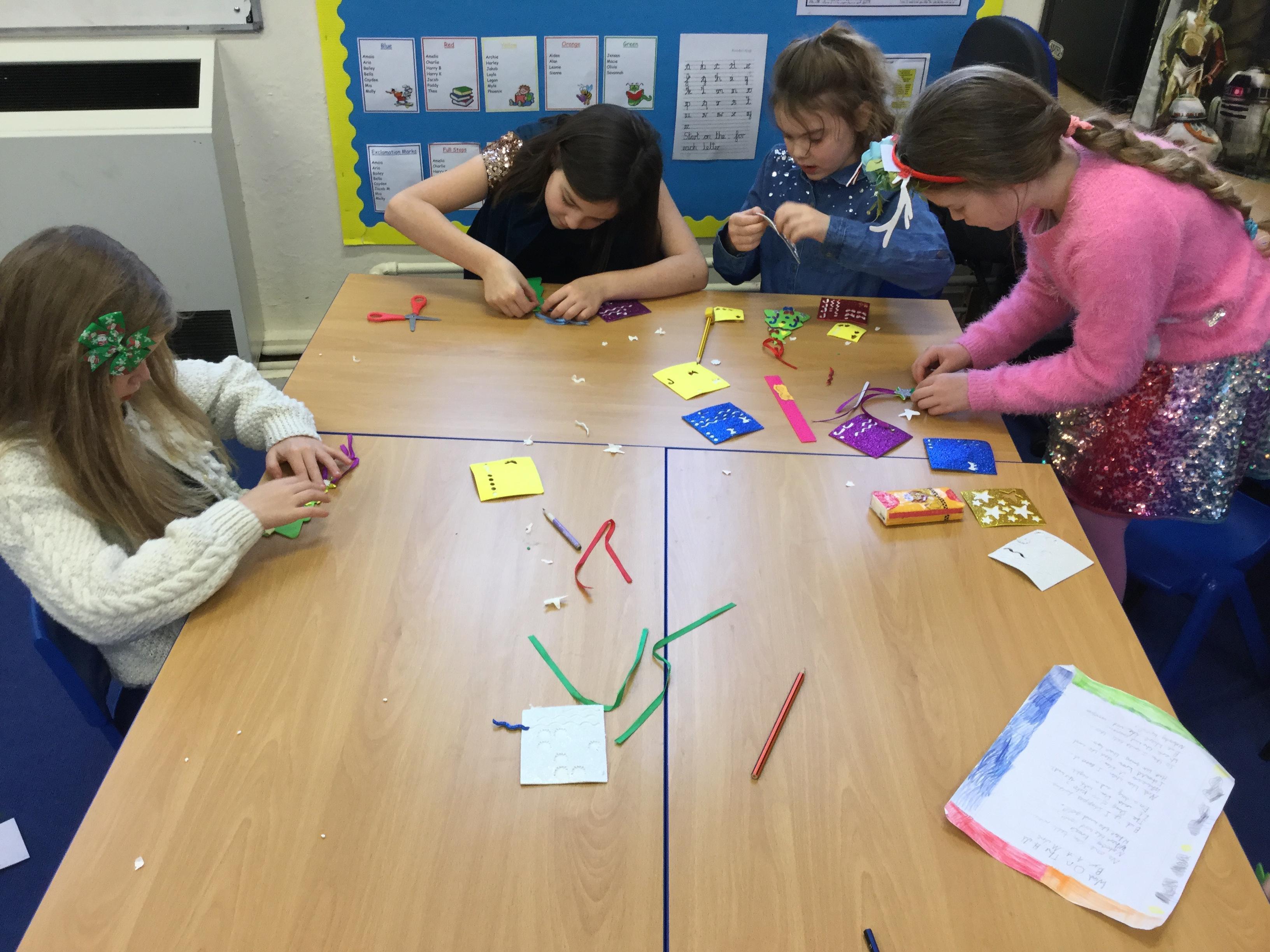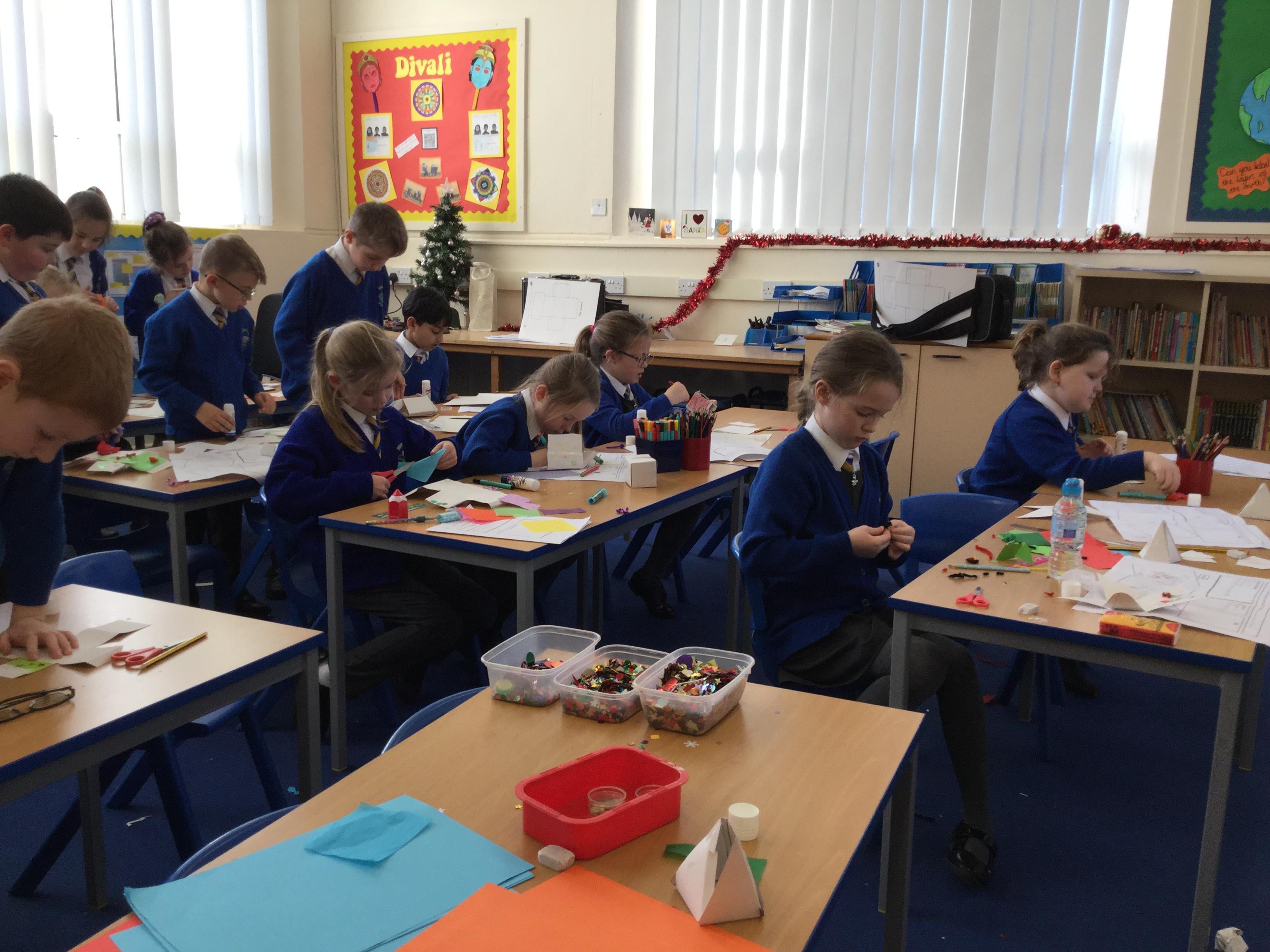 Christmas gift boxes were what we were producing today. Our design brief was to plan, make and evaluate a box for a small Christmas gift. We explored and planned our gift boxes the previous afternoon and had our ideas ready to make this morning. Firstly, we had to create our own nets using shapes which was quite difficult. Then we had to decorate our boxes from our plan. We used tissue paper, sequins, pens, pencils and card.